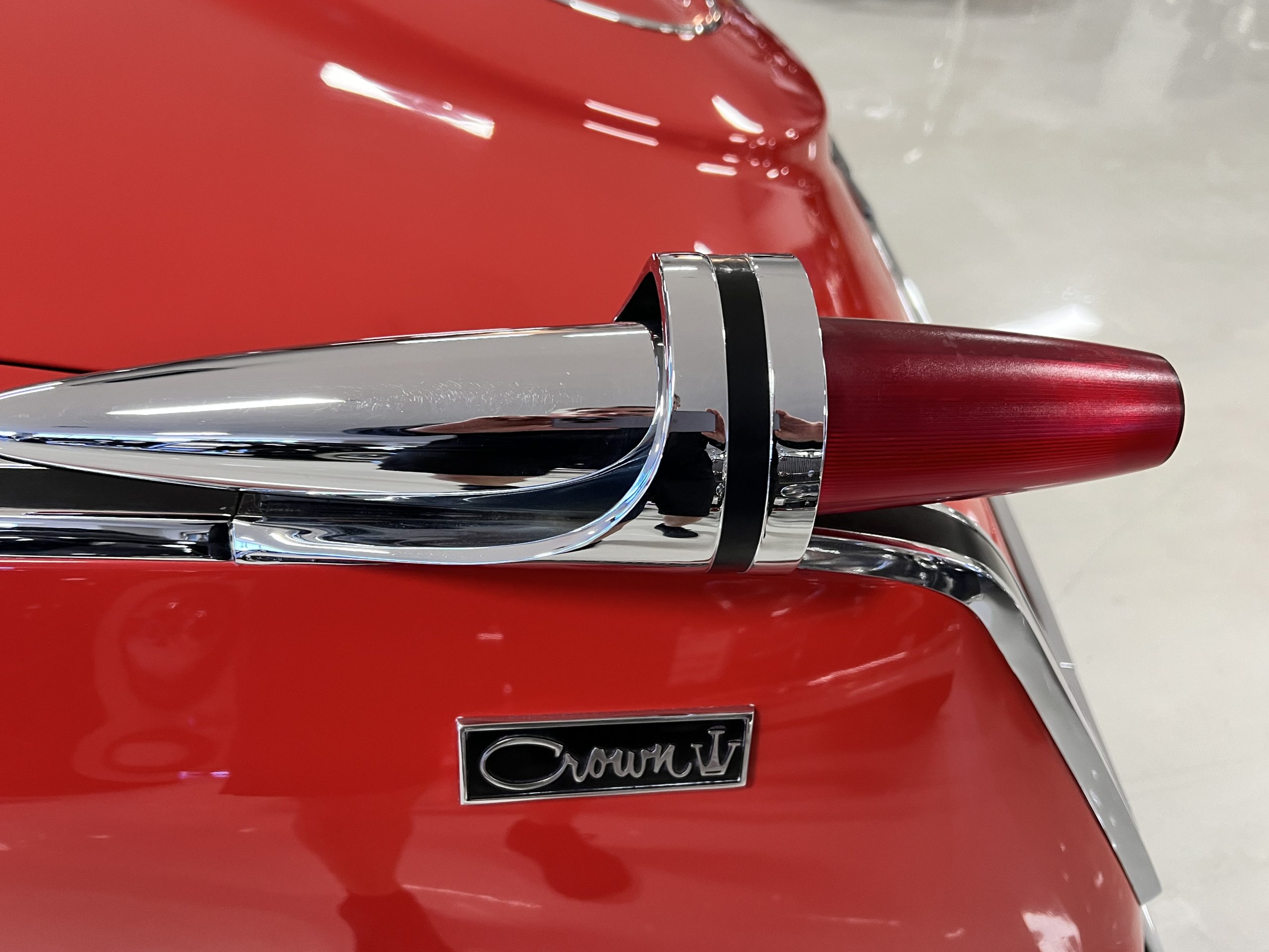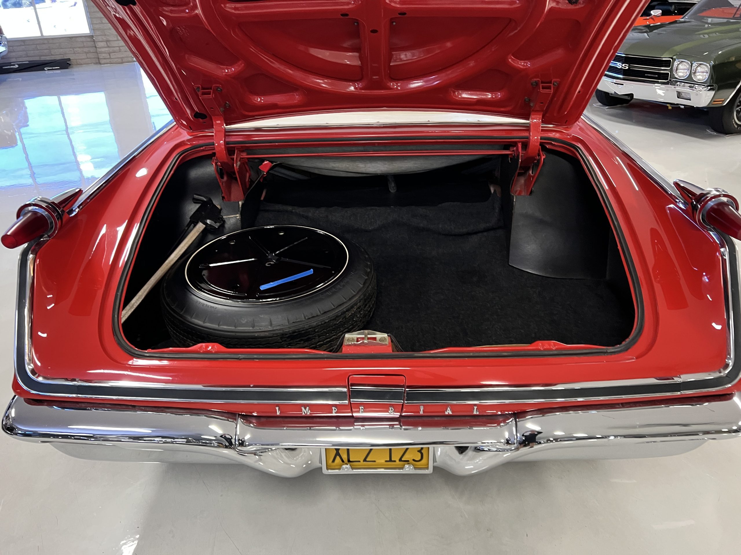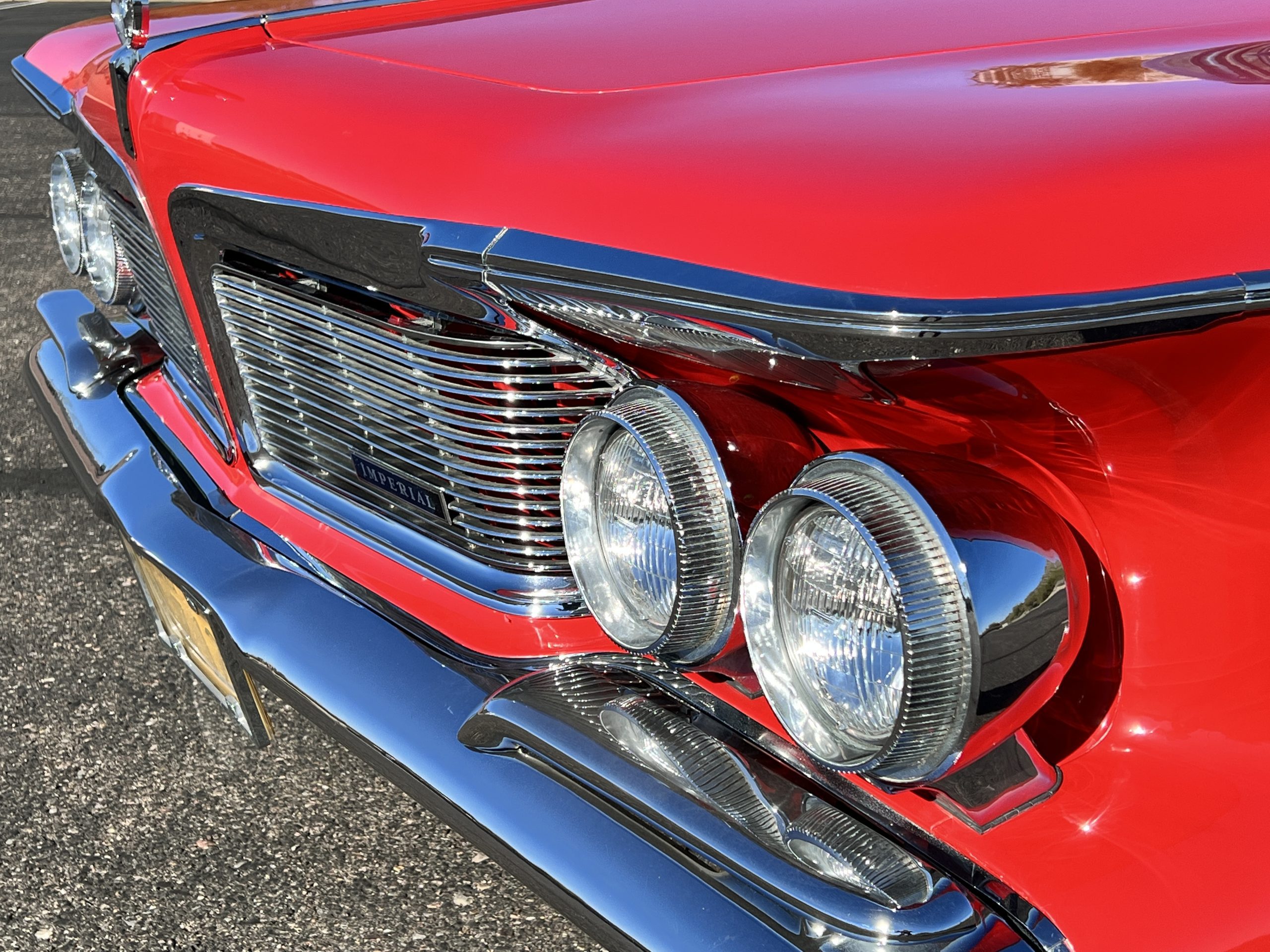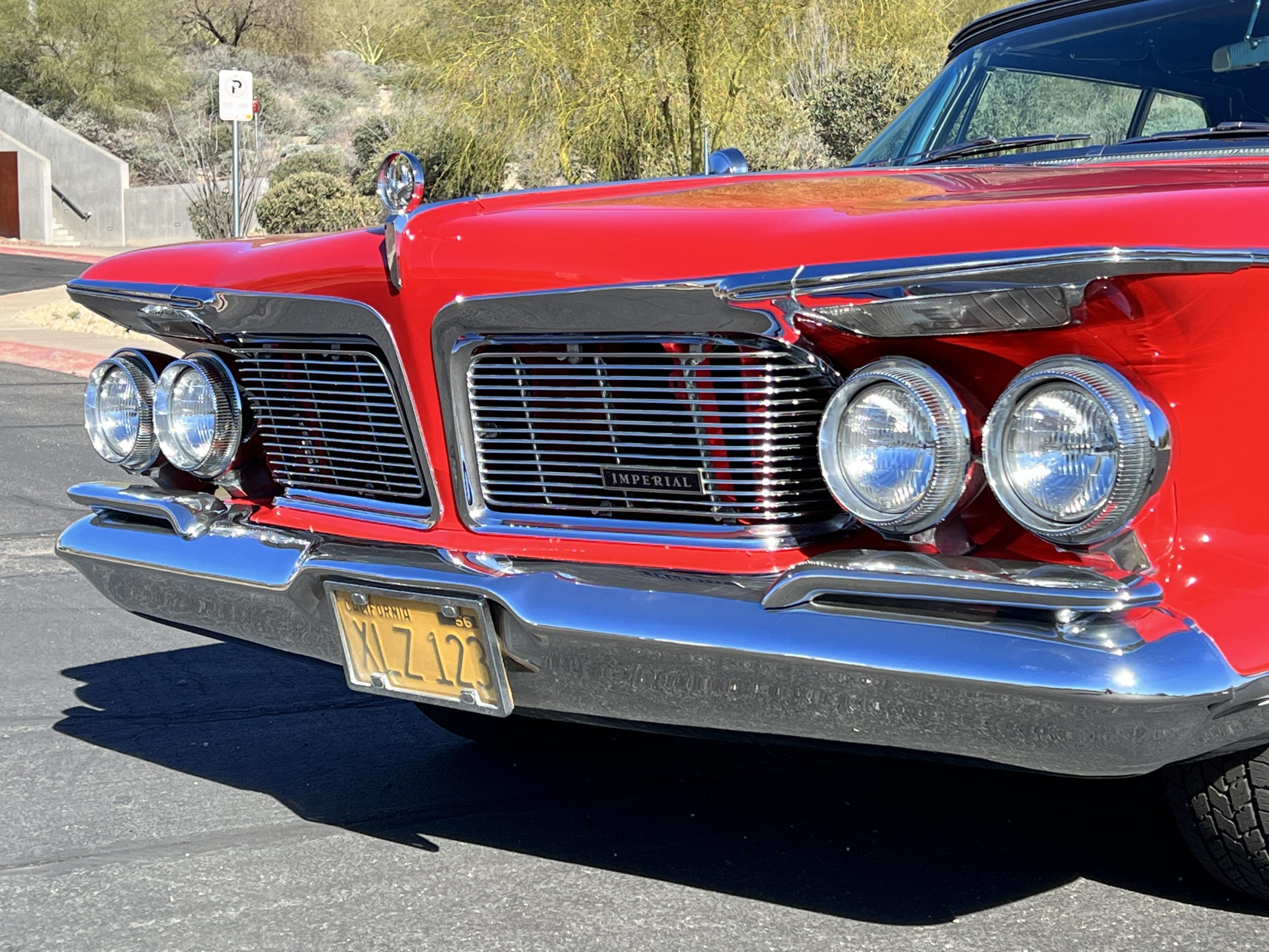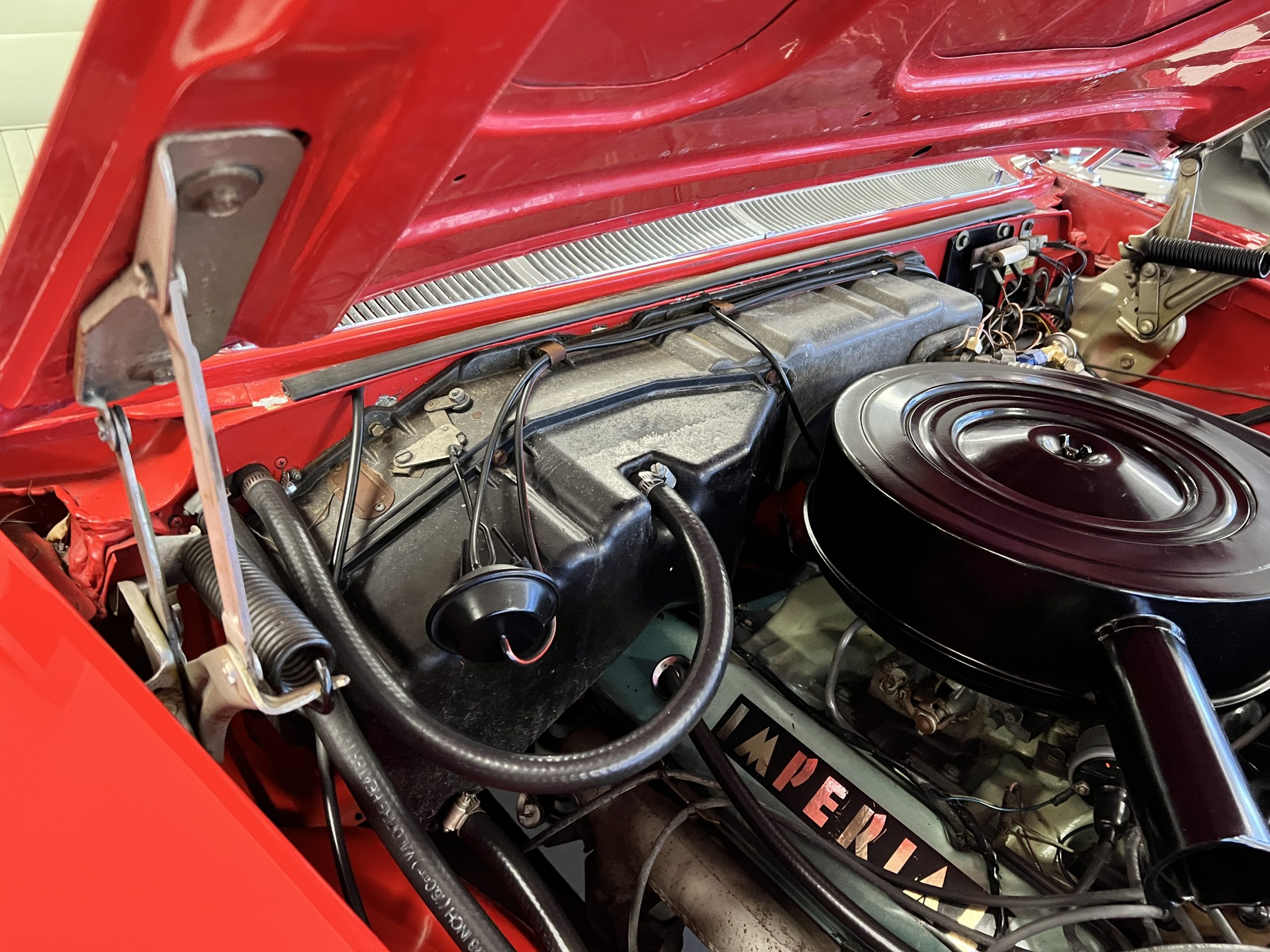 This Imperial features Festival Red (Paint Code A-1264R) livery with its correct white vinyl power convertible top. The paint is in overall excellent touring and show condition, with several small touched up chips from normal use since its restoration. The chrome and stainless are in overall excellent condition with a couple areas with small imperfections. The Imperial wheel covers are in very nice condition and the Coker wide white walled radials look perfect. Overall, the exterior is stunning and while not perfect, in excellent touring and show condition for most all regional and local shows and events.