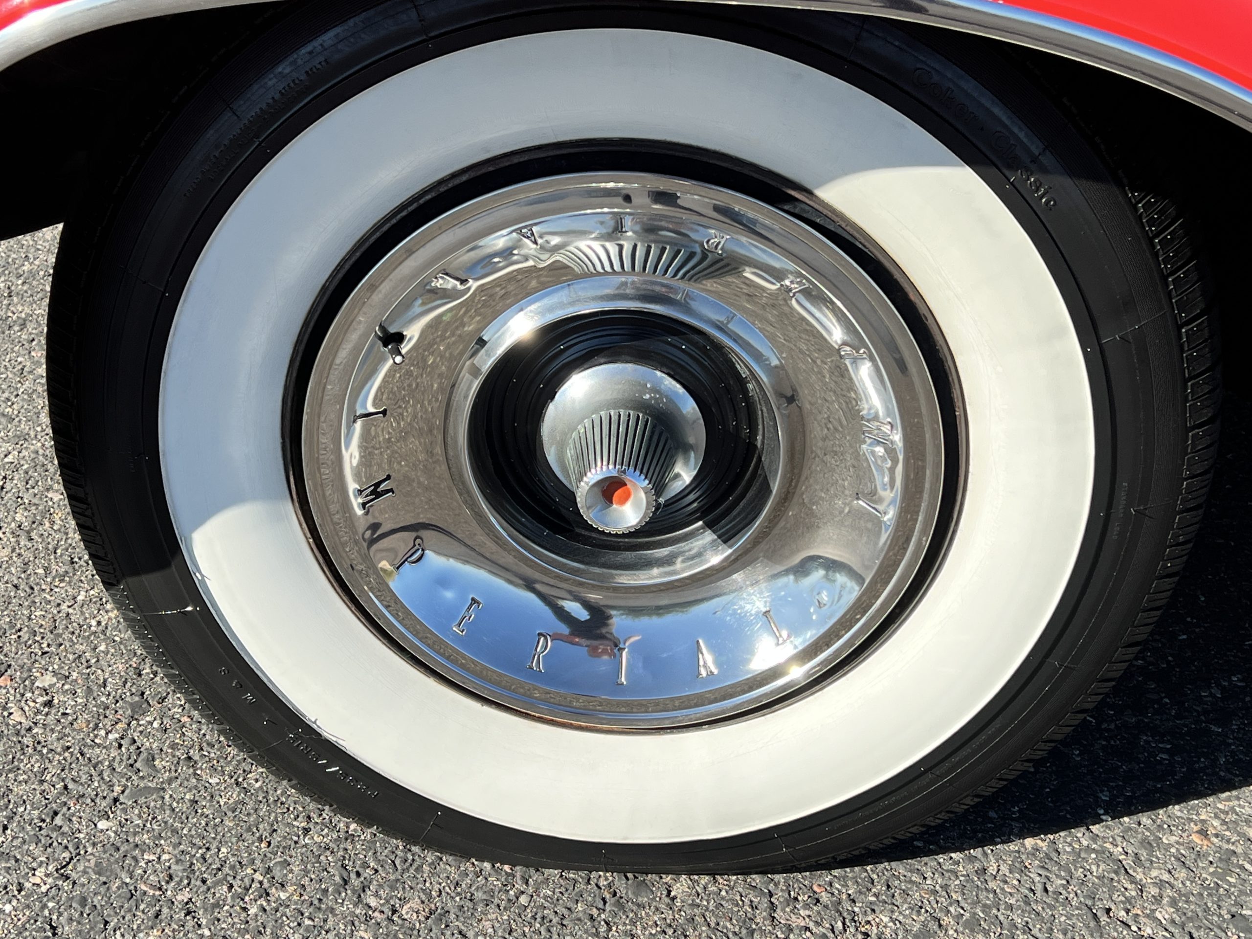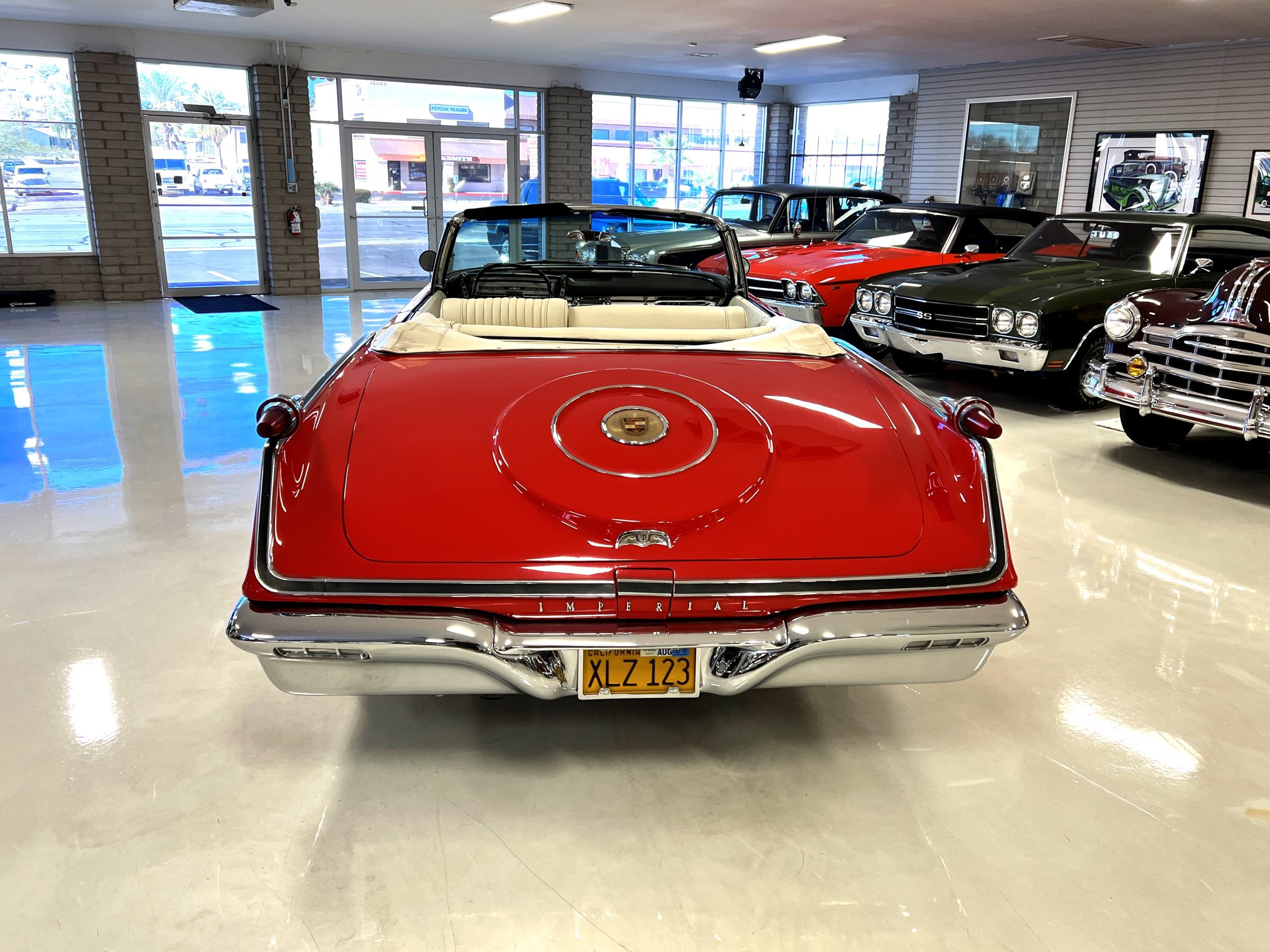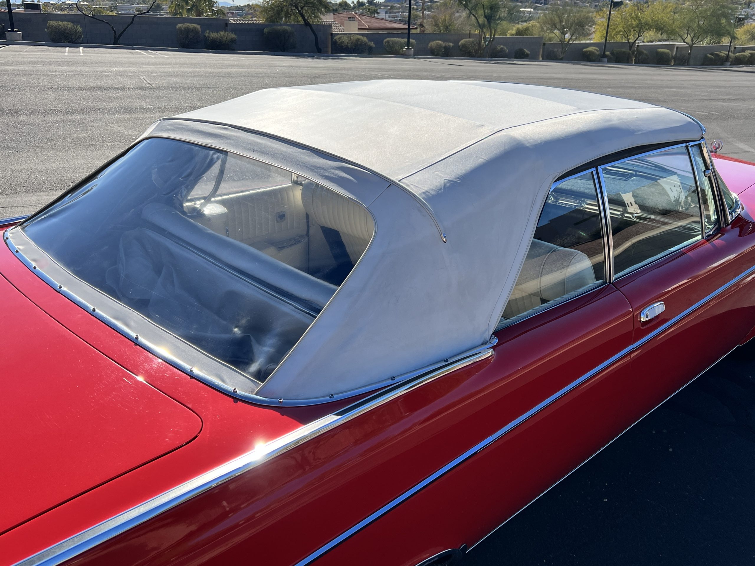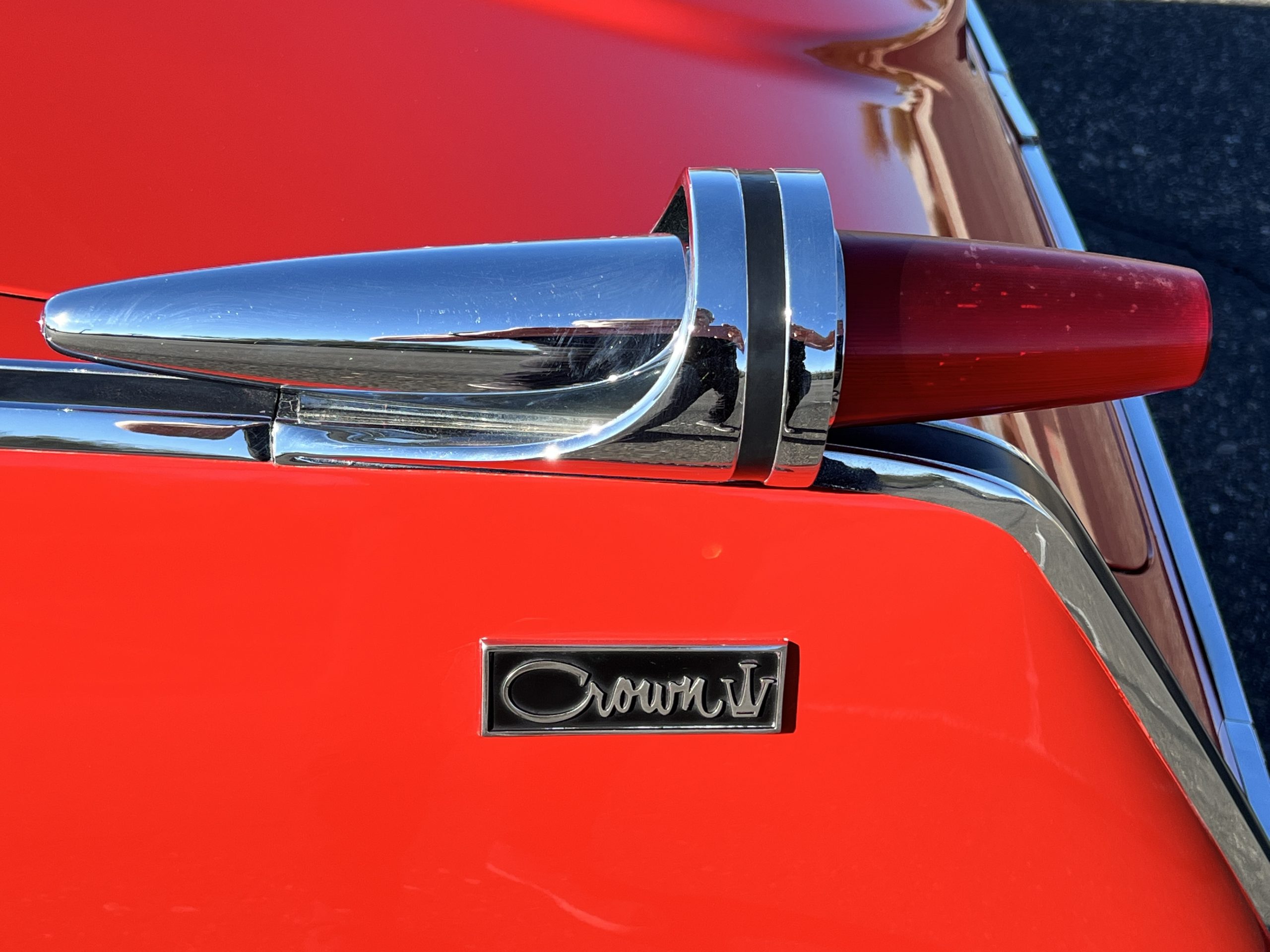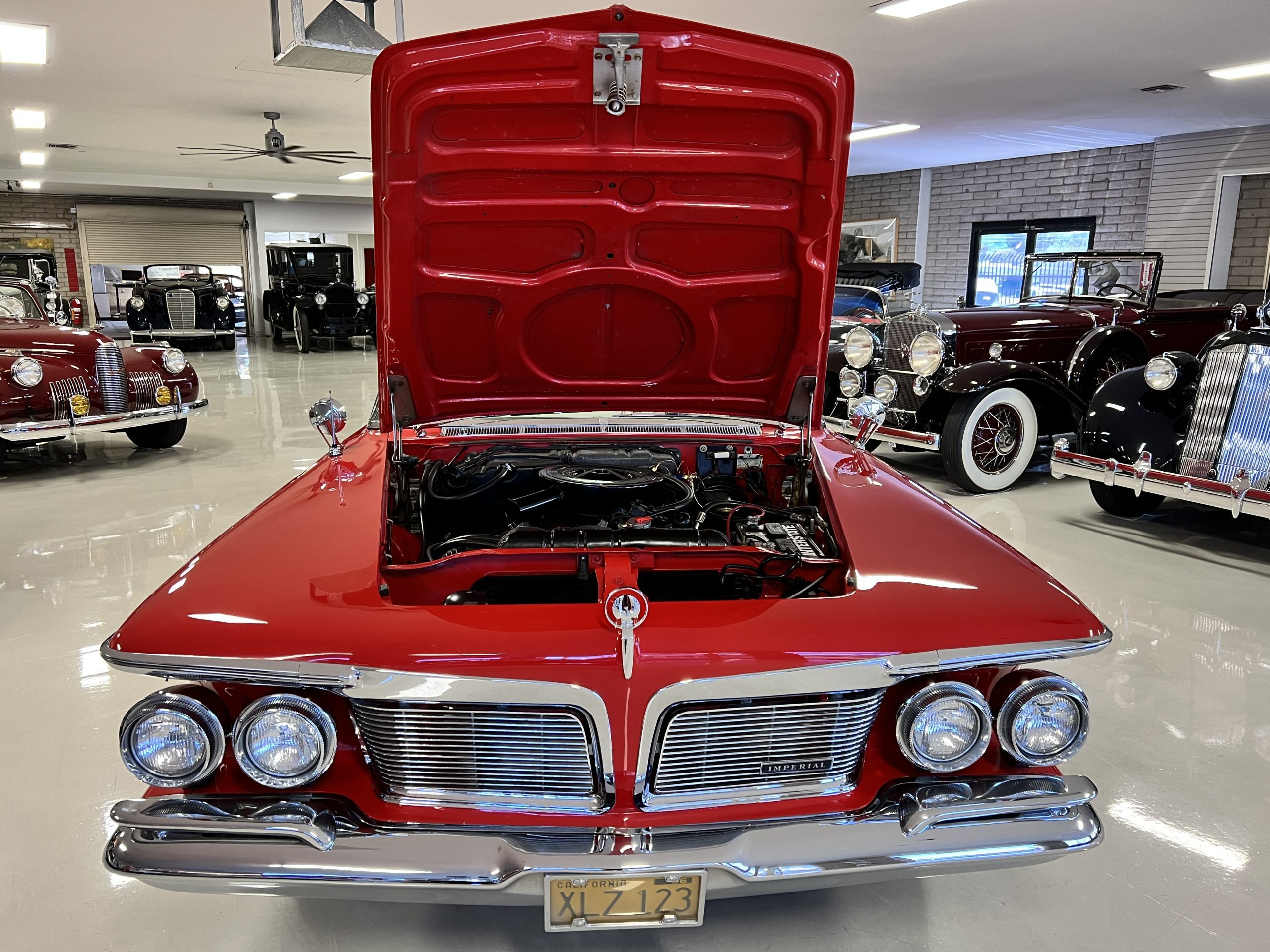 This Imperial features Festival Red (Paint Code A-1264R) livery with its correct white vinyl power convertible top. The paint is in overall excellent touring and show condition, with several small touched up chips from normal use since its restoration. The chrome and stainless are in overall excellent condition with a couple areas with small imperfections. The Imperial wheel covers are in very nice condition and the Coker wide white walled radials look perfect. Overall, the exterior is stunning and while not perfect, in excellent touring and show condition for most all regional and local shows and events.