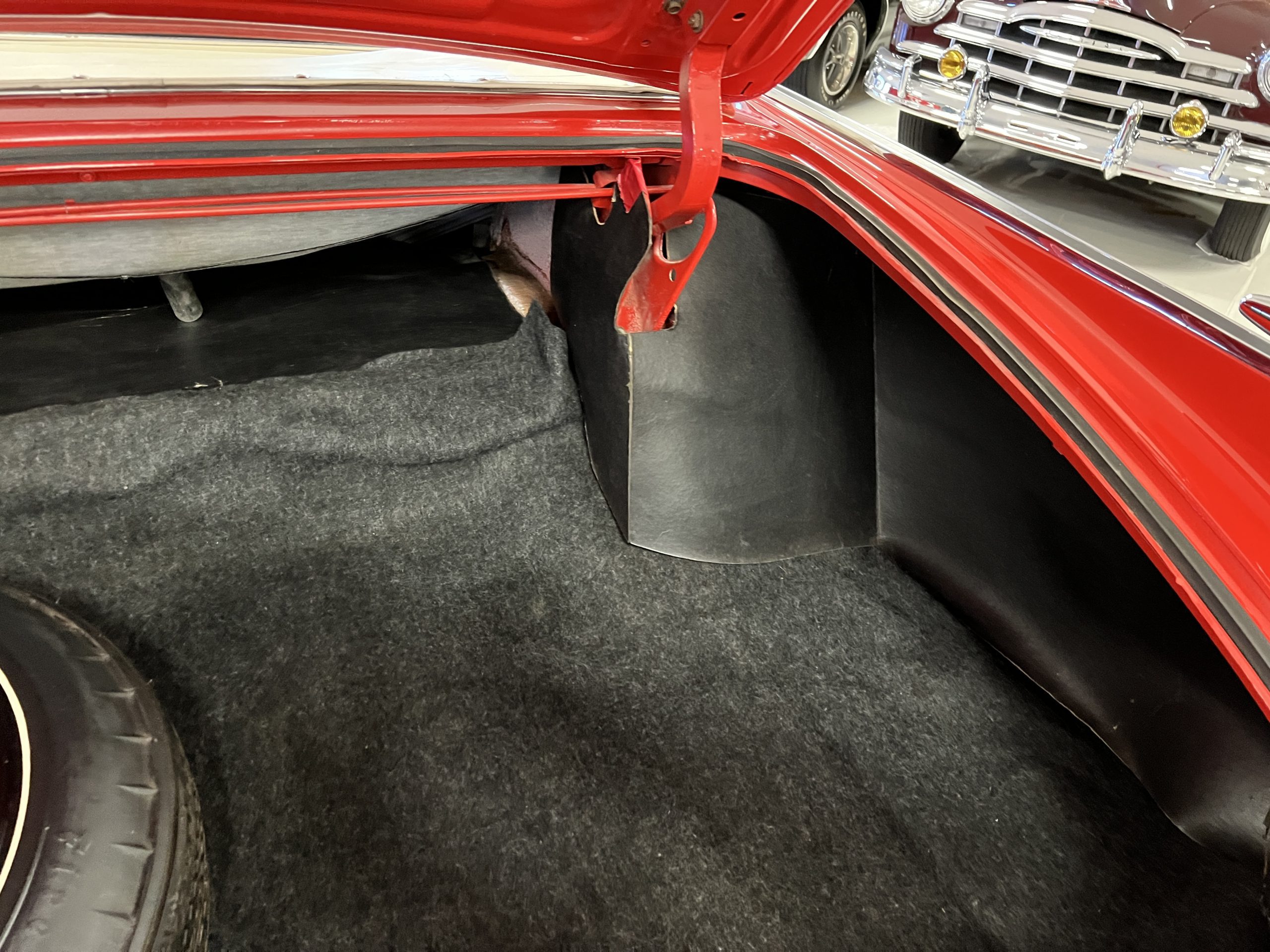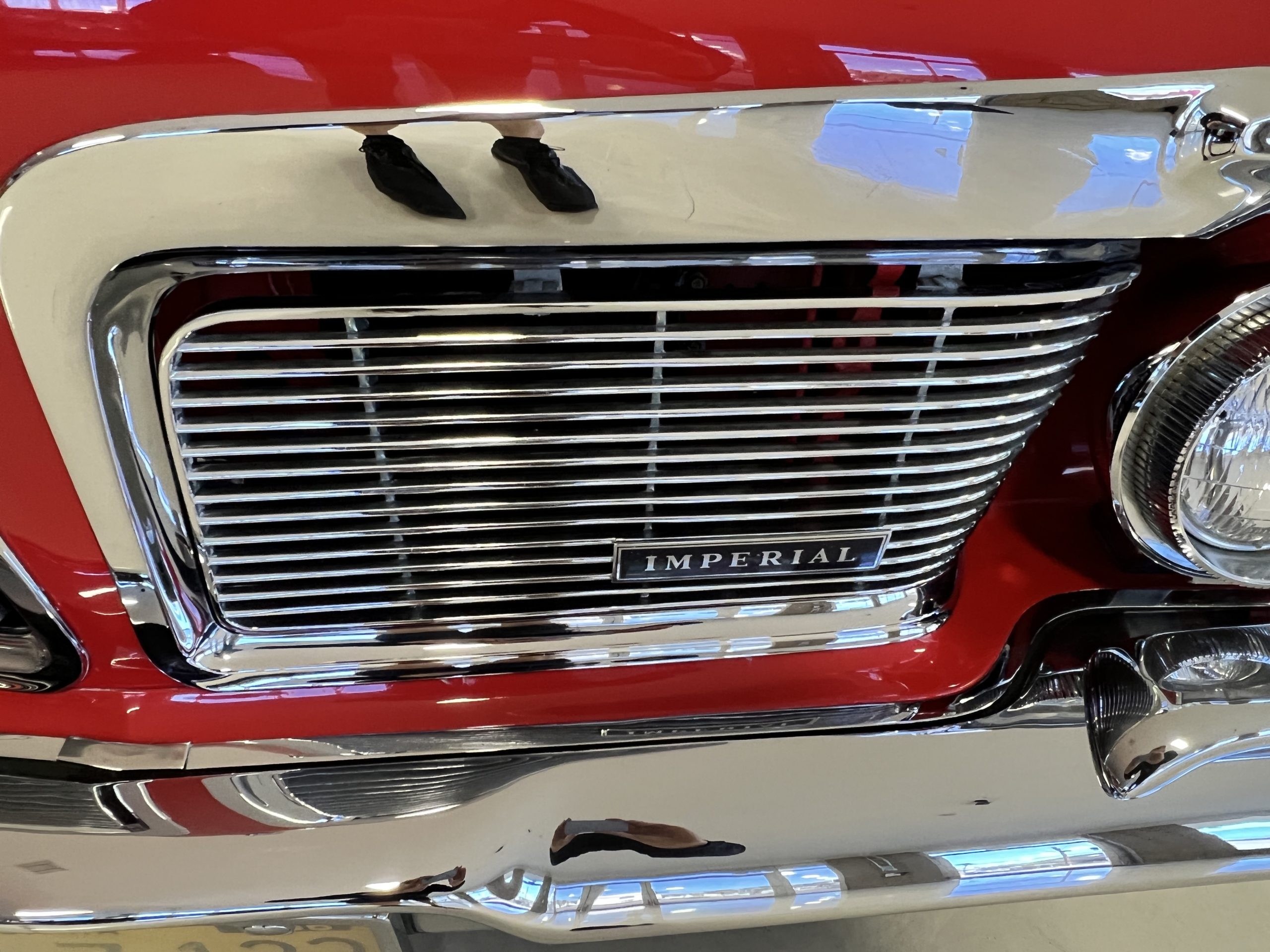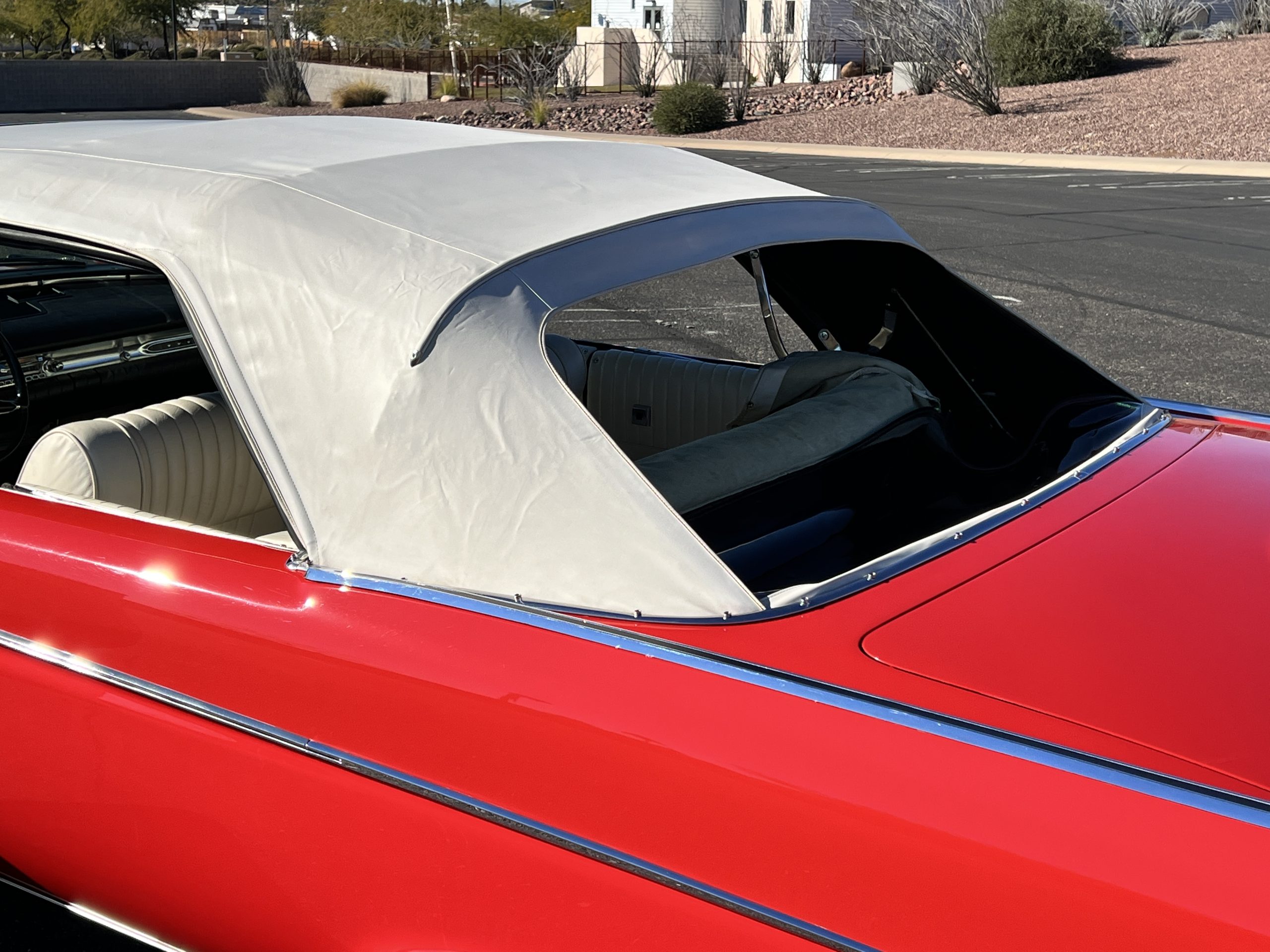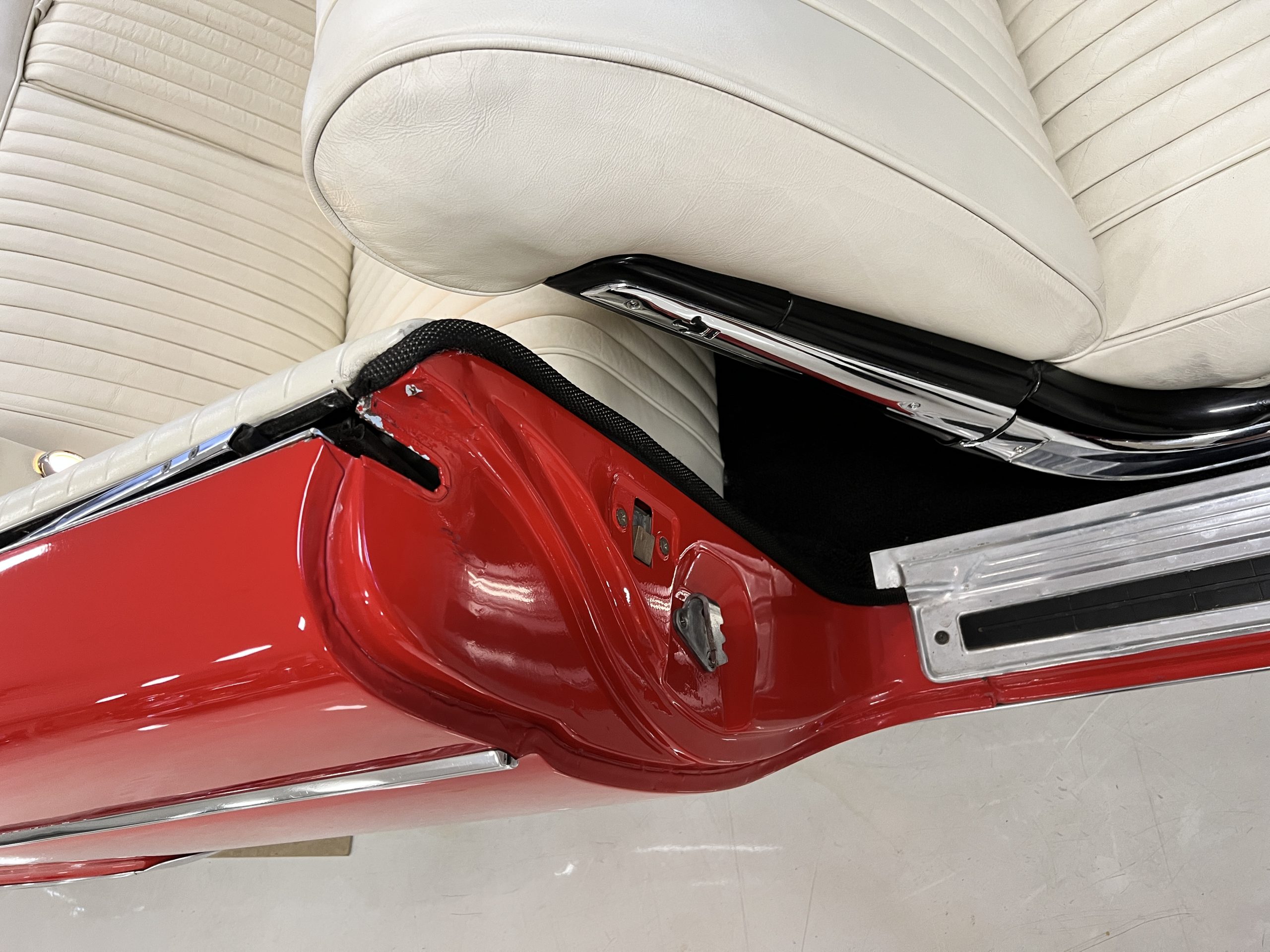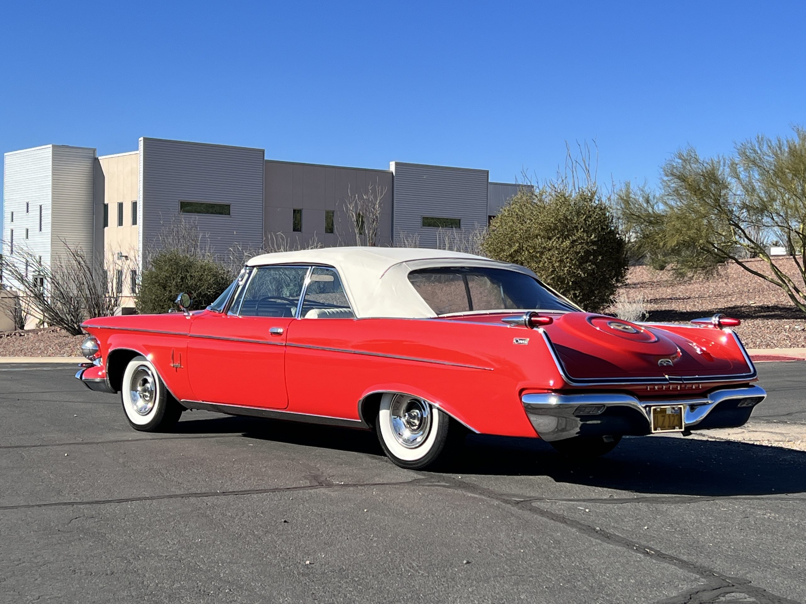 This Imperial features Festival Red (Paint Code A-1264R) livery with its correct white vinyl power convertible top. The paint is in overall excellent touring and show condition, with several small touched up chips from normal use since its restoration. The chrome and stainless are in overall excellent condition with a couple areas with small imperfections. The Imperial wheel covers are in very nice condition and the Coker wide white walled radials look perfect. Overall, the exterior is stunning and while not perfect, in excellent touring and show condition for most all regional and local shows and events.