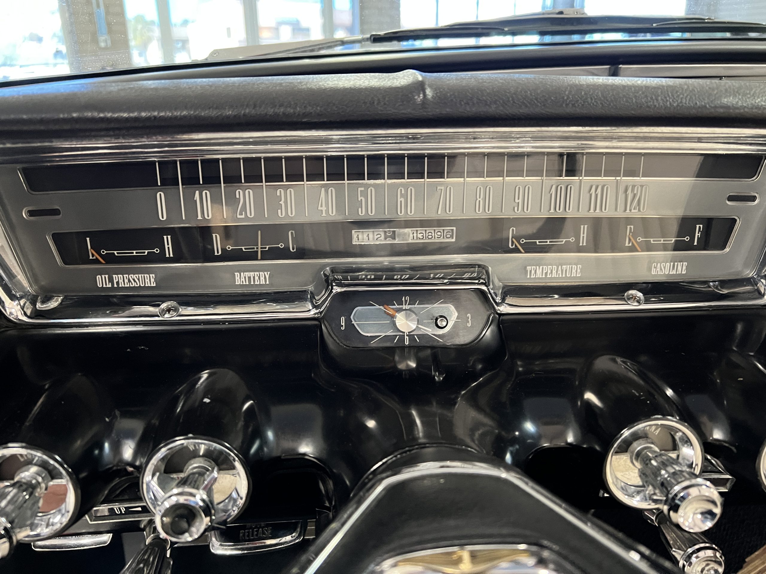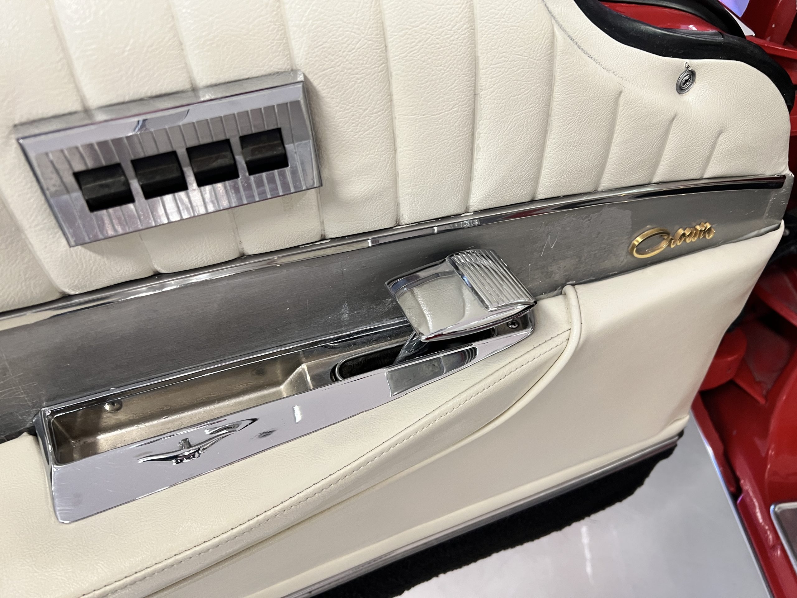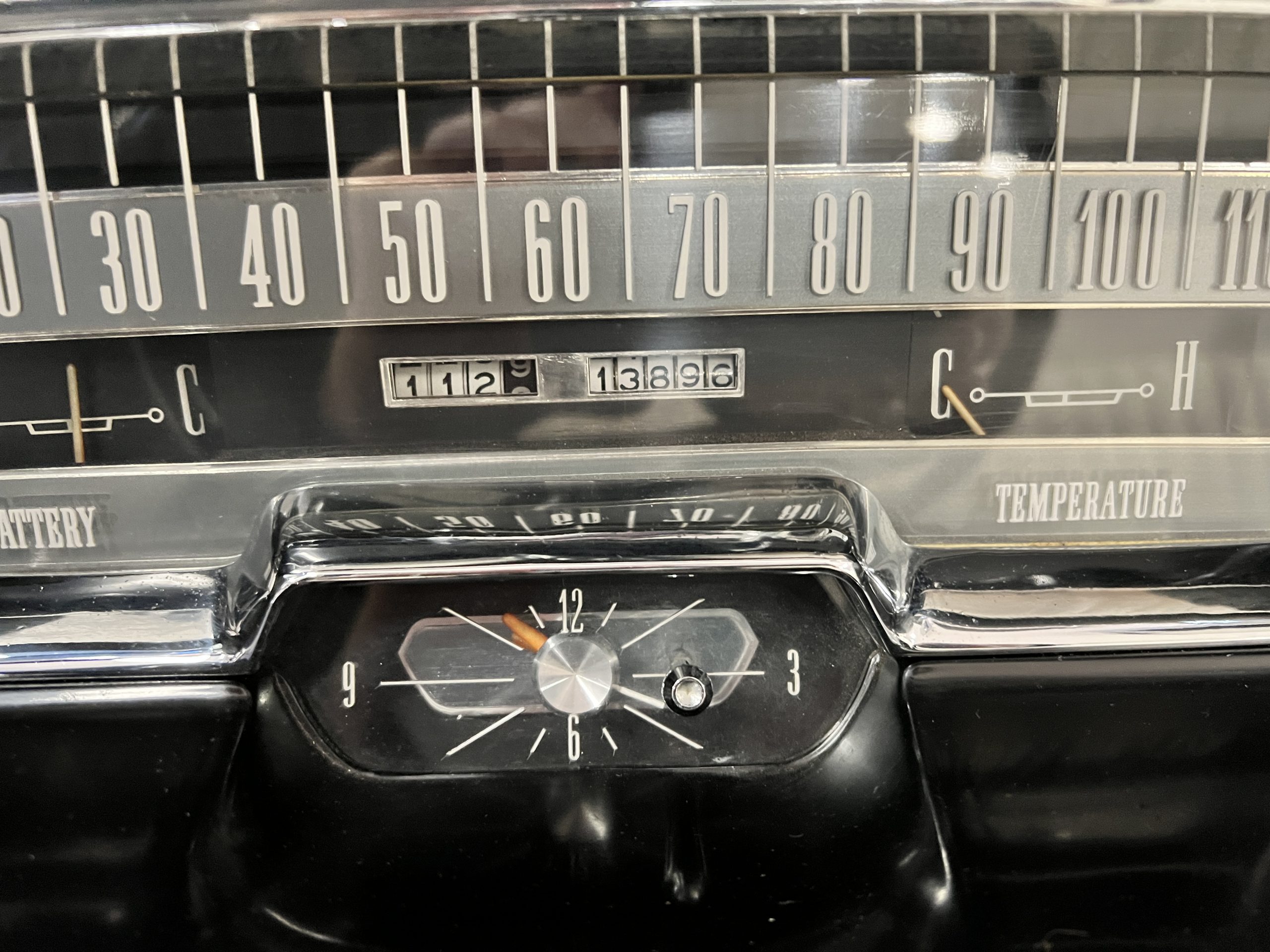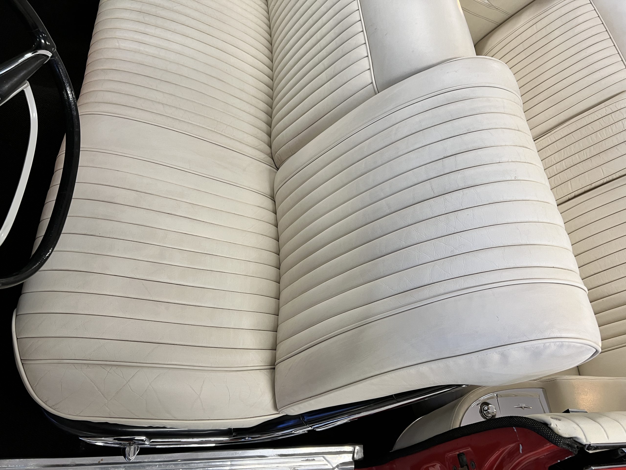 The interior is in its correct Off-White Leather (Trim Code 557) with black and chrome trim throughout. The leather is very soft and supple with no cracking or other issues. The chrome and stainless is also in very nice condition. The mid-century modern designed dash is incredible, including the squared off steering wheel. The steering wheel has a few normal cracks, but looks and feels awesome. The black carpeting shows very well and the instruments work well, including the power antenna. The clock and radio are not working, at present.