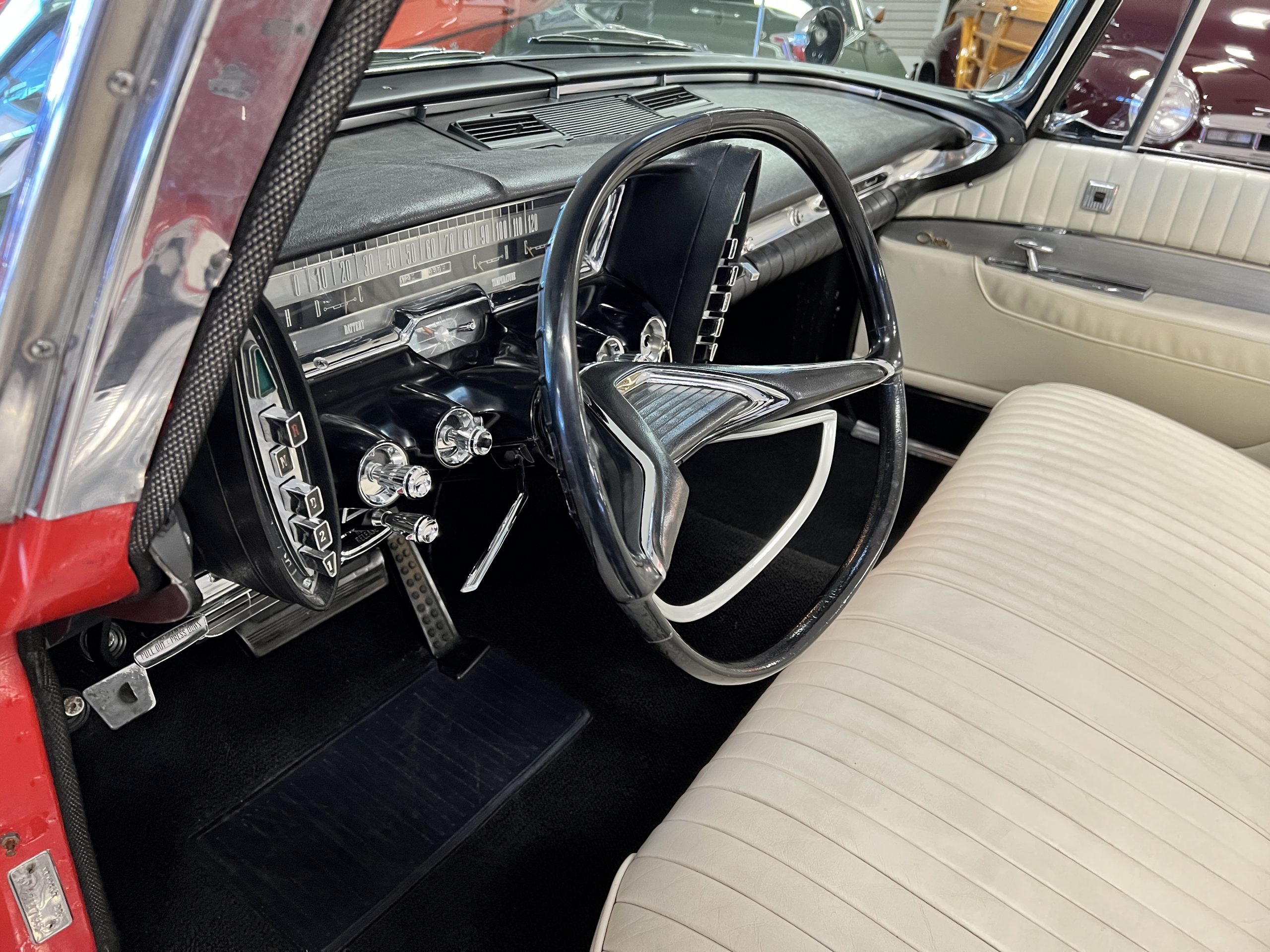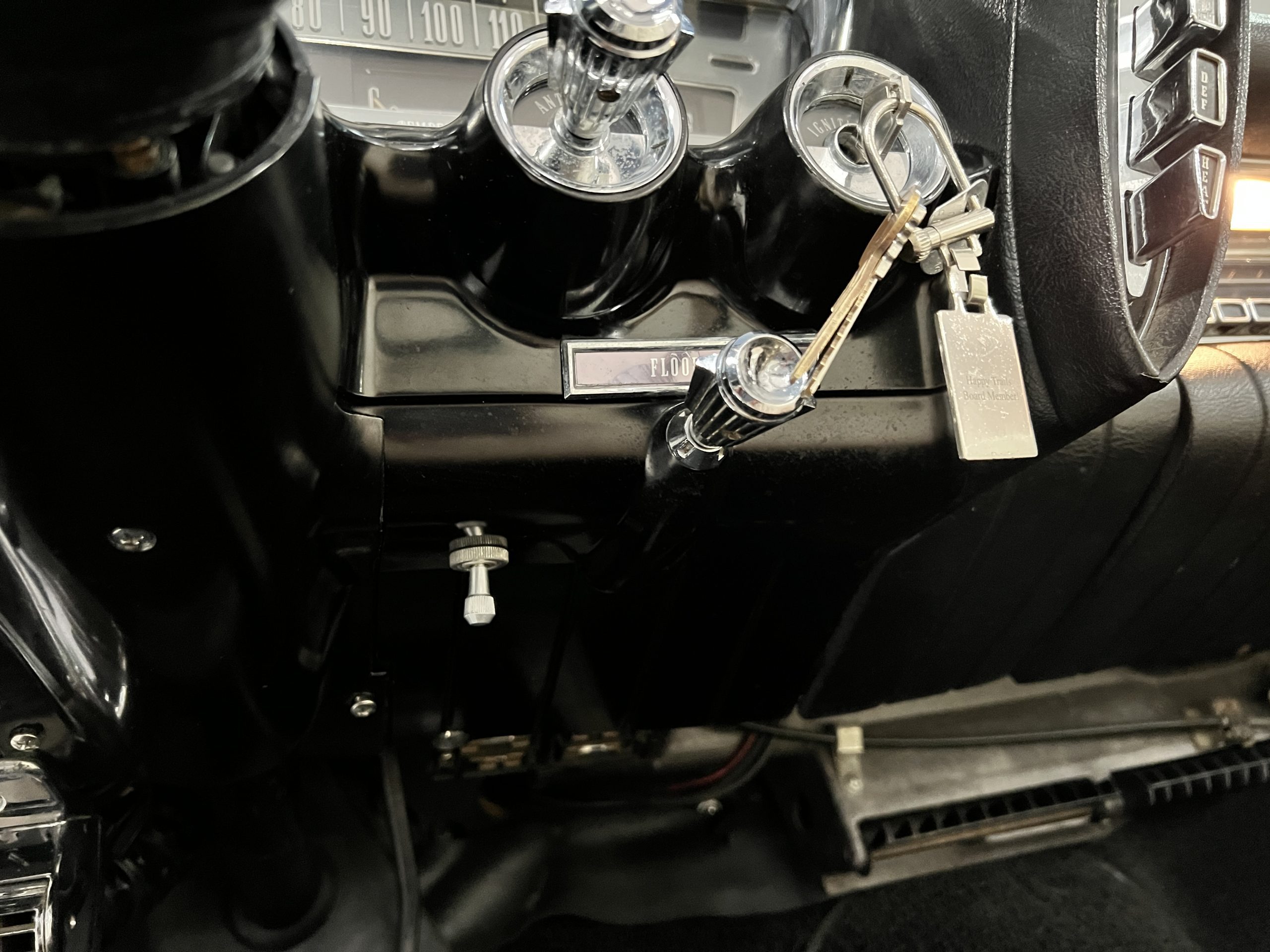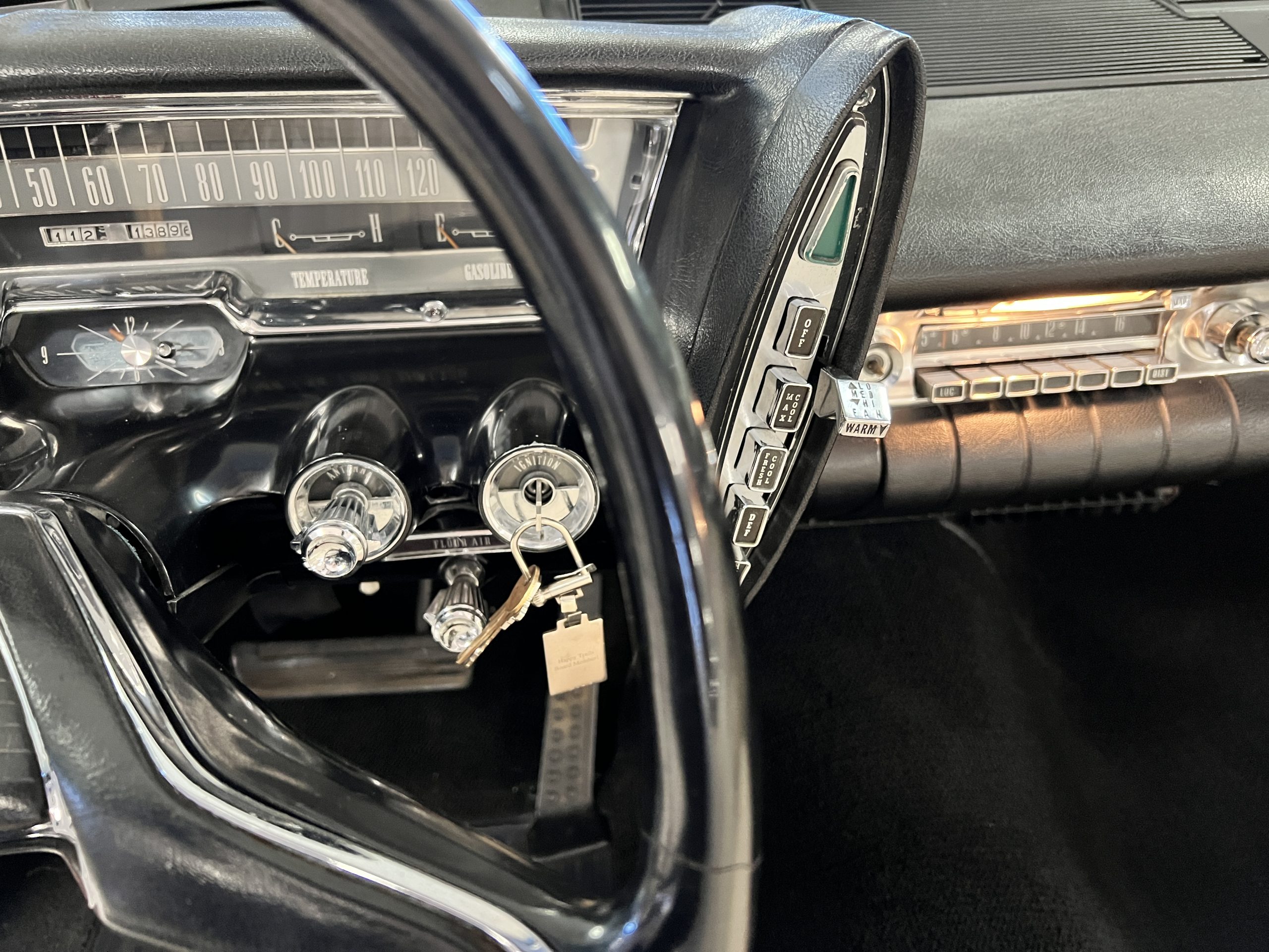 The interior is in its correct Off-White Leather (Trim Code 557) with black and chrome trim throughout. The leather is very soft and supple with no cracking or other issues. The chrome and stainless is also in very nice condition. The mid-century modern designed dash is incredible, including the squared off steering wheel. The steering wheel has a few normal cracks, but looks and feels awesome. The black carpeting shows very well and the instruments work well, including the power antenna. The clock and radio are not working, at present.