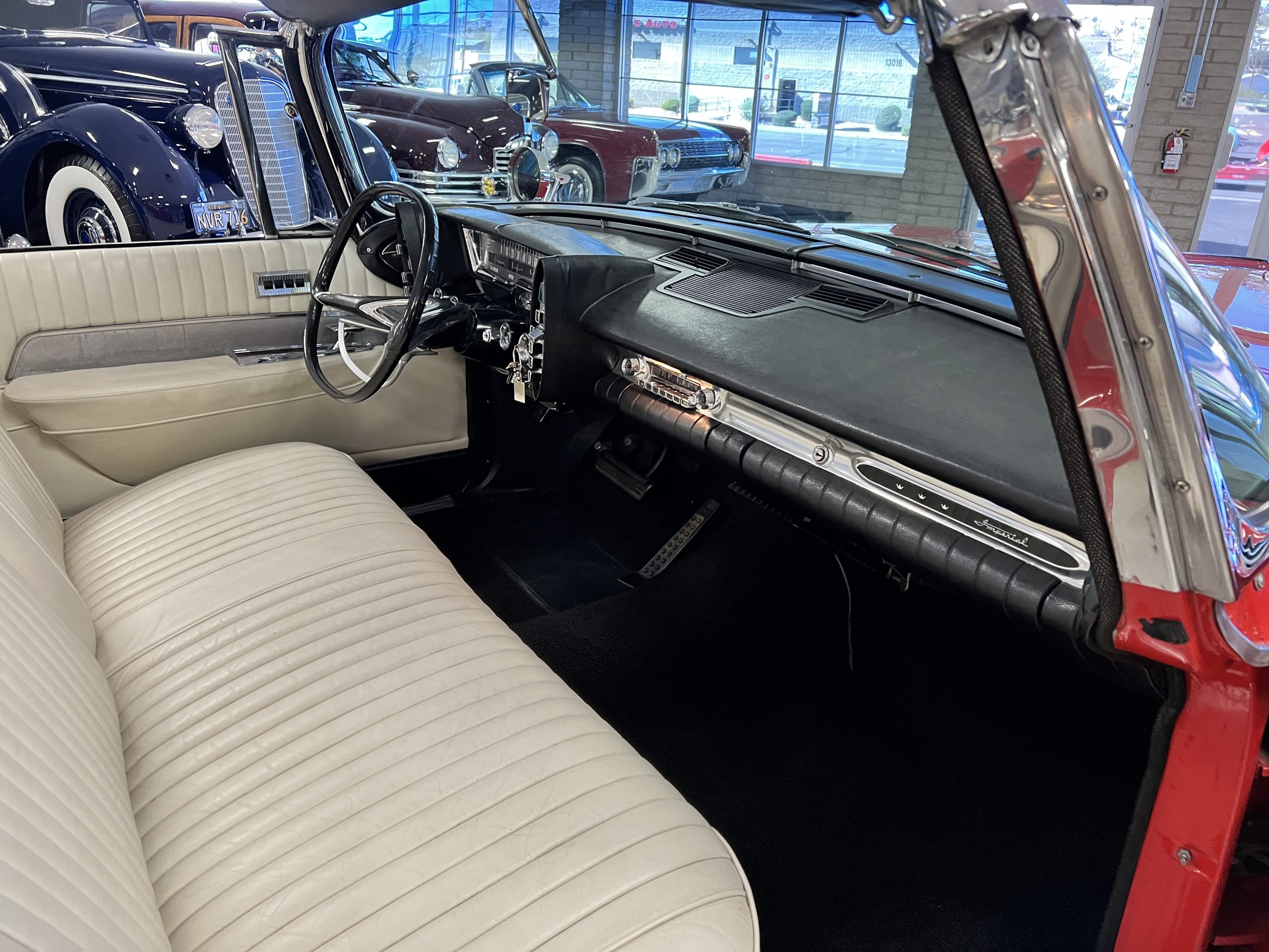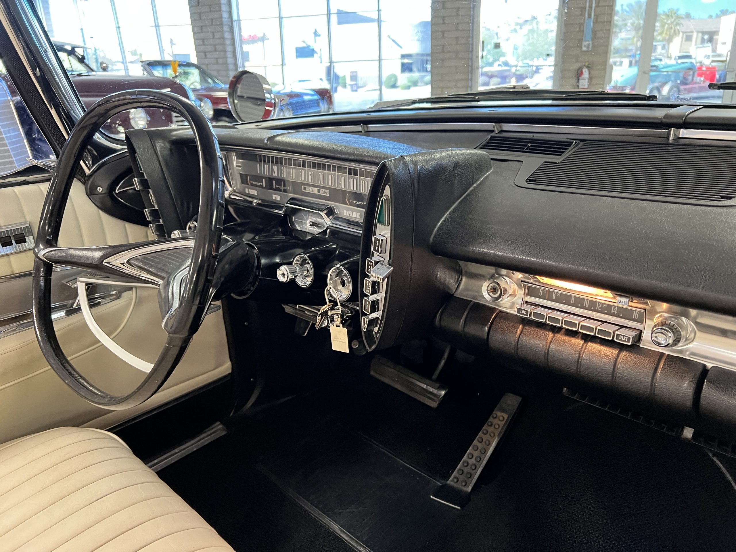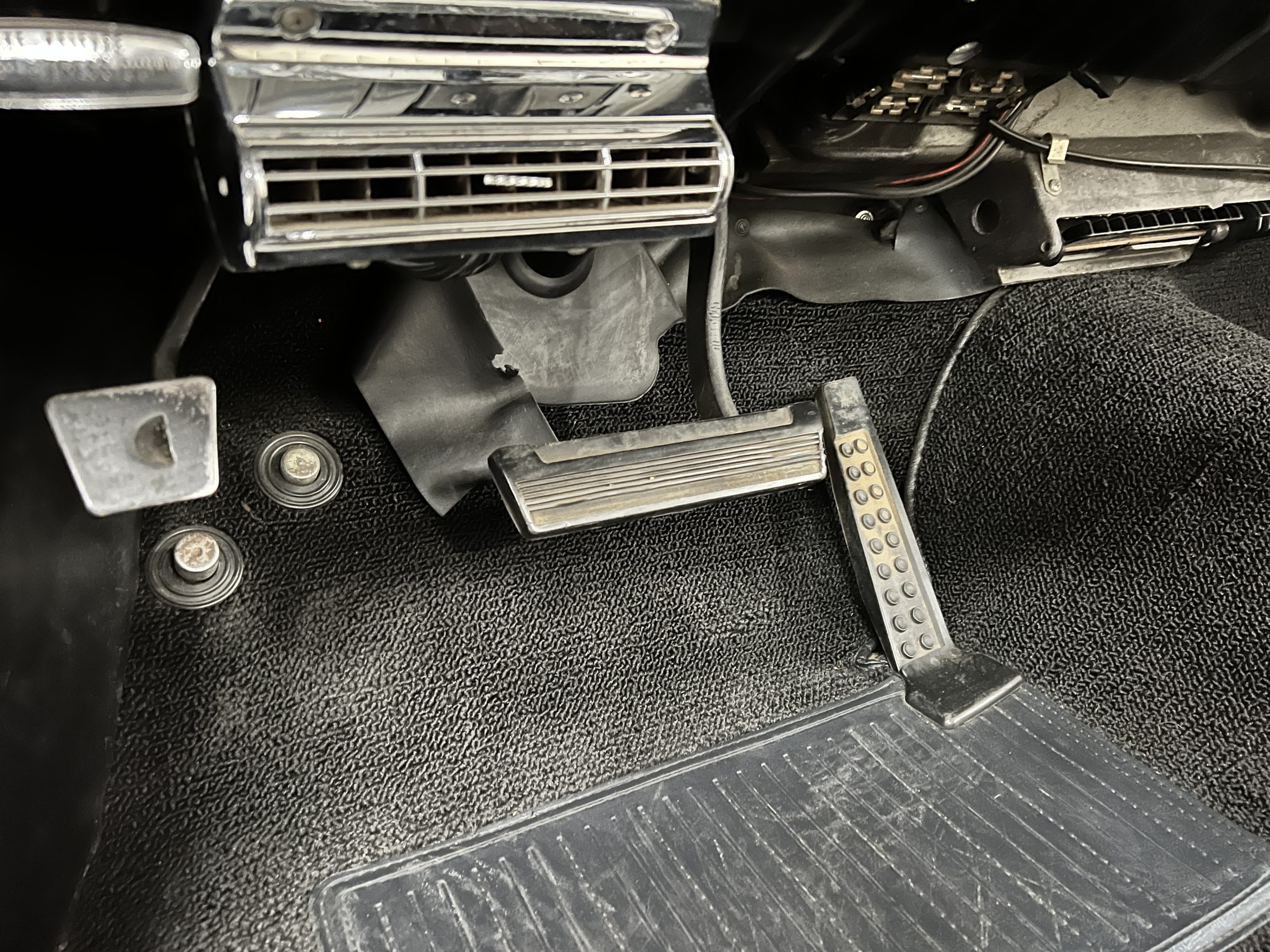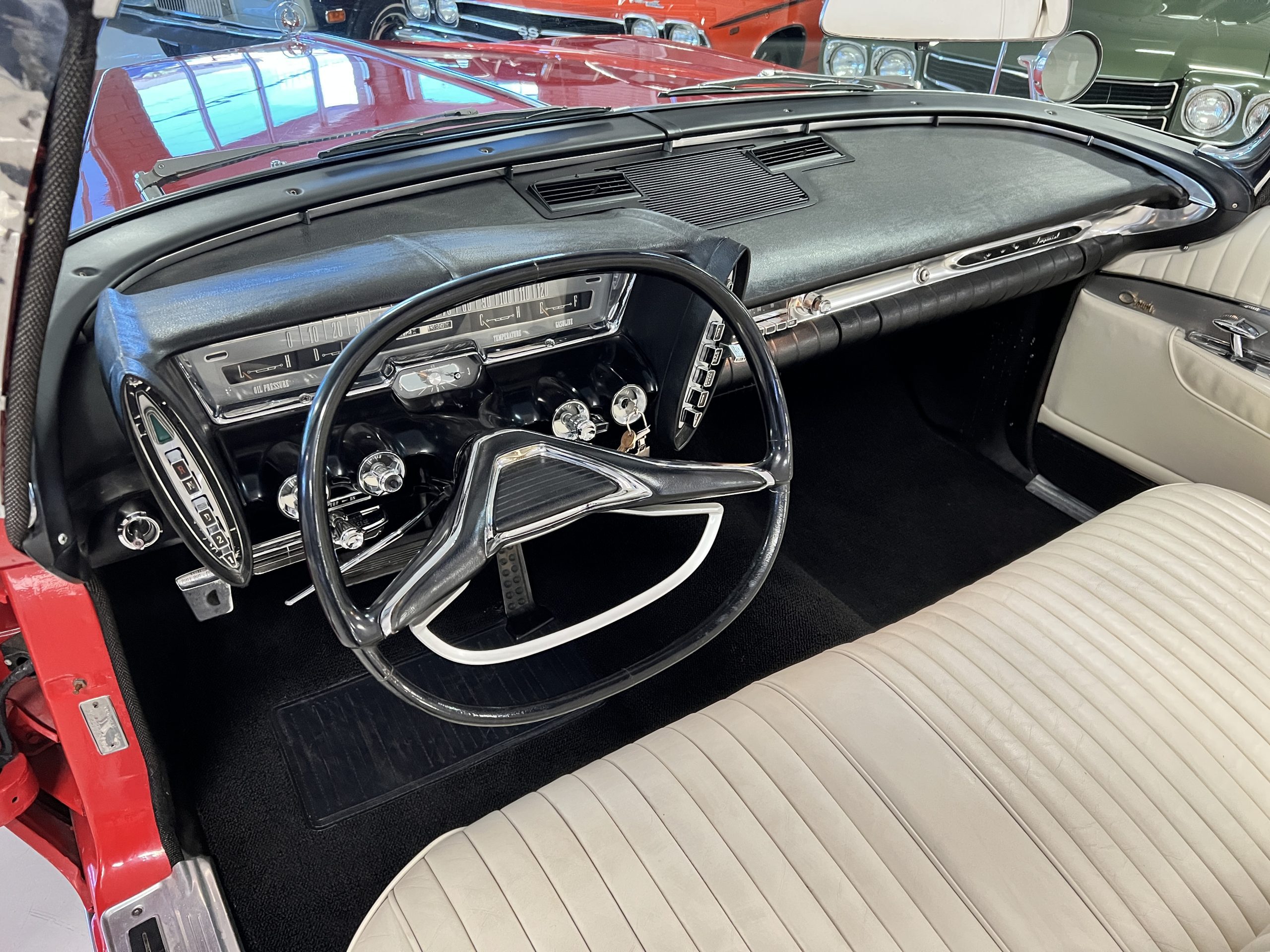 The interior is in its correct Off-White Leather (Trim Code 557) with black and chrome trim throughout. The leather is very soft and supple with no cracking or other issues. The chrome and stainless is also in very nice condition. The mid-century modern designed dash is incredible, including the squared off steering wheel. The steering wheel has a few normal cracks, but looks and feels awesome. The black carpeting shows very well and the instruments work well, including the power antenna. The clock and radio are not working, at present.
