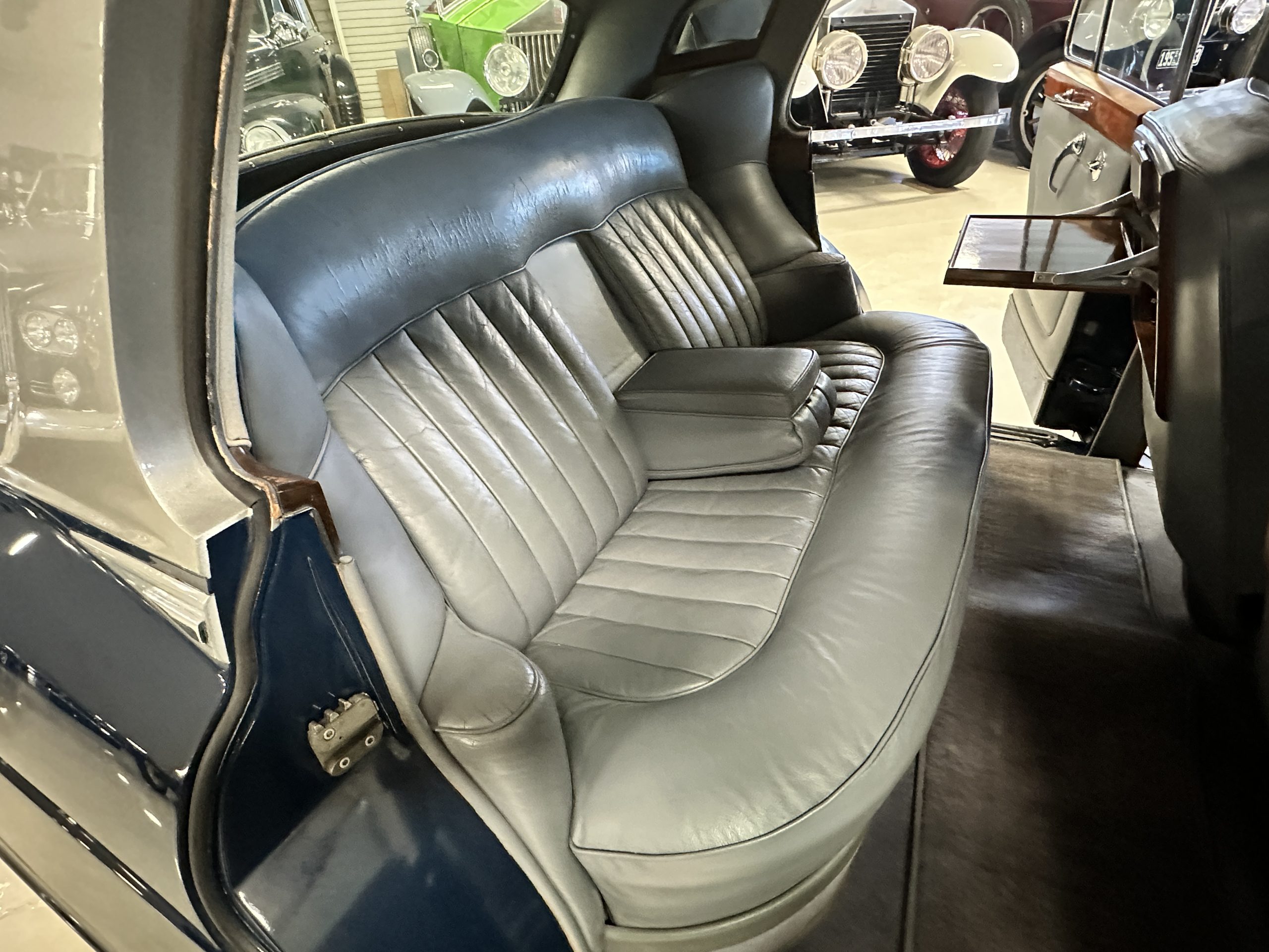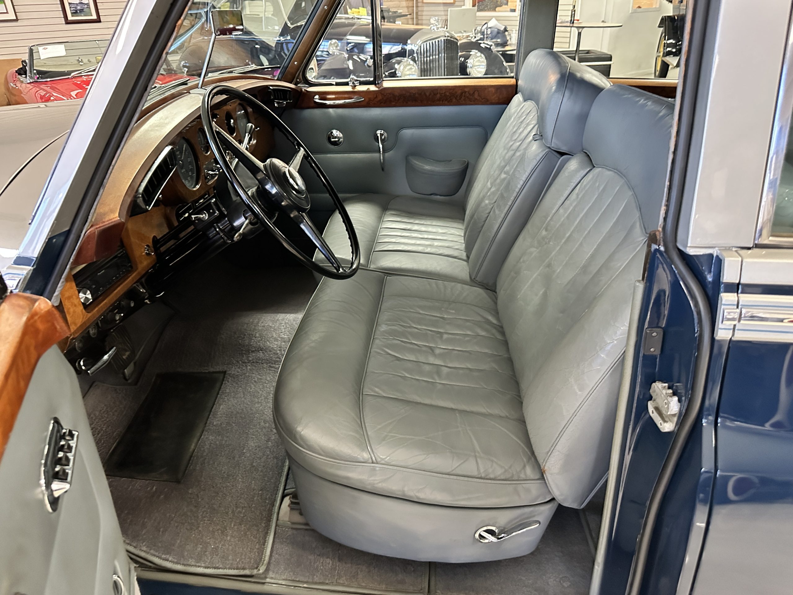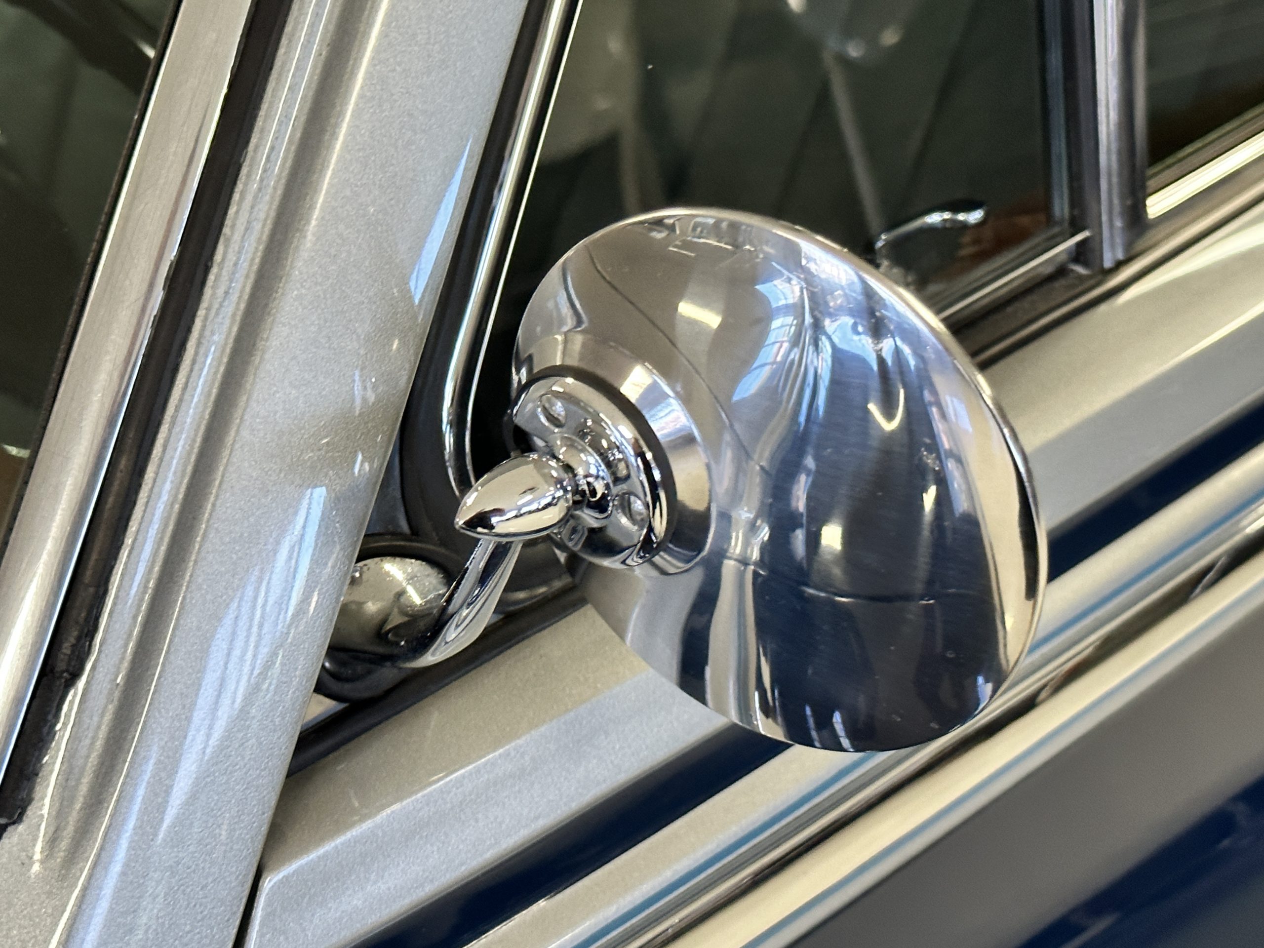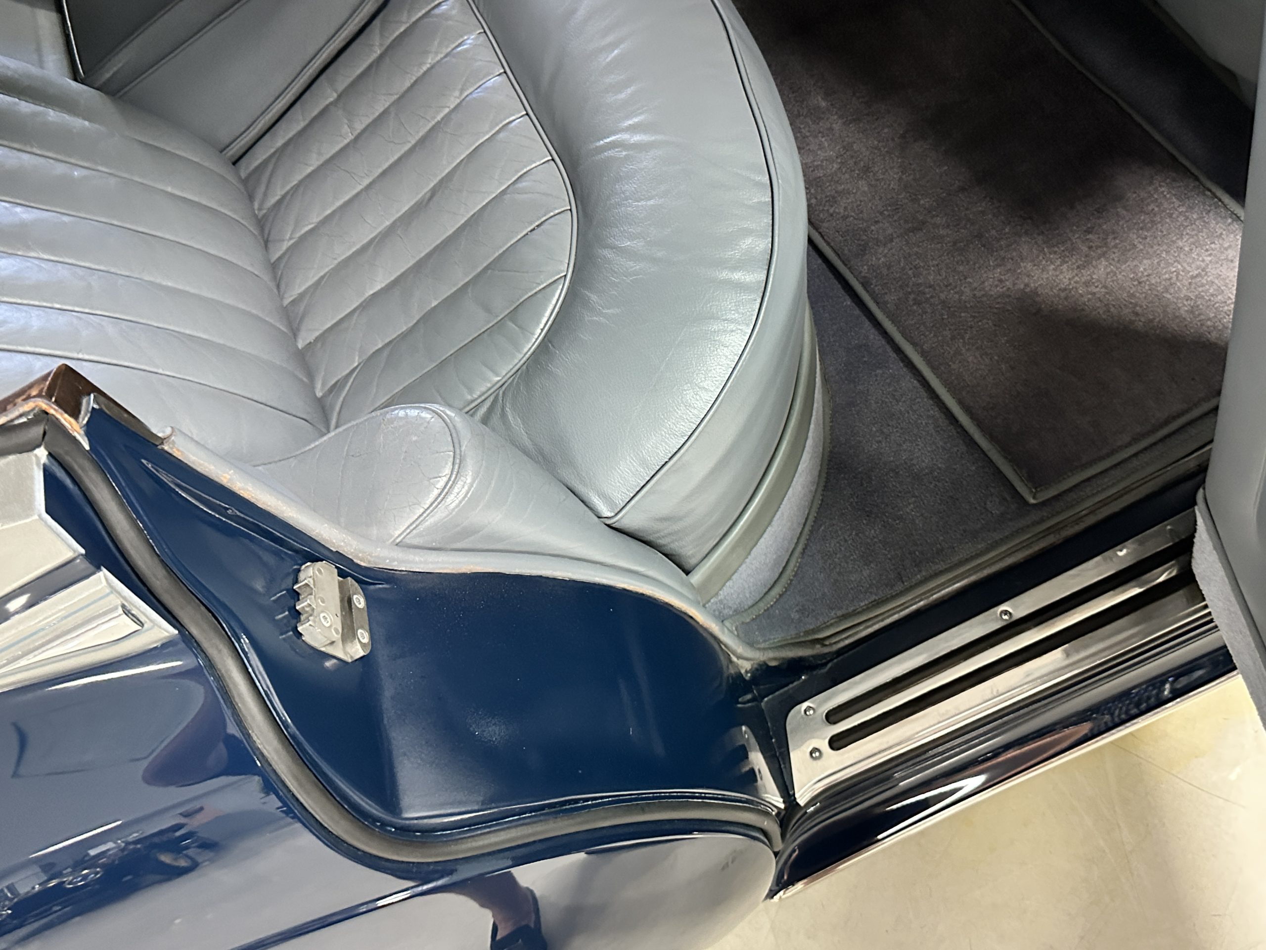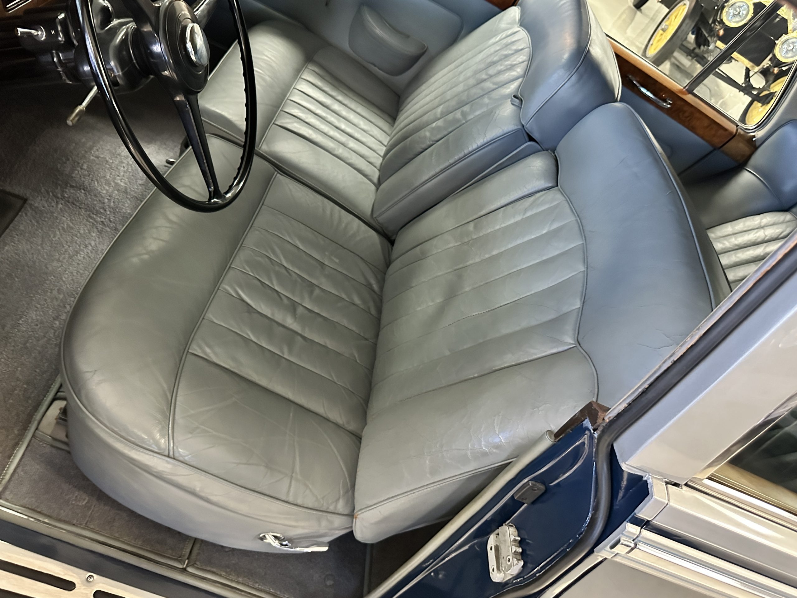 The livery is stunning in its newly painted two-toned Shell Gray over Dark Blue with Light Blue pinstriping. The paint is gorgeous and was done correctly as per the factory scheme for two toned Silver Clouds. The chrome and stainless-steel trim are beautiful and there are only minimal small dings in the bumper overriders. The wide white walled Coker American Classic radials allow for a comfortable and safe ride. Overall, the exterior is in excellent condition.