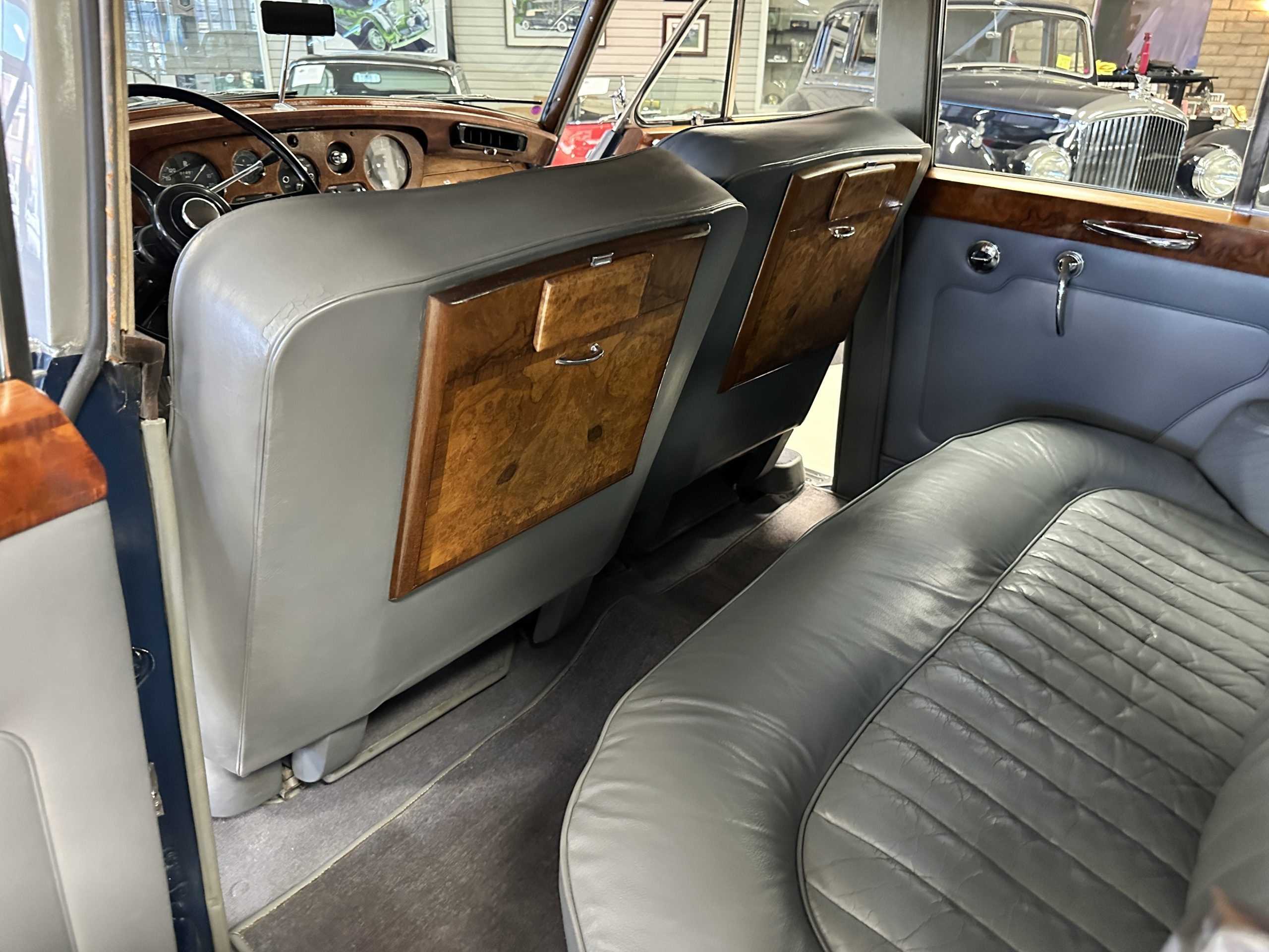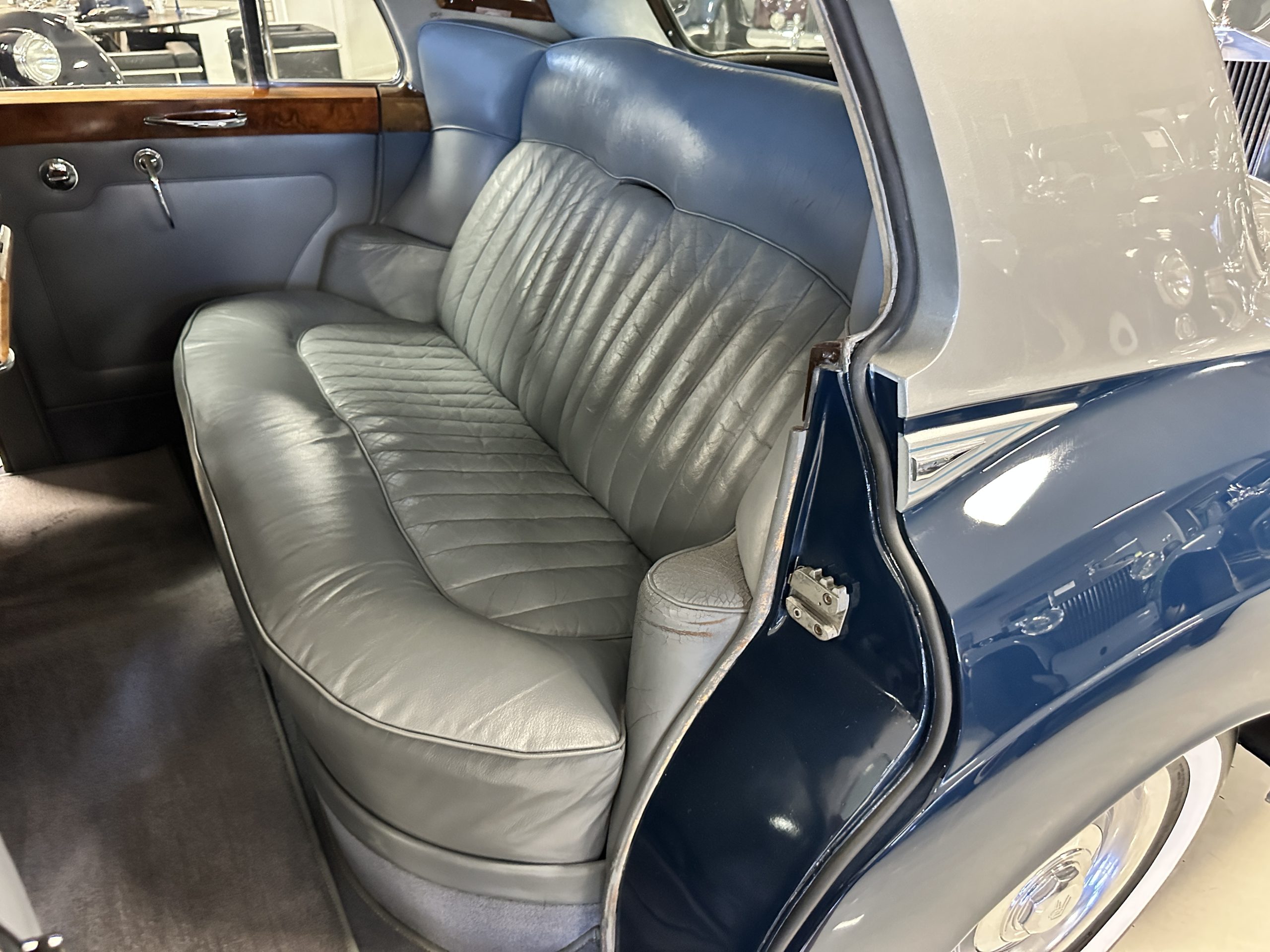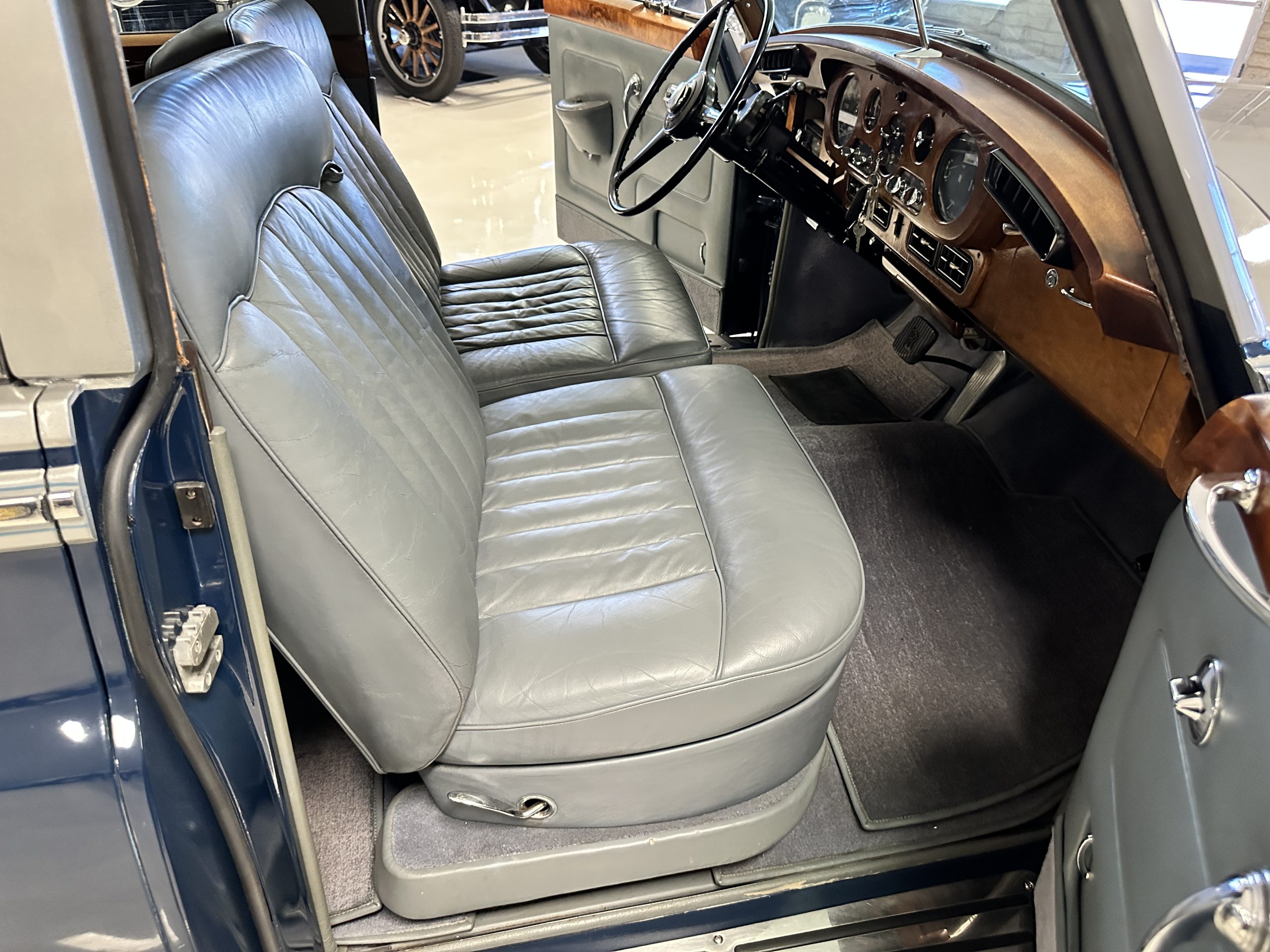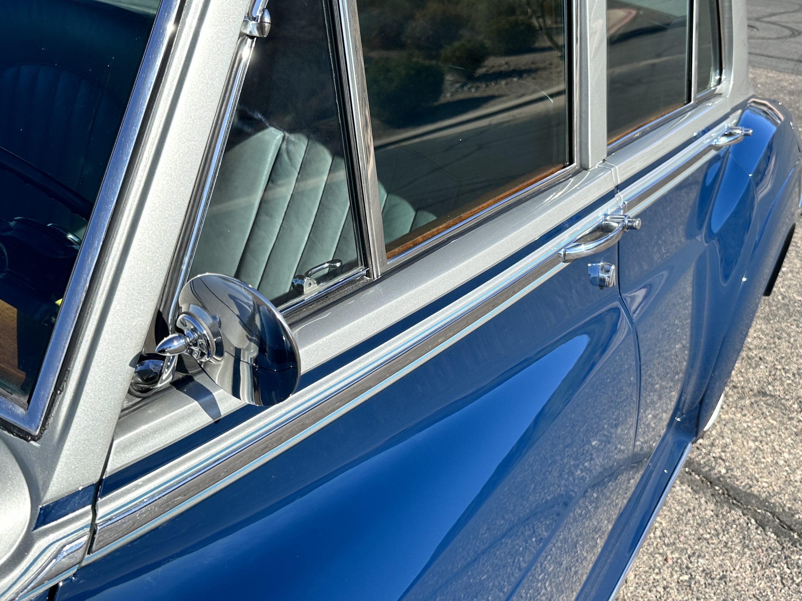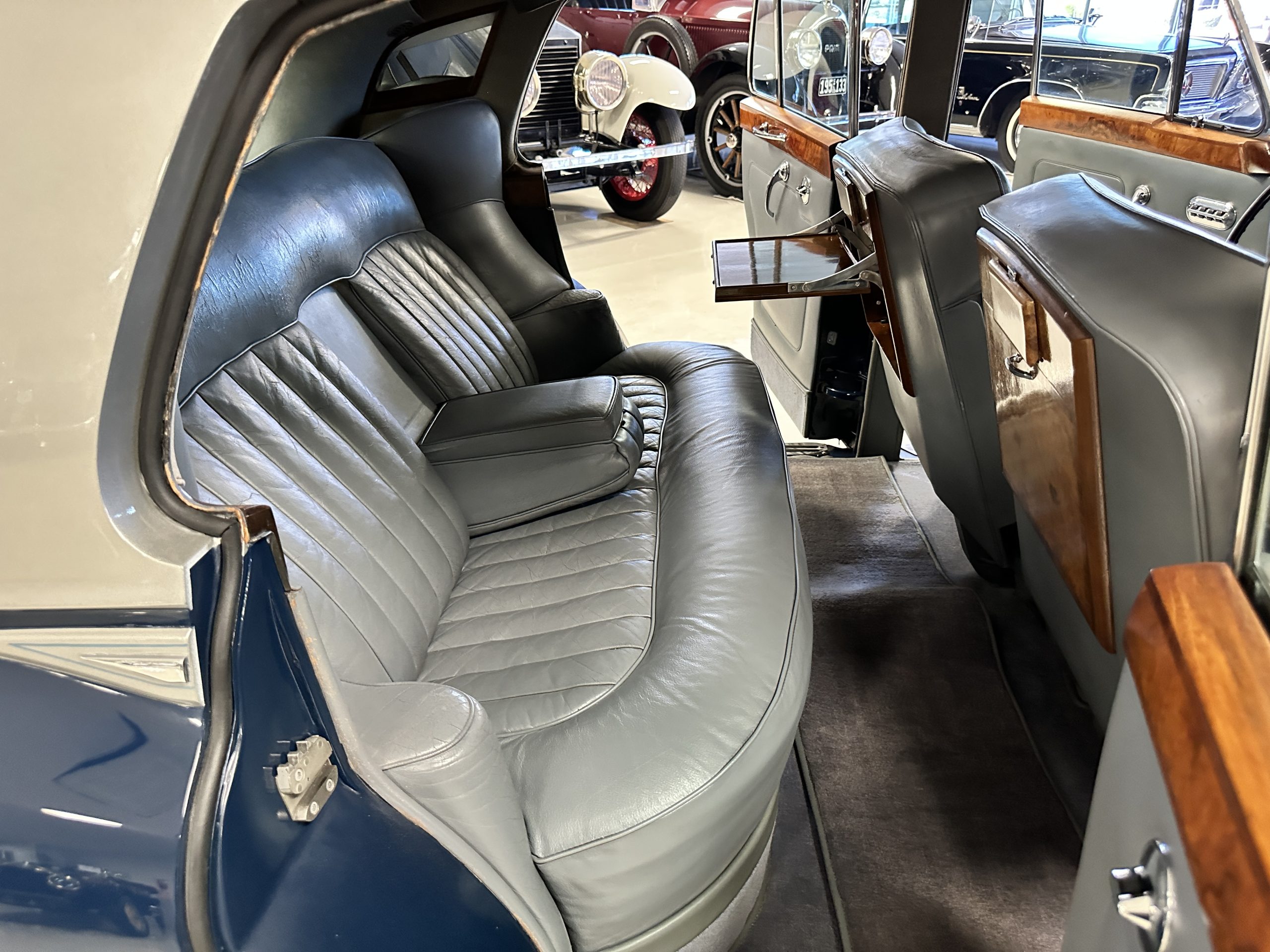The livery is stunning in its newly painted two-toned Shell Gray over Dark Blue with Light Blue pinstriping. The paint is gorgeous and was done correctly as per the factory scheme for two toned Silver Clouds. The chrome and stainless-steel trim are beautiful and there are only minimal small dings in the bumper overriders. The wide white walled Coker American Classic radials allow for a comfortable and safe ride. Overall, the exterior is in excellent condition.