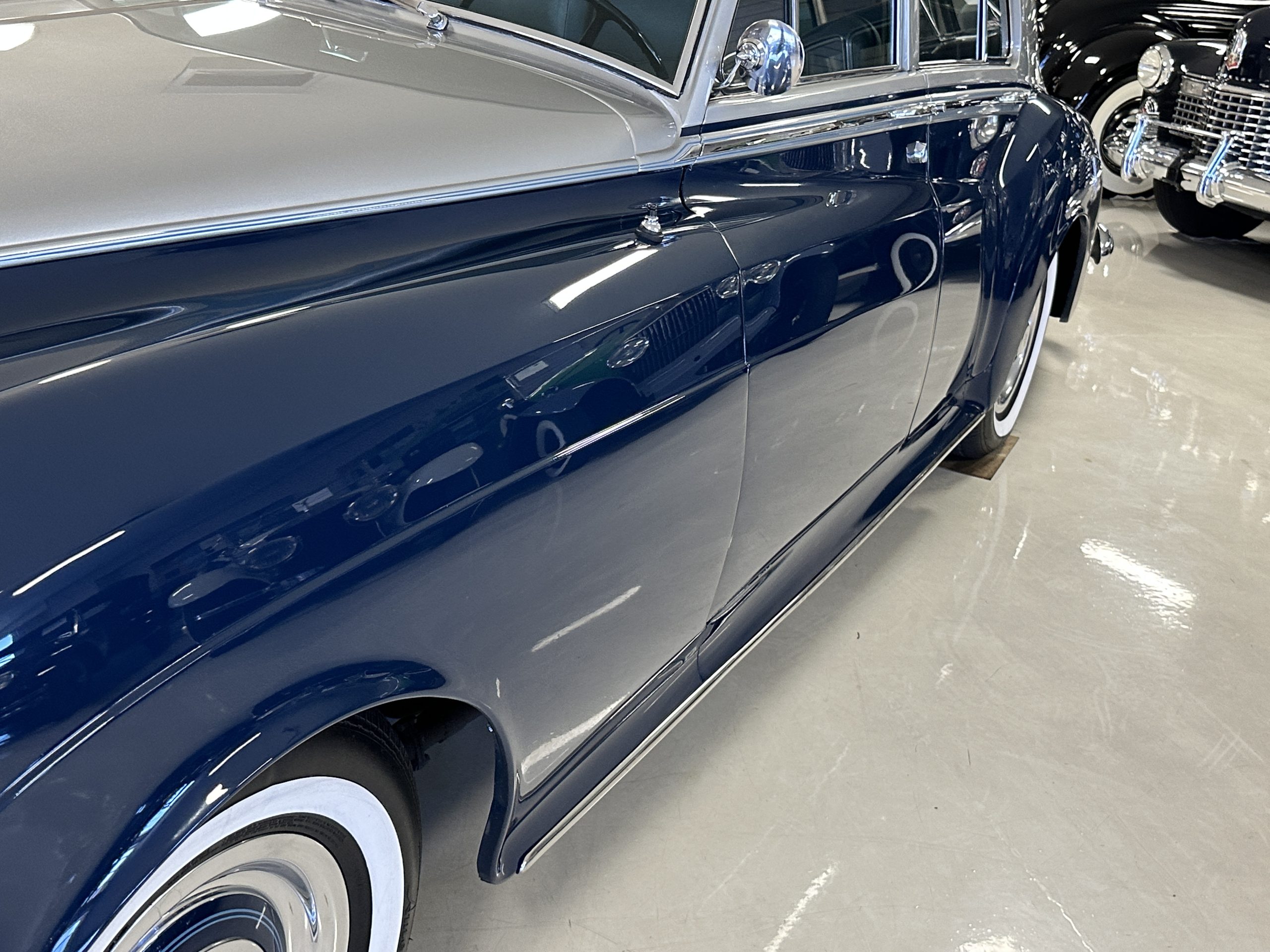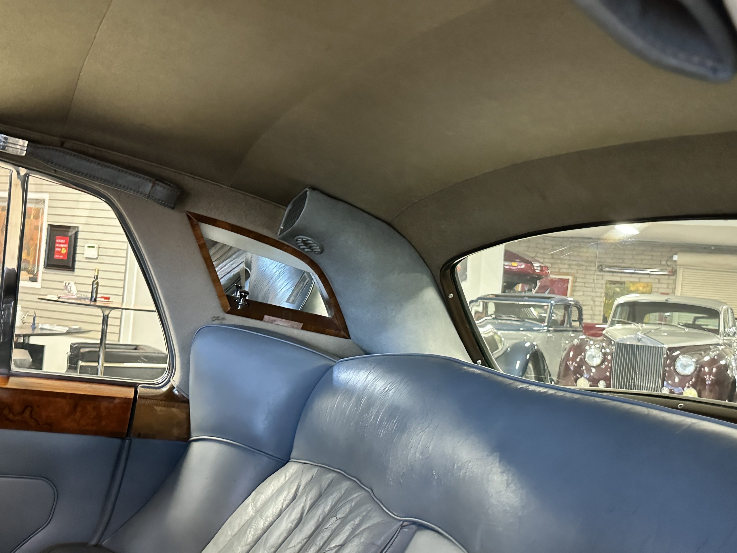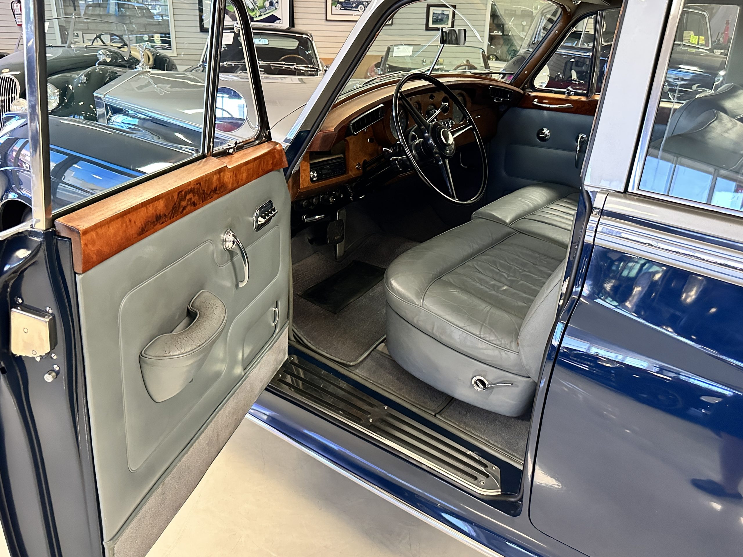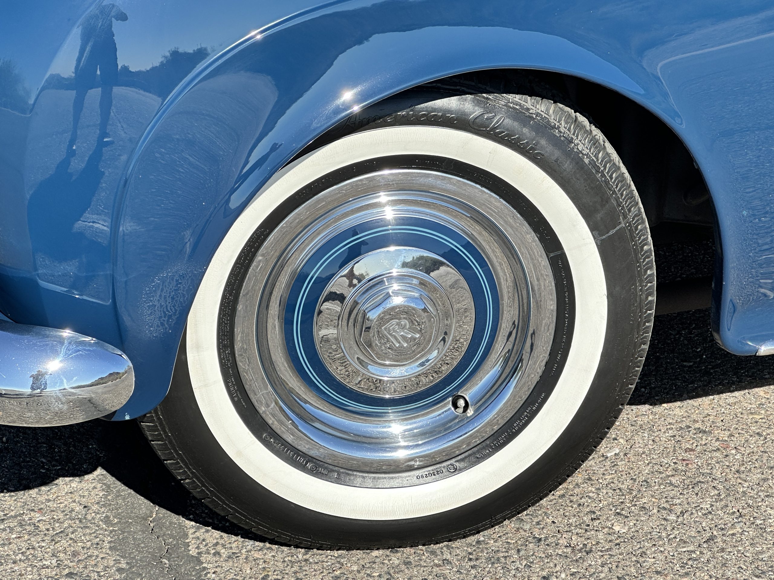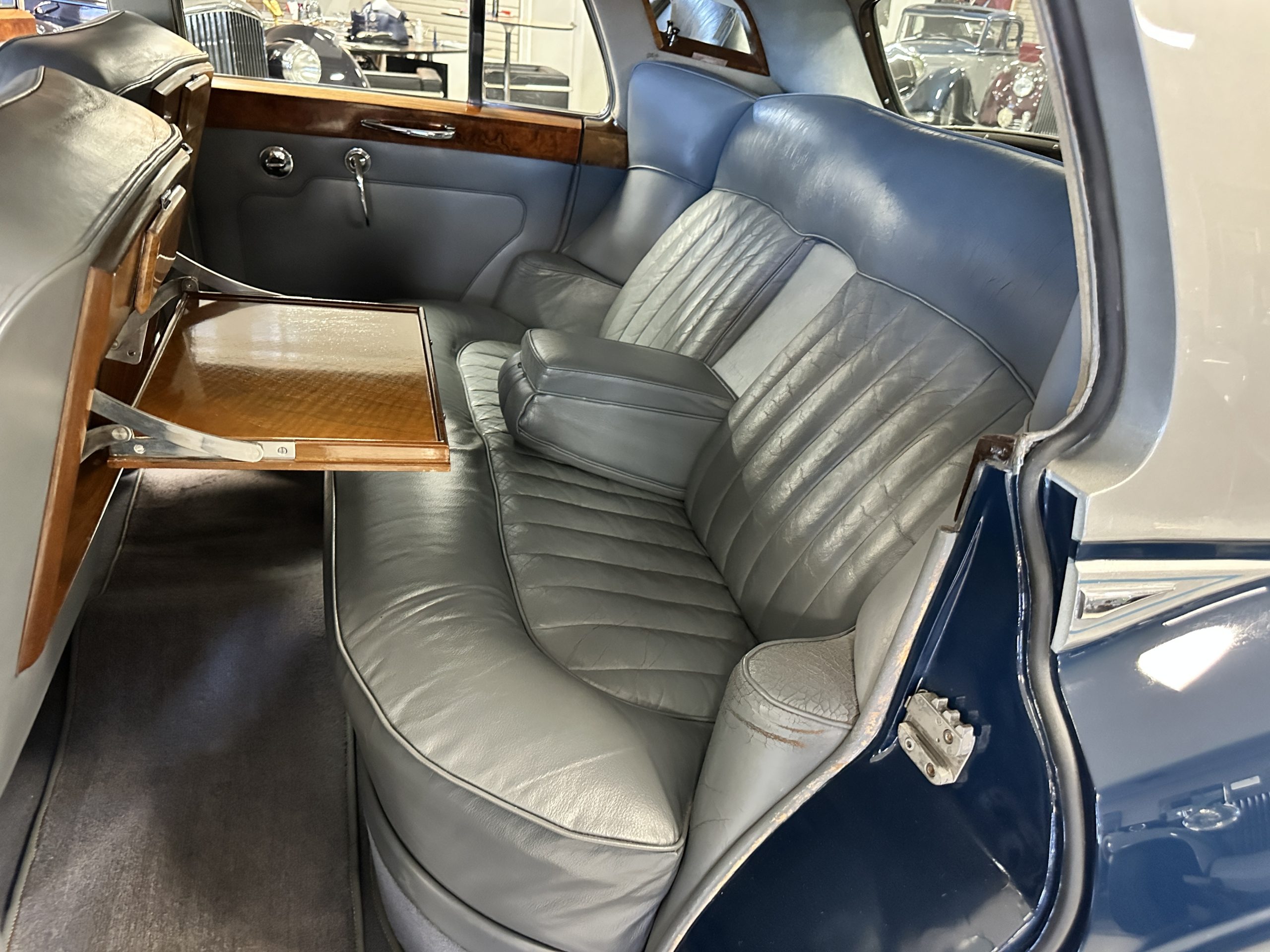The livery is stunning in its newly painted two-toned Shell Gray over Dark Blue with Light Blue pinstriping. The paint is gorgeous and was done correctly as per the factory scheme for two toned Silver Clouds. The chrome and stainless-steel trim are beautiful and there are only minimal small dings in the bumper overriders. The wide white walled Coker American Classic radials allow for a comfortable and safe ride. Overall, the exterior is in excellent condition.