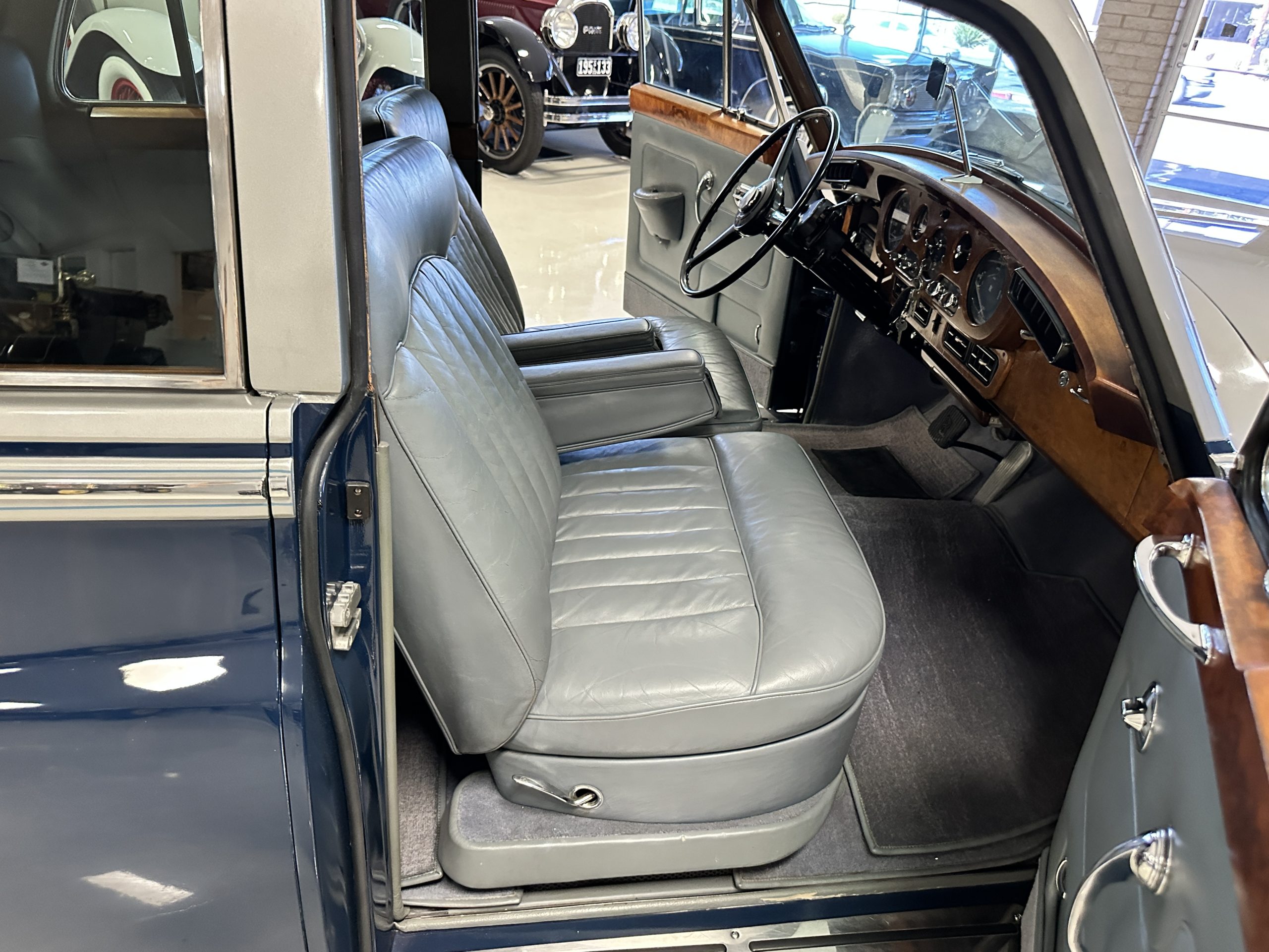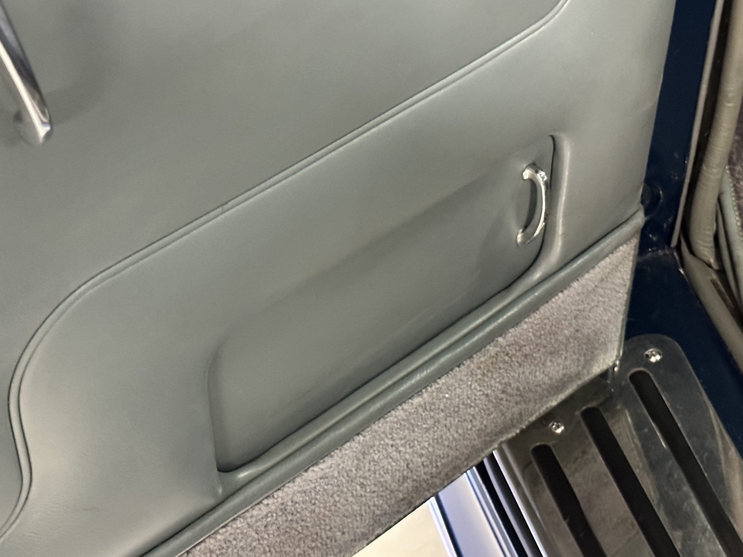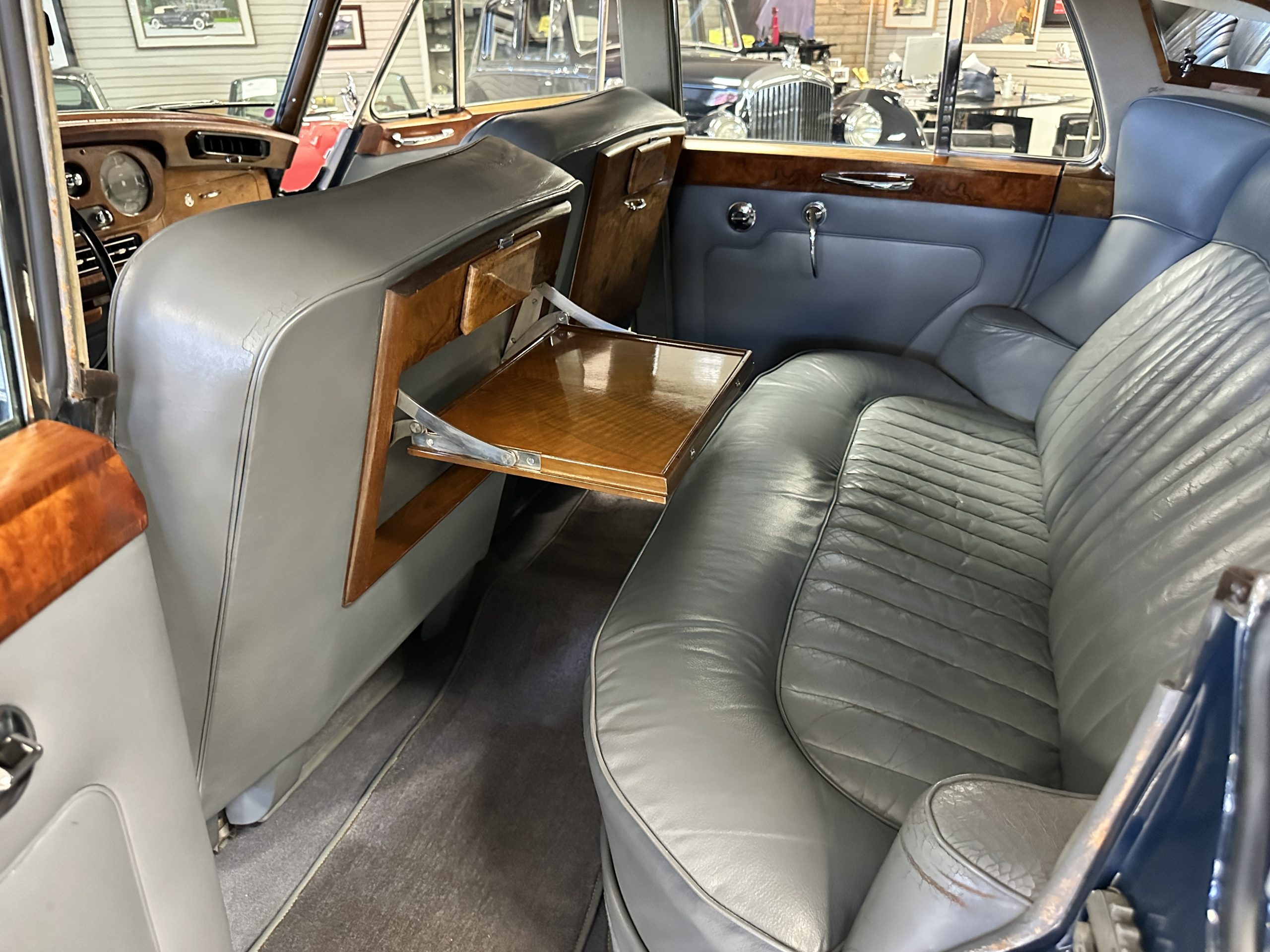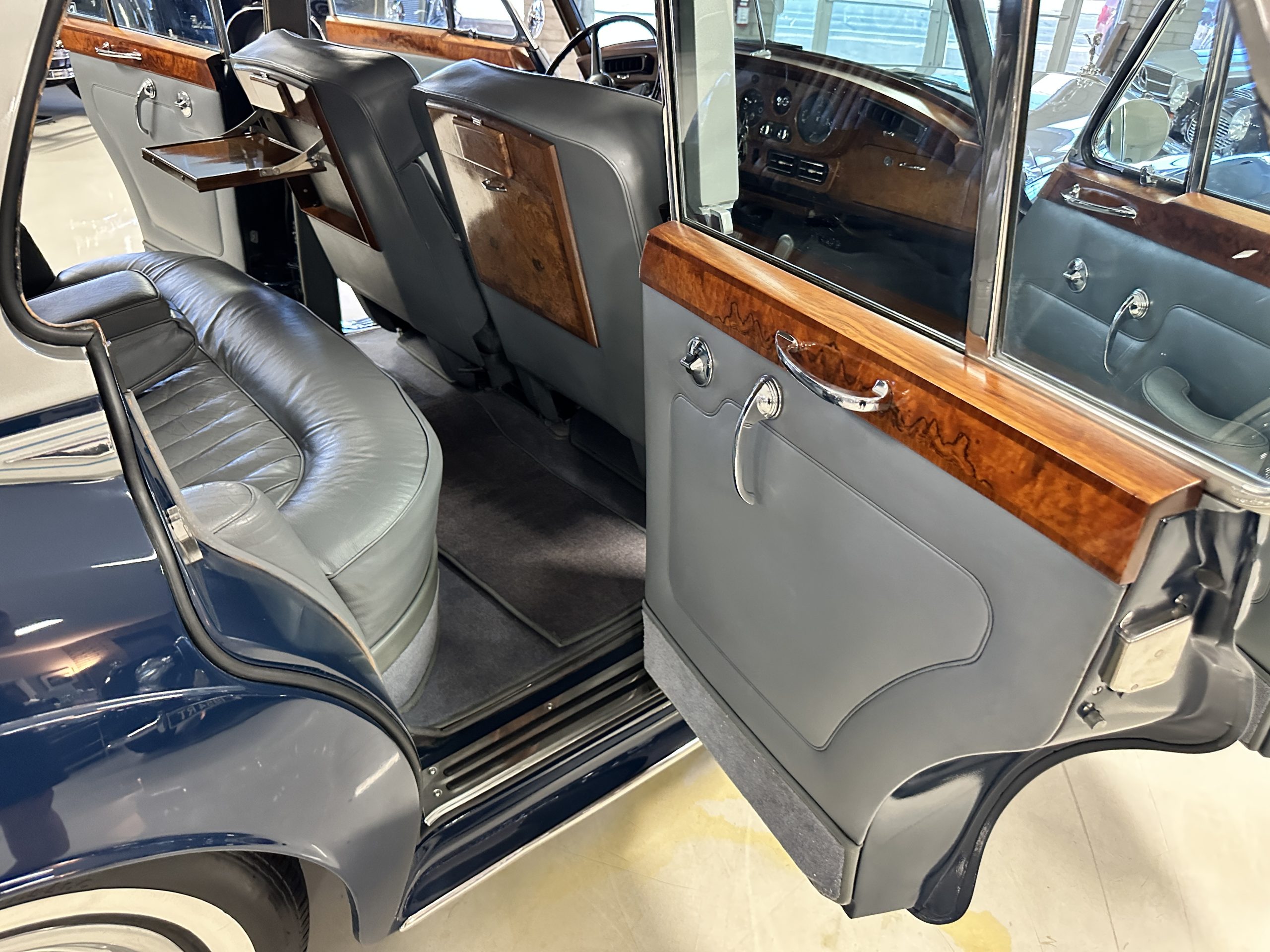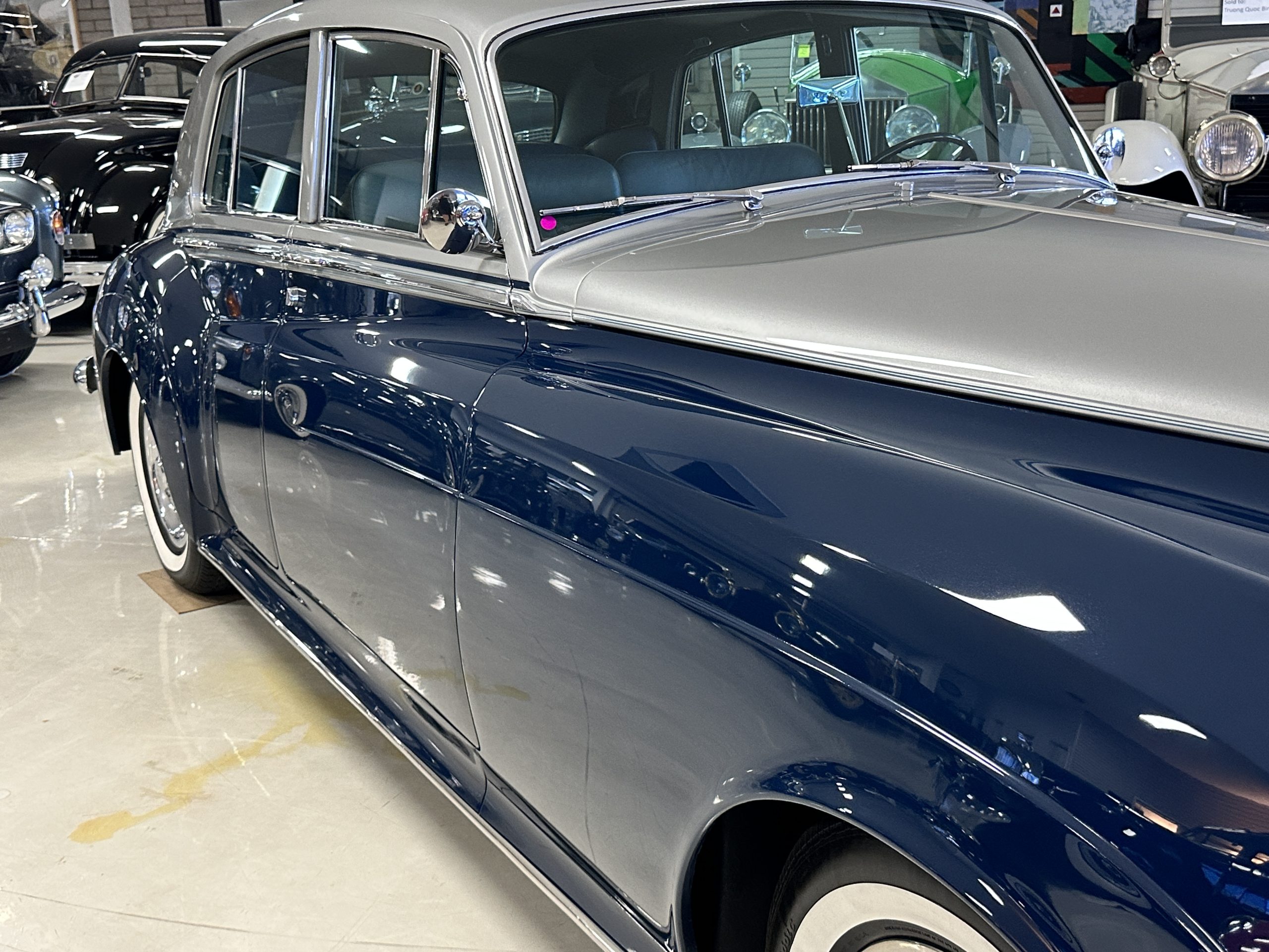 The livery is stunning in its newly painted two-toned Shell Gray over Dark Blue with Light Blue pinstriping. The paint is gorgeous and was done correctly as per the factory scheme for two toned Silver Clouds. The chrome and stainless-steel trim are beautiful and there are only minimal small dings in the bumper overriders. The wide white walled Coker American Classic radials allow for a comfortable and safe ride. Overall, the exterior is in excellent condition.
