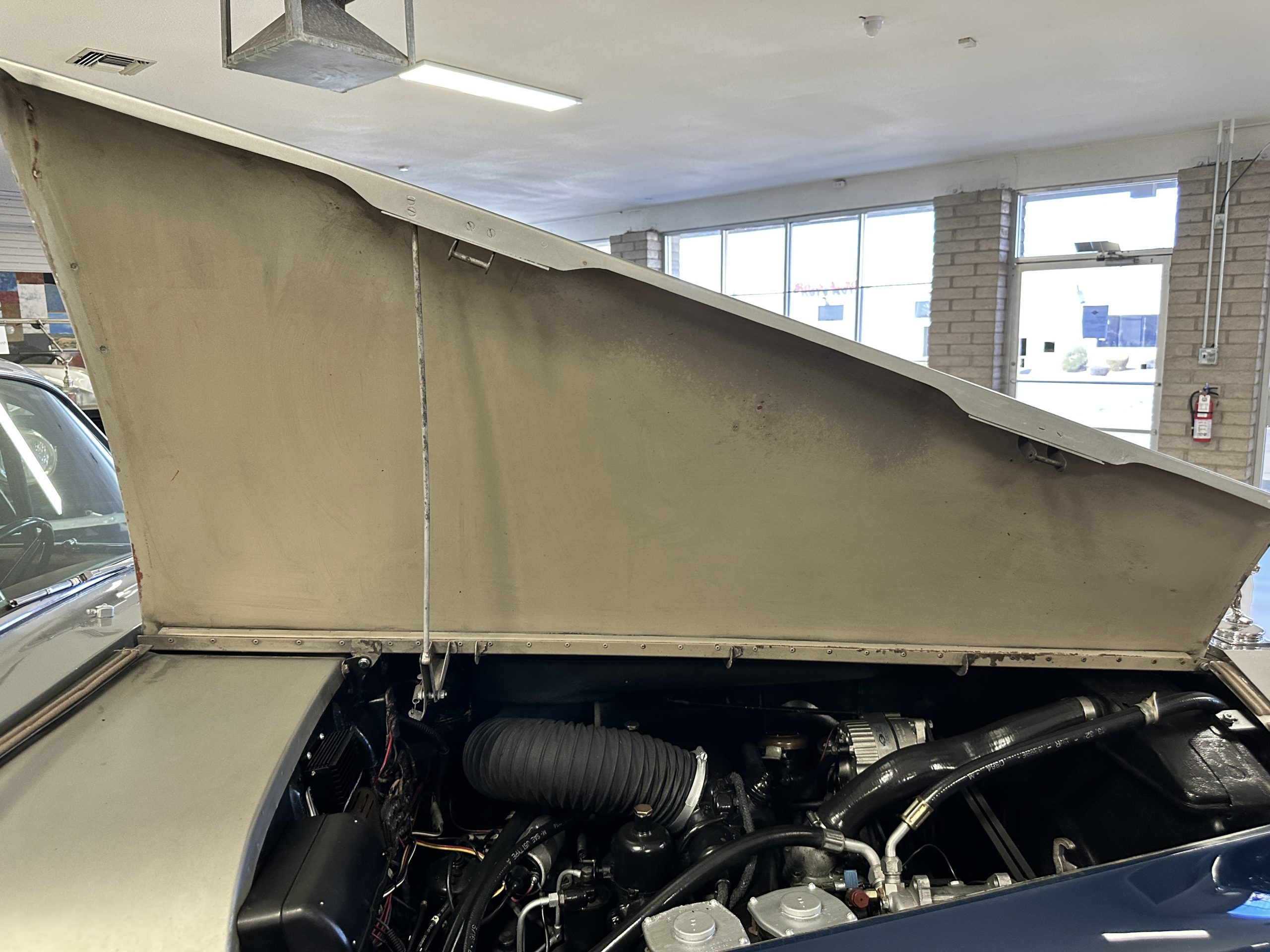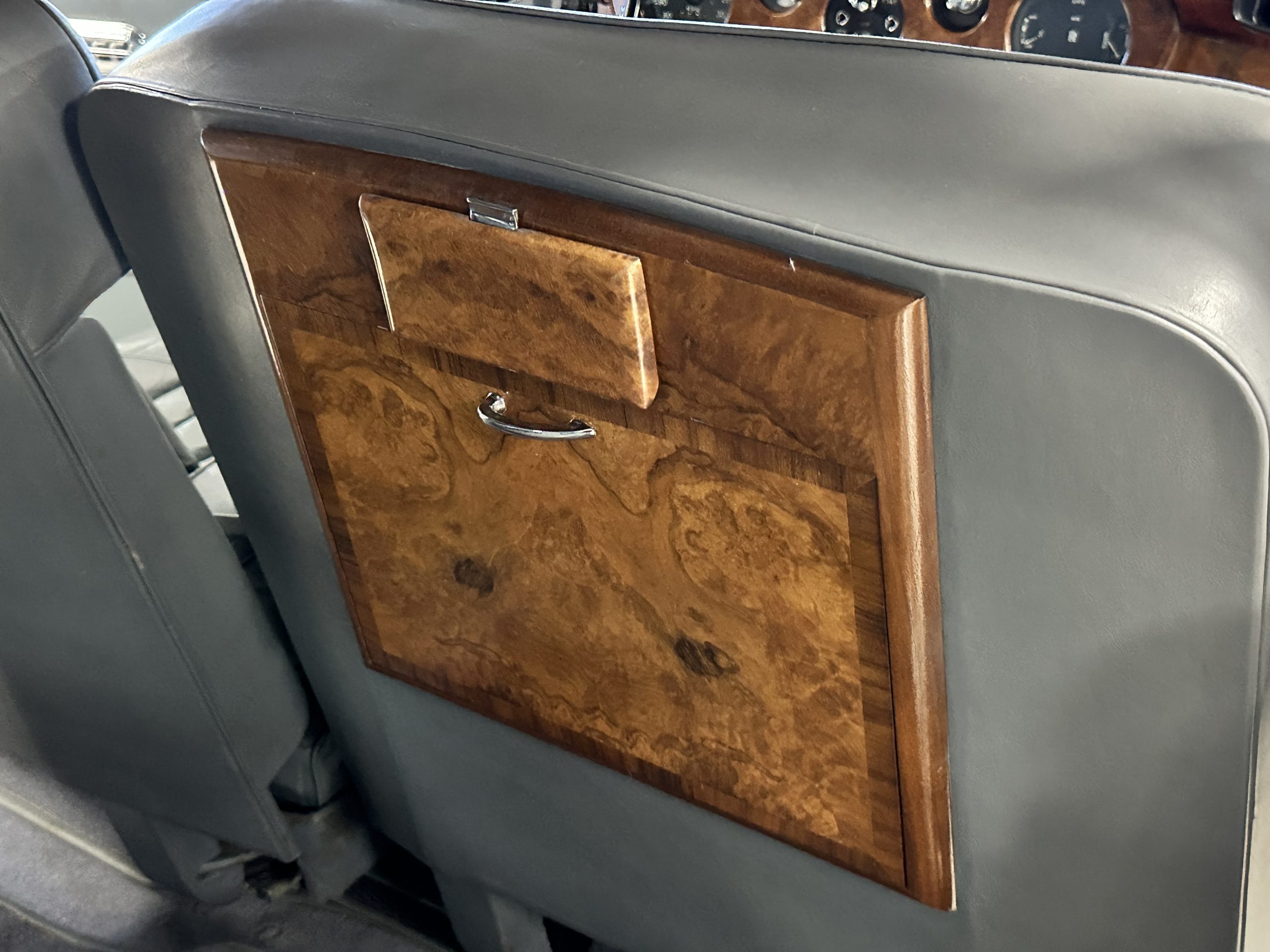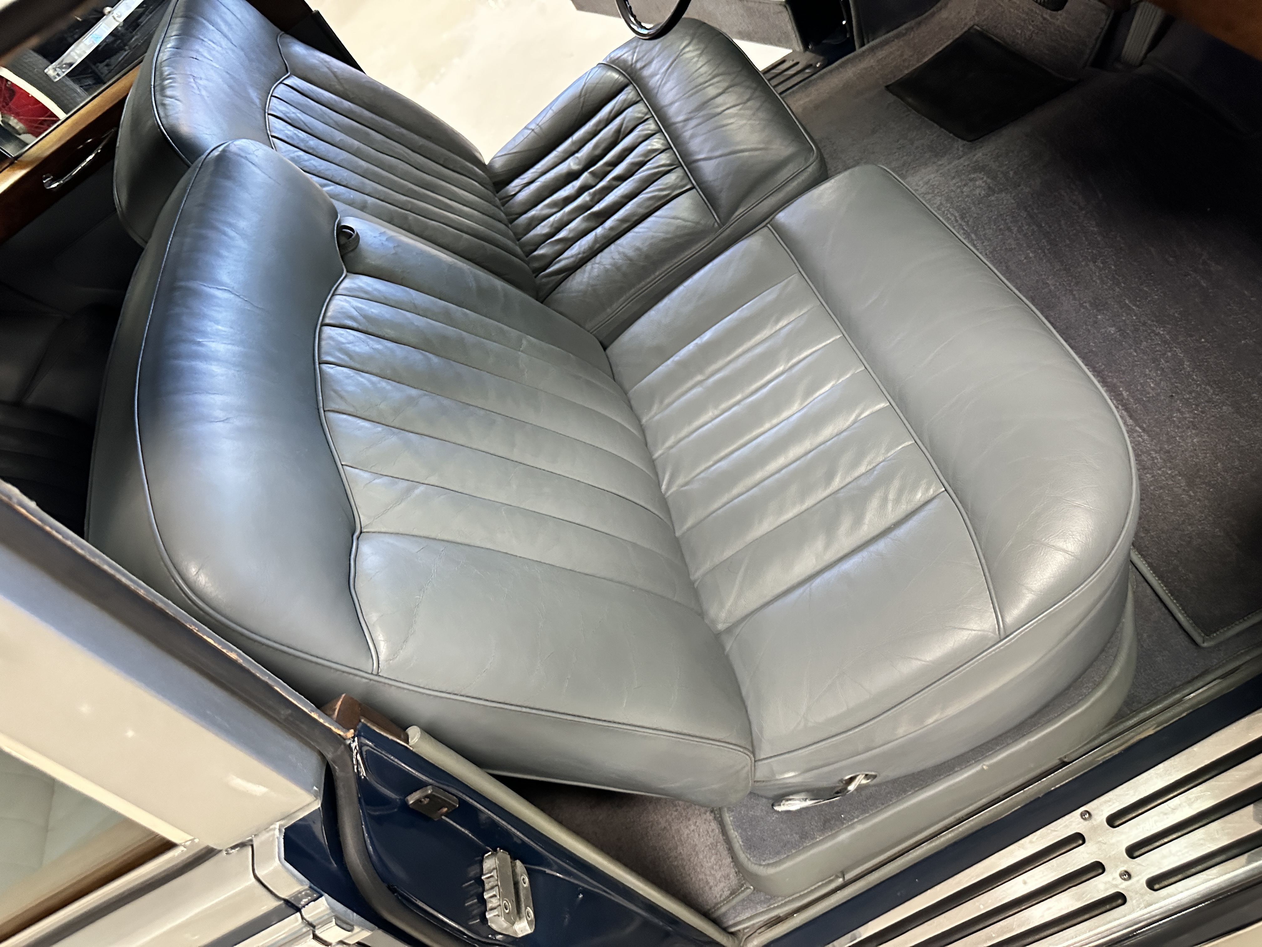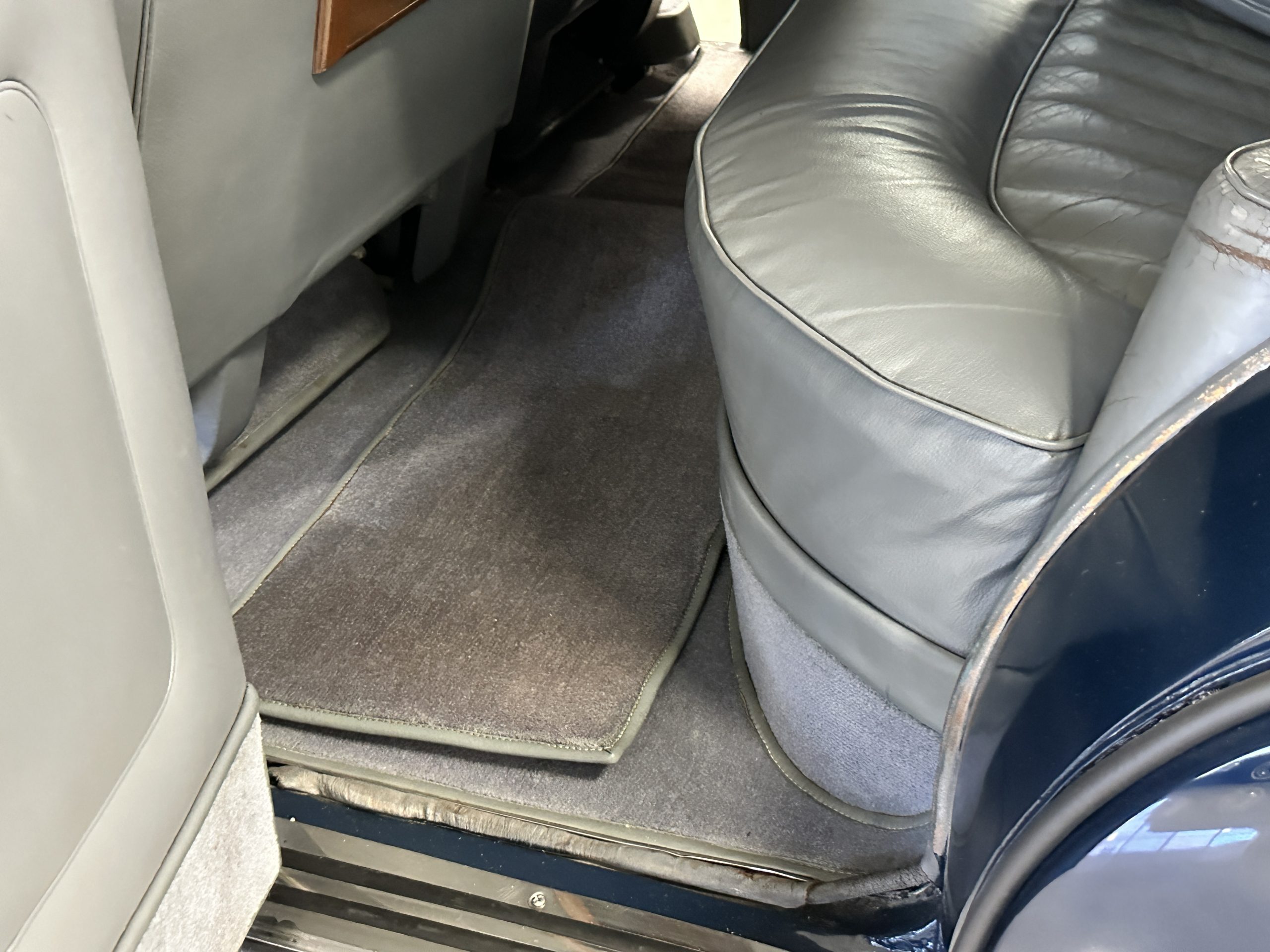 The interior appears to be remarkably original and restored only as needed. Most of the leather appears to be original in its Blue Leather (VM 3244), which appears as a Gray-Blue leather. The leather is soft and supple and without tears. There is normal creasing from use, but the leather is in overall excellent original condition. The burl walnut wood is also very nice throughout. The picnic tray in front and the two rear seat picnic tables are in very nice condition. The carpet is a matching Gray Wilton wool with overlays in matching carpeting. The interior features the dual front and rear air conditioning, electric windows, a modern stereo and all of the instruments work well. The clock is not functioning.
