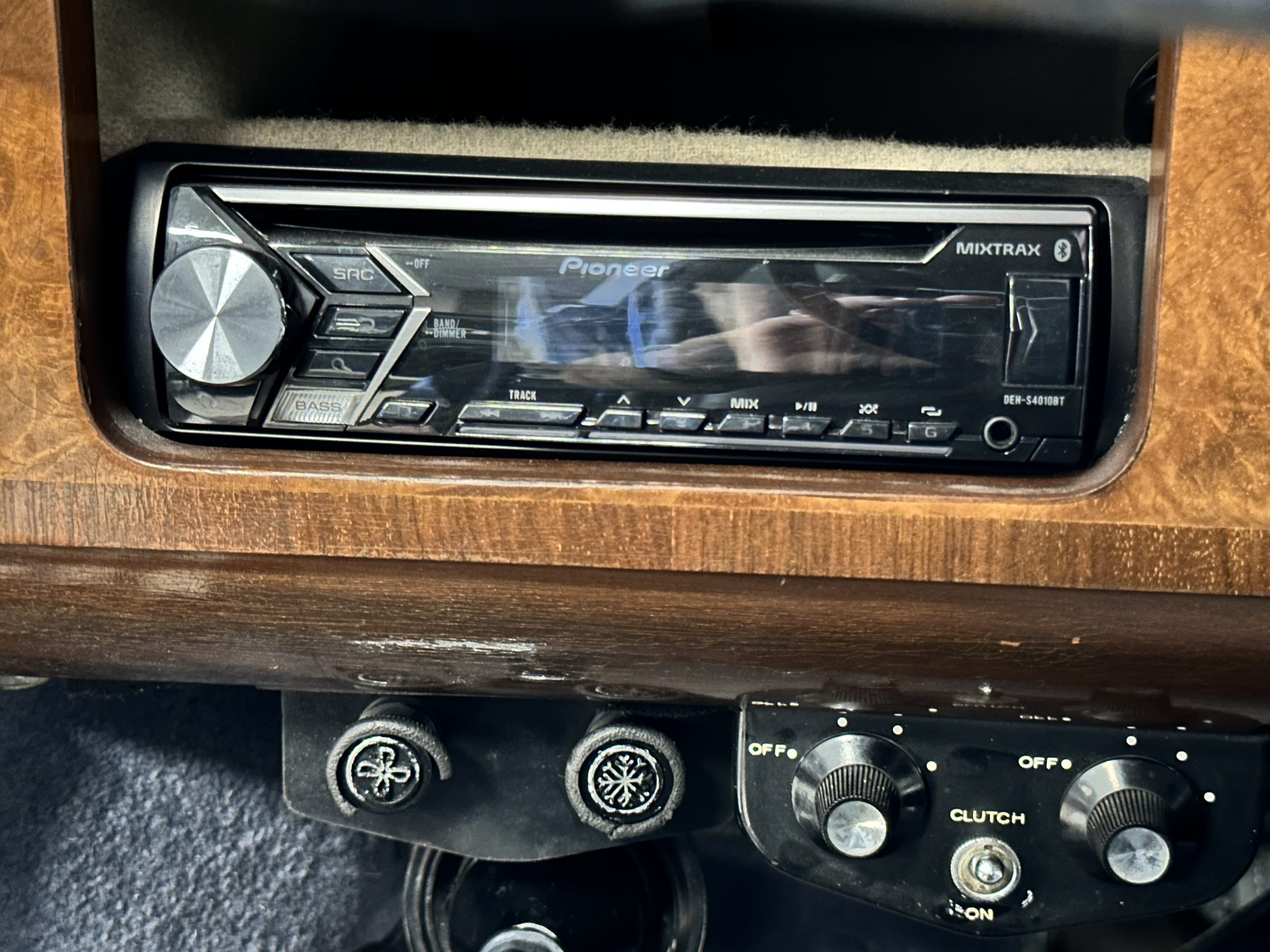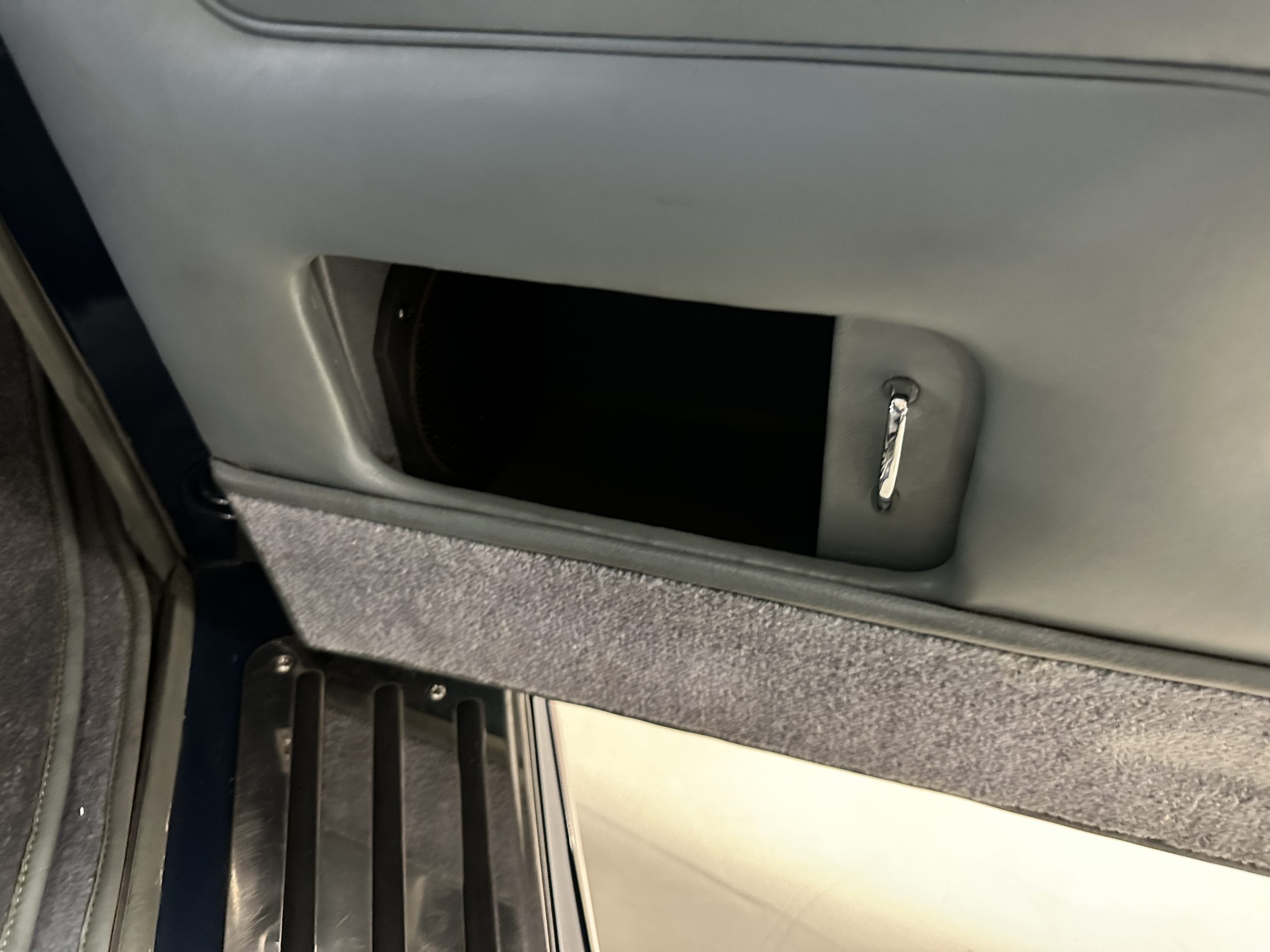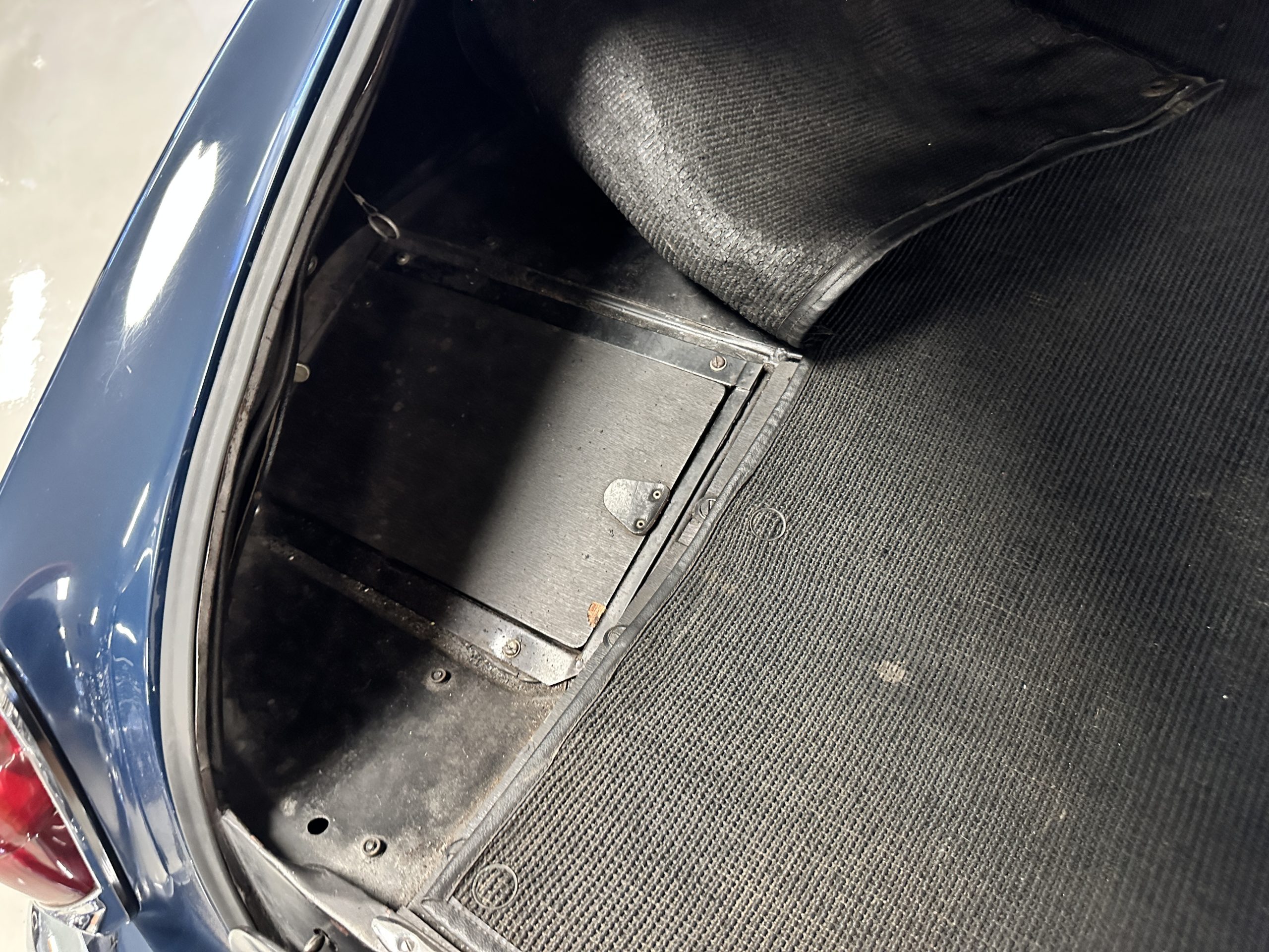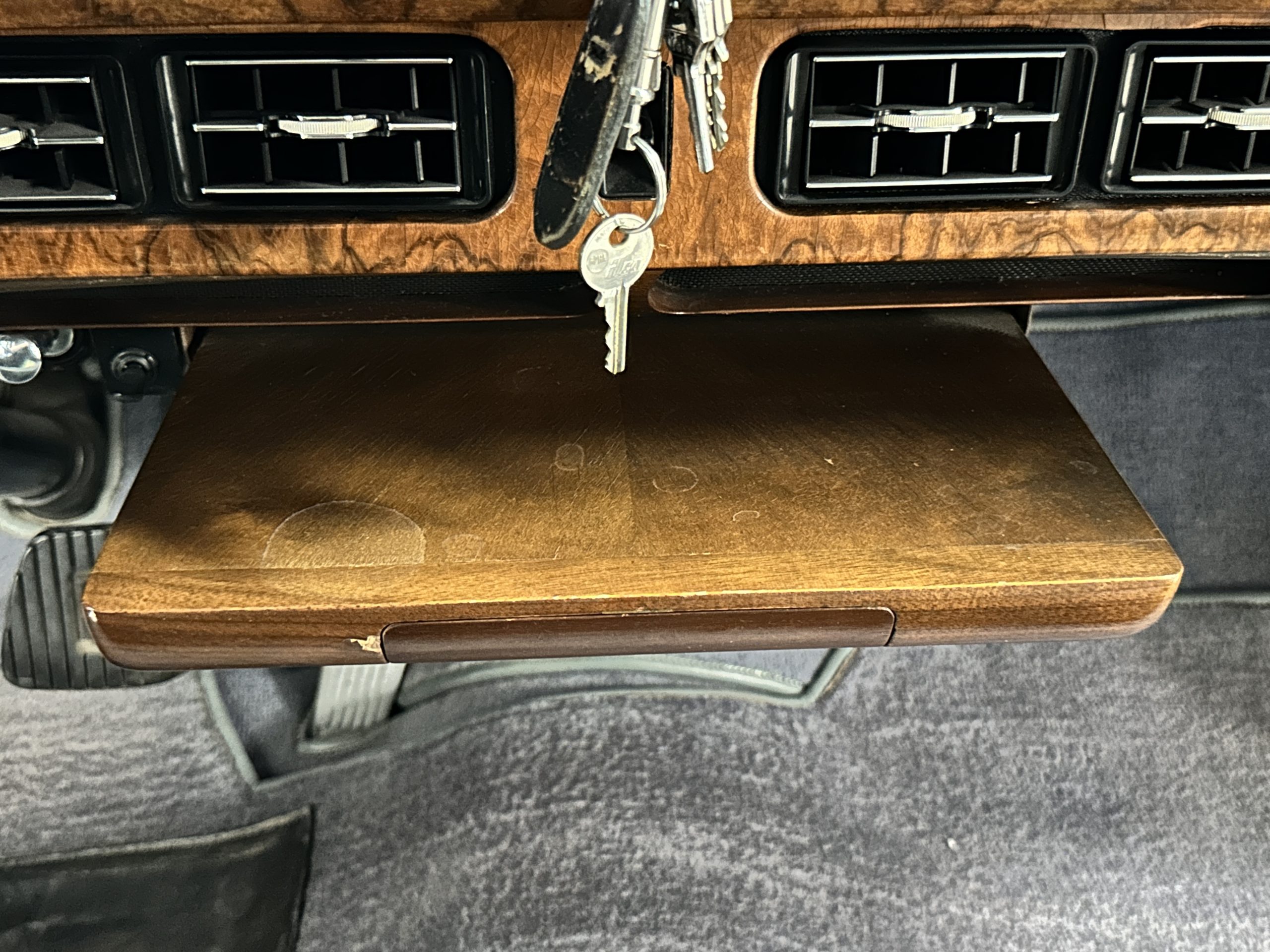 The interior appears to be remarkably original and restored only as needed. Most of the leather appears to be original in its Blue Leather (VM 3244), which appears as a Gray-Blue leather. The leather is soft and supple and without tears. There is normal creasing from use, but the leather is in overall excellent original condition. The burl walnut wood is also very nice throughout. The picnic tray in front and the two rear seat picnic tables are in very nice condition. The carpet is a matching Gray Wilton wool with overlays in matching carpeting. The interior features the dual front and rear air conditioning, electric windows, a modern stereo and all of the instruments work well. The clock is not functioning.