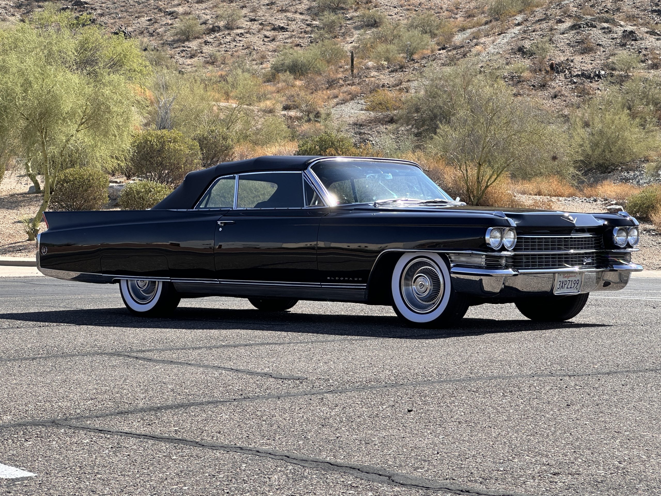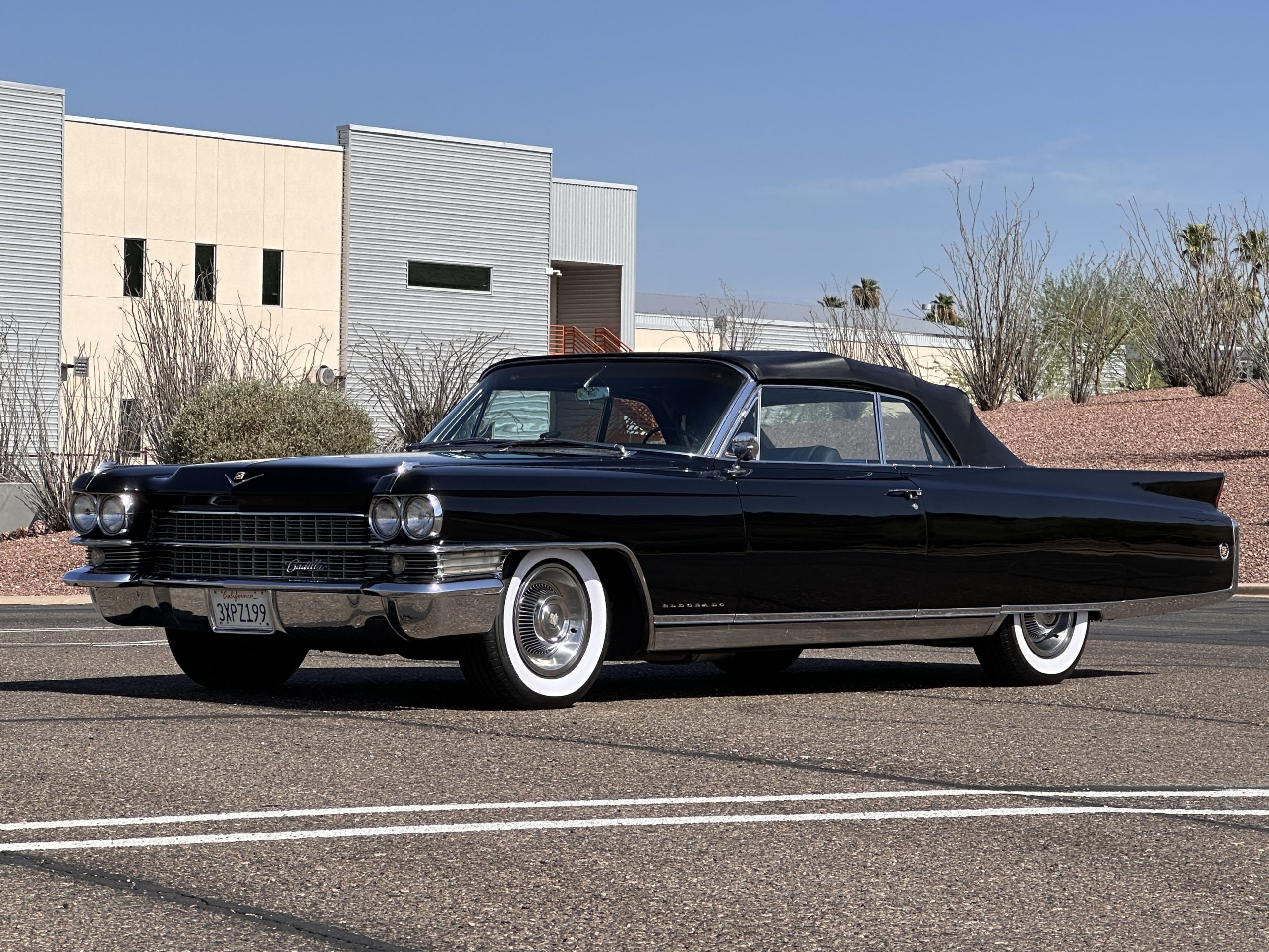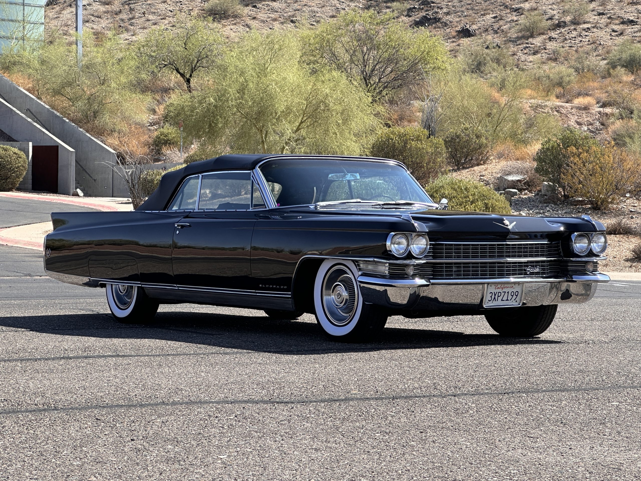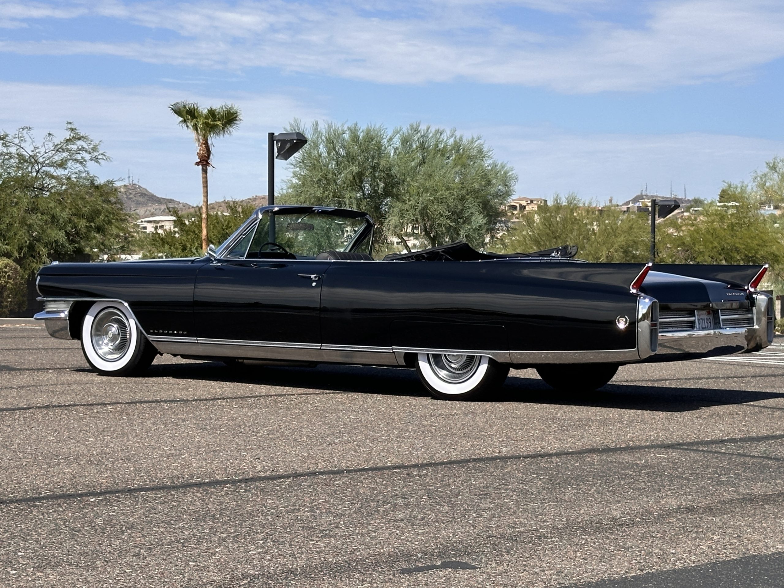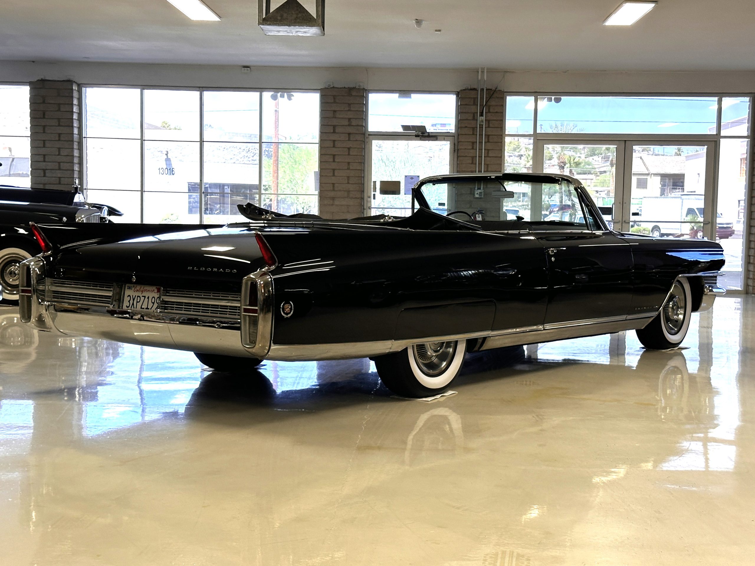 HISTORY OF THIS ELDORADO: According to the factory build records, this Eldorado Biarritz was built on March 4th, 1963, and delivered new to the Los Angeles W Seventh Street Branch (Outlet Code 811910). Still retaining its original engine number 089852 (build records matches present engine). Build records and the Trim Tag show original Ebony Black paint, black convertible top and black leather interior.