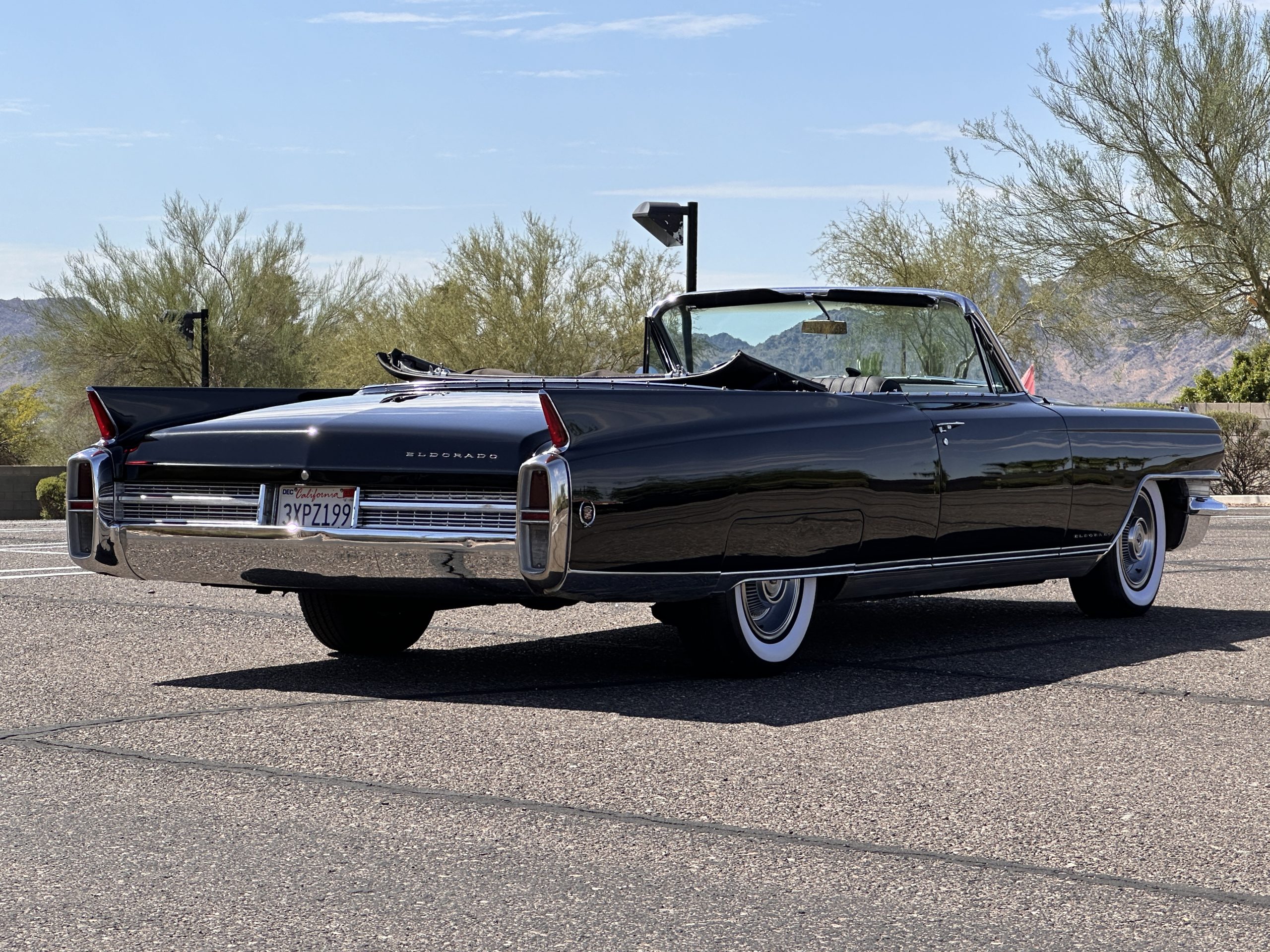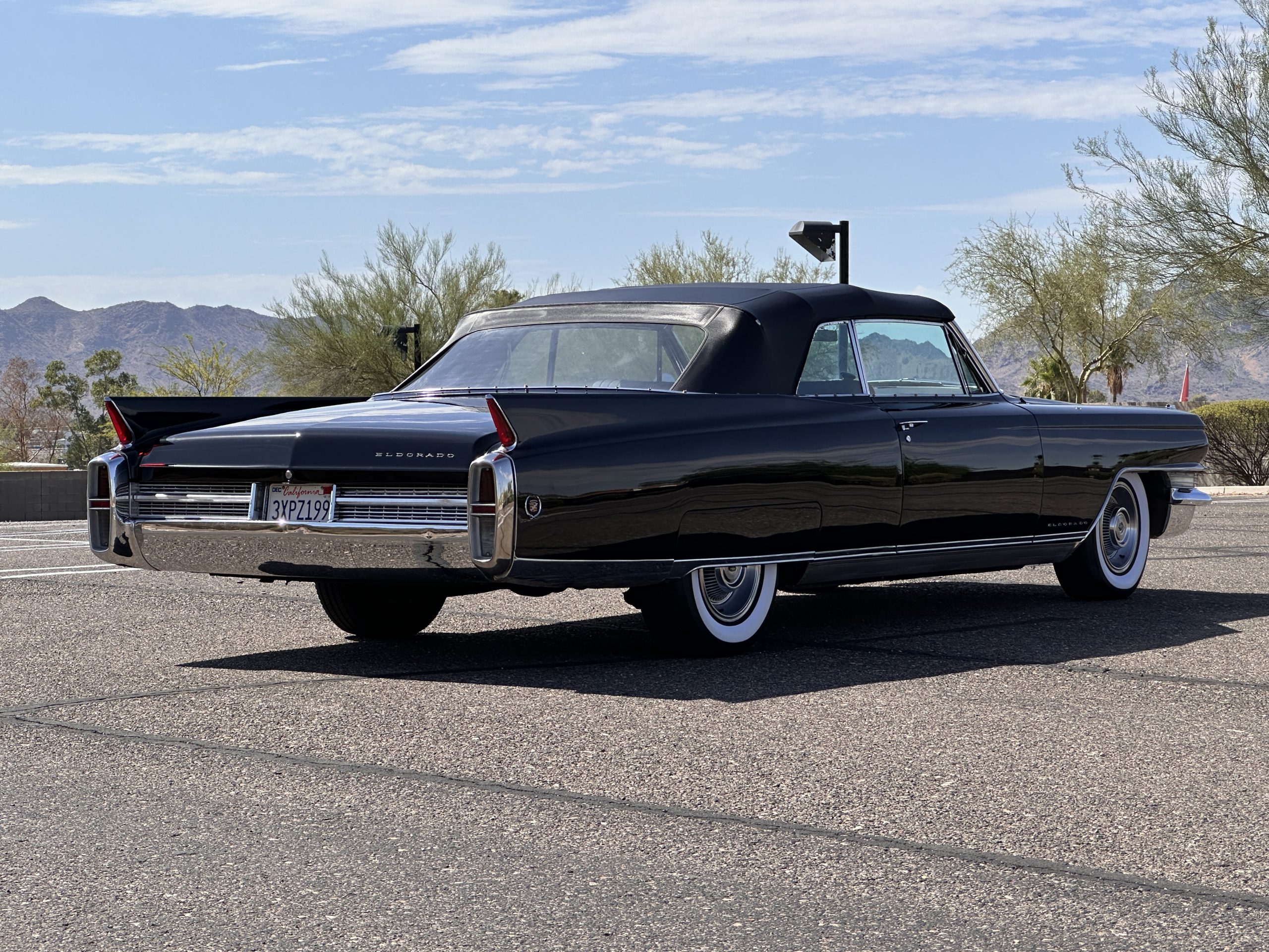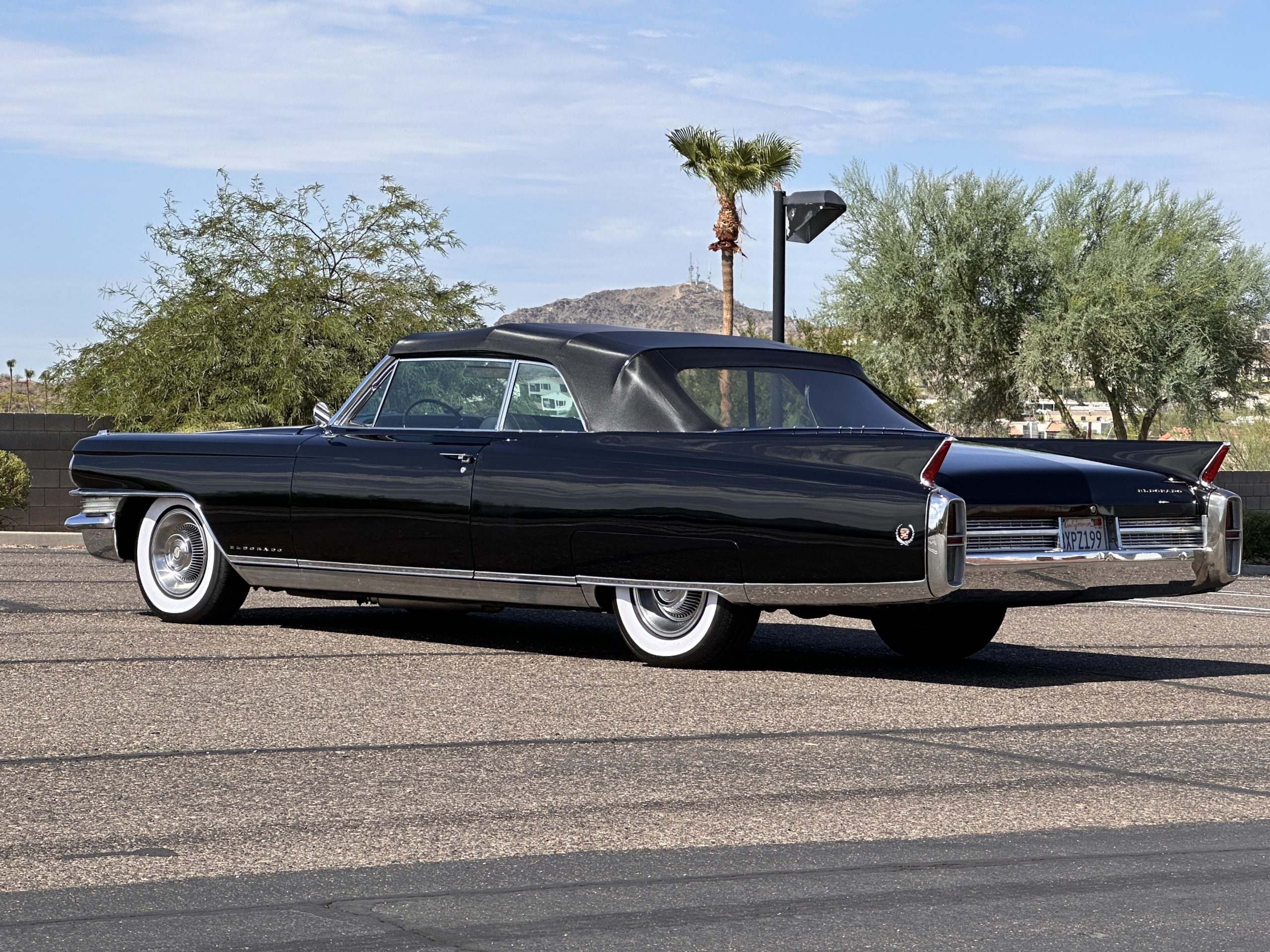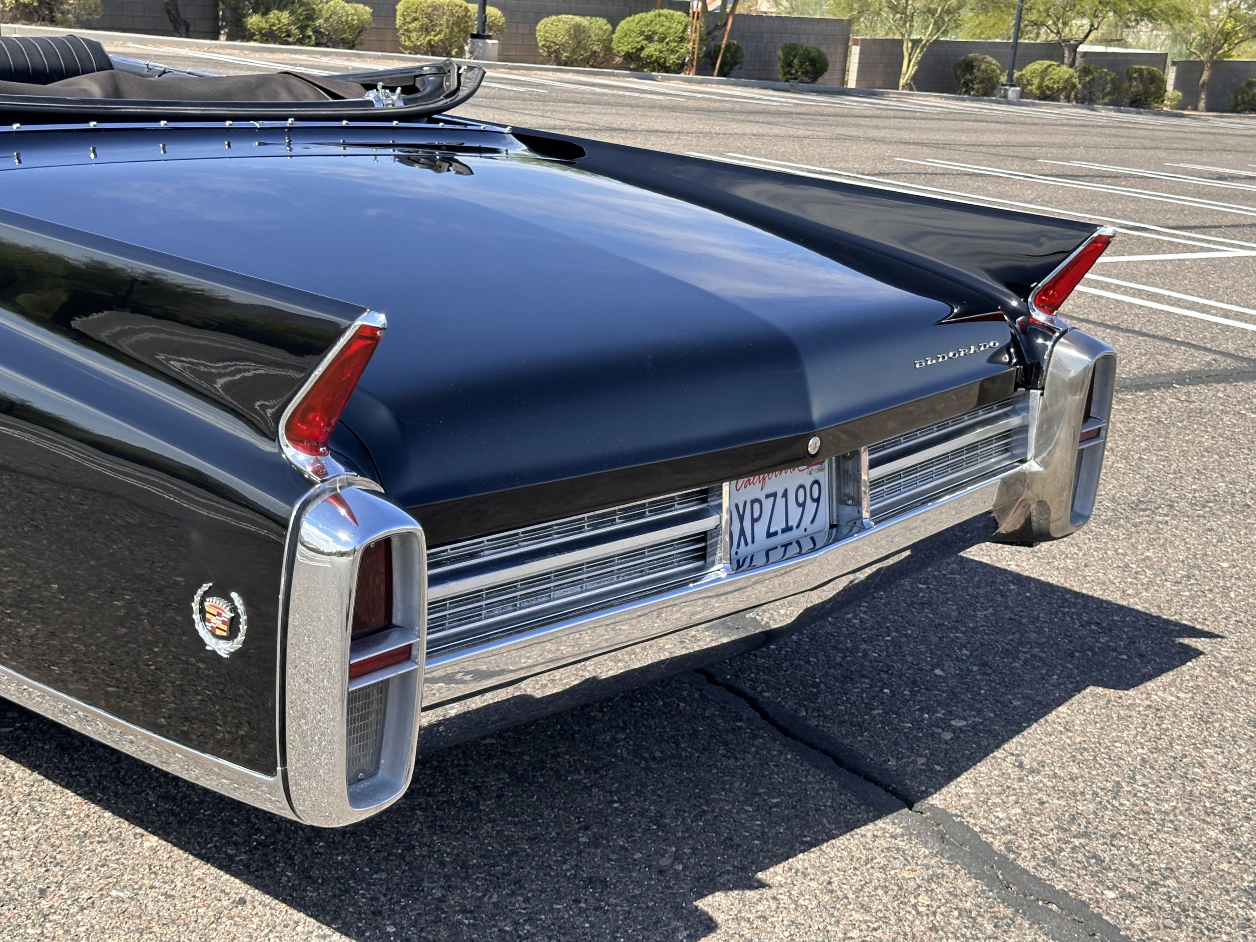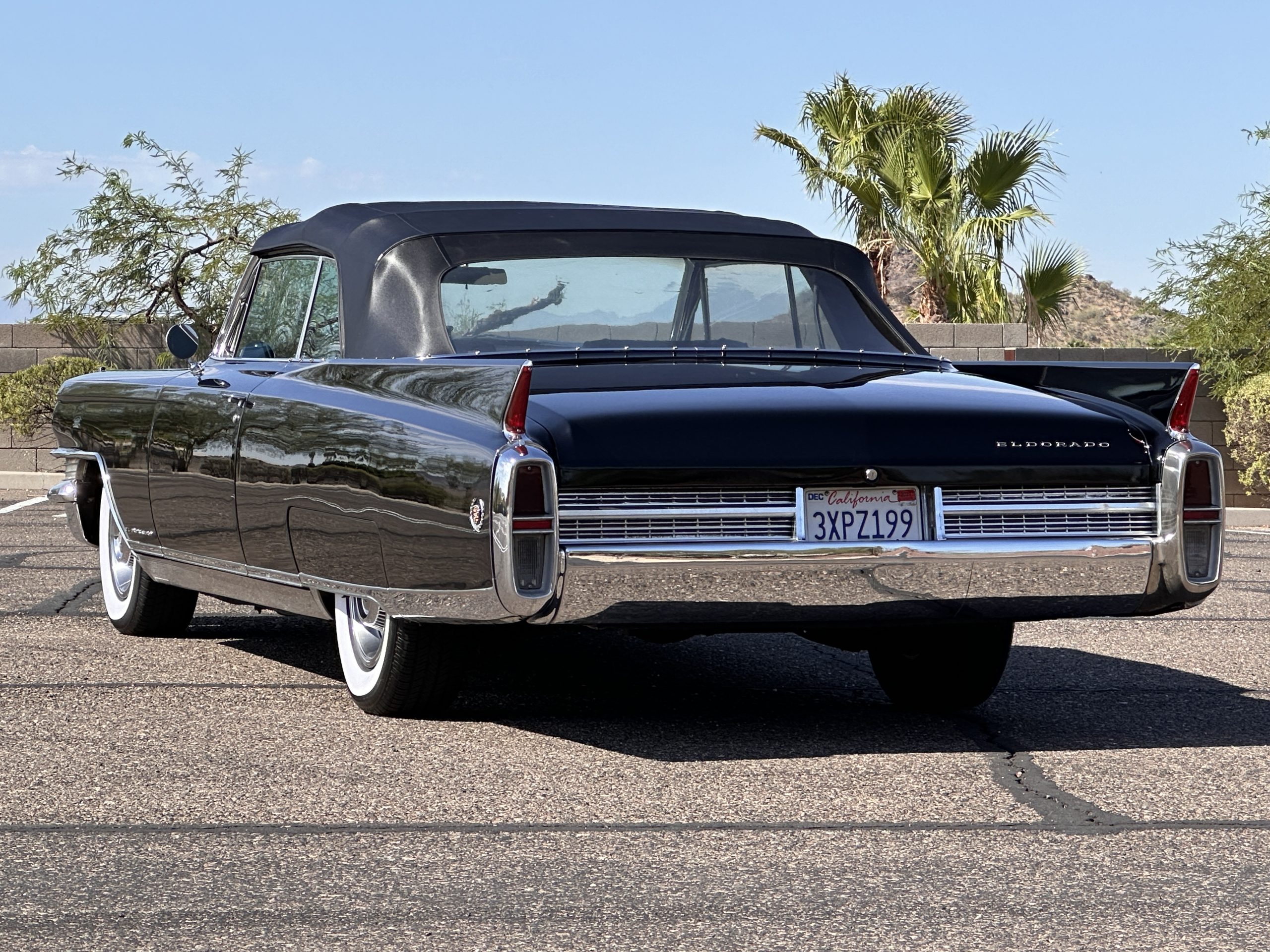 The Ebony Black livery has been beautifully wet sanded and polished. The shine and luster are fabulous. Much of the chrome has been replated over the years and is overall in good condition. The rear bumper has a couple of dings and the rear taillight surrounds have some pitting, but the overall presentation of the Eldorado is beautiful. The Black vinyl power convertible top looks as new and works perfectly (the black vinyl top boot cover is original and has shrunk, no longer fitting properly). The wide white walled radials are new and look great.