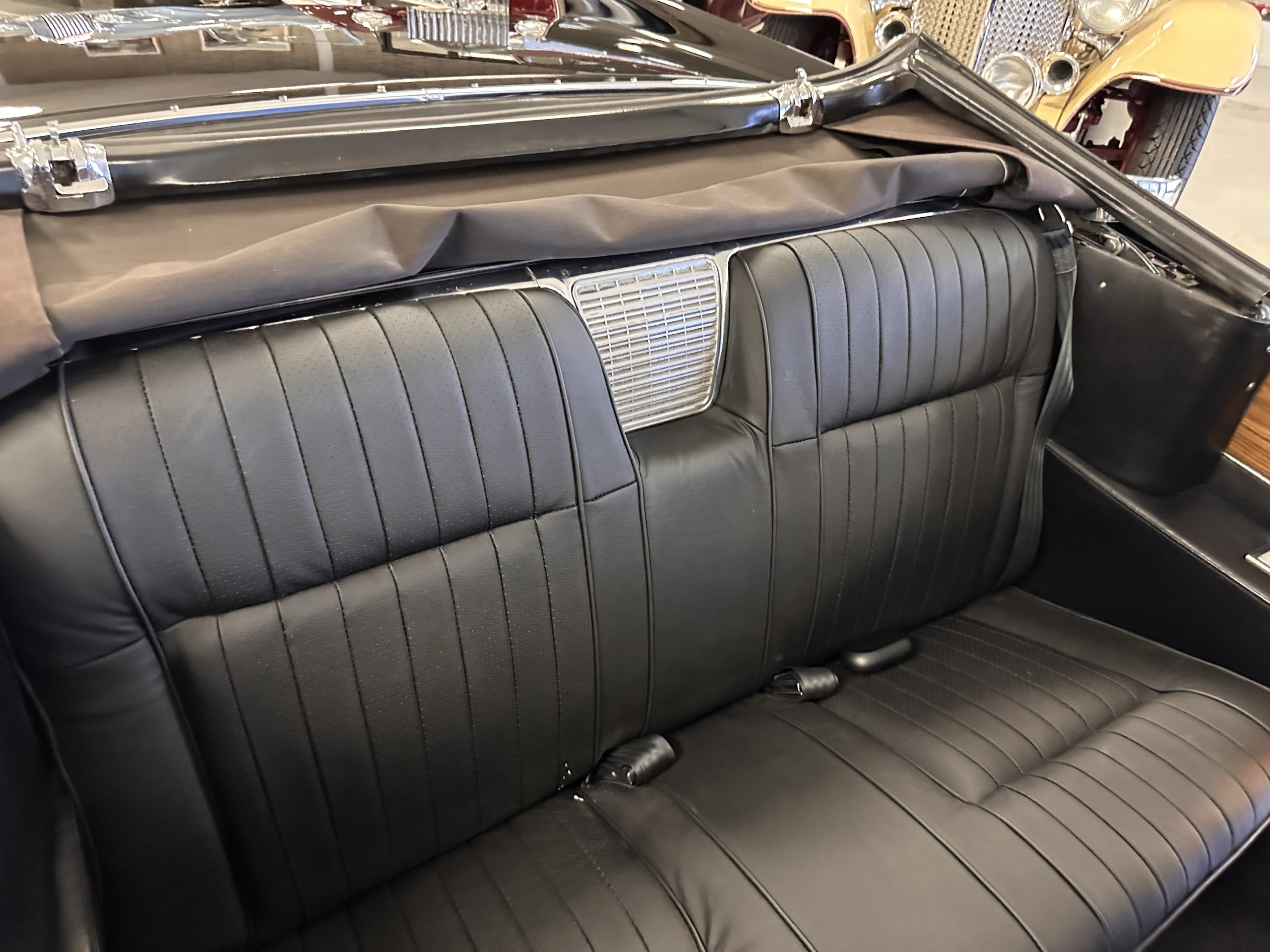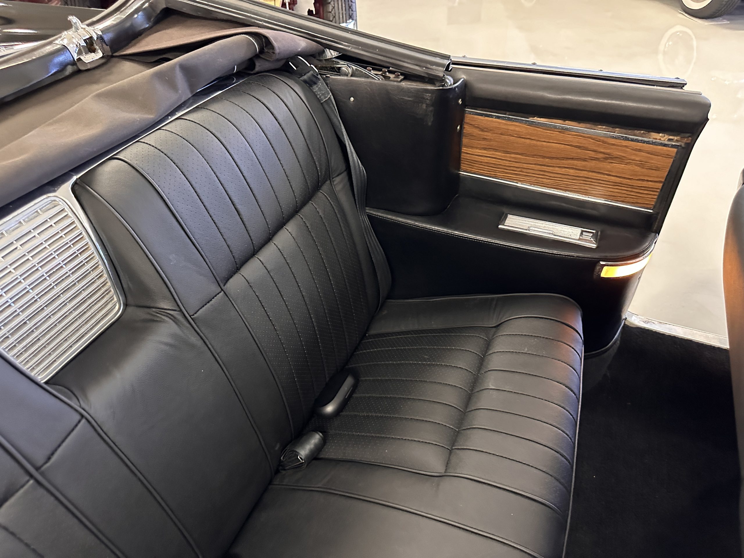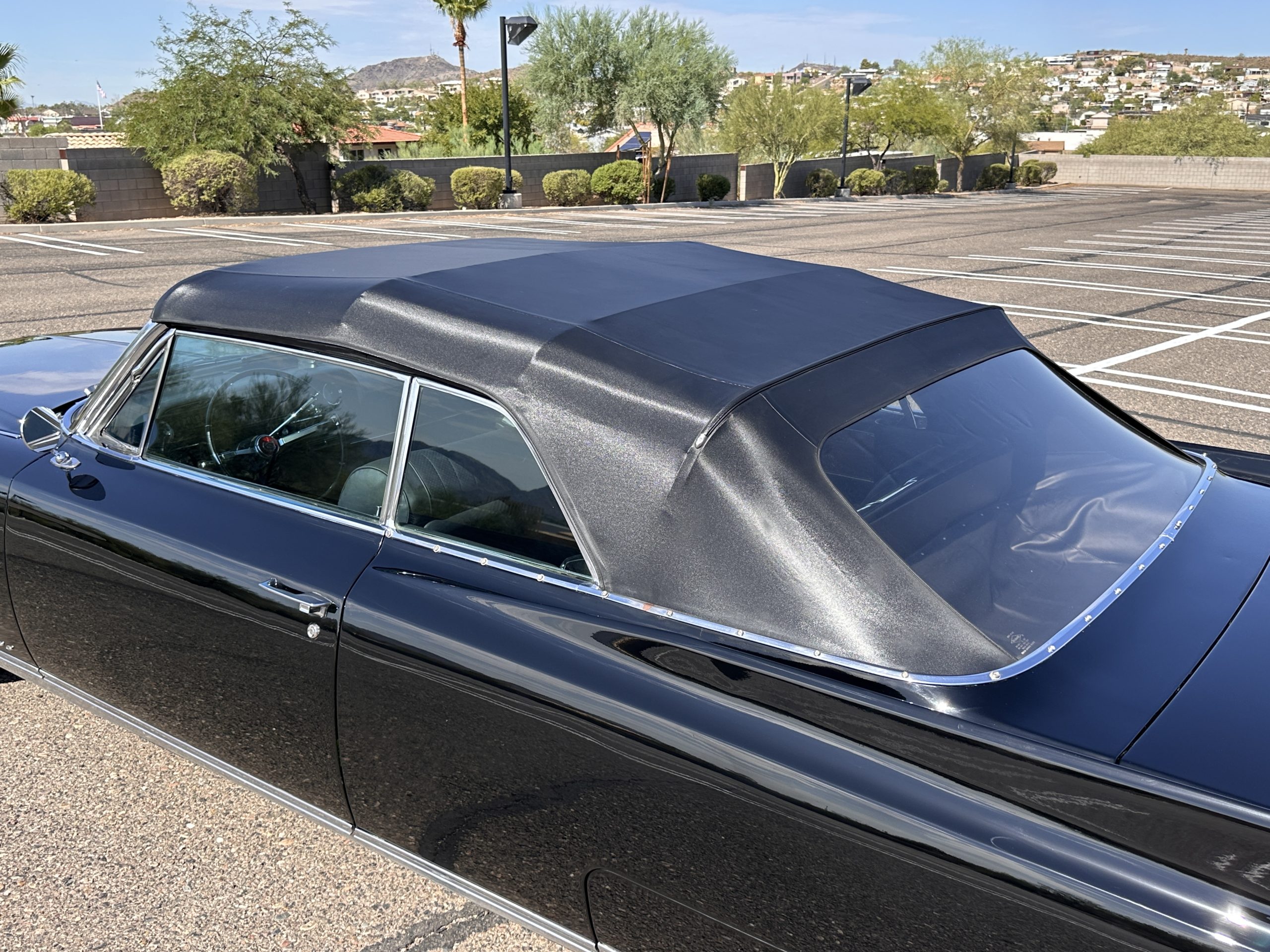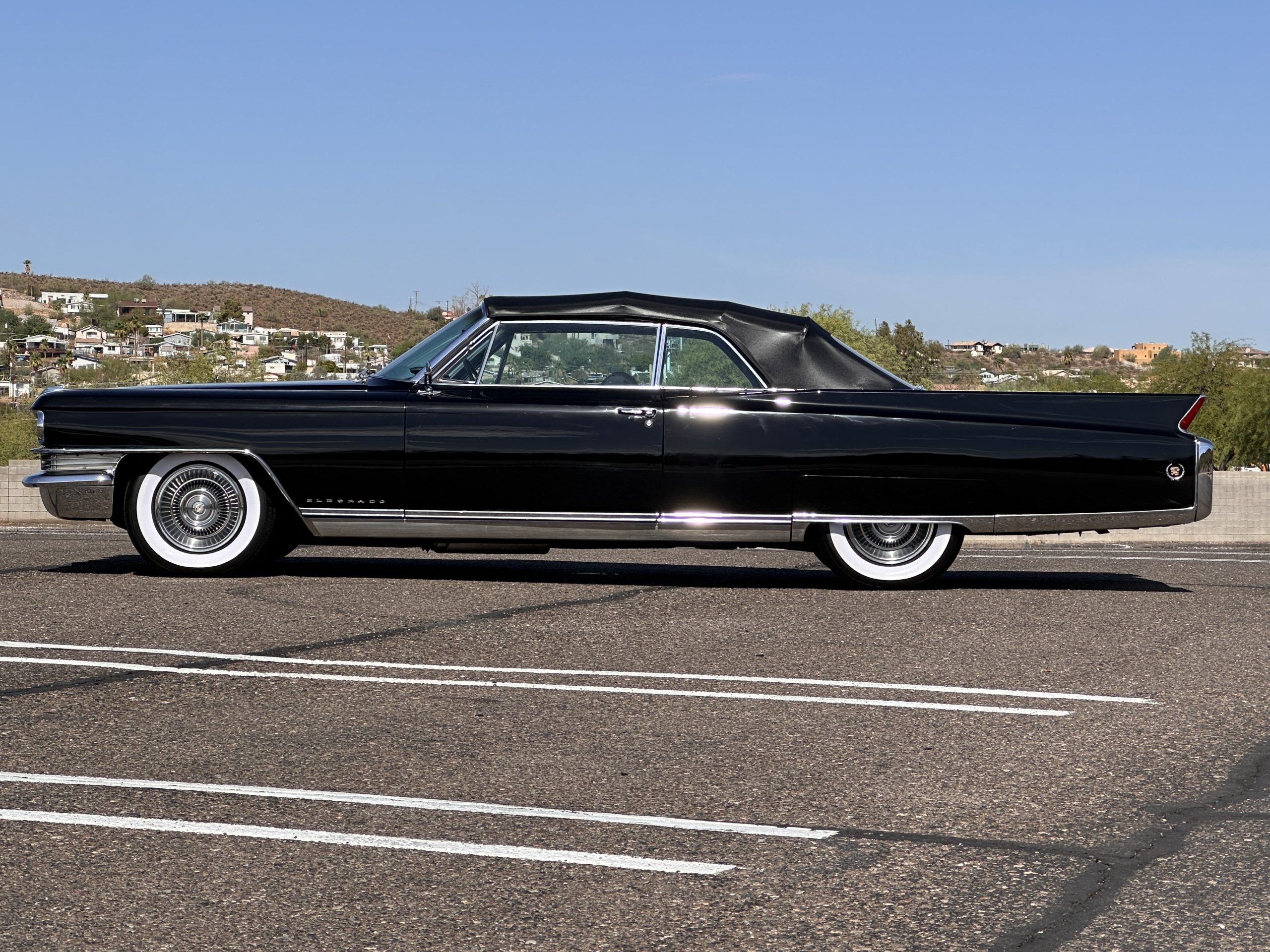 The Ebony Black livery has been beautifully wet sanded and polished. The shine and luster are fabulous. Much of the chrome has been replated over the years and is overall in good condition. The rear bumper has a couple of dings and the rear taillight surrounds have some pitting, but the overall presentation of the Eldorado is beautiful. The Black vinyl power convertible top looks as new and works perfectly (the black vinyl top boot cover is original and has shrunk, no longer fitting properly). The wide white walled radials are new and look great.