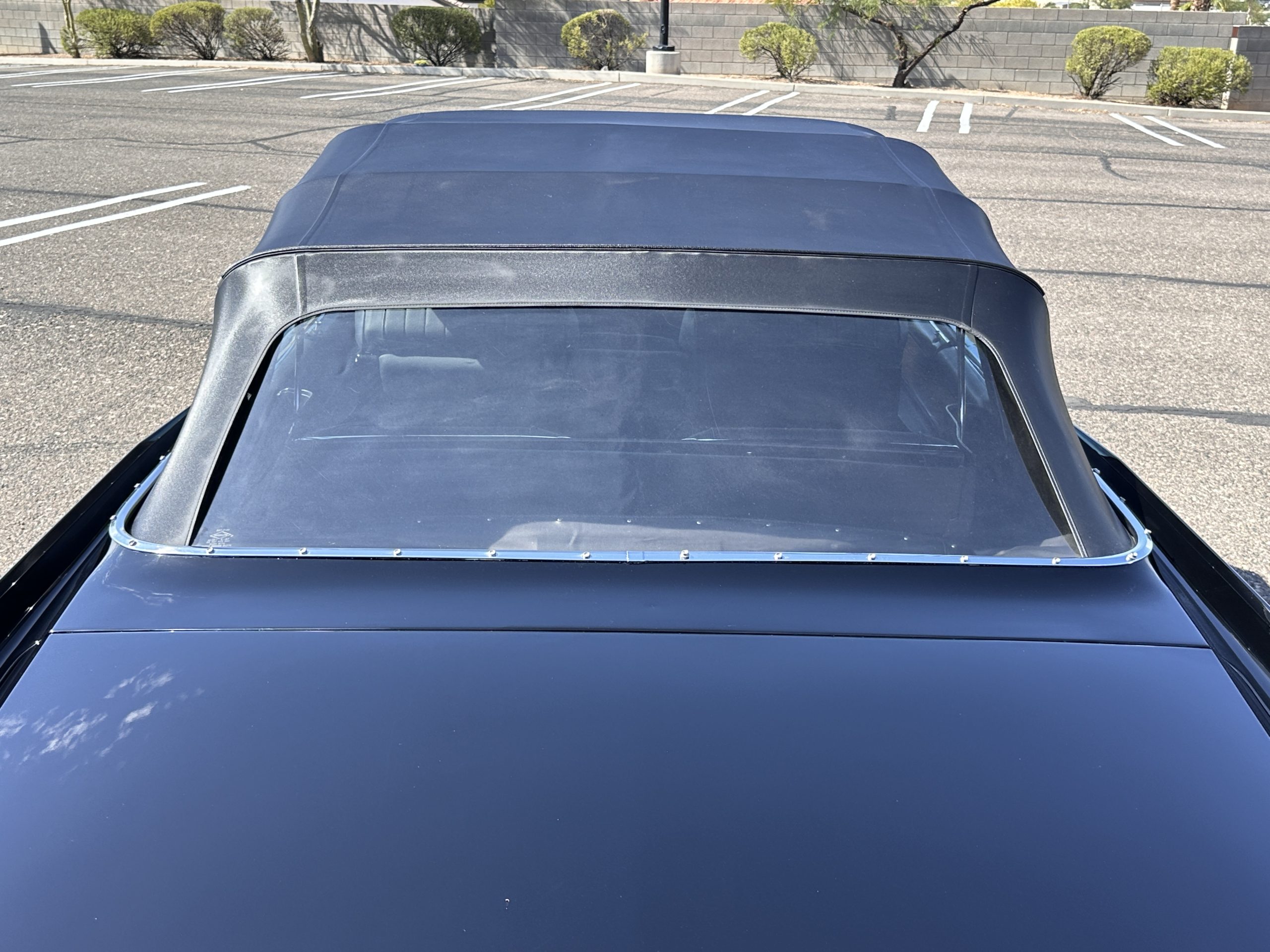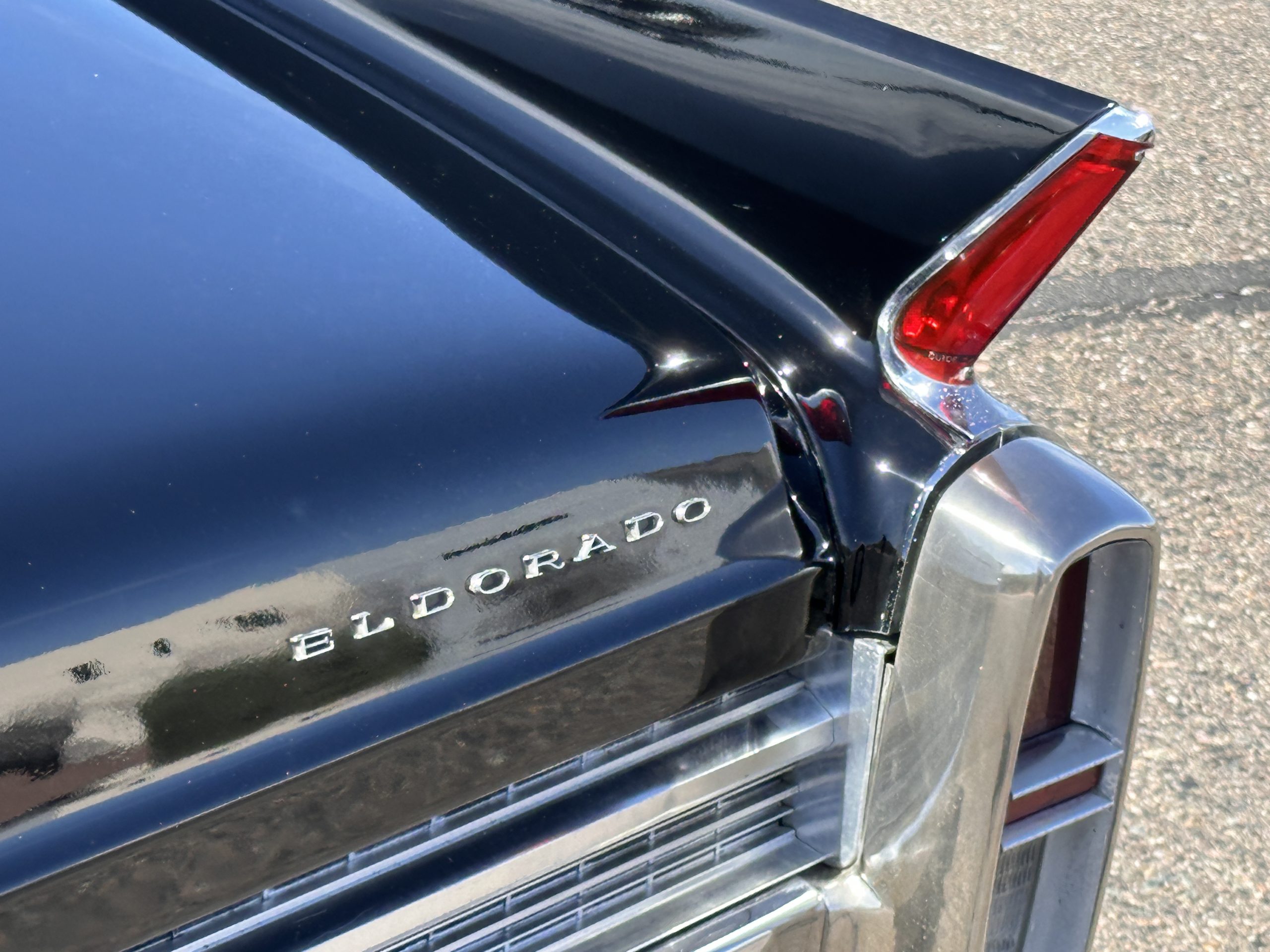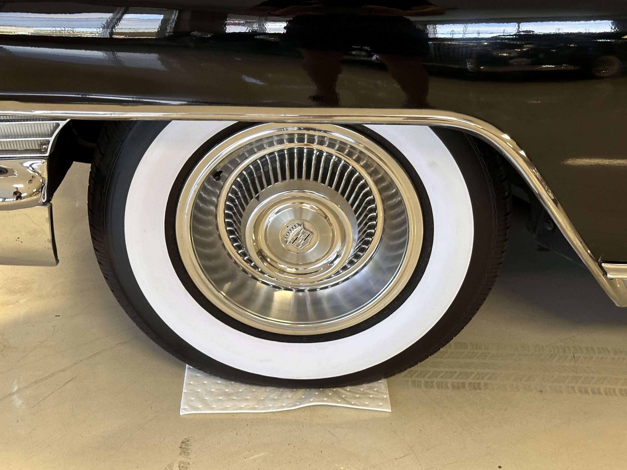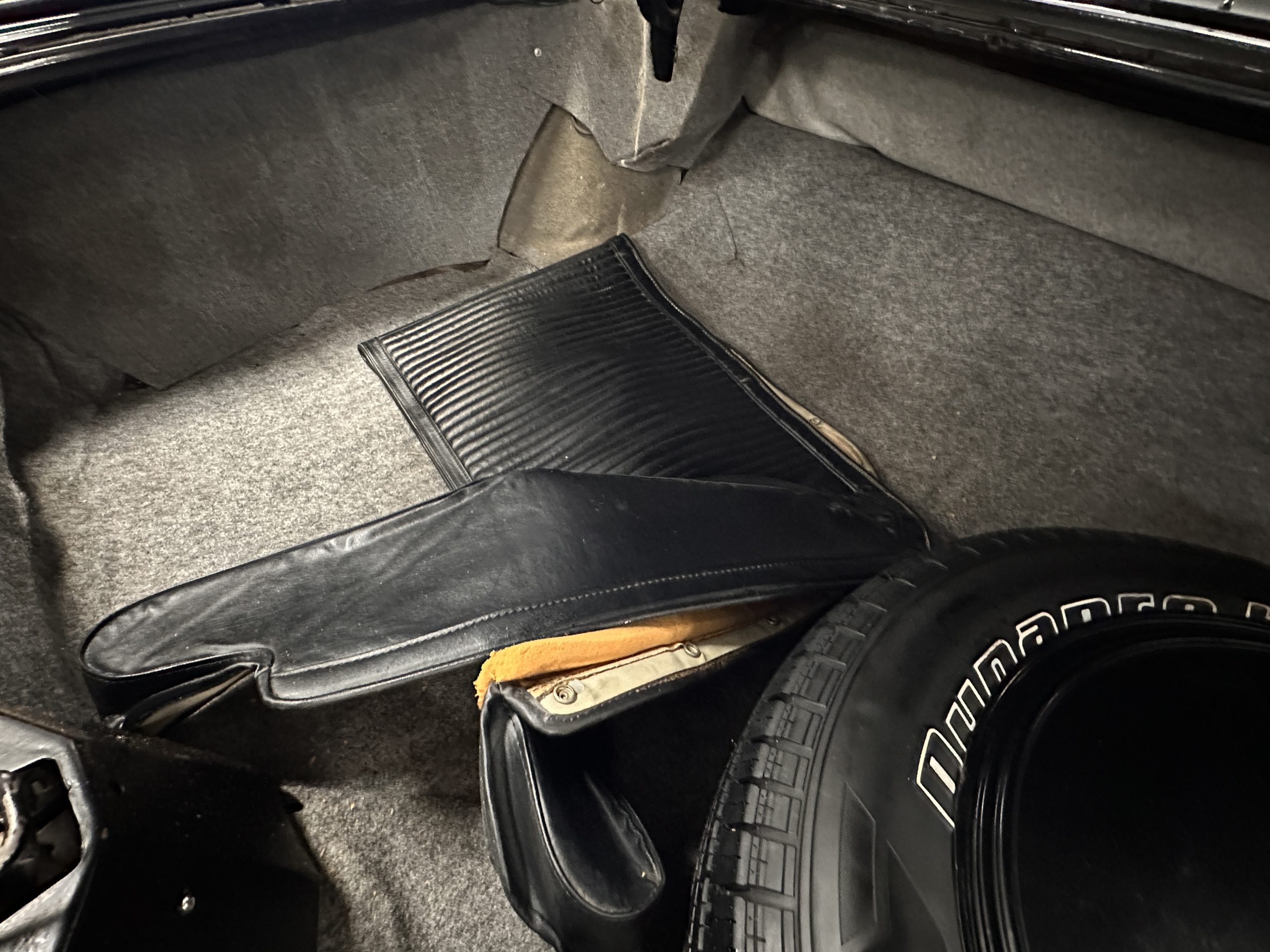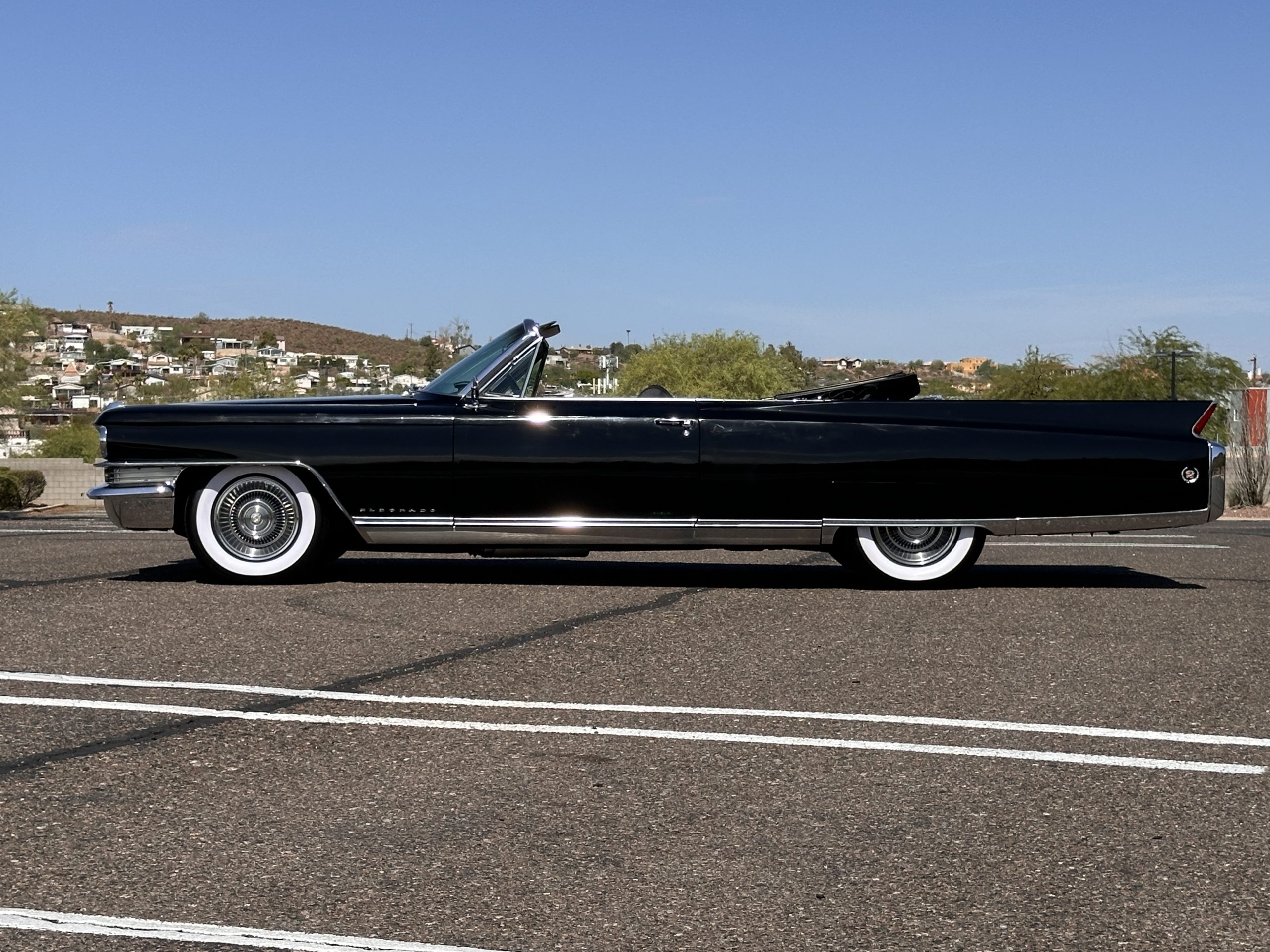 The Ebony Black livery has been beautifully wet sanded and polished. The shine and luster are fabulous. Much of the chrome has been replated over the years and is overall in good condition. The rear bumper has a couple of dings and the rear taillight surrounds have some pitting, but the overall presentation of the Eldorado is beautiful. The Black vinyl power convertible top looks as new and works perfectly (the black vinyl top boot cover is original and has shrunk, no longer fitting properly). The wide white walled radials are new and look great.
