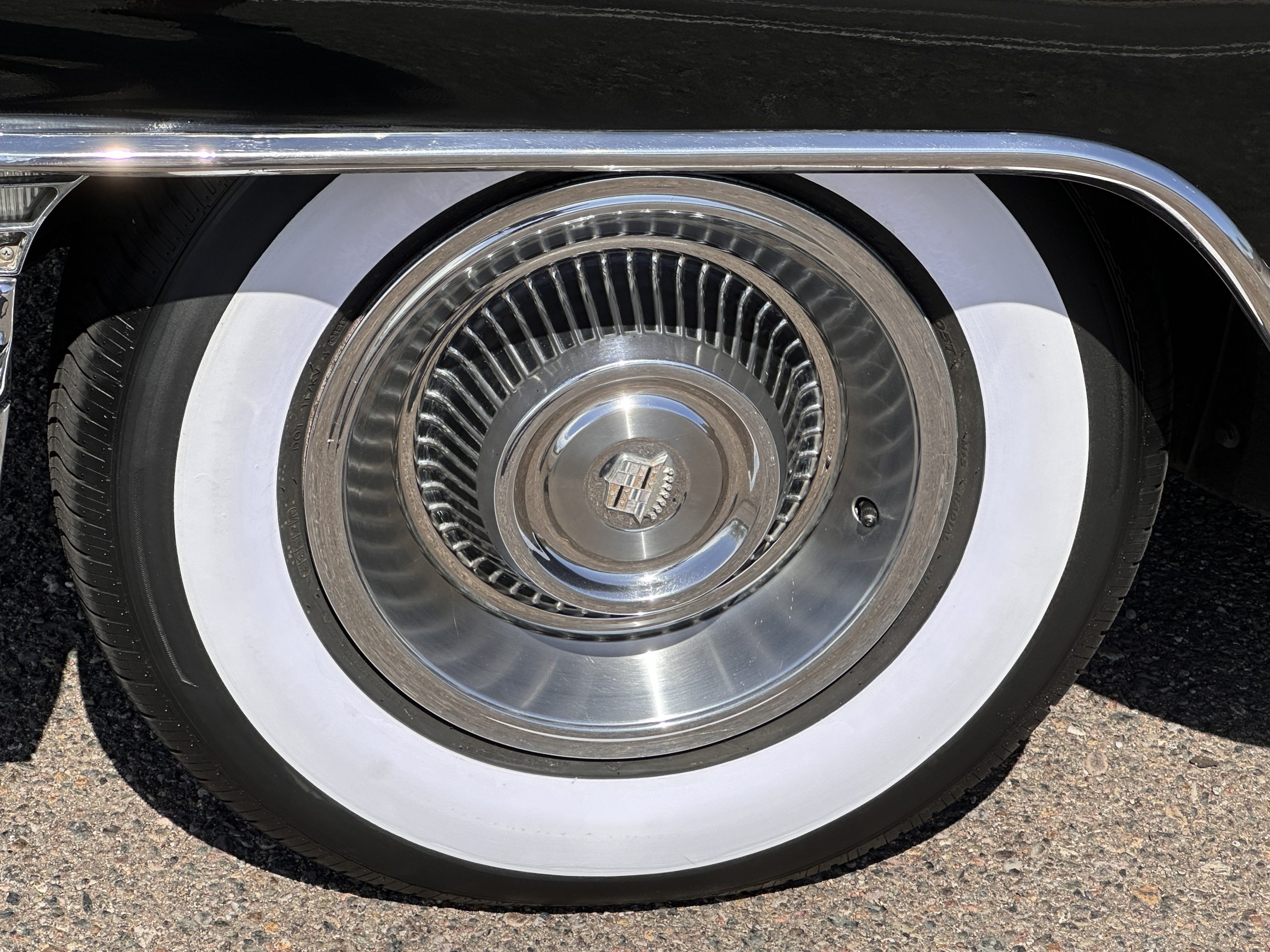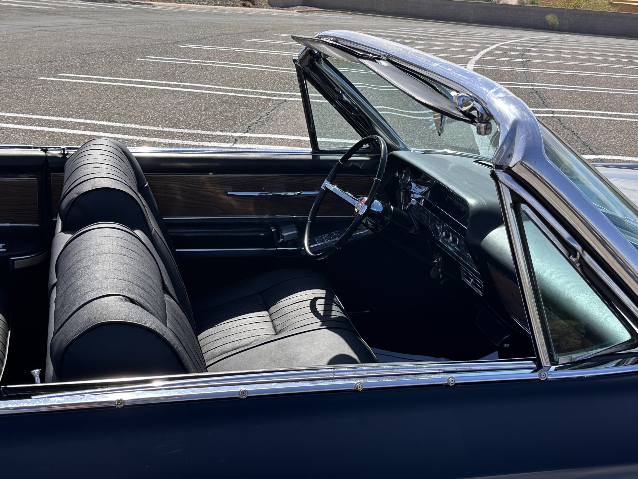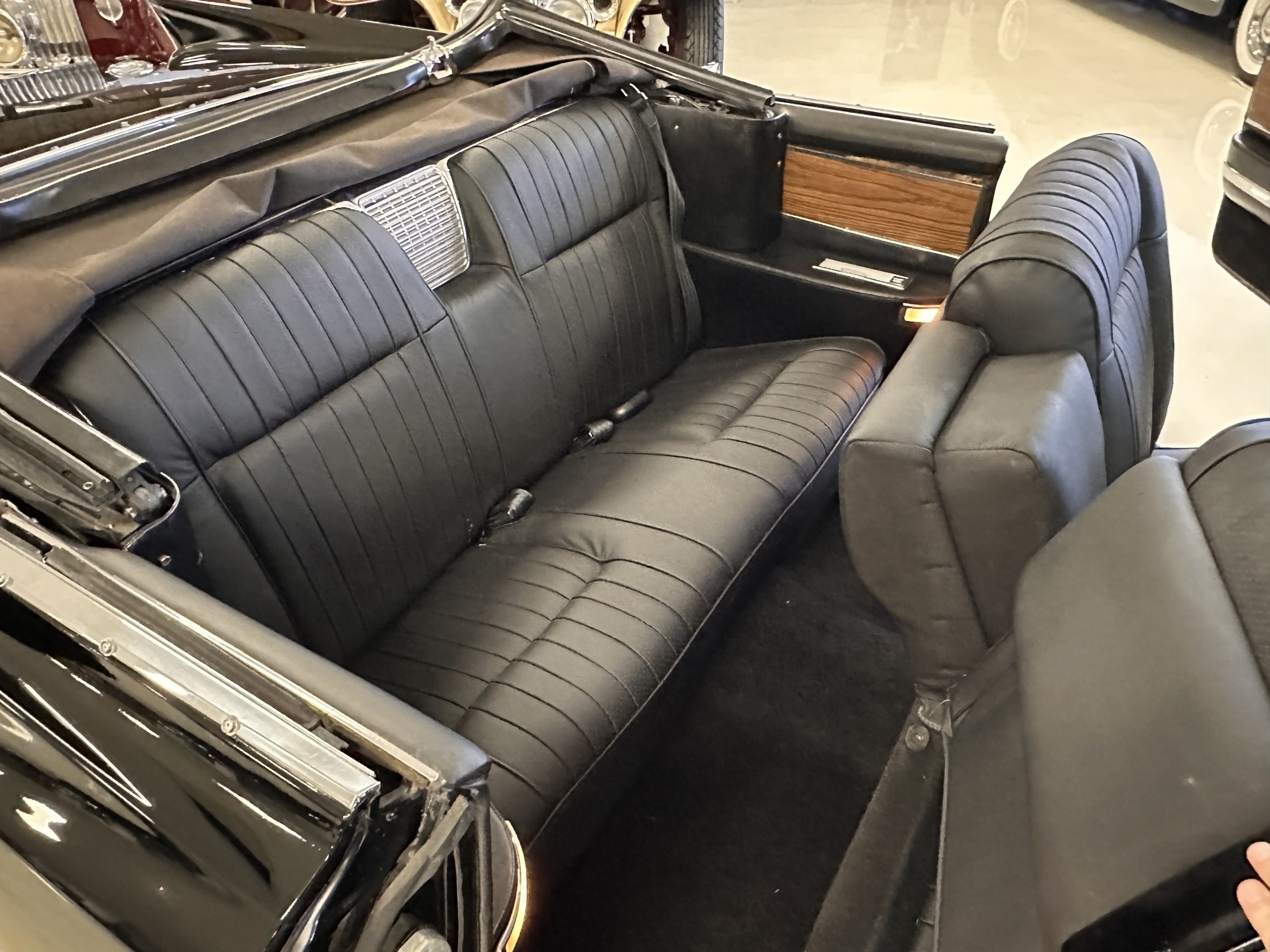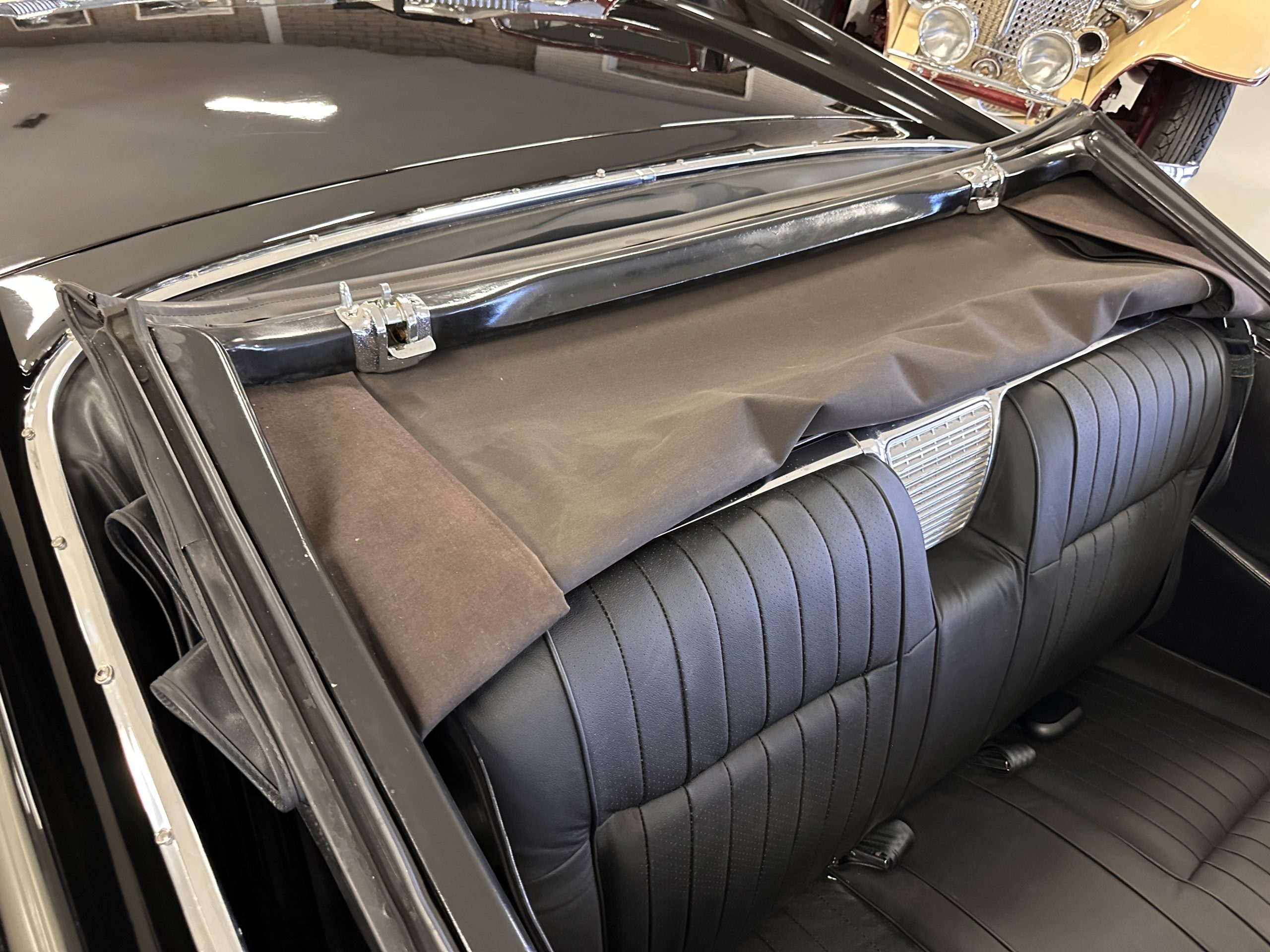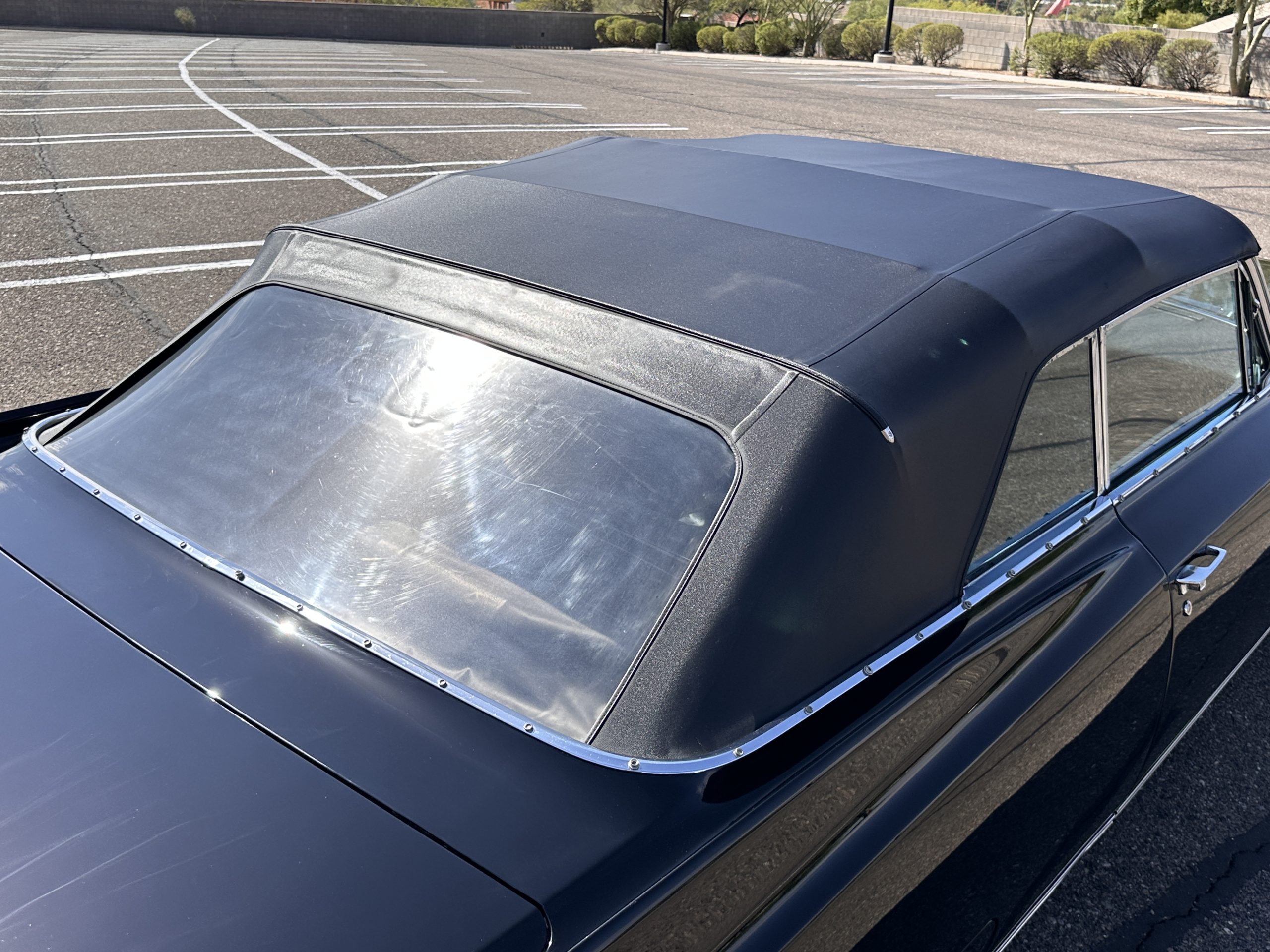The Ebony Black livery has been beautifully wet sanded and polished. The shine and luster are fabulous. Much of the chrome has been replated over the years and is overall in good condition. The rear bumper has a couple of dings and the rear taillight surrounds have some pitting, but the overall presentation of the Eldorado is beautiful. The Black vinyl power convertible top looks as new and works perfectly (the black vinyl top boot cover is original and has shrunk, no longer fitting properly). The wide white walled radials are new and look great.