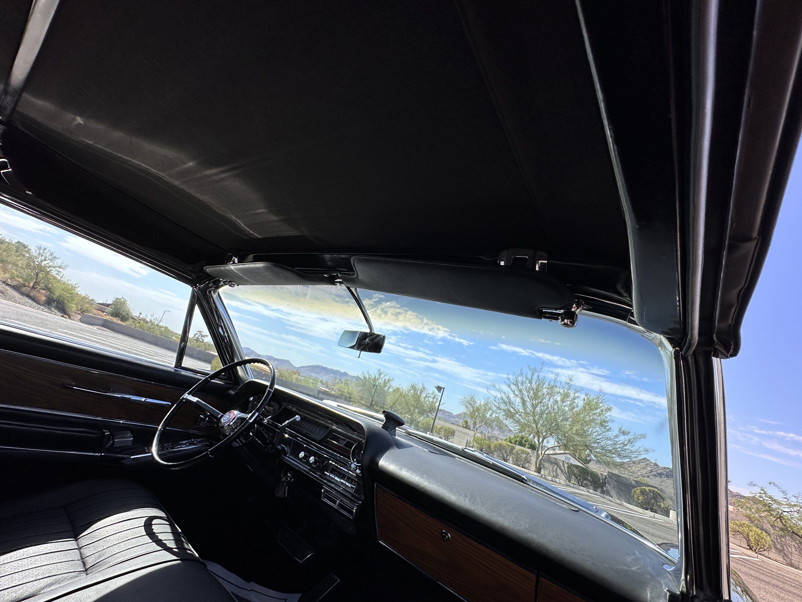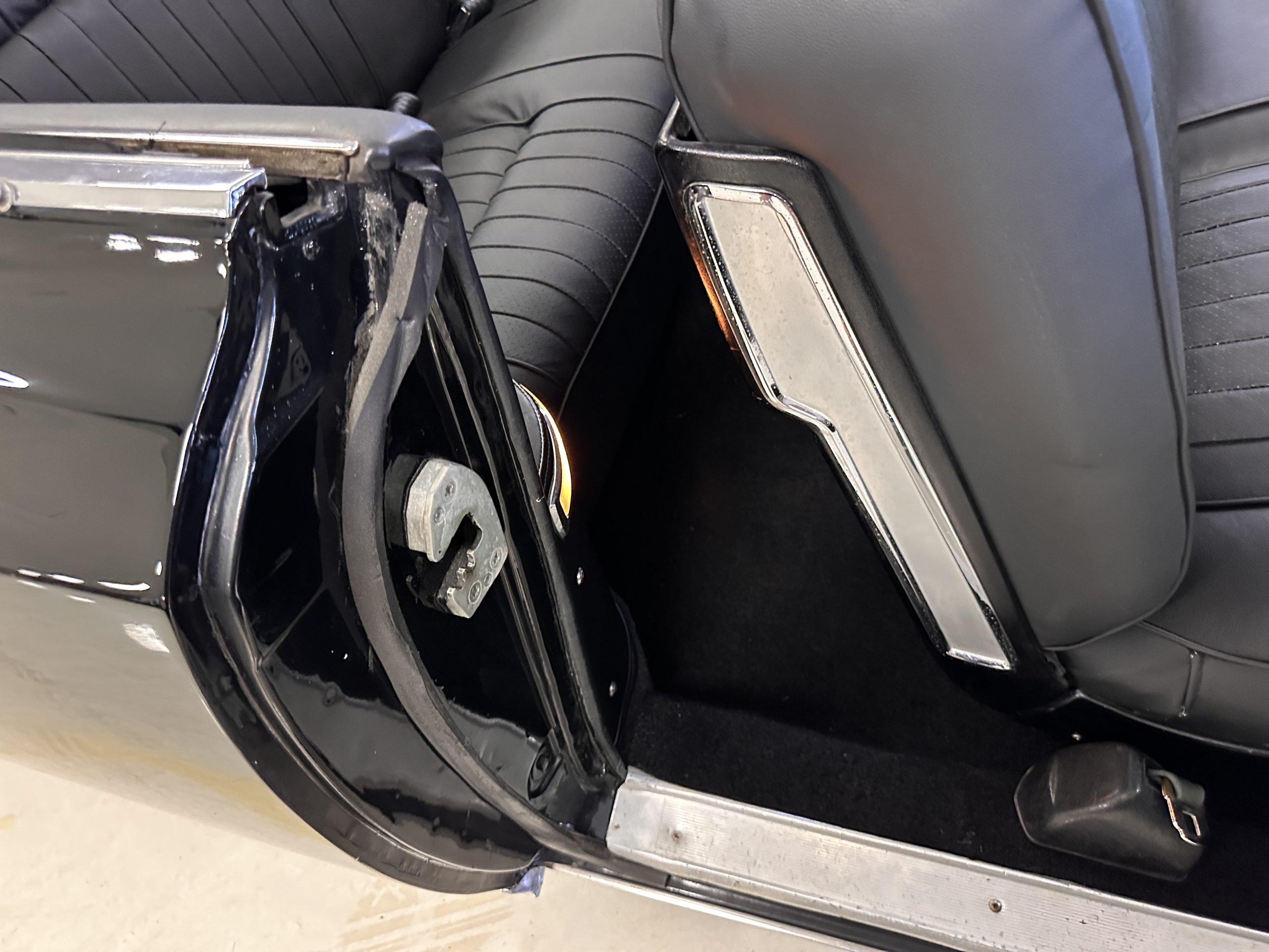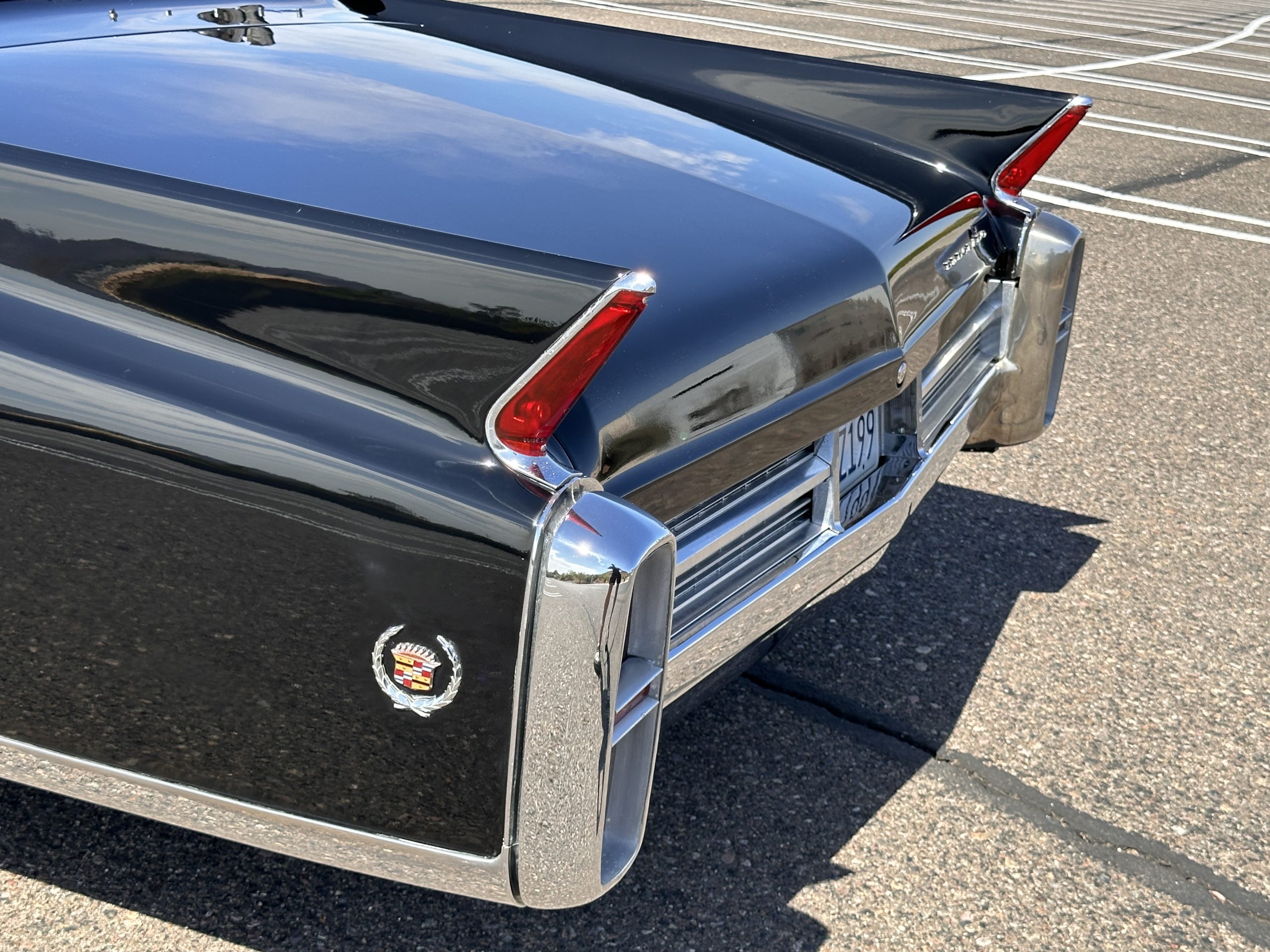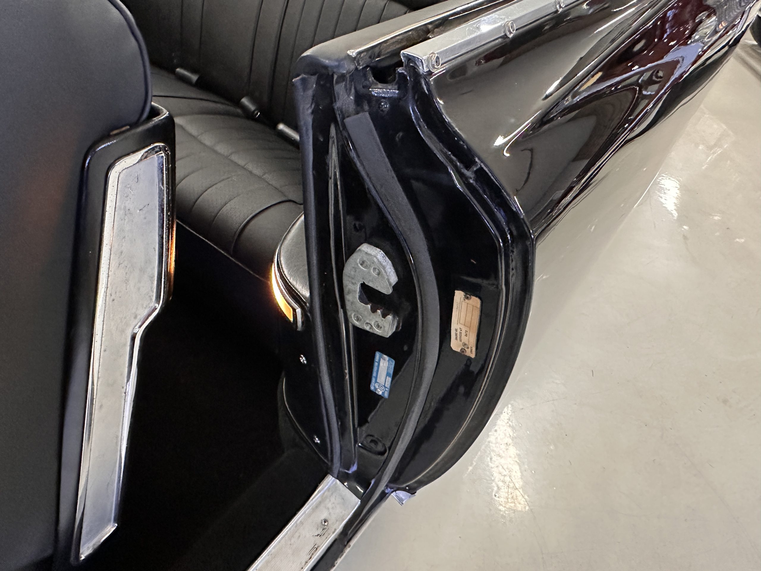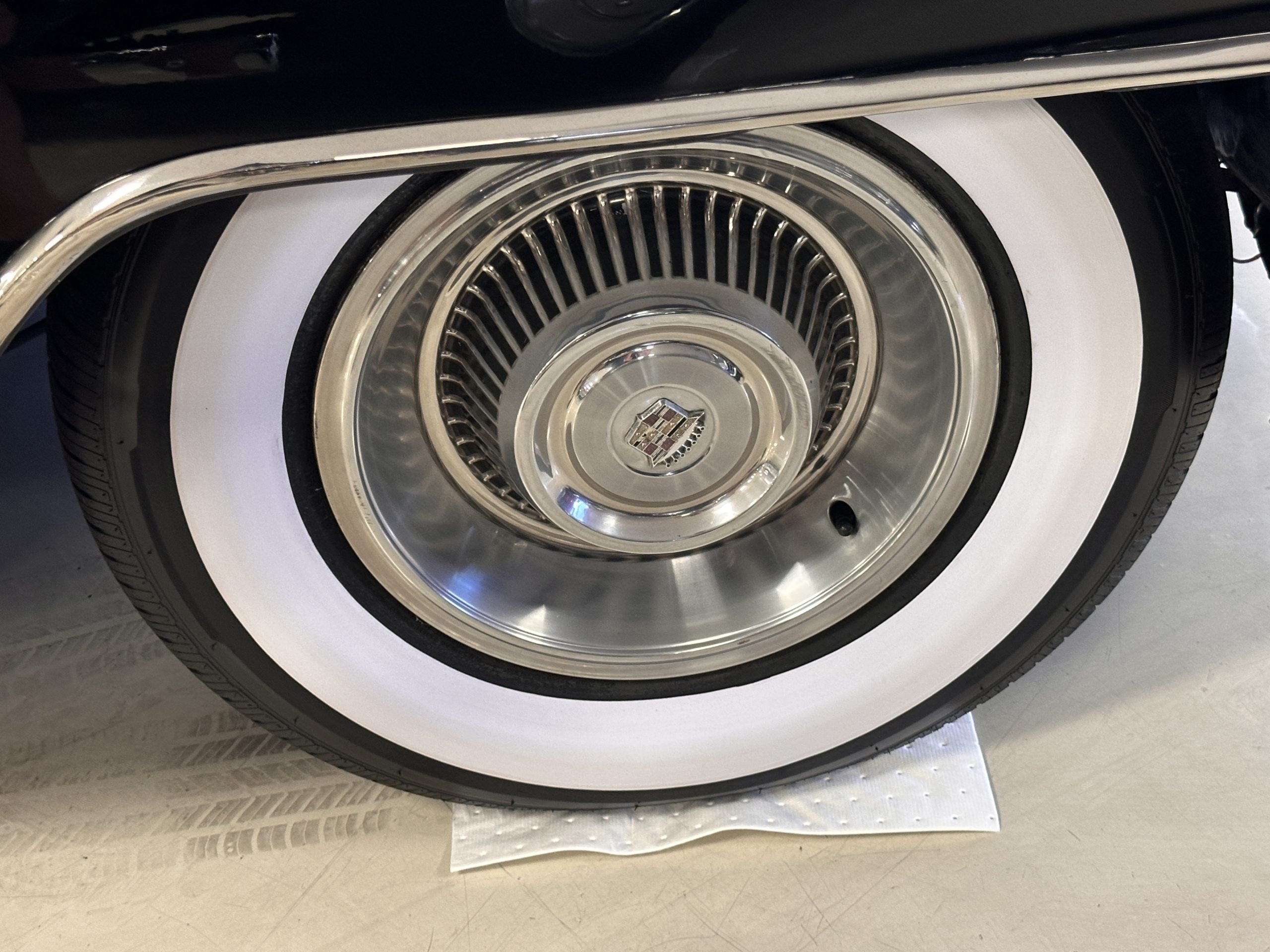 The Ebony Black livery has been beautifully wet sanded and polished. The shine and luster are fabulous. Much of the chrome has been replated over the years and is overall in good condition. The rear bumper has a couple of dings and the rear taillight surrounds have some pitting, but the overall presentation of the Eldorado is beautiful. The Black vinyl power convertible top looks as new and works perfectly (the black vinyl top boot cover is original and has shrunk, no longer fitting properly). The wide white walled radials are new and look great.