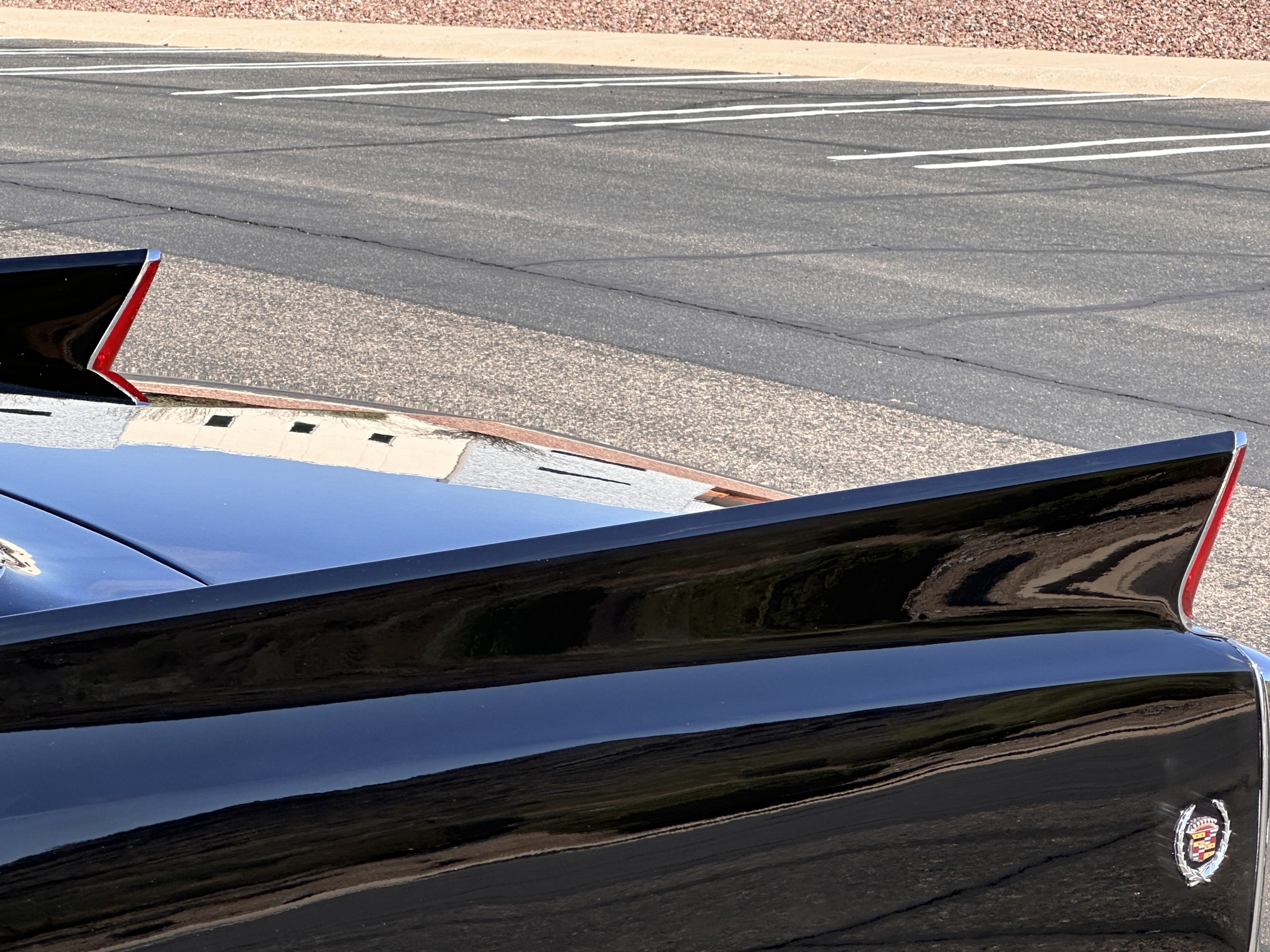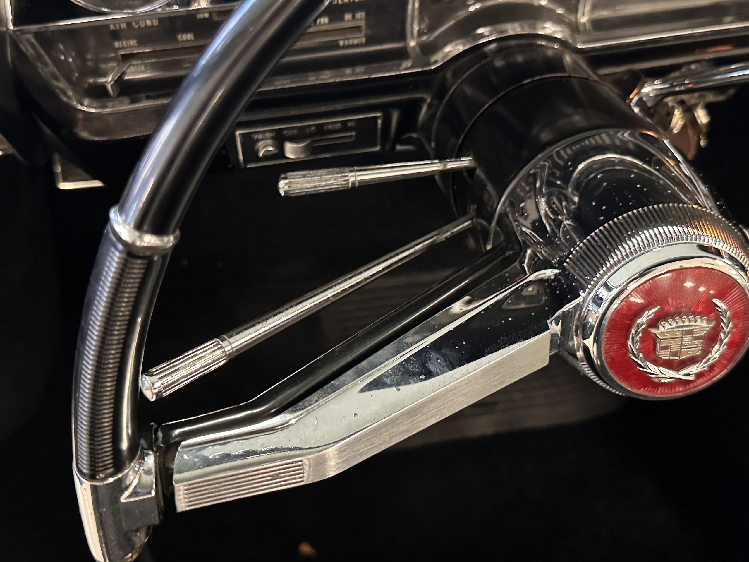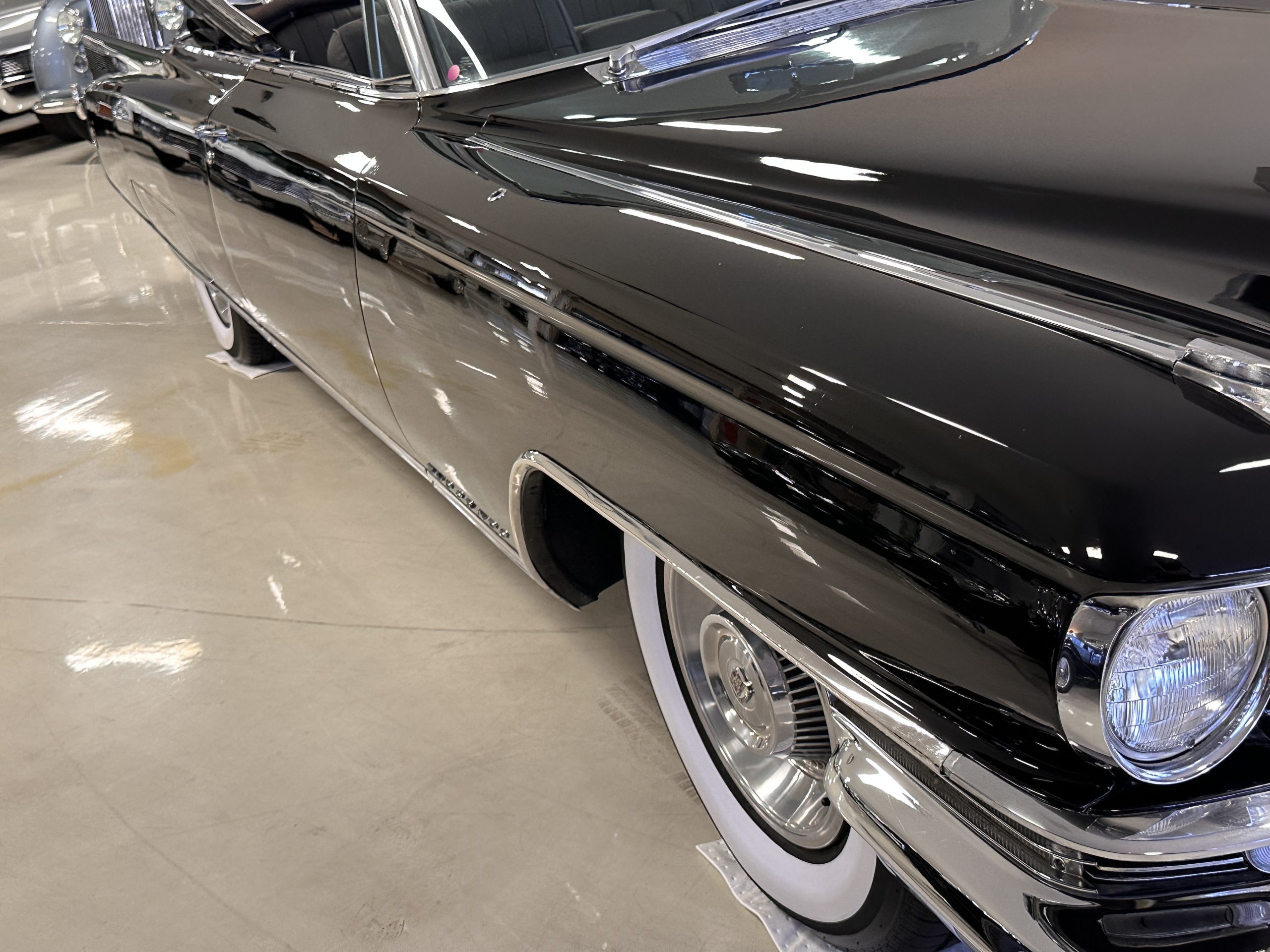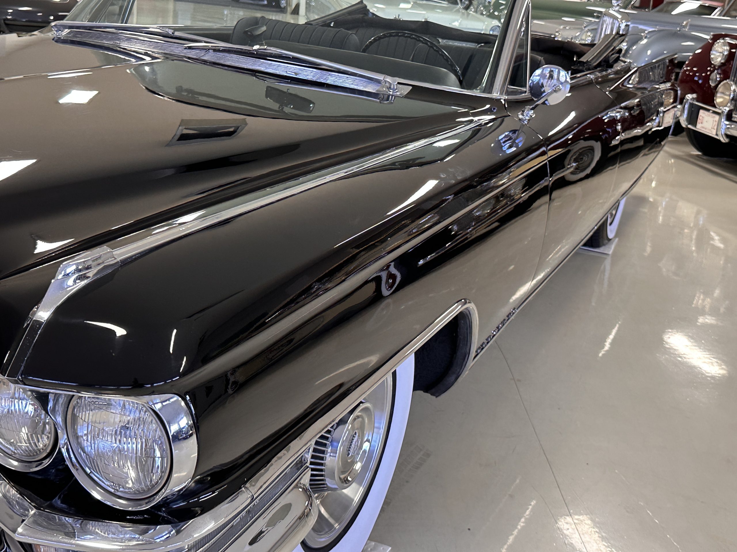 The Ebony Black livery has been beautifully wet sanded and polished. The shine and luster are fabulous. Much of the chrome has been replated over the years and is overall in good condition. The rear bumper has a couple of dings and the rear taillight surrounds have some pitting, but the overall presentation of the Eldorado is beautiful. The Black vinyl power convertible top looks as new and works perfectly (the black vinyl top boot cover is original and has shrunk, no longer fitting properly). The wide white walled radials are new and look great.