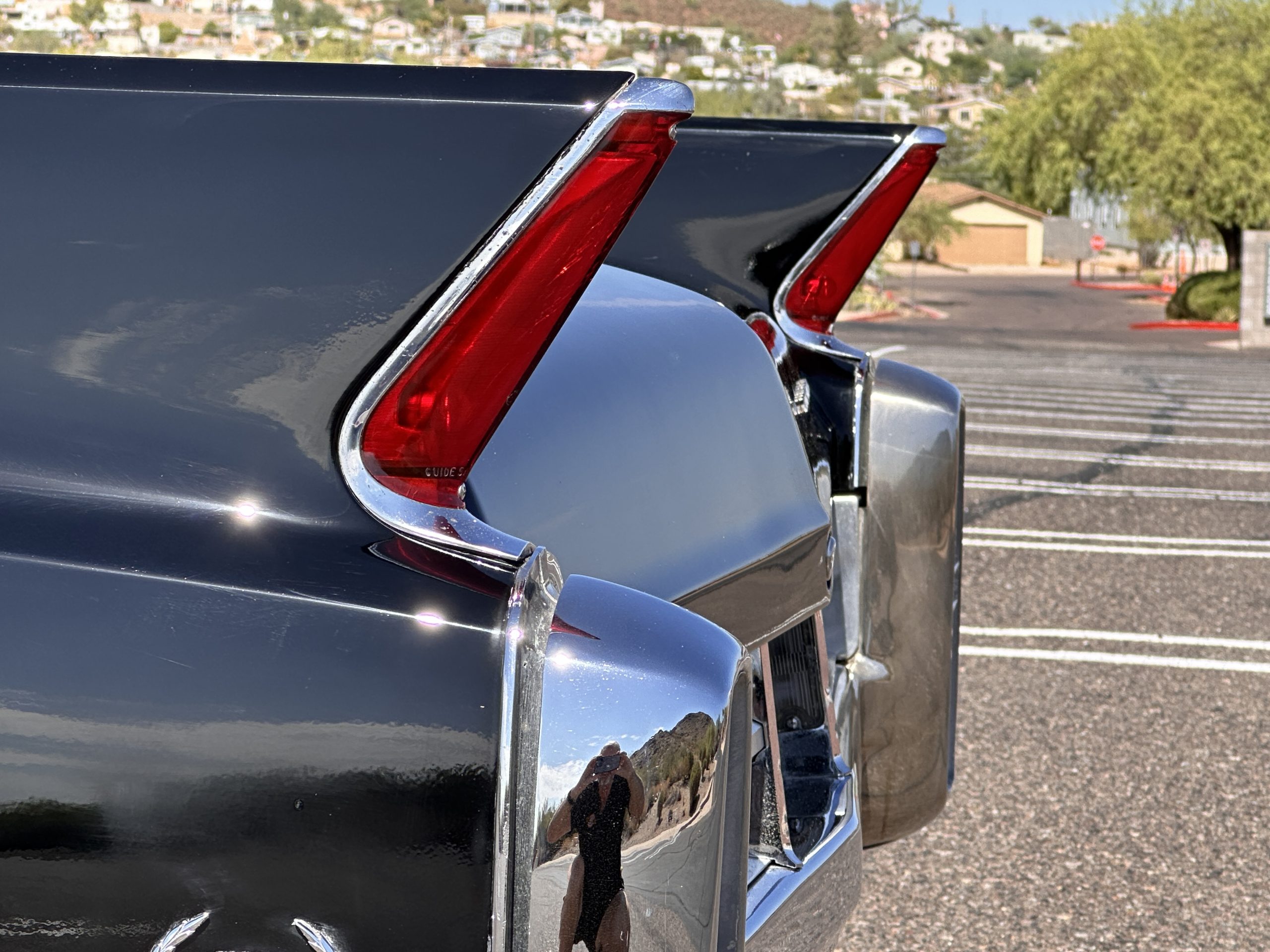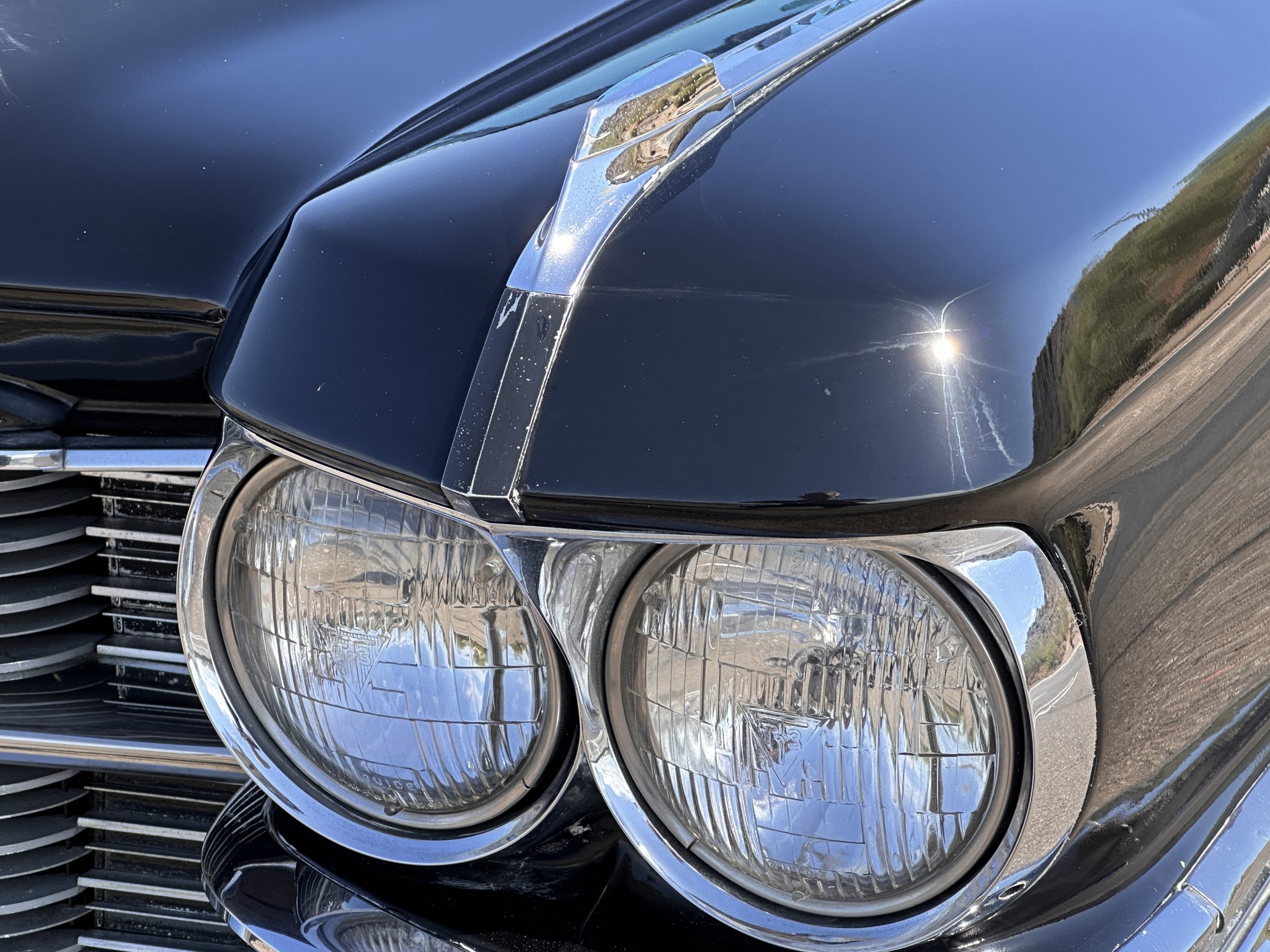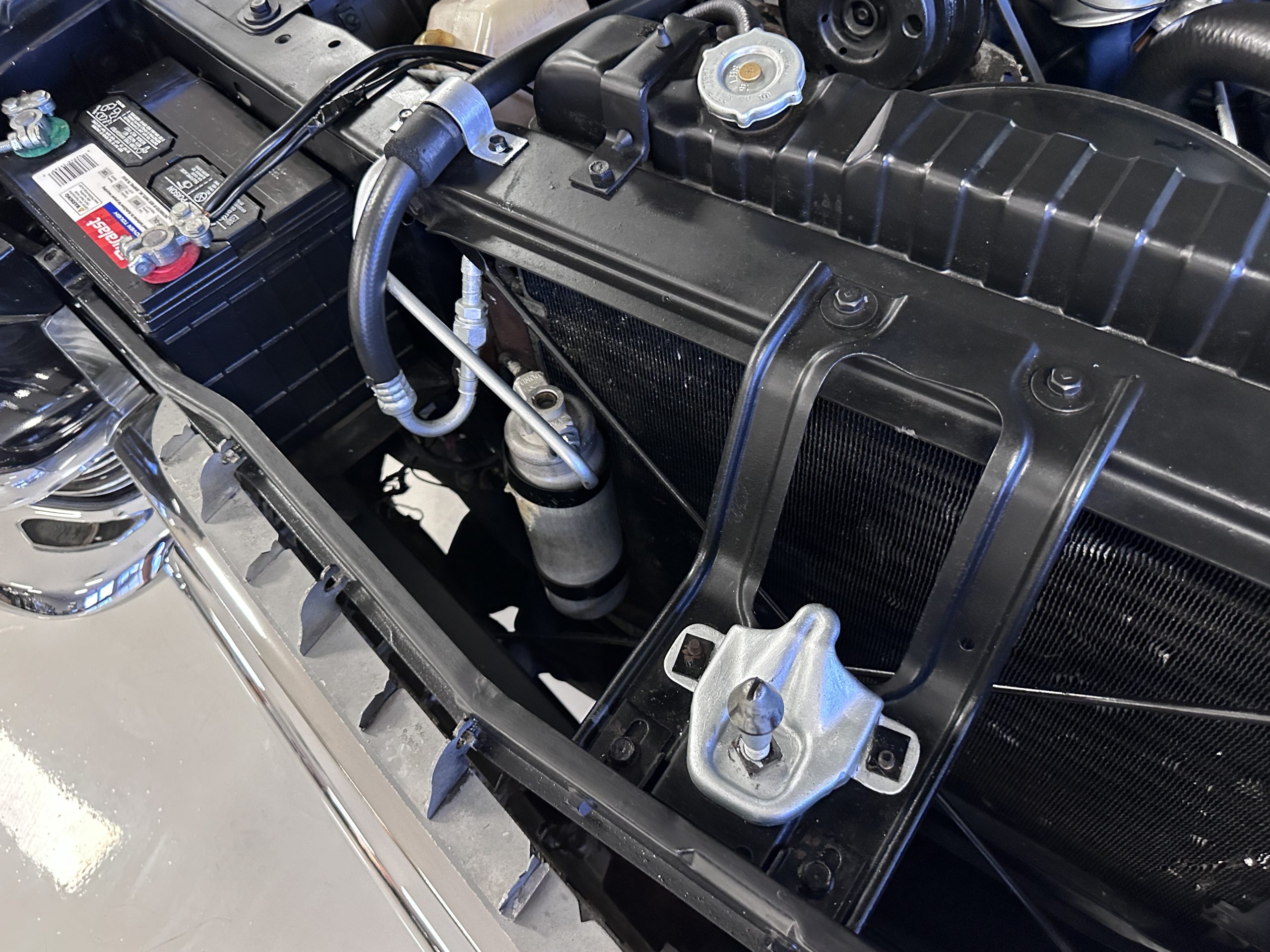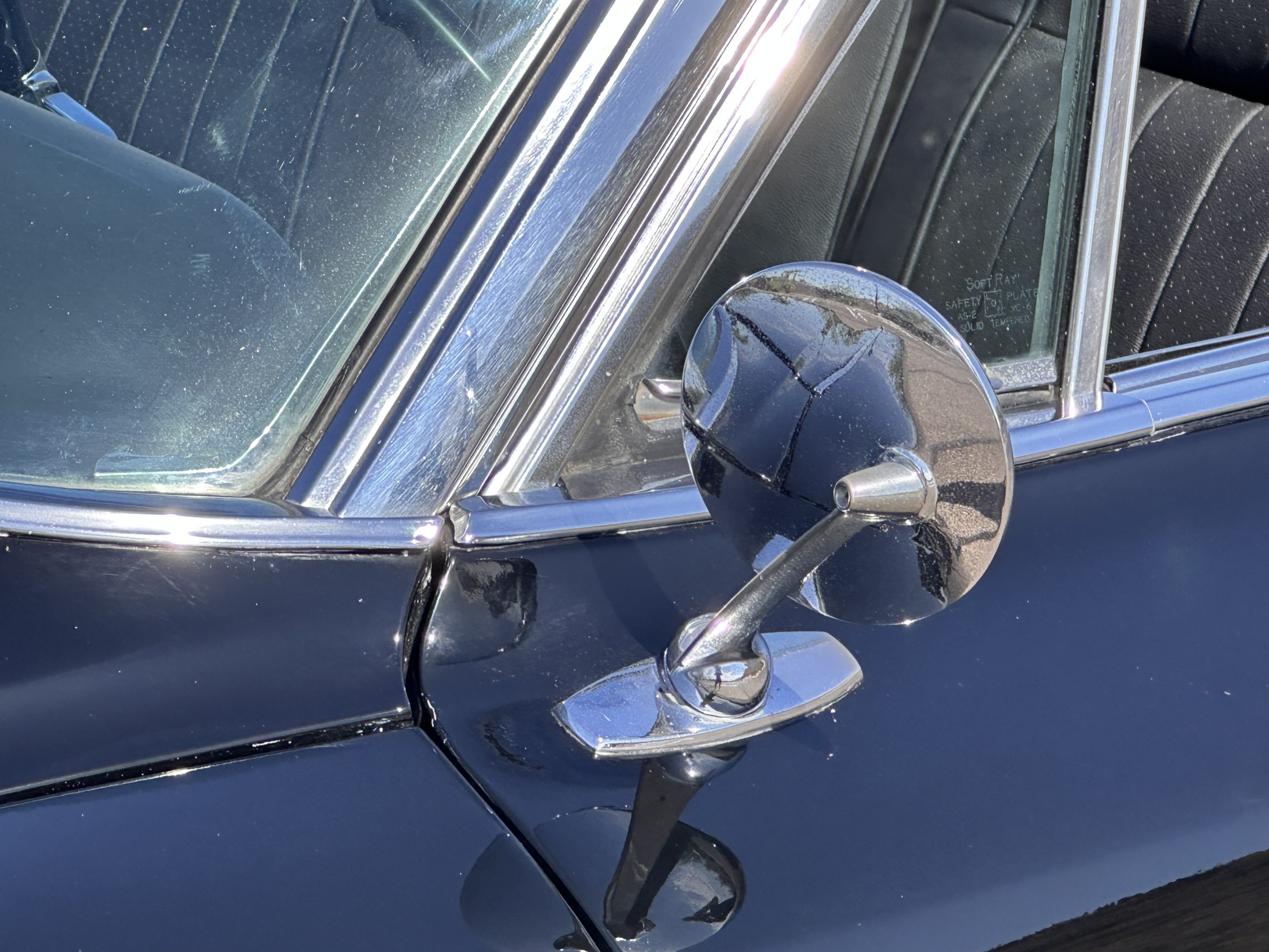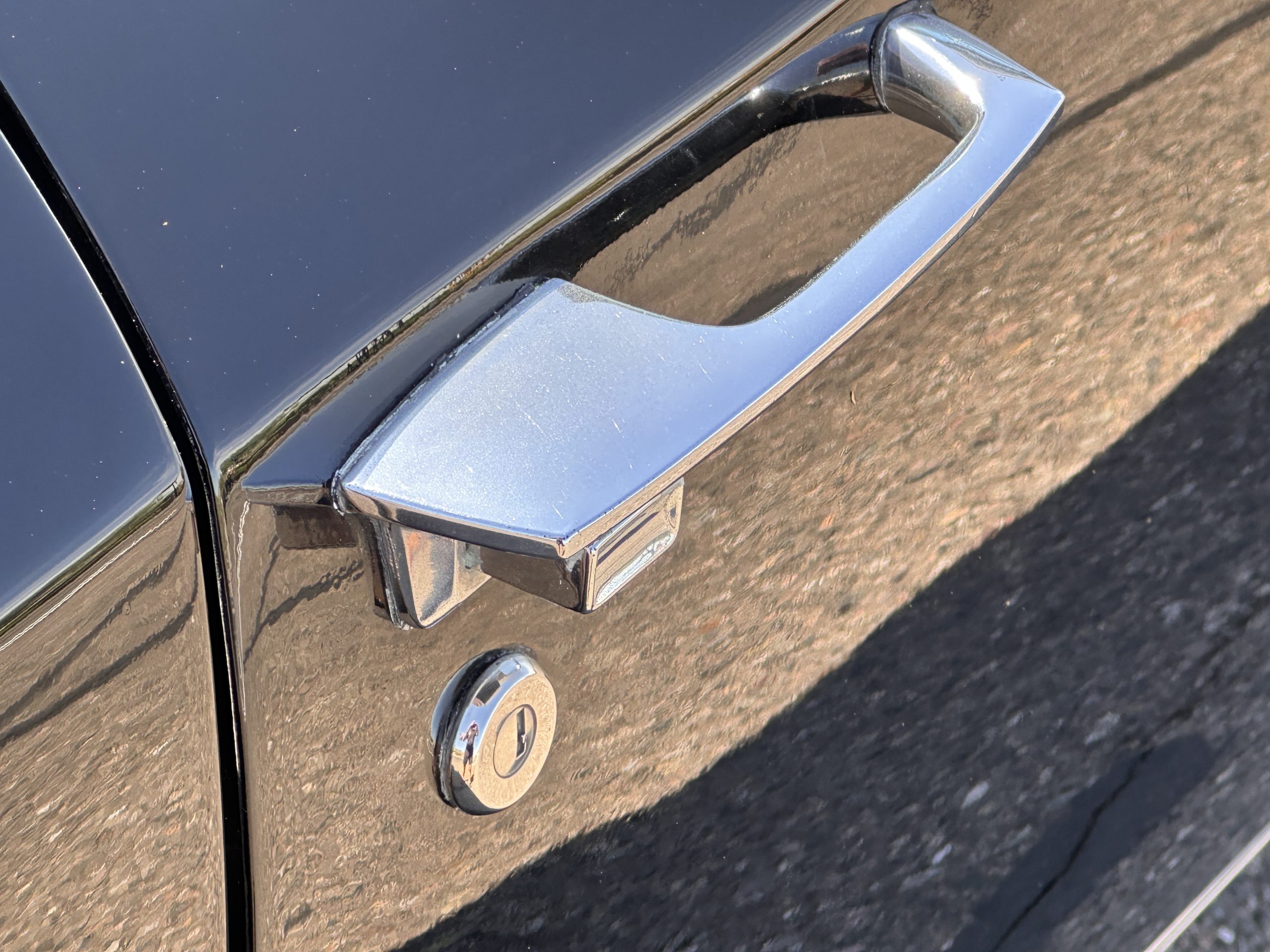 The Ebony Black livery has been beautifully wet sanded and polished. The shine and luster are fabulous. Much of the chrome has been replated over the years and is overall in good condition. The rear bumper has a couple of dings and the rear taillight surrounds have some pitting, but the overall presentation of the Eldorado is beautiful. The Black vinyl power convertible top looks as new and works perfectly (the black vinyl top boot cover is original and has shrunk, no longer fitting properly). The wide white walled radials are new and look great.