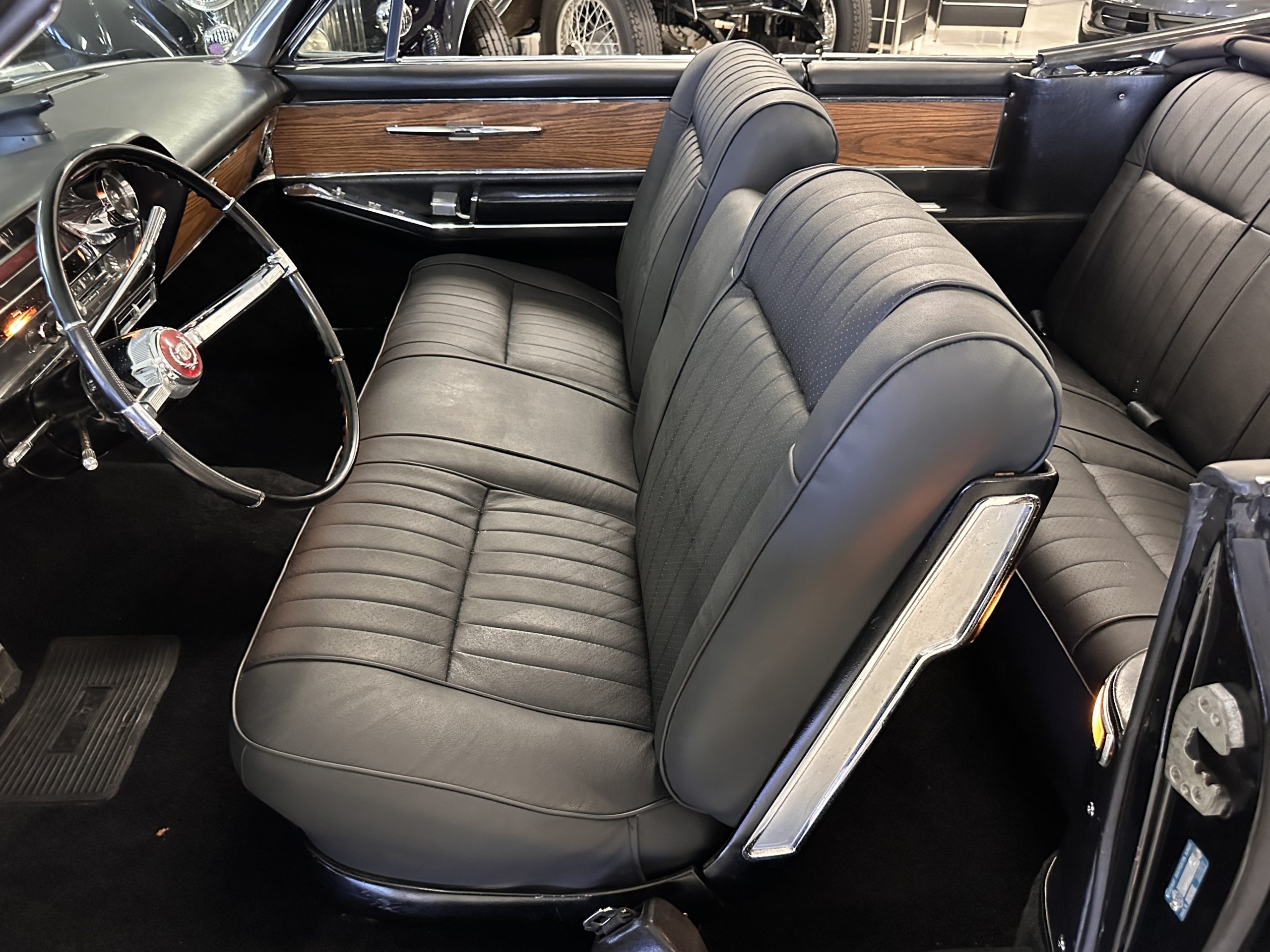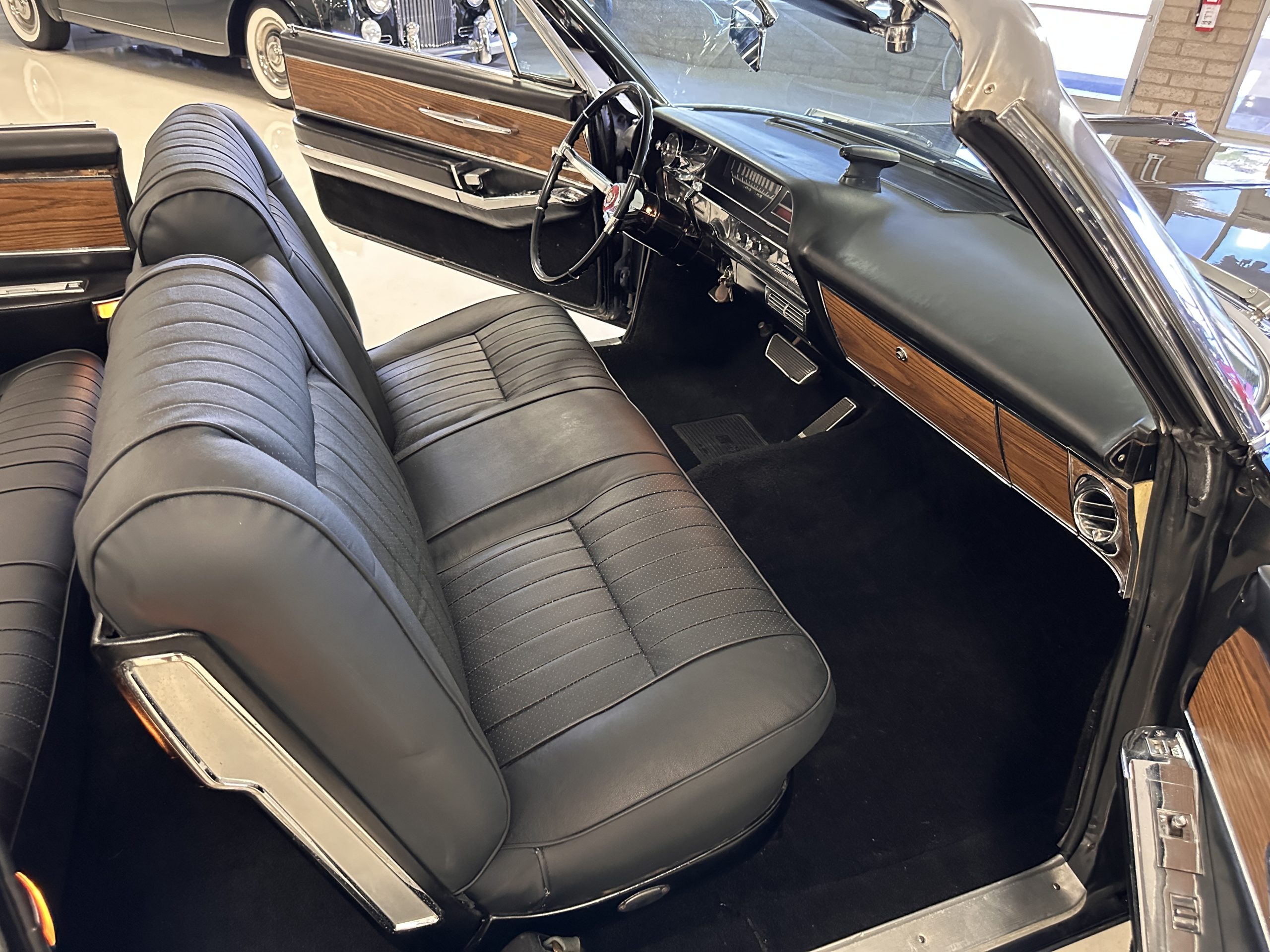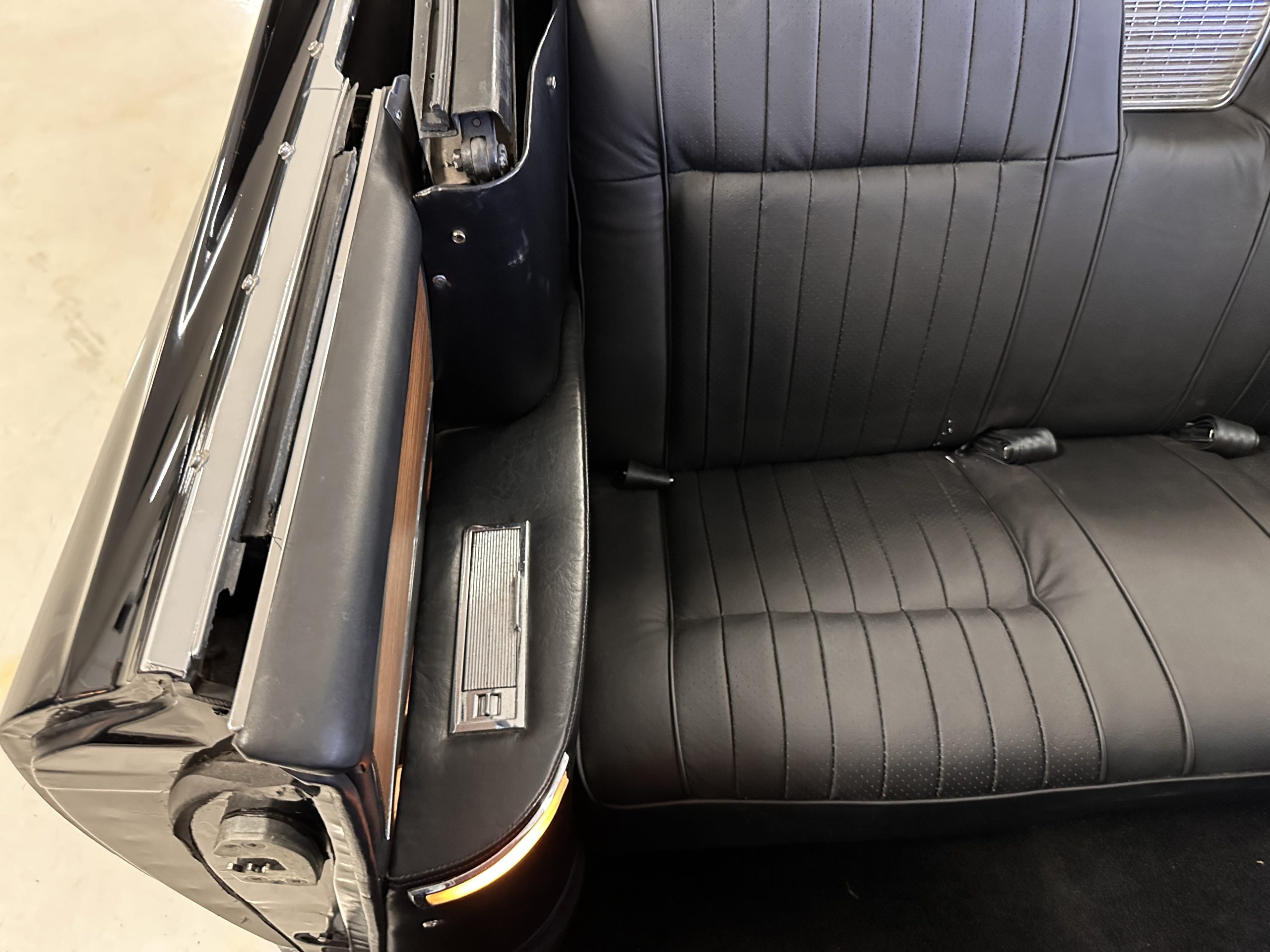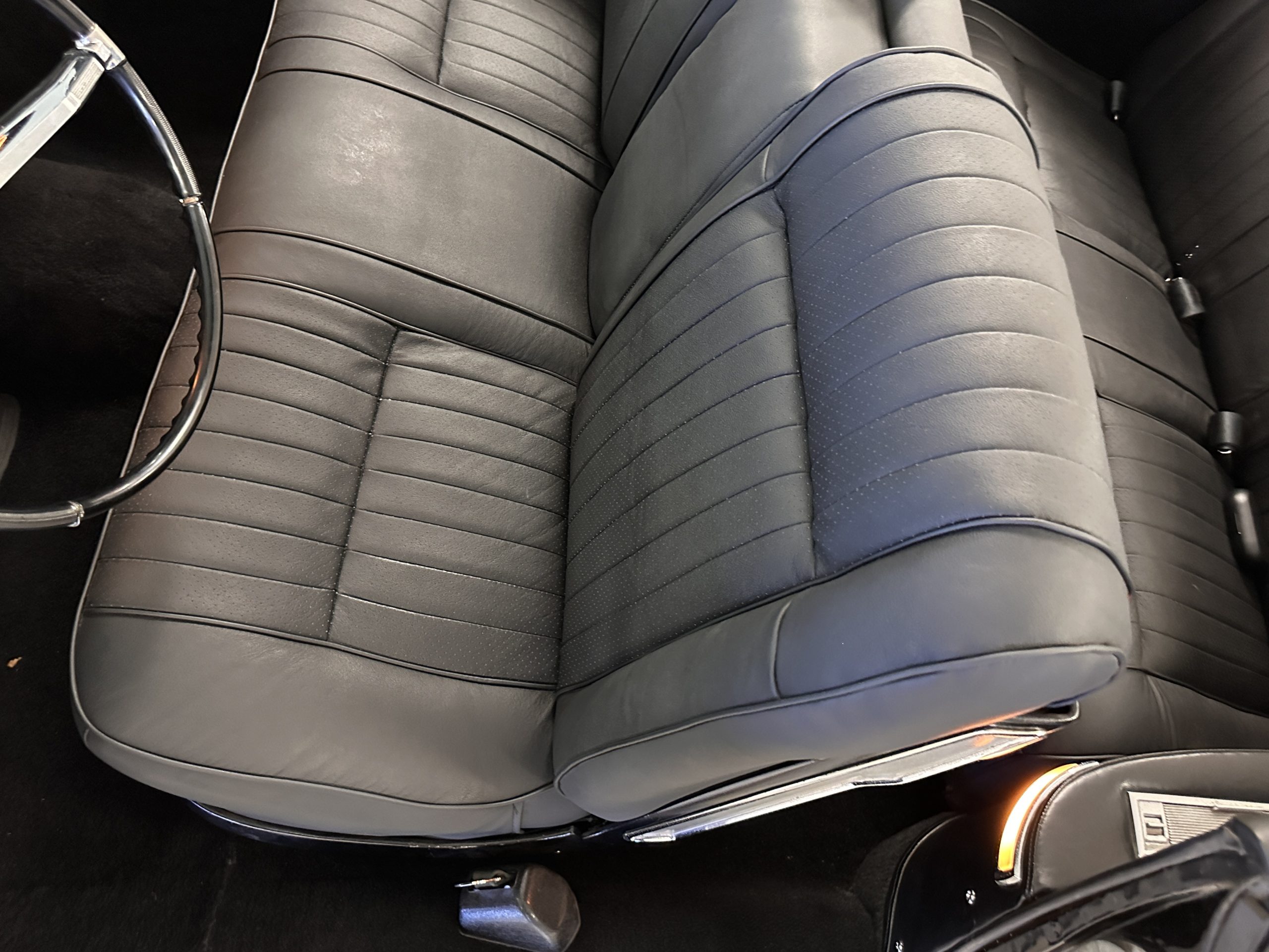 The interior has new black leather in the correct style and the seats have been rebuilt to provide original support. The black carpeting was replaced earlier and looks great. The wood veneer is in overall very good condition and is correct and original. There are no cracks in the steering wheel nor on the dashboard cap. The AM/FM stereo and power antenna work well and the air condition also blows nice and cold. The interior also features tilt steering wheel, power door locks, power windows and front seat as well as a remote truck opener. Overall, the interior looks very sharp and is correct.