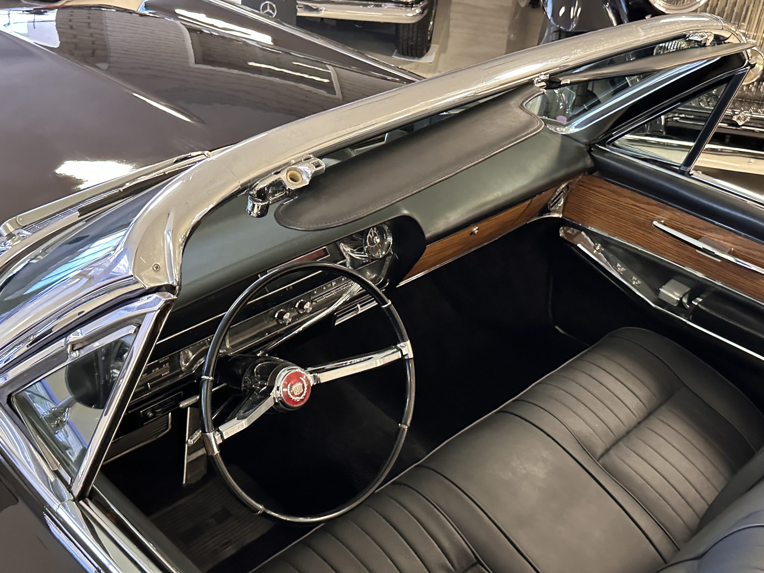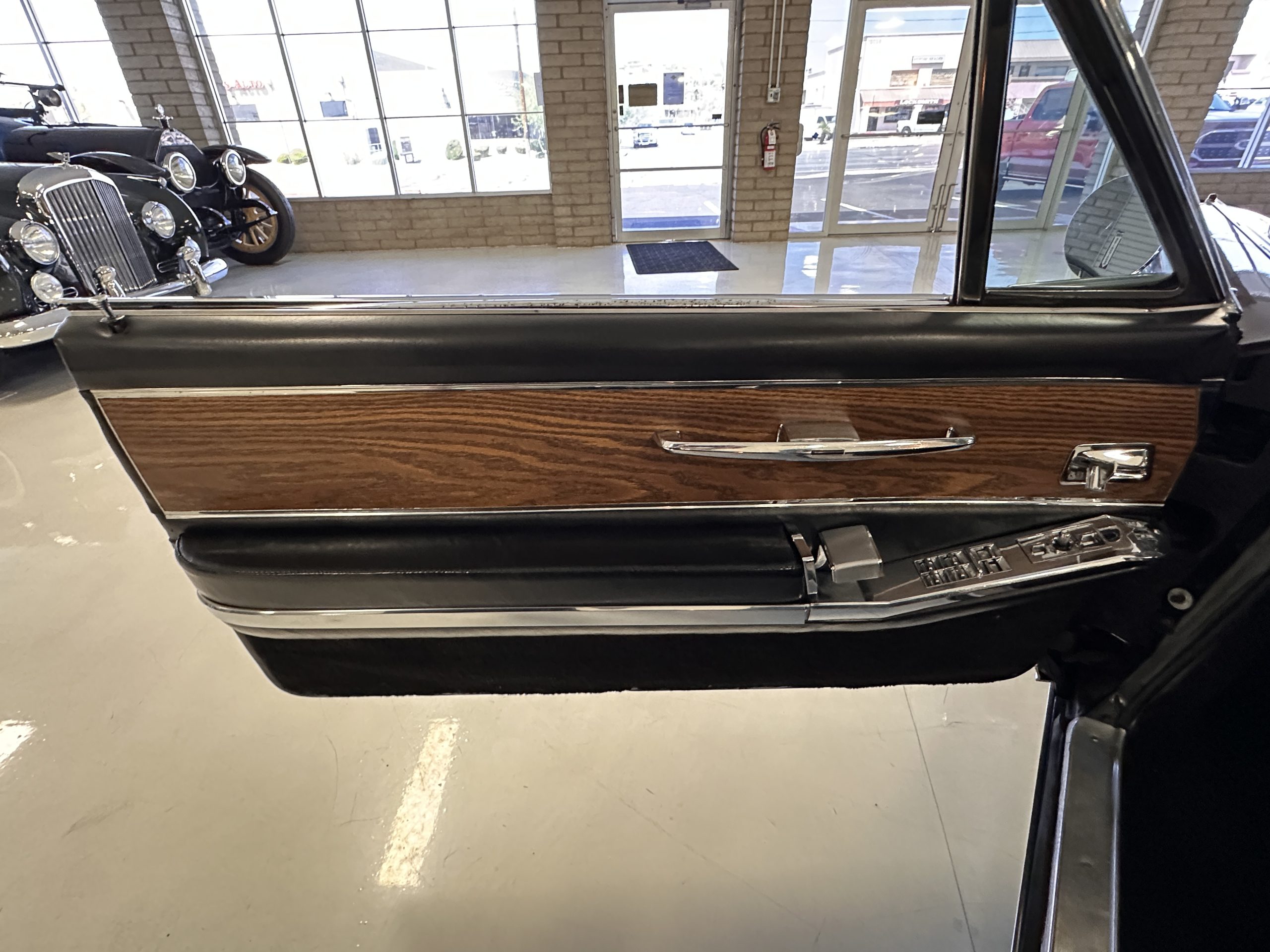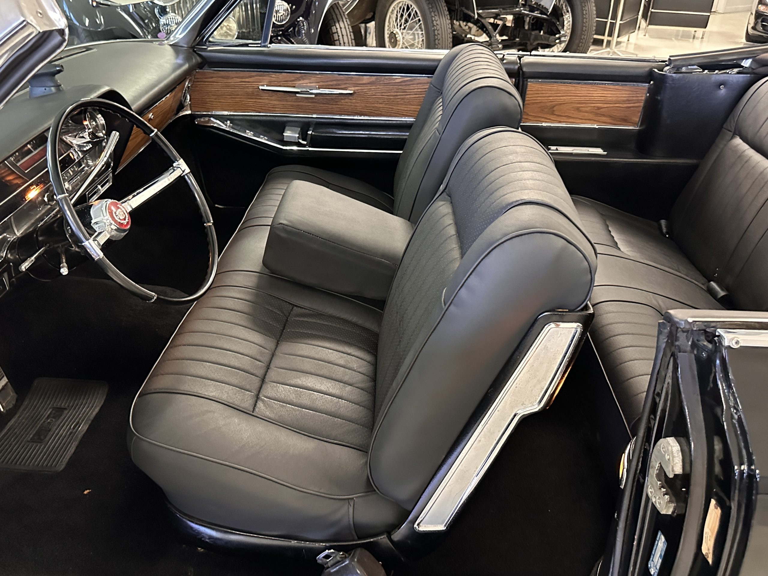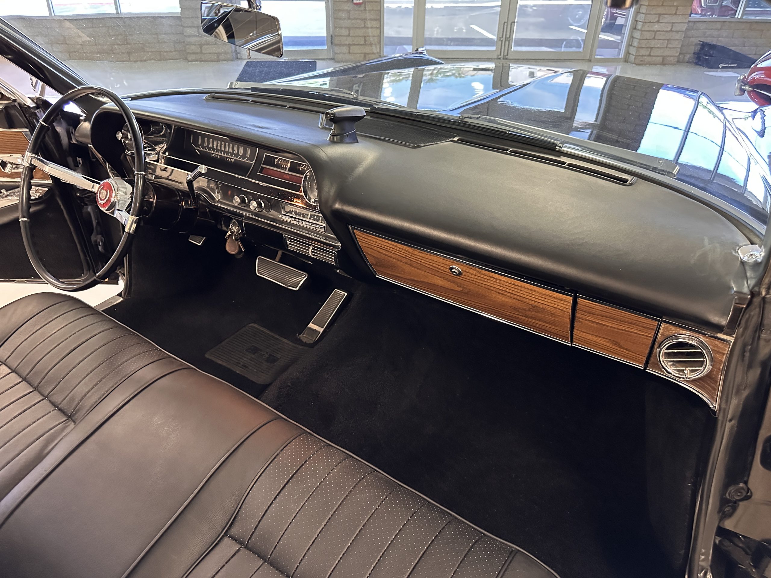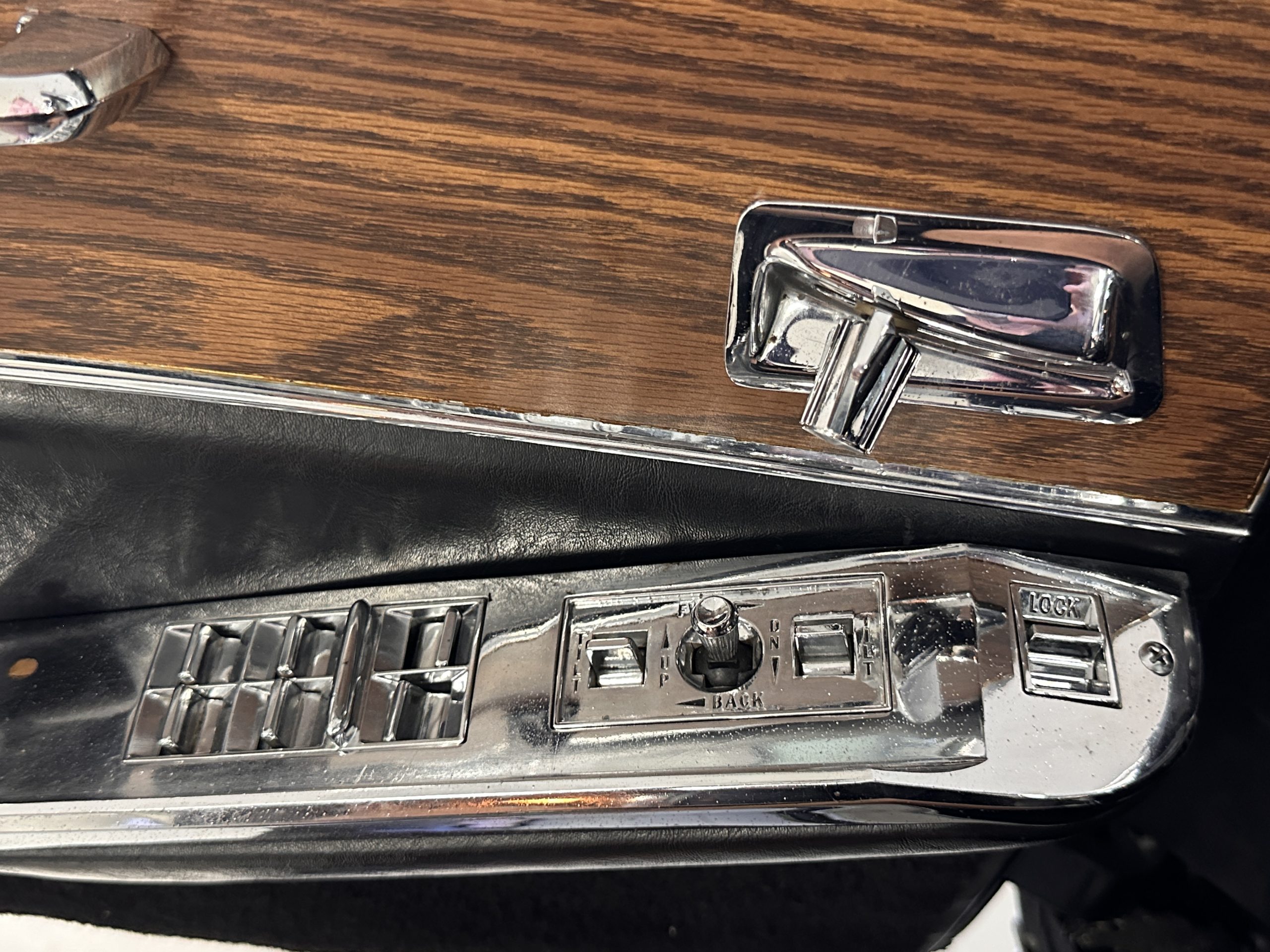 The interior has new black leather in the correct style and the seats have been rebuilt to provide original support. The black carpeting was replaced earlier and looks great. The wood veneer is in overall very good condition and is correct and original. There are no cracks in the steering wheel nor on the dashboard cap. The AM/FM stereo and power antenna work well and the air condition also blows nice and cold. The interior also features tilt steering wheel, power door locks, power windows and front seat as well as a remote truck opener. Overall, the interior looks very sharp and is correct.