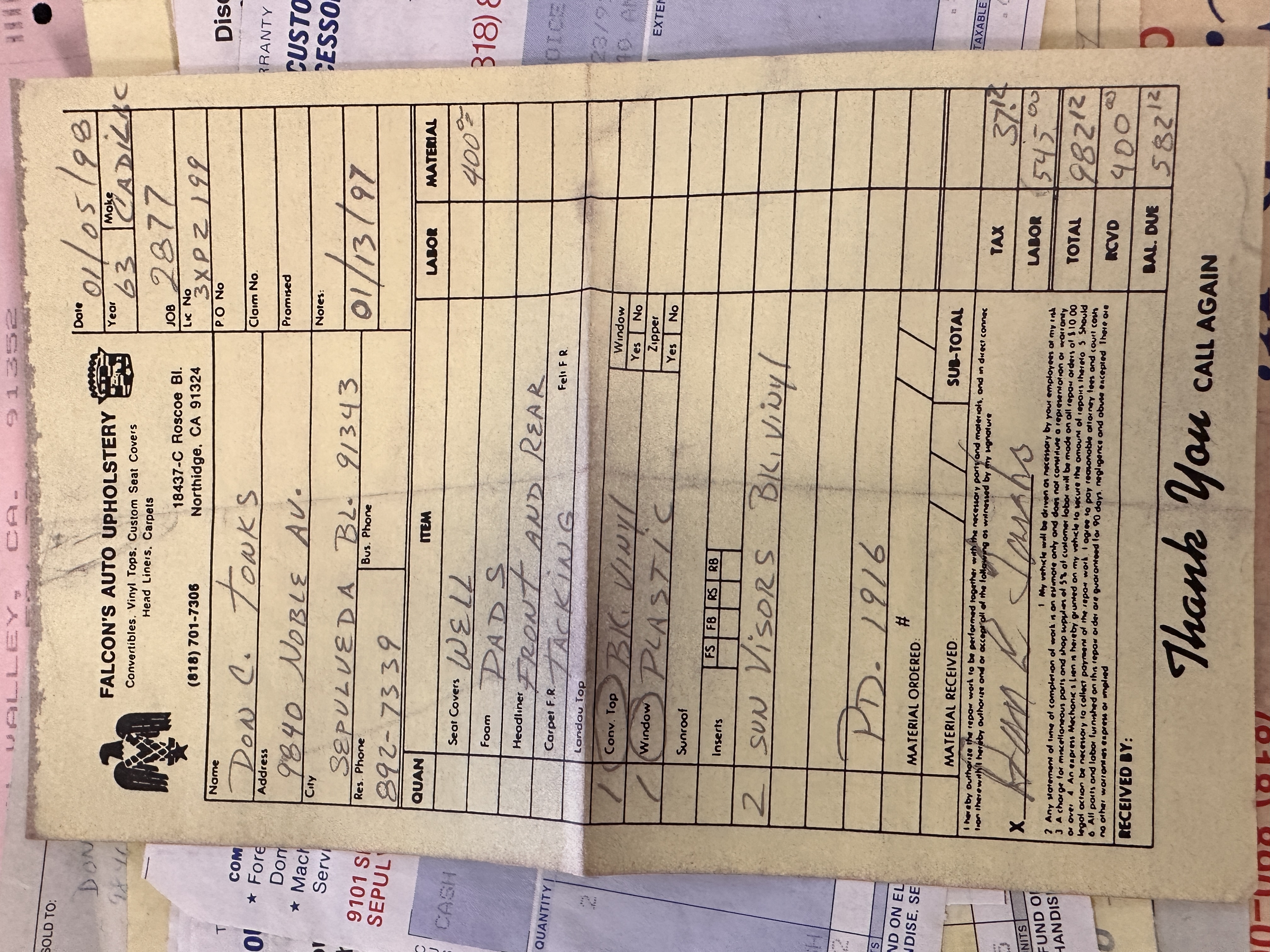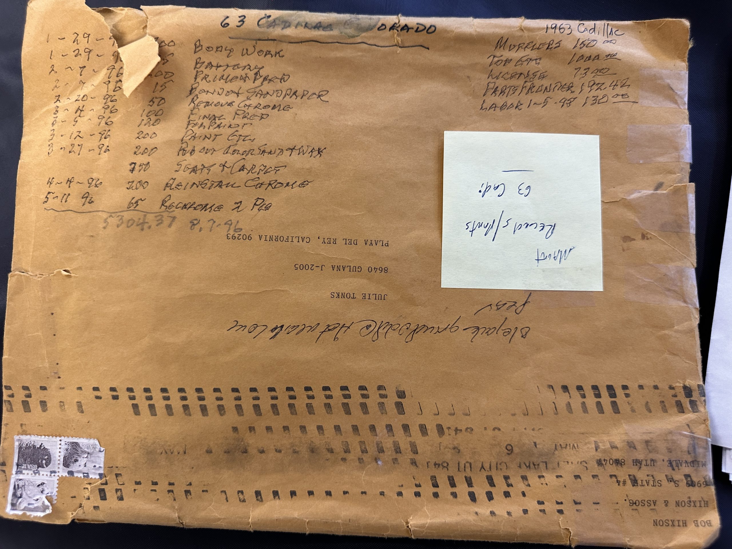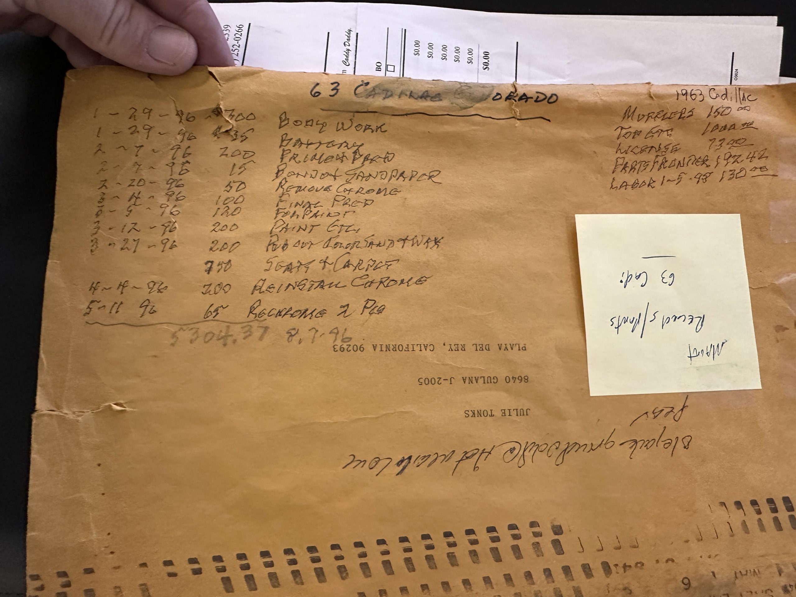 Sold new in Los Angeles and lived its life in Los Angeles until acquired by Classic Promenade in May 2024. By January 1991, the Cadillac was owned by Don Tonks of Sepulveda, CA. Don proceeded to commence a driving restoration. There is a stack of receipts for the work he performed on the Eldorado. The mileage reading on the odometer on January 14, 2000, was 37,807. Don sold to Roy Tonks of San Dimas, CA on February 8, 2001. The odometer reading was then 38,754. The Eldorado now has 43,158 showing on its odometer.