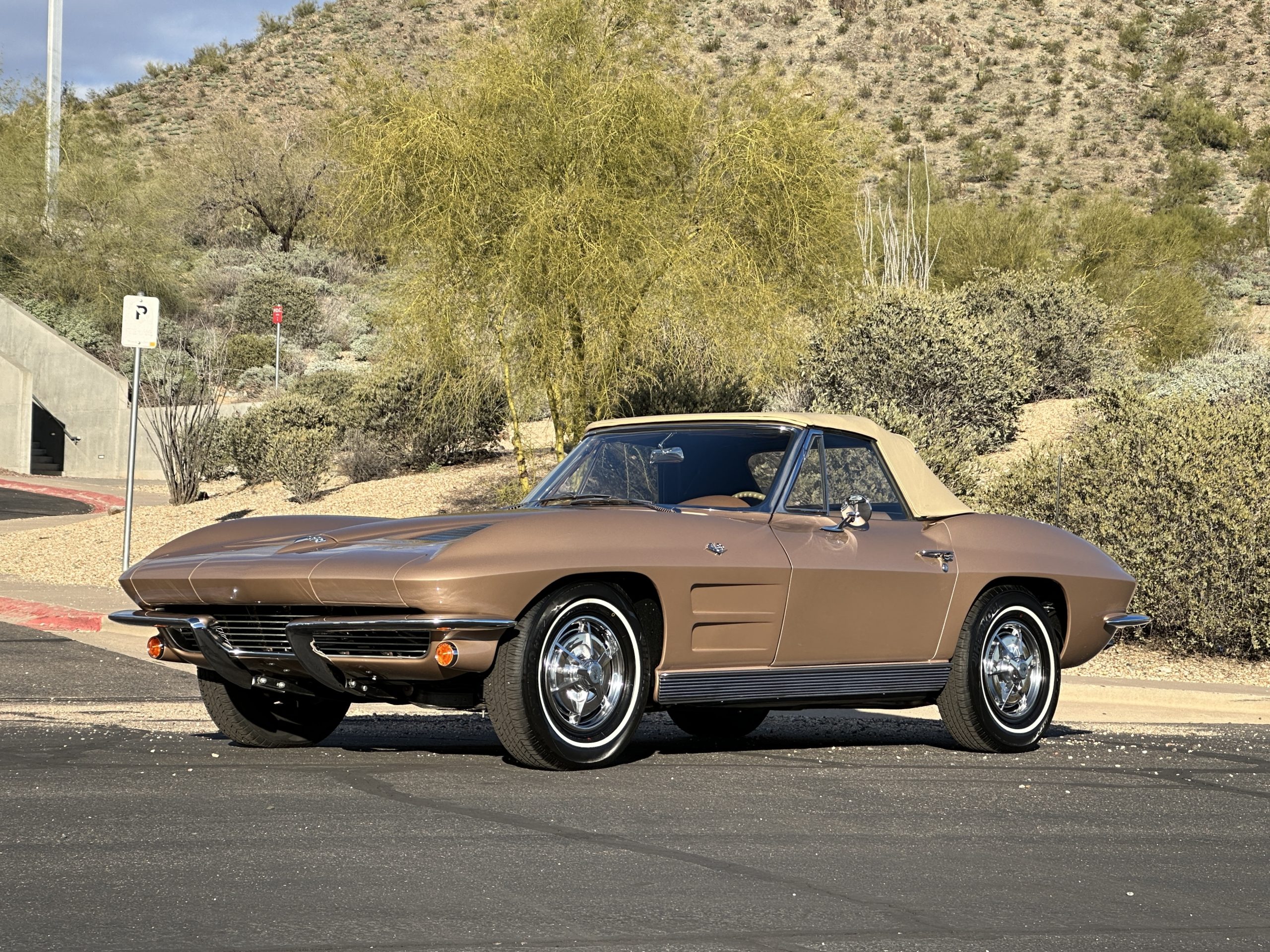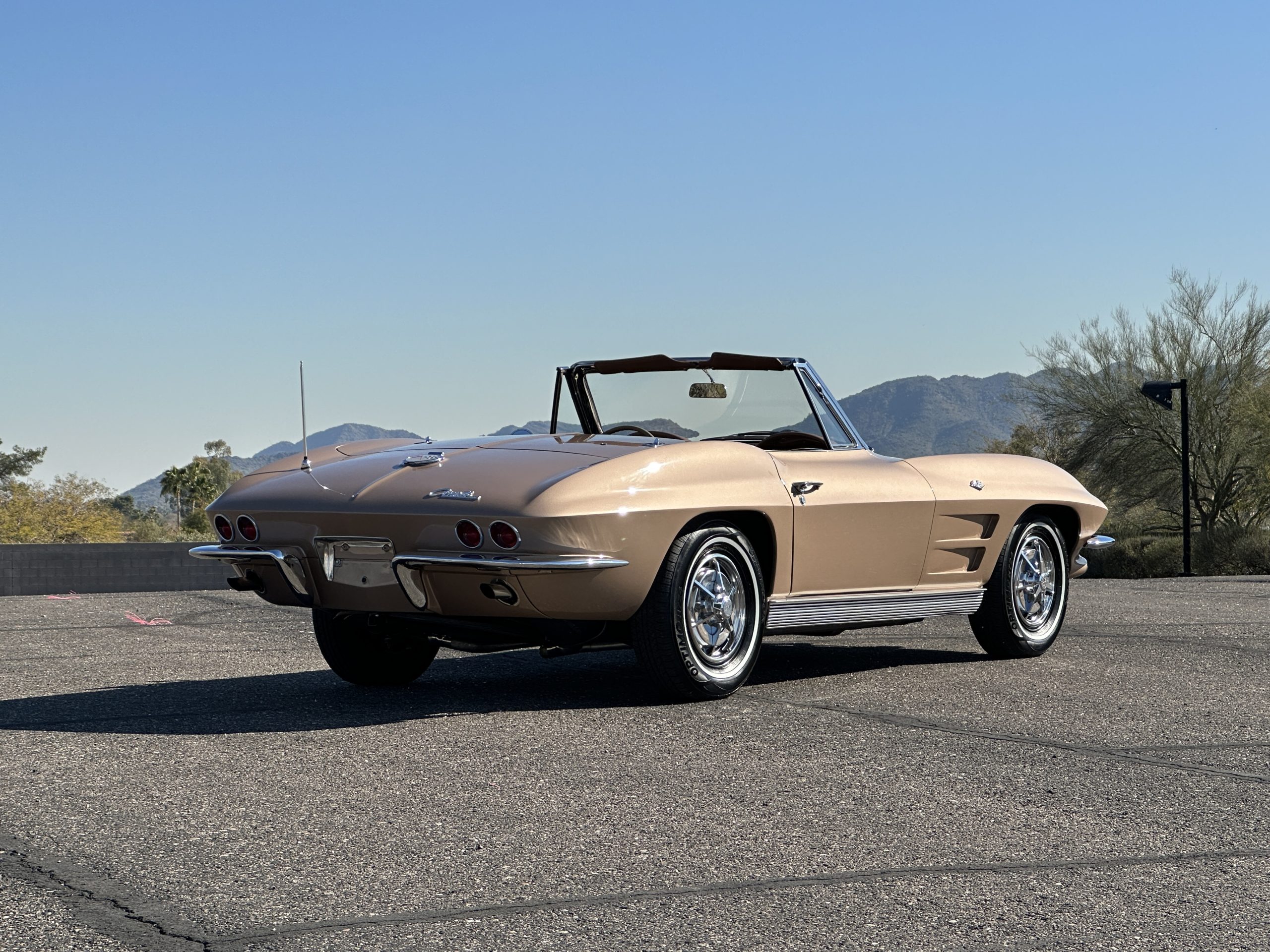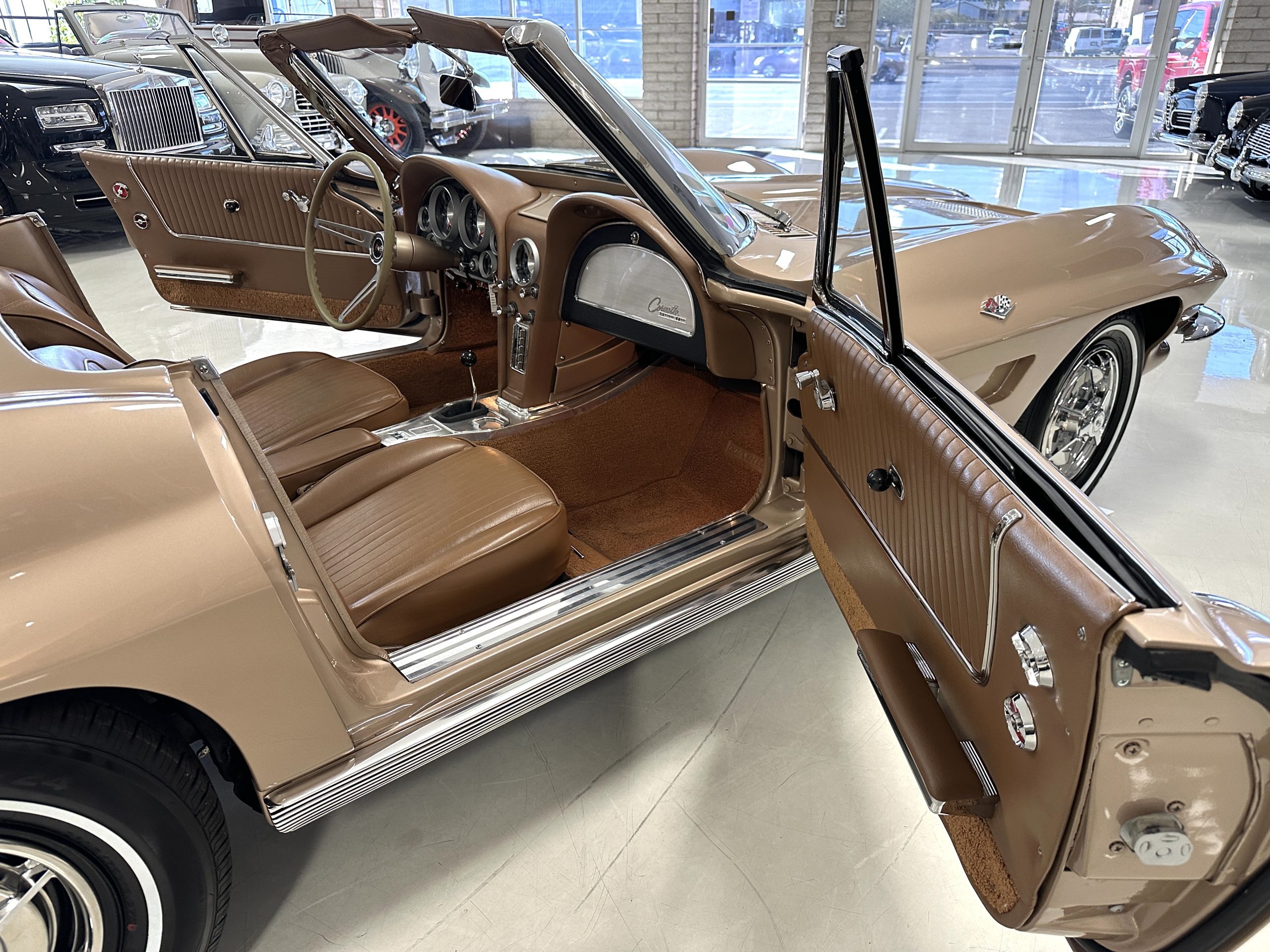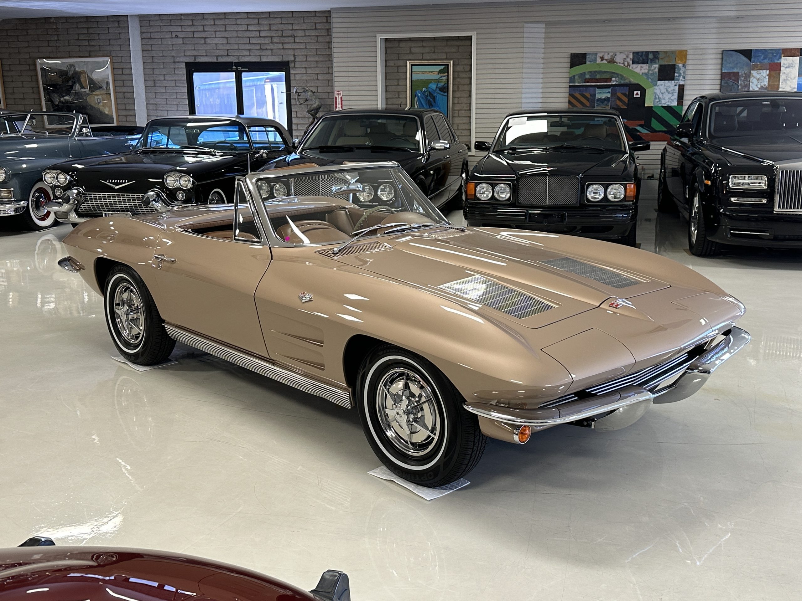 This is a beautifully restored 1963 Chevy Corvette Convertible with its matching numbers 327 cid/300 hp L75 engine that is perfect for regional shows or tours. We love the rarely seen Saddle Tan Metallic livery that is both elegant and sporty. She is well optioned with its factory matching hardtop, power windows, steering, brakes, and automatic transmission.
