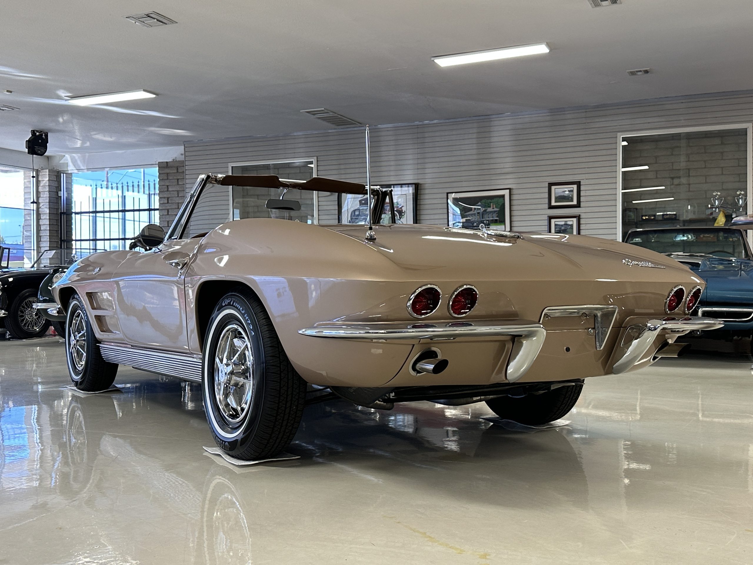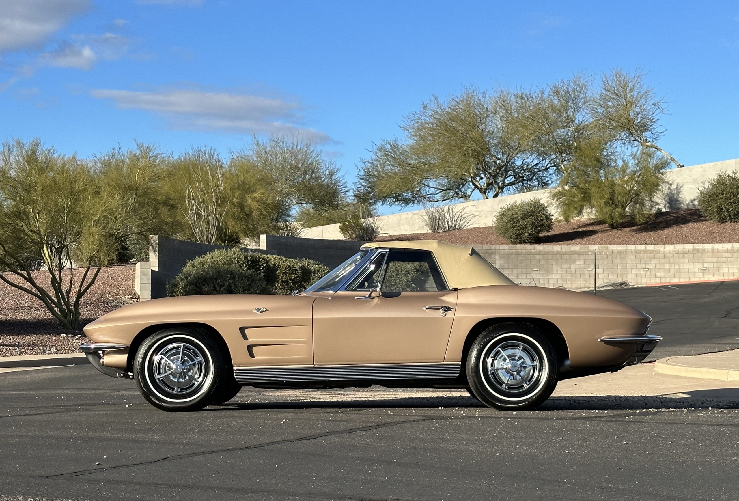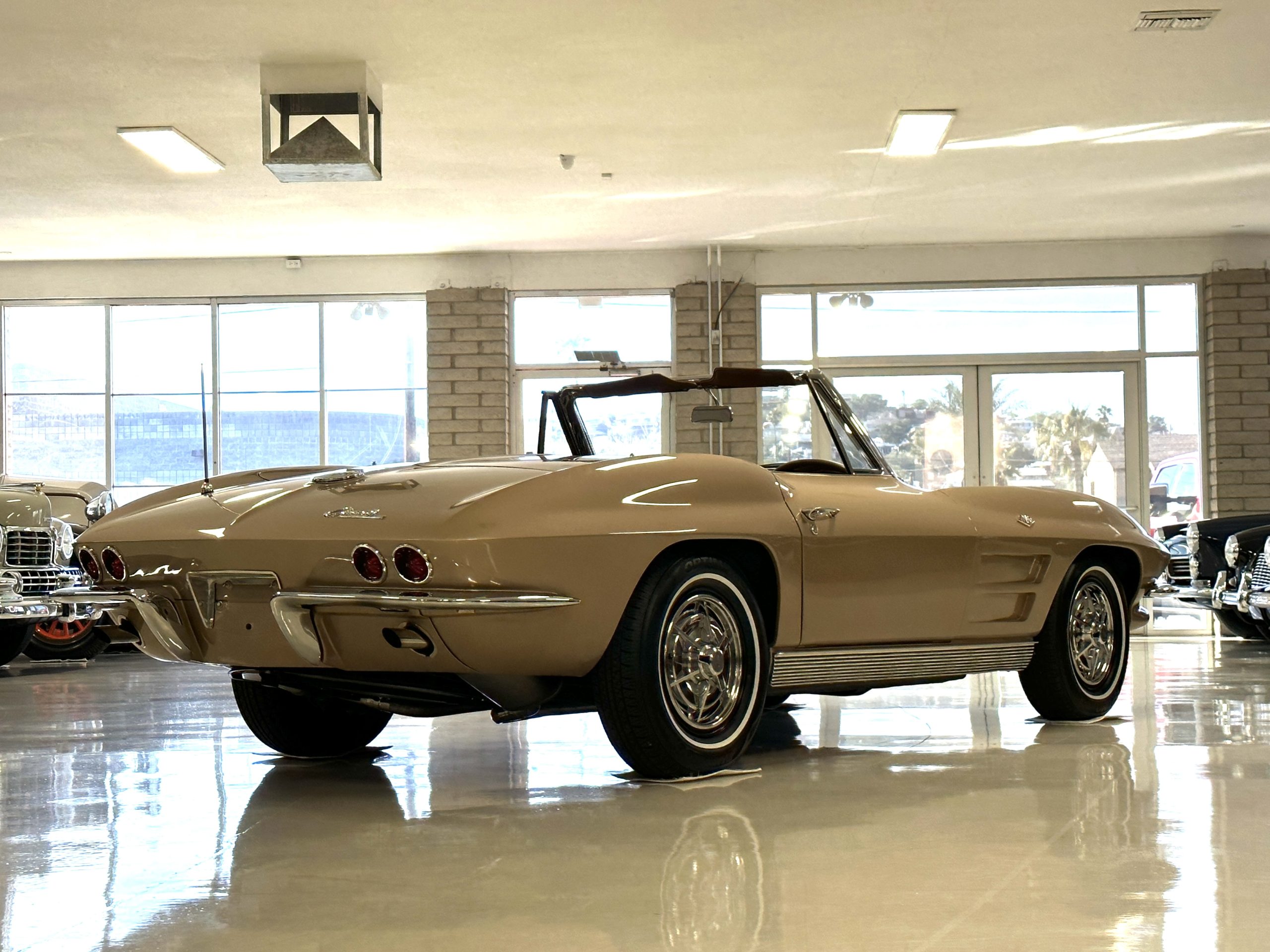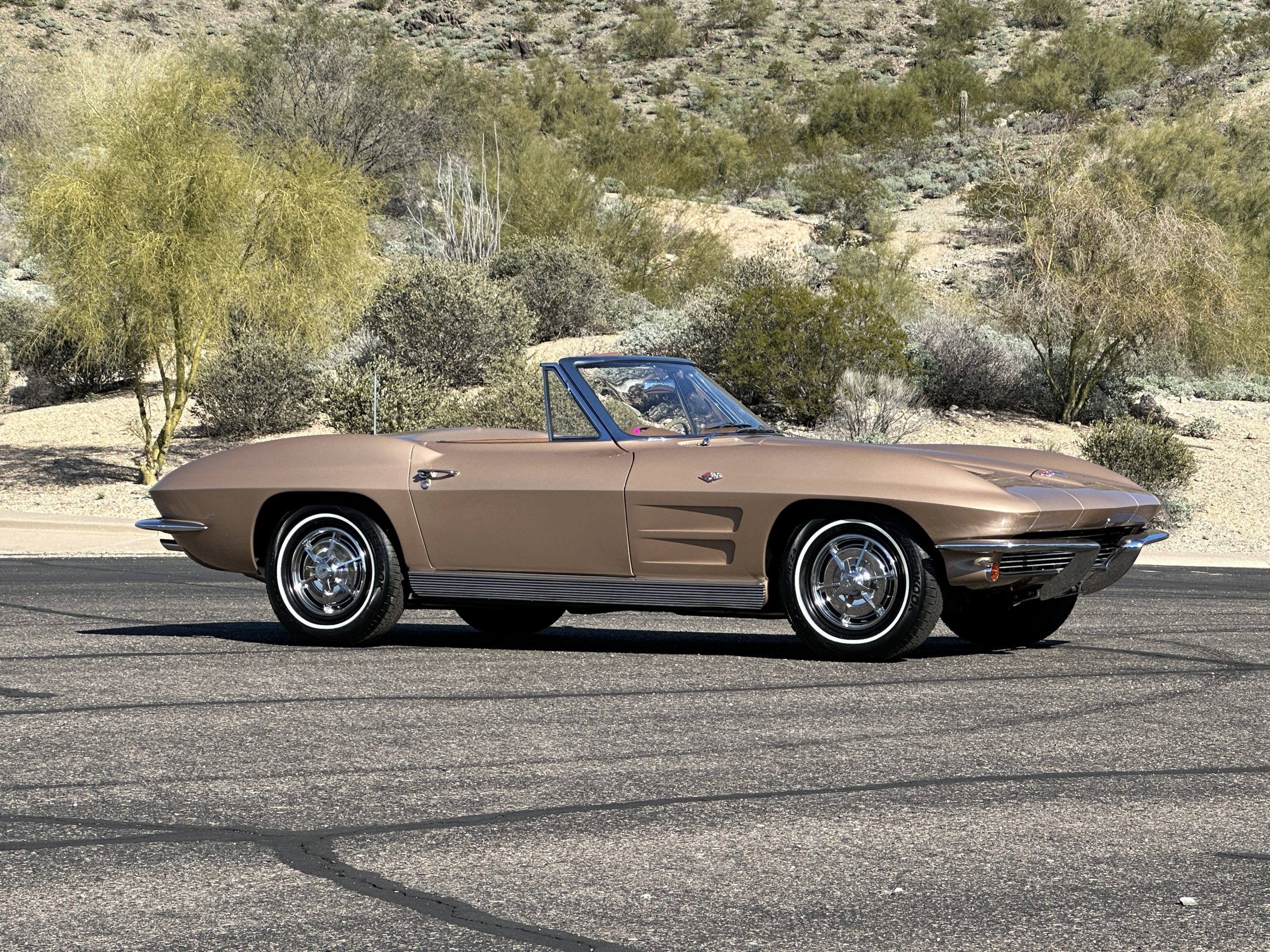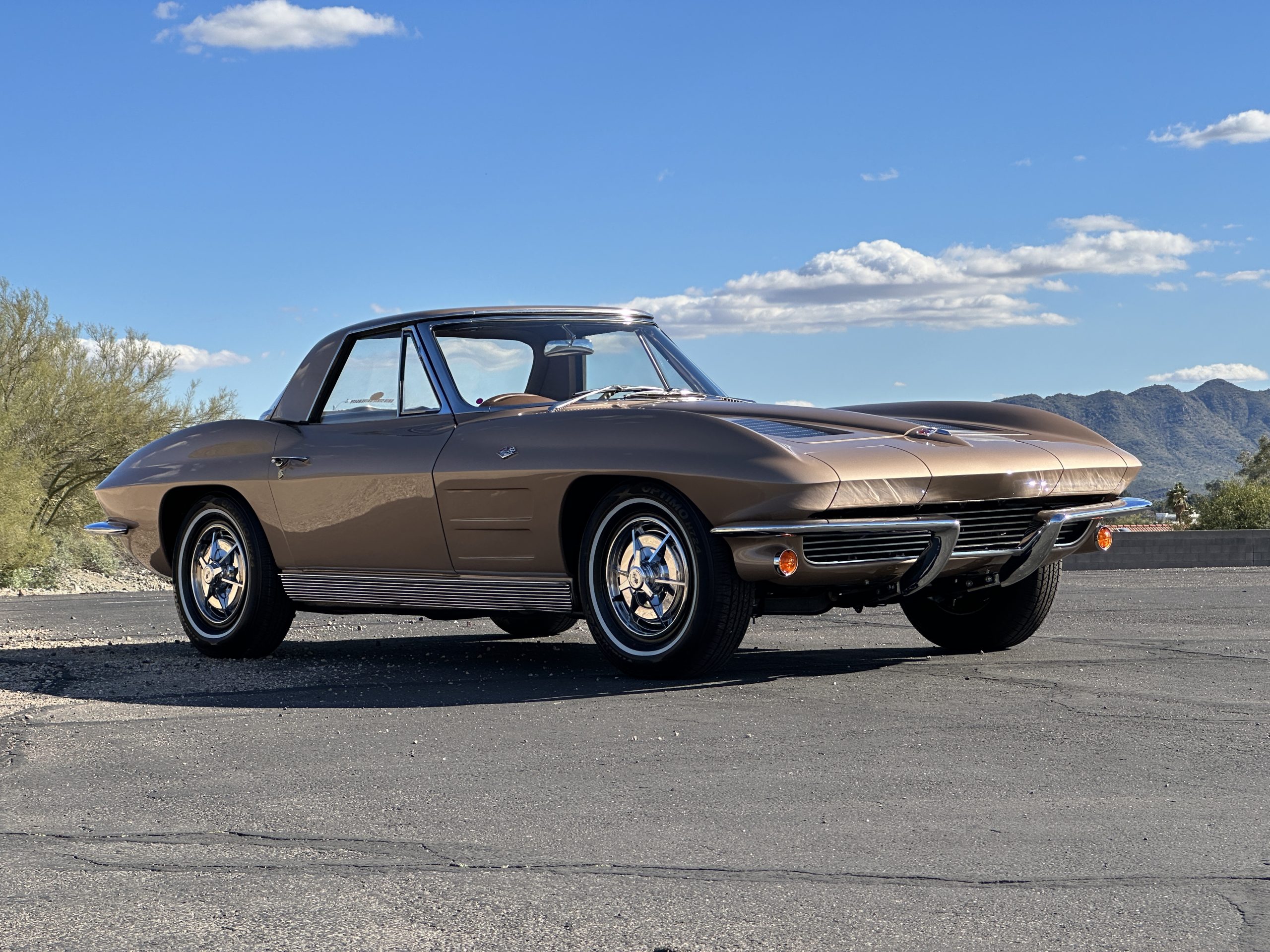 This is a beautifully restored 1963 Chevy Corvette Convertible with its matching numbers 327 cid/300 hp L75 engine that is perfect for regional shows or tours. We love the rarely seen Saddle Tan Metallic livery that is both elegant and sporty. She is well optioned with its factory matching hardtop, power windows, steering, brakes, and automatic transmission.