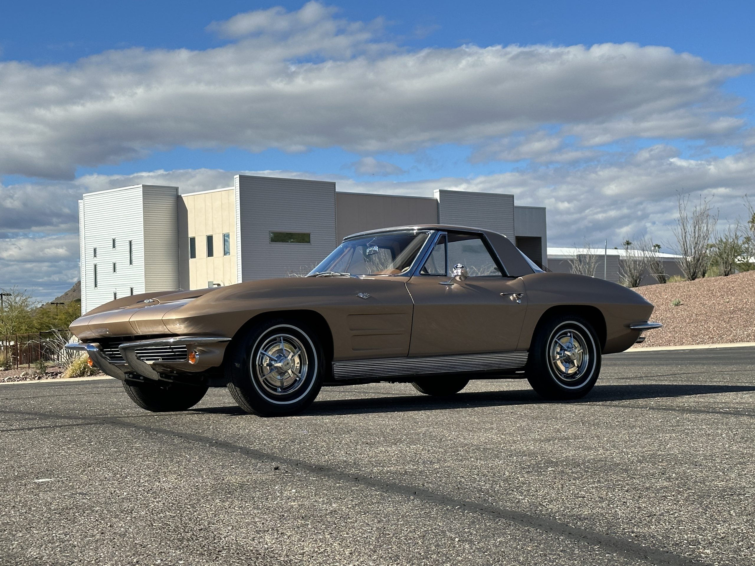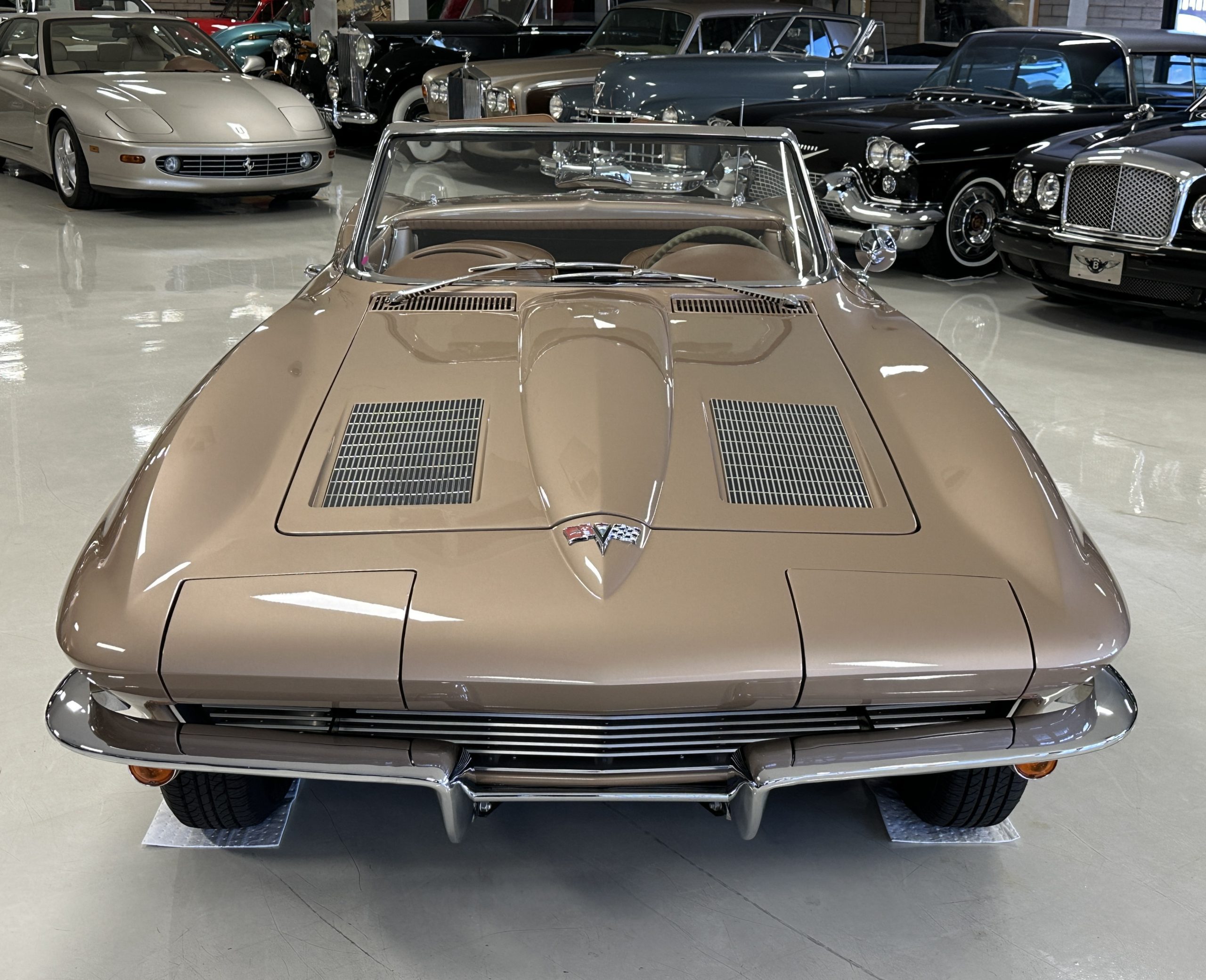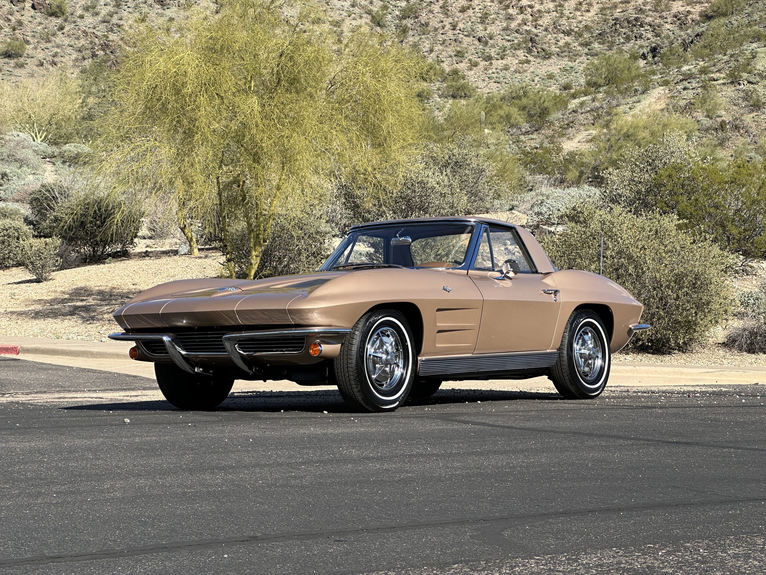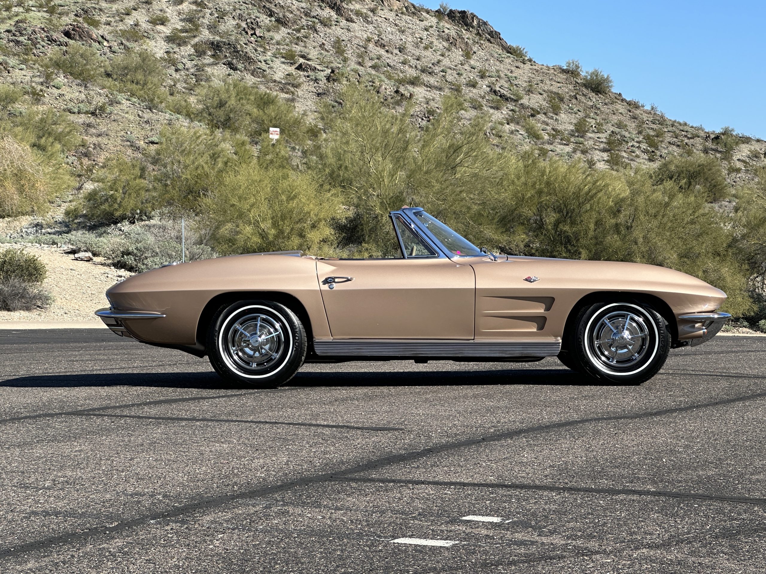 This is a beautifully restored 1963 Chevy Corvette Convertible with its matching numbers 327 cid/300 hp L75 engine that is perfect for regional shows or tours. We love the rarely seen Saddle Tan Metallic livery that is both elegant and sporty. She is well optioned with its factory matching hardtop, power windows, steering, brakes, and automatic transmission.