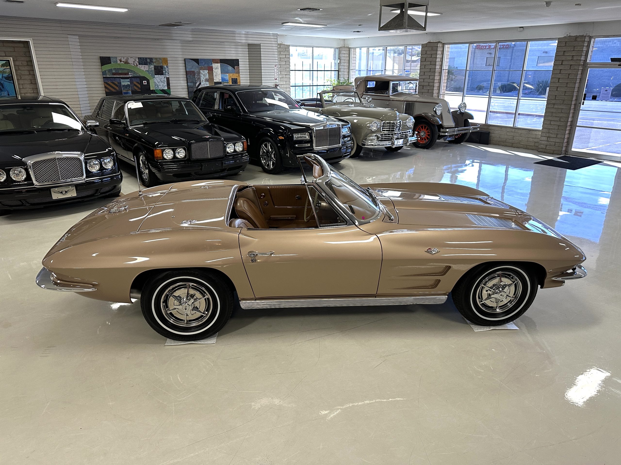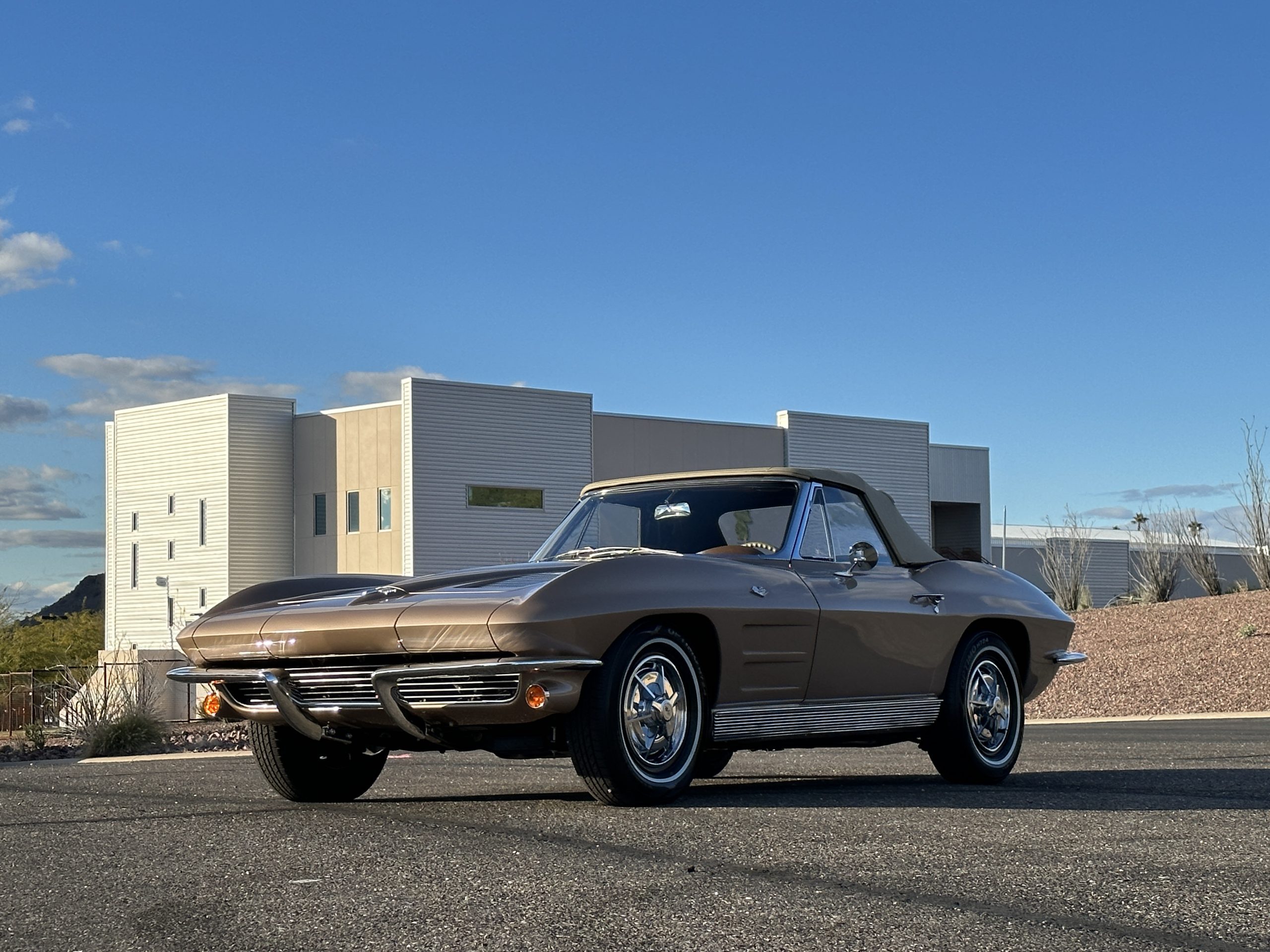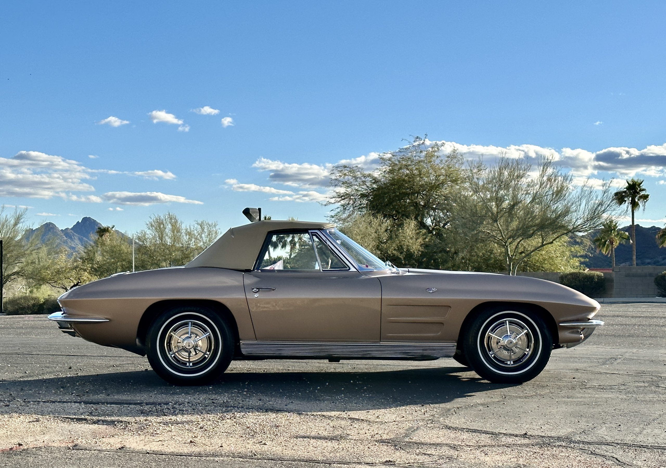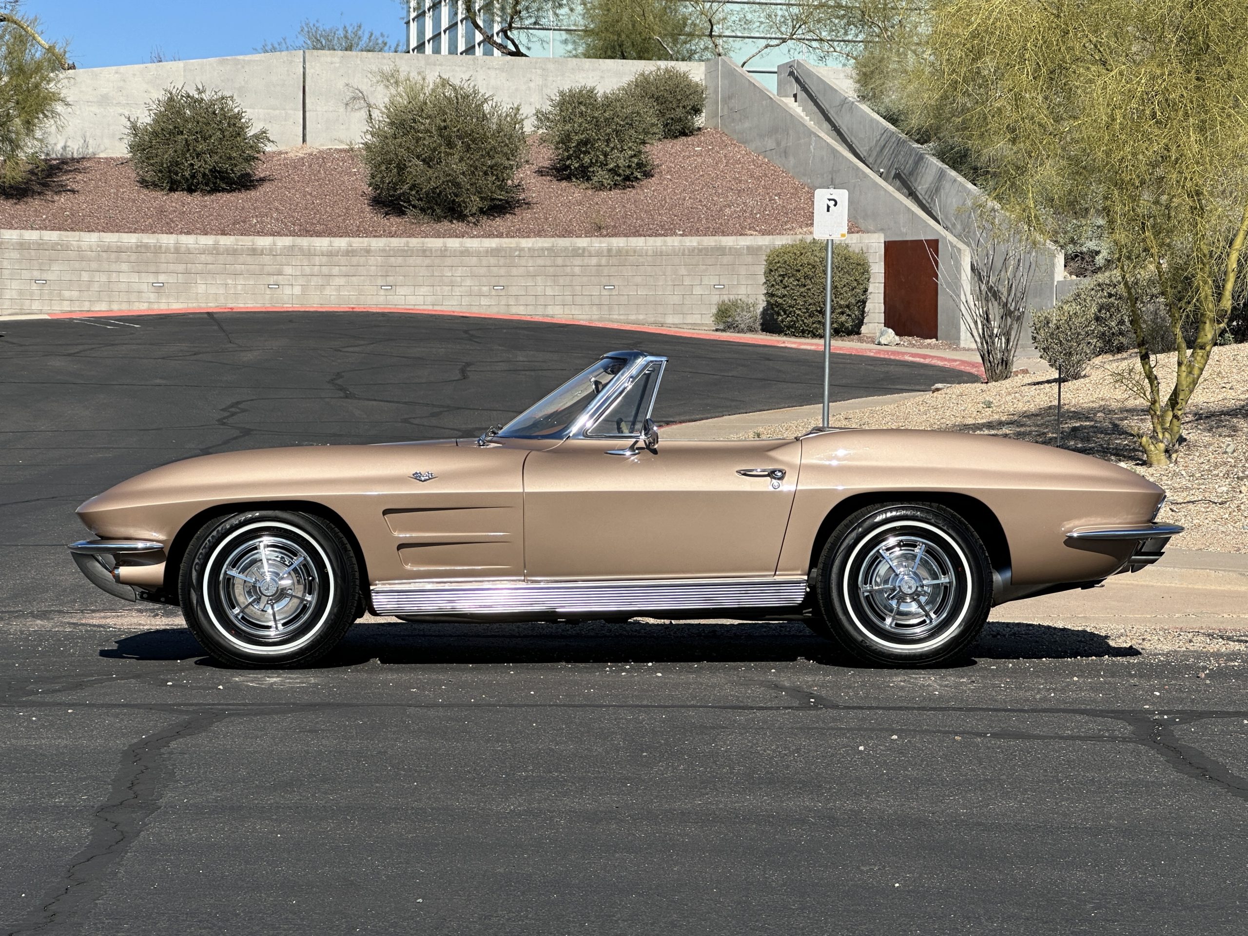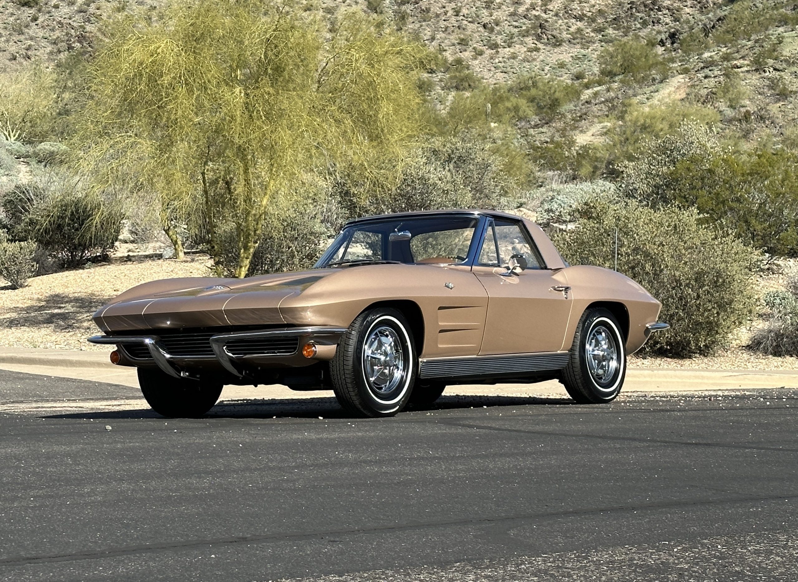 This is a beautifully restored 1963 Chevy Corvette Convertible with its matching numbers 327 cid/300 hp L75 engine that is perfect for regional shows or tours. We love the rarely seen Saddle Tan Metallic livery that is both elegant and sporty. She is well optioned with its factory matching hardtop, power windows, steering, brakes, and automatic transmission.