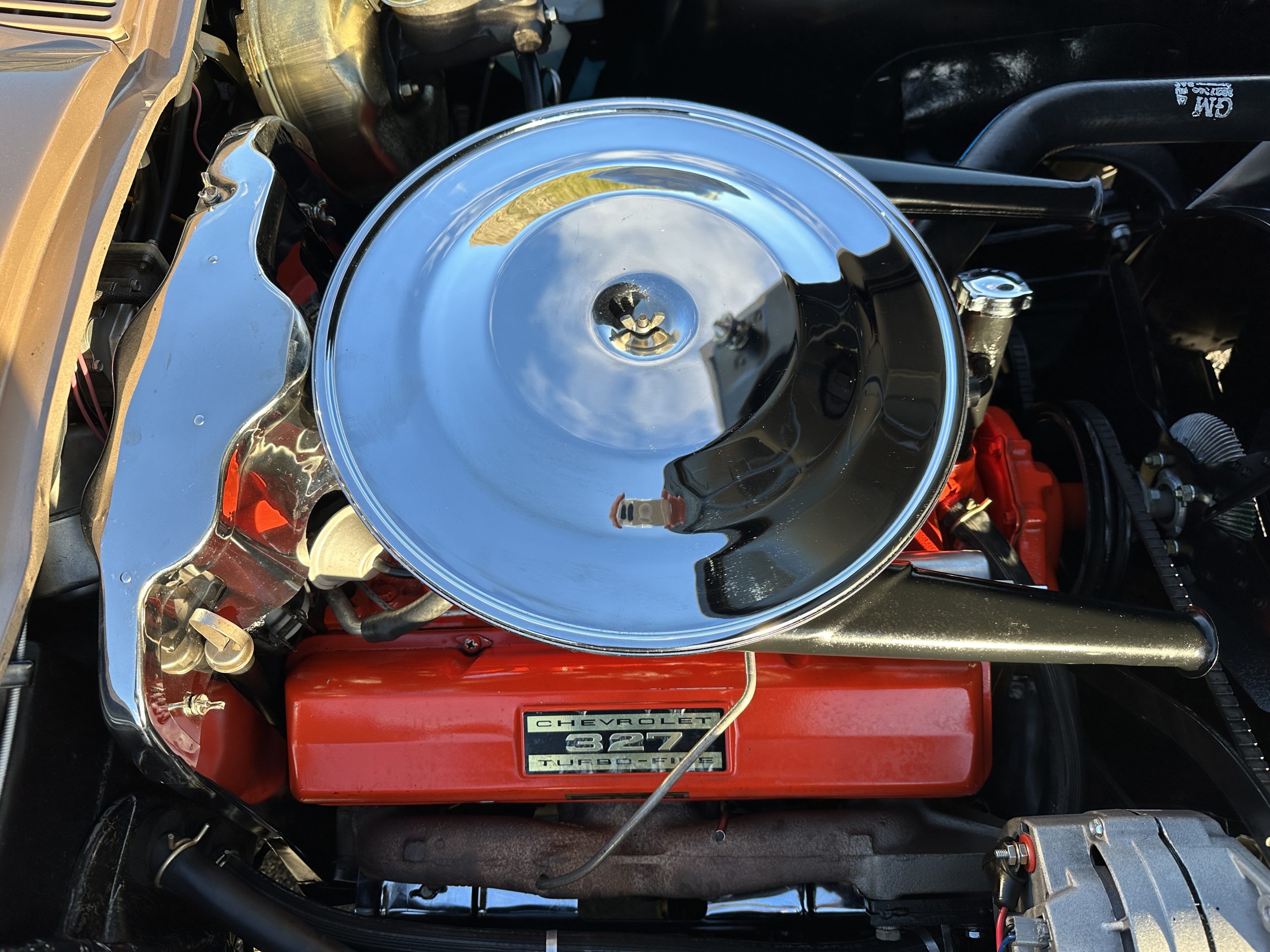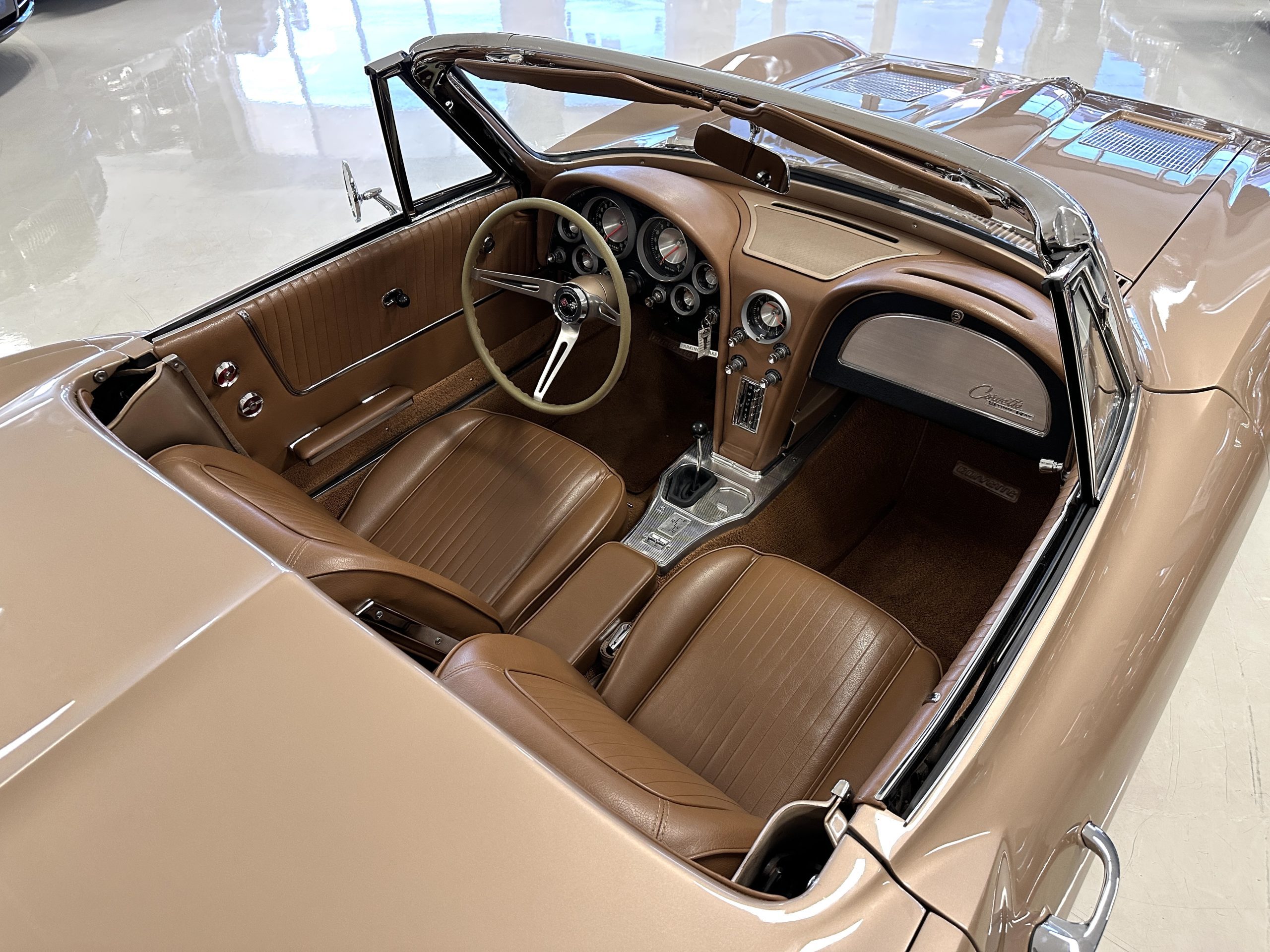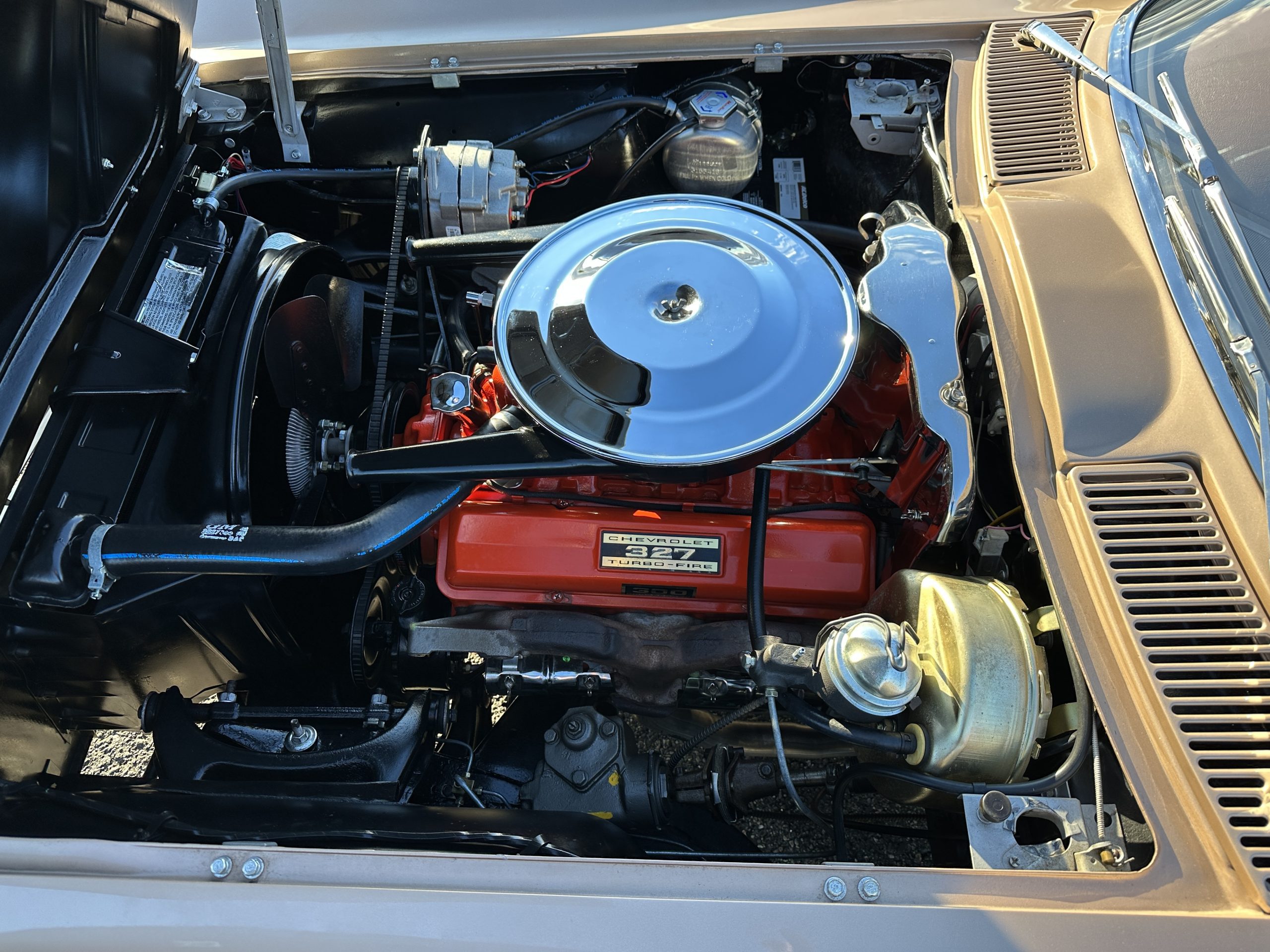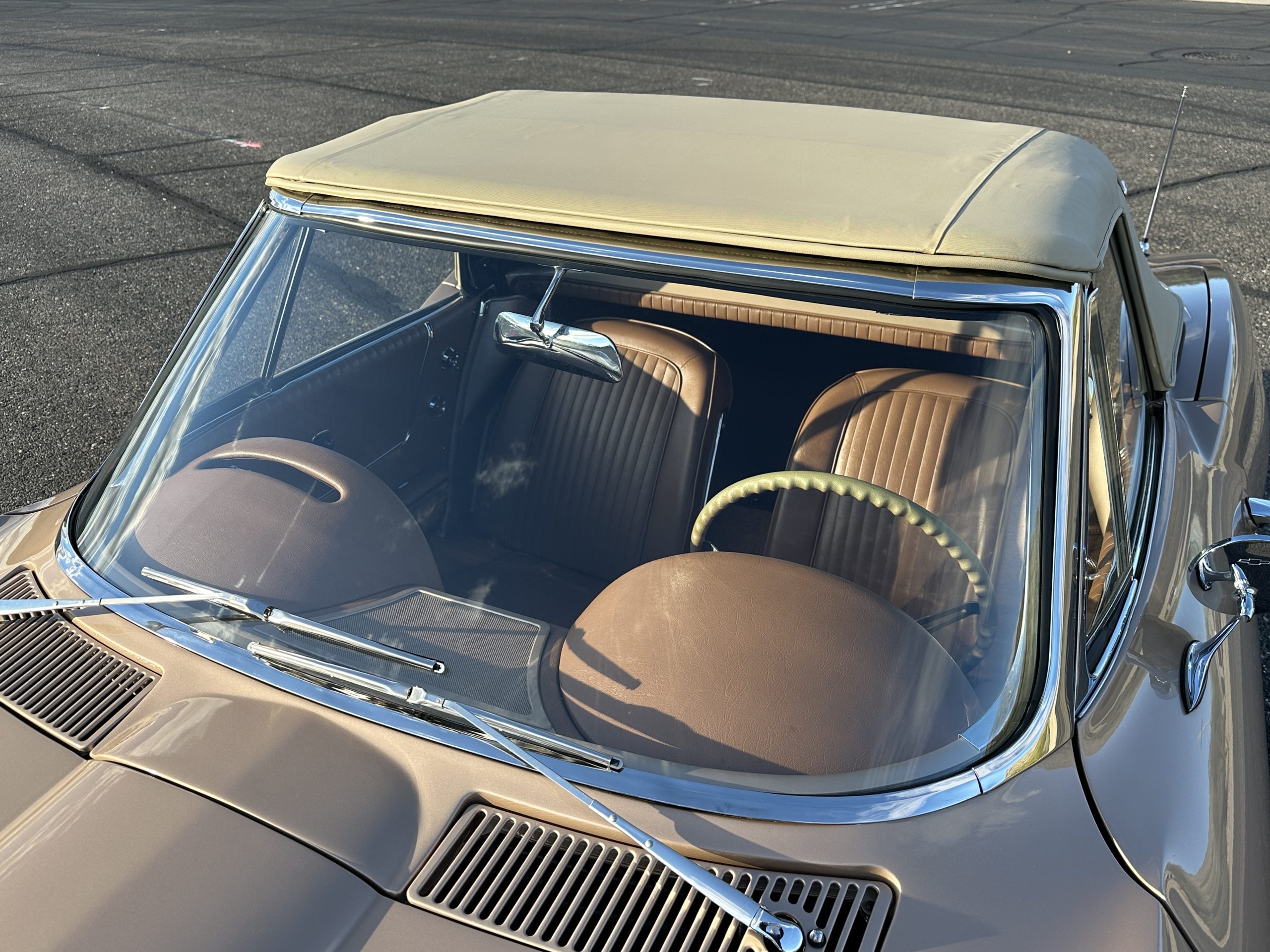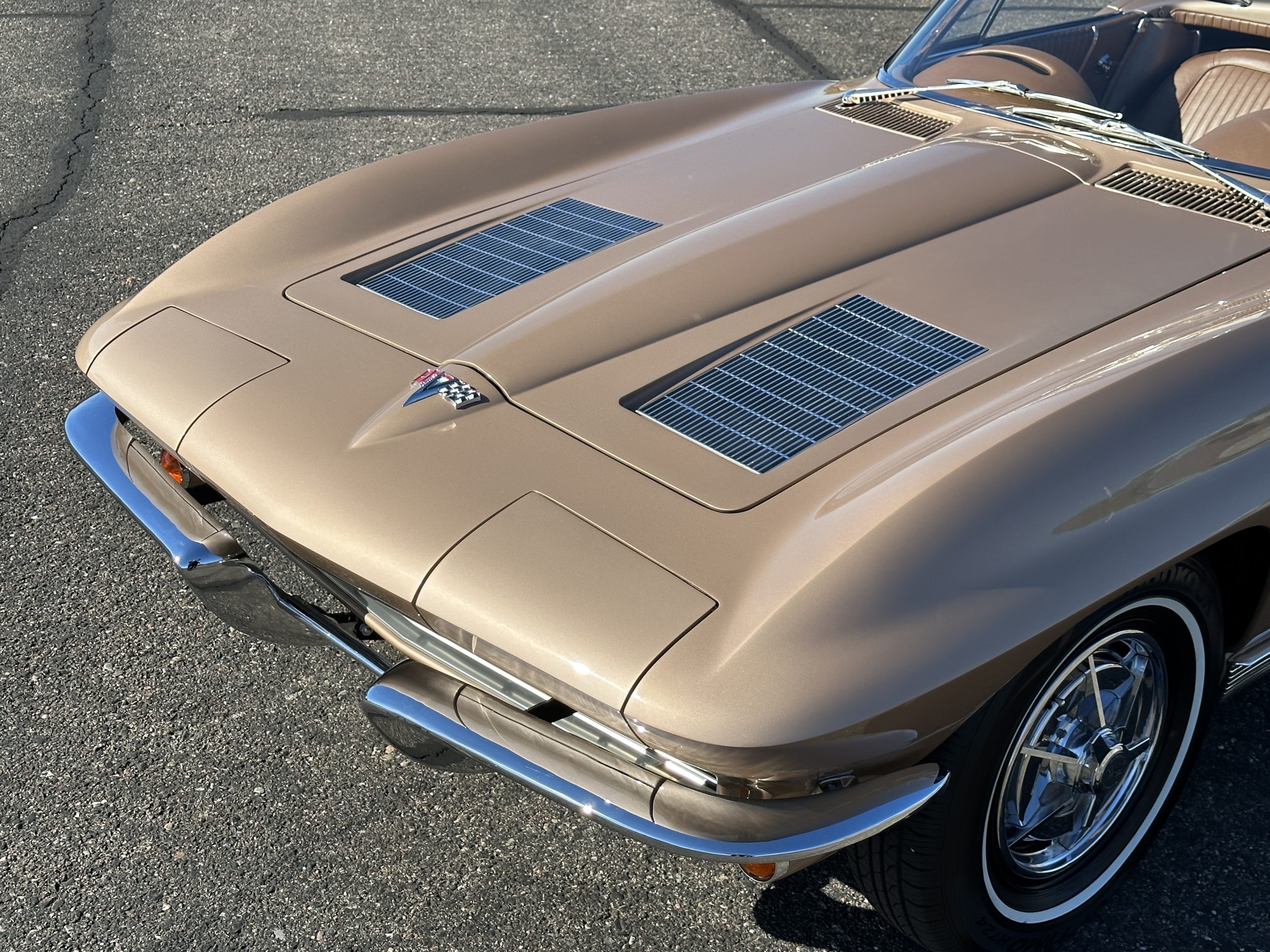The Saddle Tan Metallic livery (Paint Code 932-A) is gorgeous and has a uniquely elegant presence. The paint has excellent shine and luster and is in beautiful condition today. The Saddle Tan paint is its original and correct factory color. The matching factory hard top is also in overall excellent condition. The correct beige vinyl soft top is new and in excellent condition. This Corvette looks excellent with the tops off as well as with its soft or hard top. All of the chrome and stainless-steel trim have been restored and show very well. The “knock-off style” hubcaps and Hankook radial tires are in excellent condition.