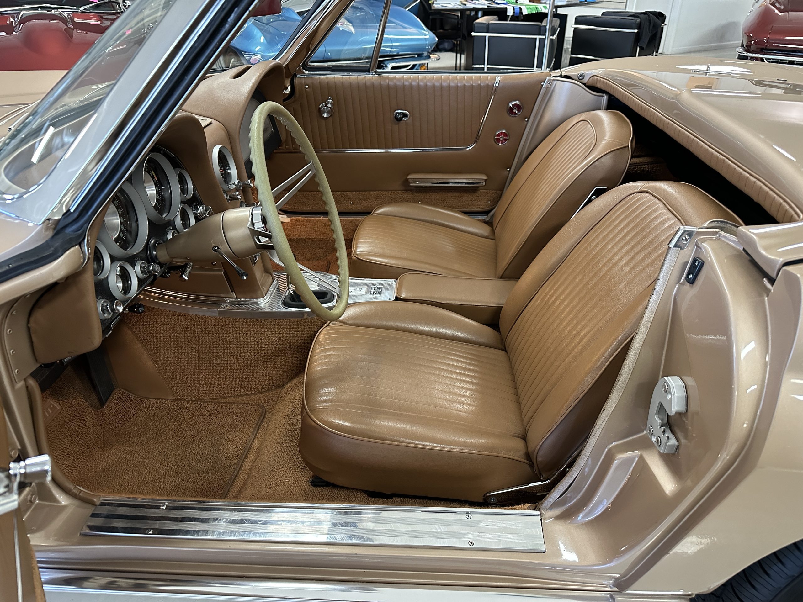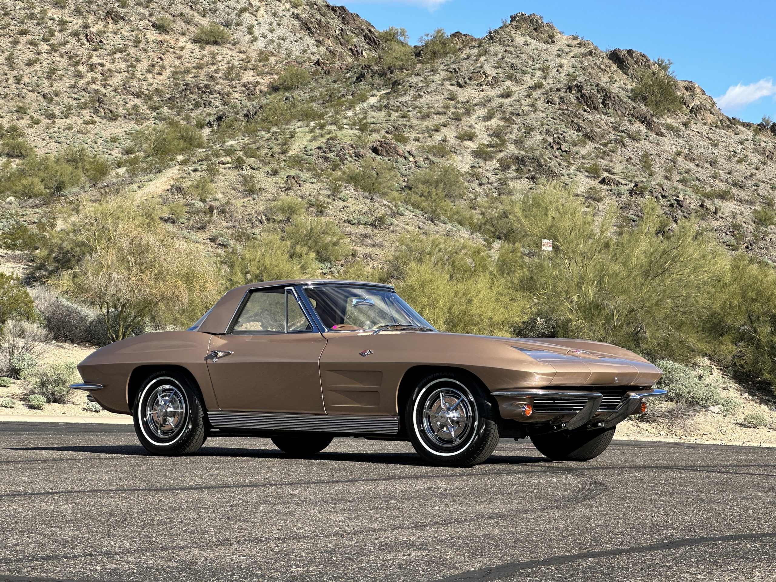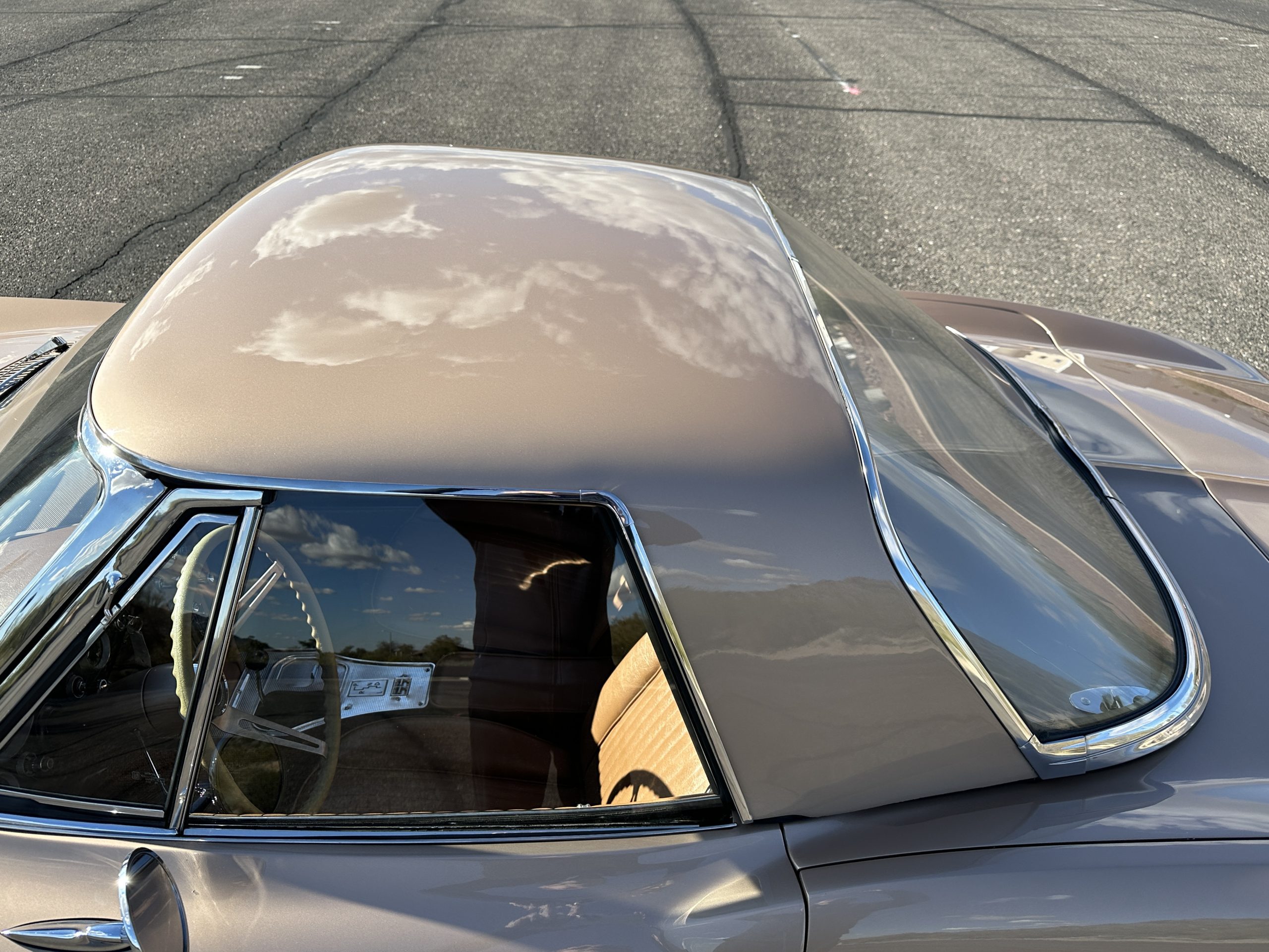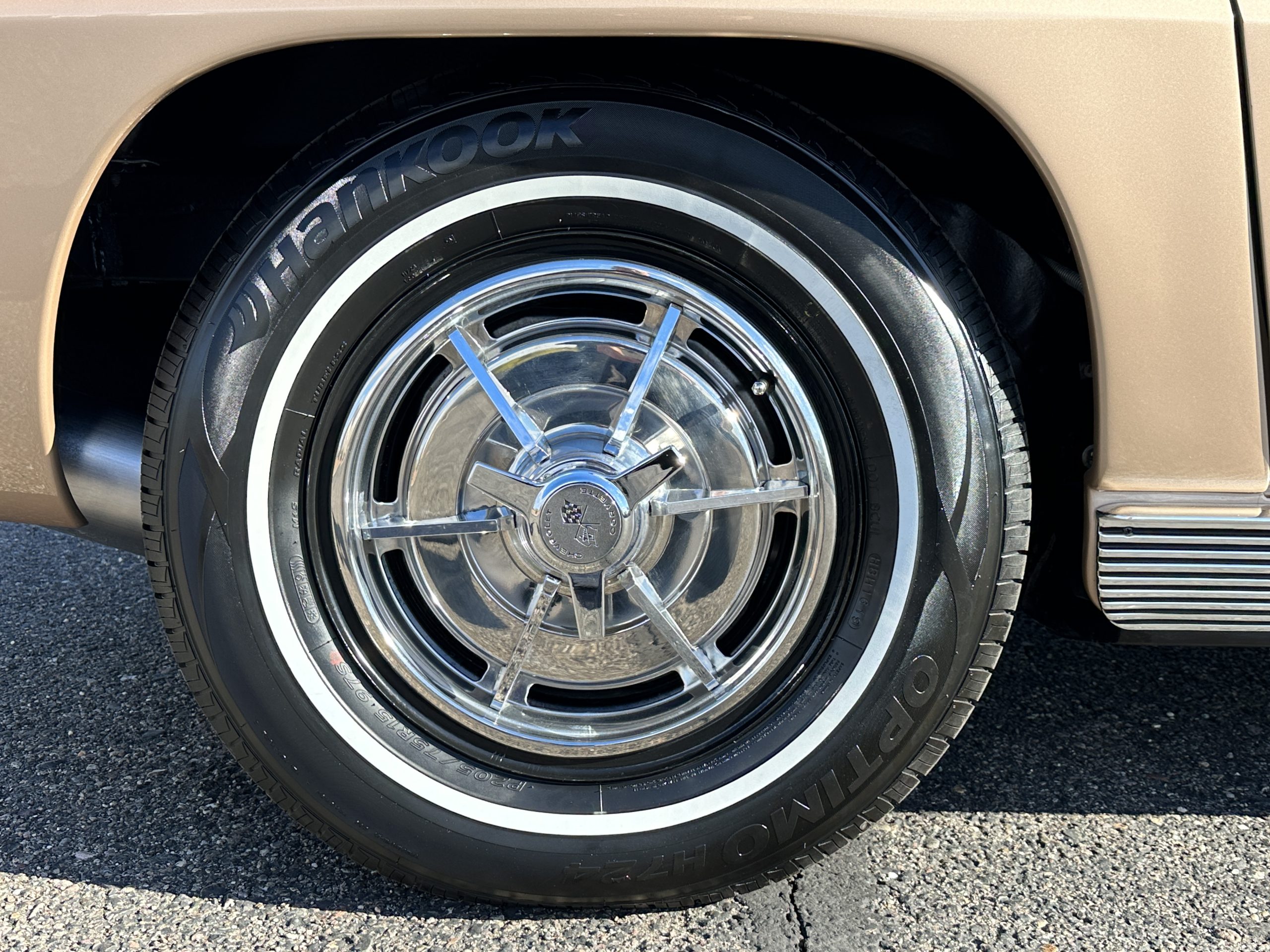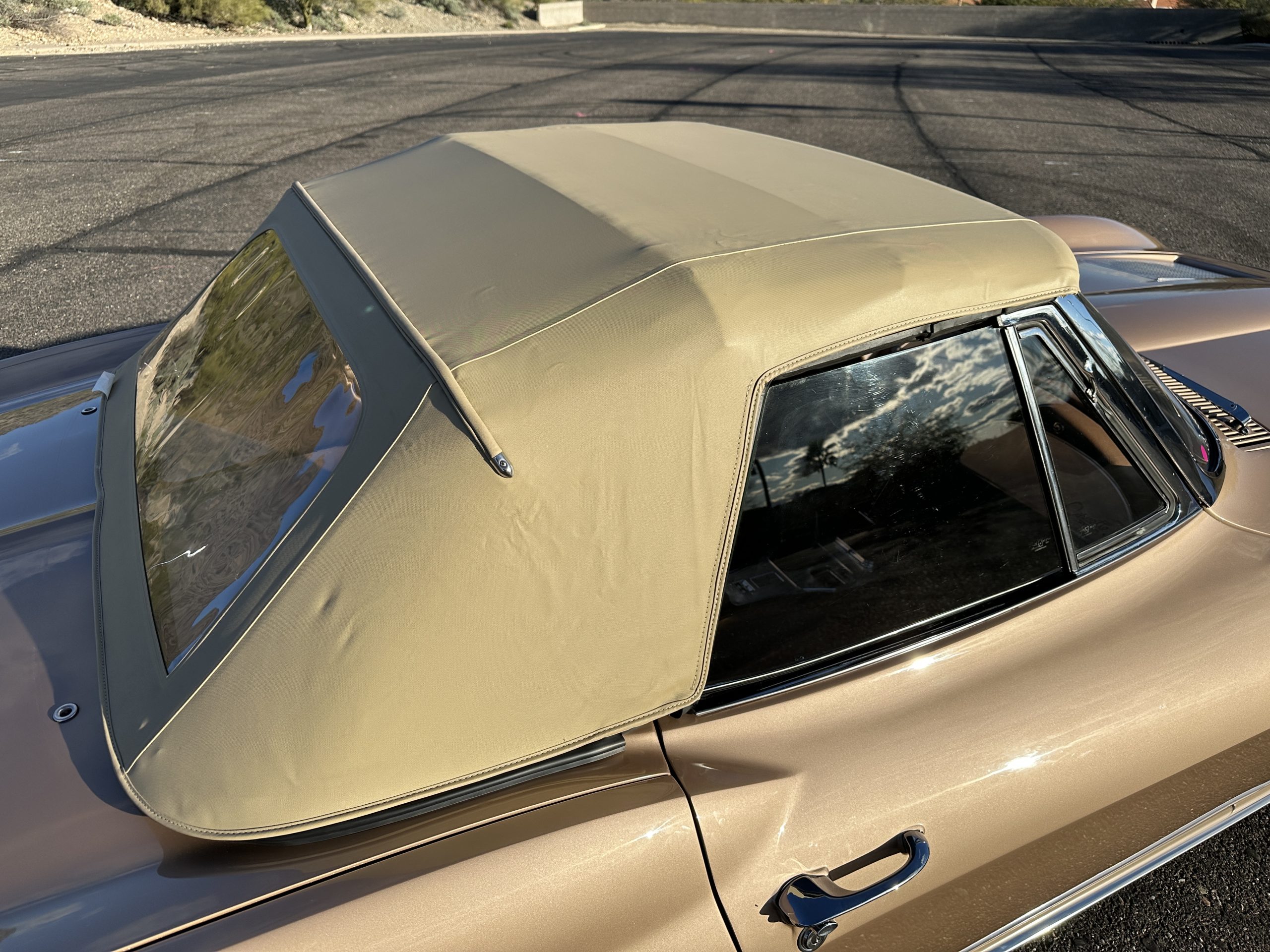The Saddle Tan Metallic livery (Paint Code 932-A) is gorgeous and has a uniquely elegant presence. The paint has excellent shine and luster and is in beautiful condition today. The Saddle Tan paint is its original and correct factory color. The matching factory hard top is also in overall excellent condition. The correct beige vinyl soft top is new and in excellent condition. This Corvette looks excellent with the tops off as well as with its soft or hard top. All of the chrome and stainless-steel trim have been restored and show very well. The “knock-off style” hubcaps and Hankook radial tires are in excellent condition.