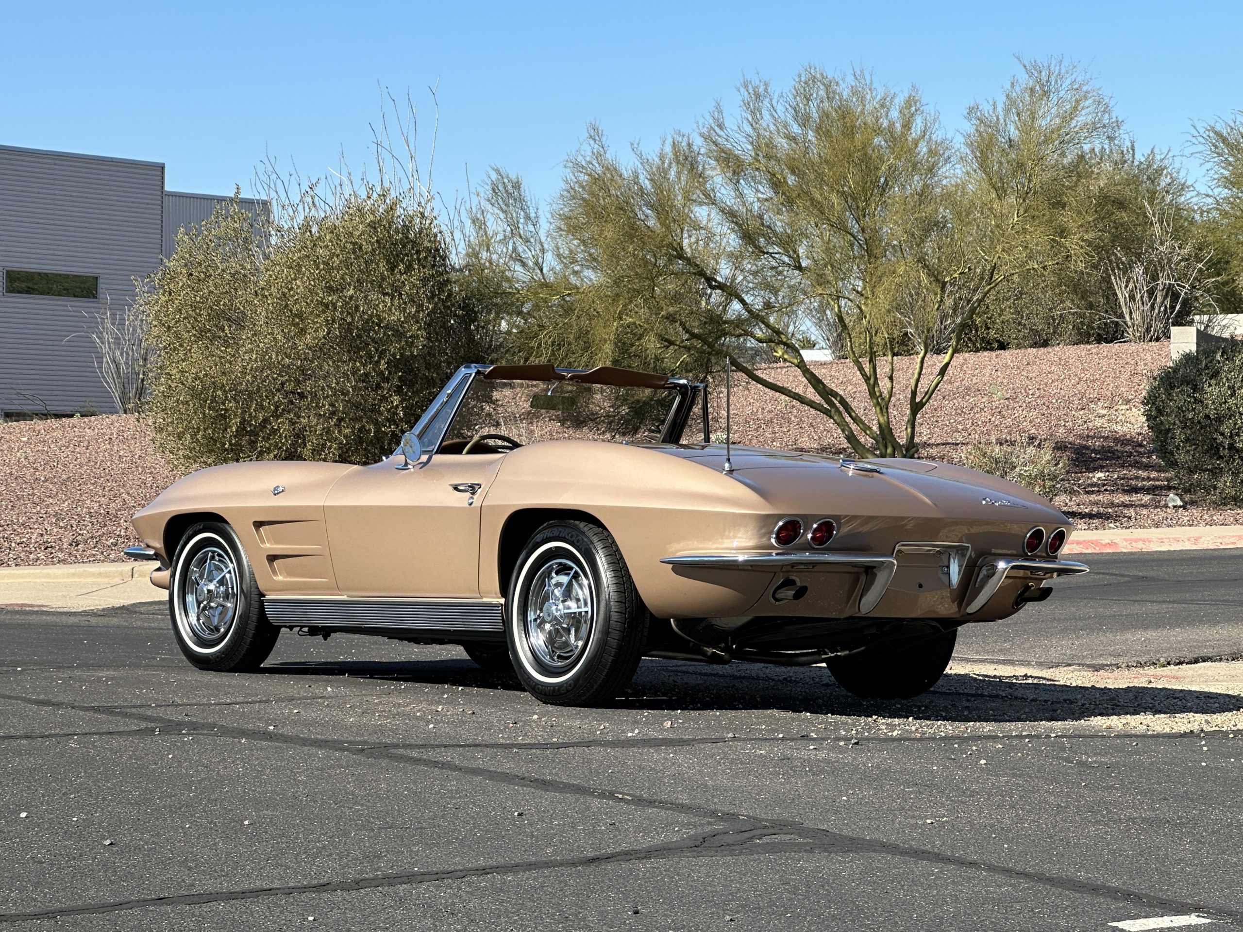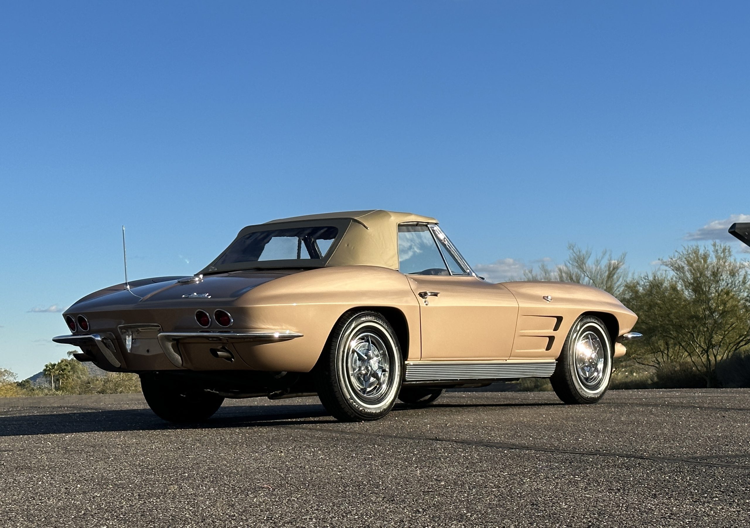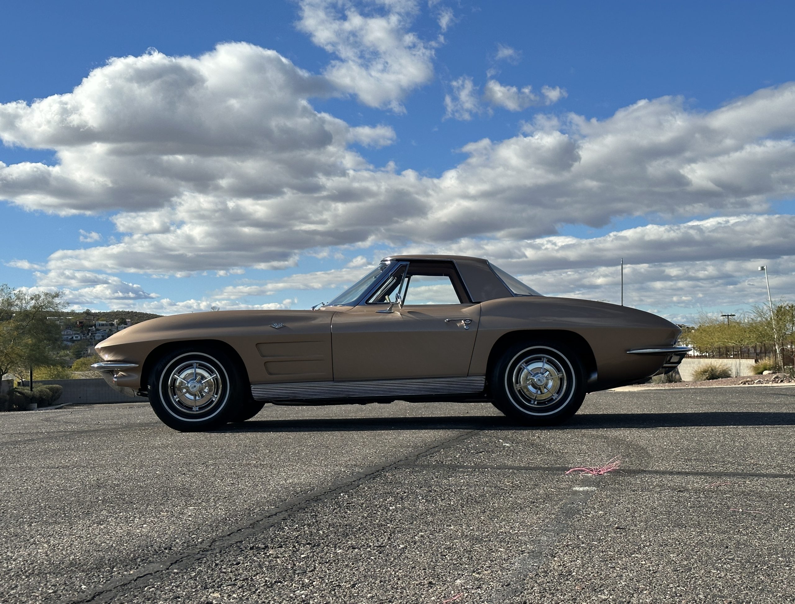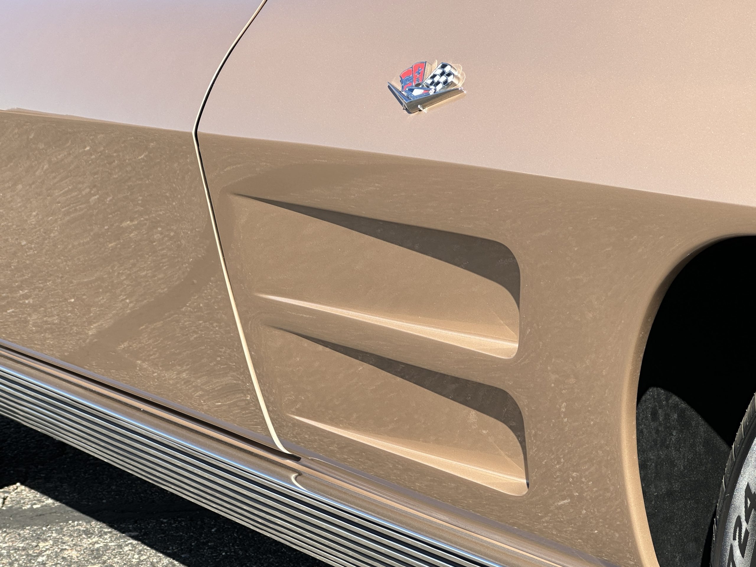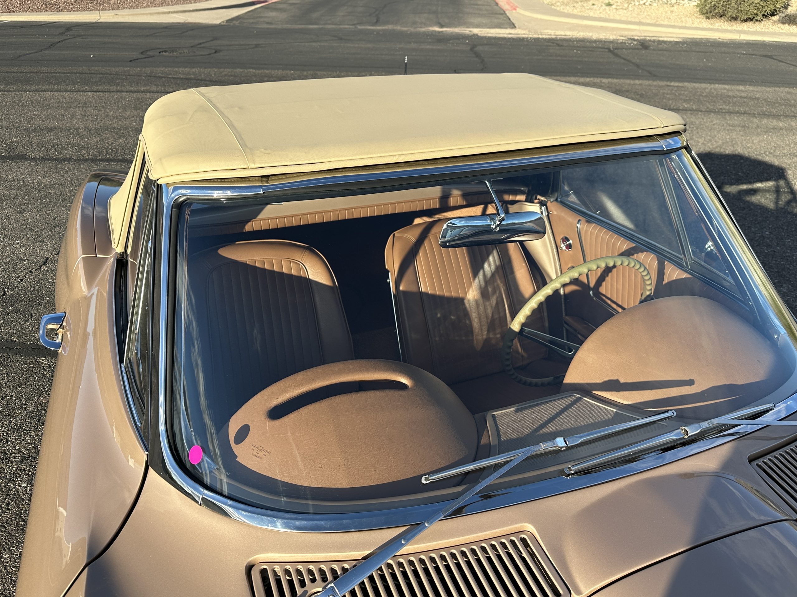 The Saddle Tan Metallic livery (Paint Code 932-A) is gorgeous and has a uniquely elegant presence. The paint has excellent shine and luster and is in beautiful condition today. The Saddle Tan paint is its original and correct factory color. The matching factory hard top is also in overall excellent condition. The correct beige vinyl soft top is new and in excellent condition. This Corvette looks excellent with the tops off as well as with its soft or hard top. All of the chrome and stainless-steel trim have been restored and show very well. The “knock-off style” hubcaps and Hankook radial tires are in excellent condition.