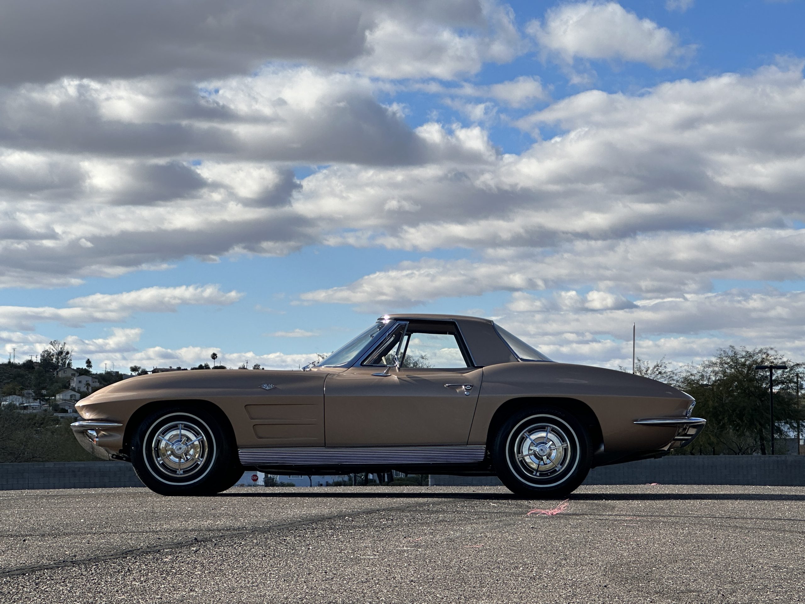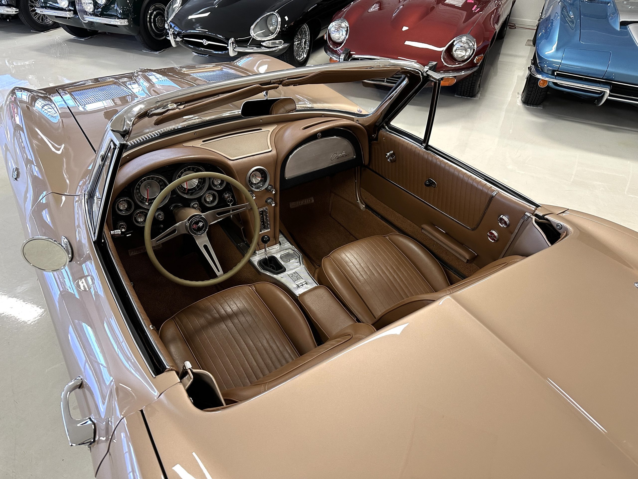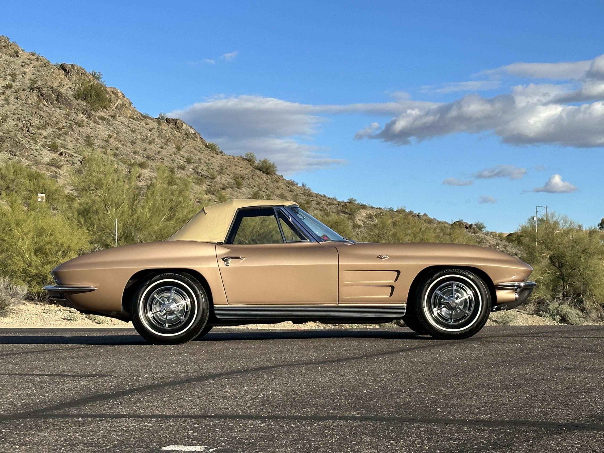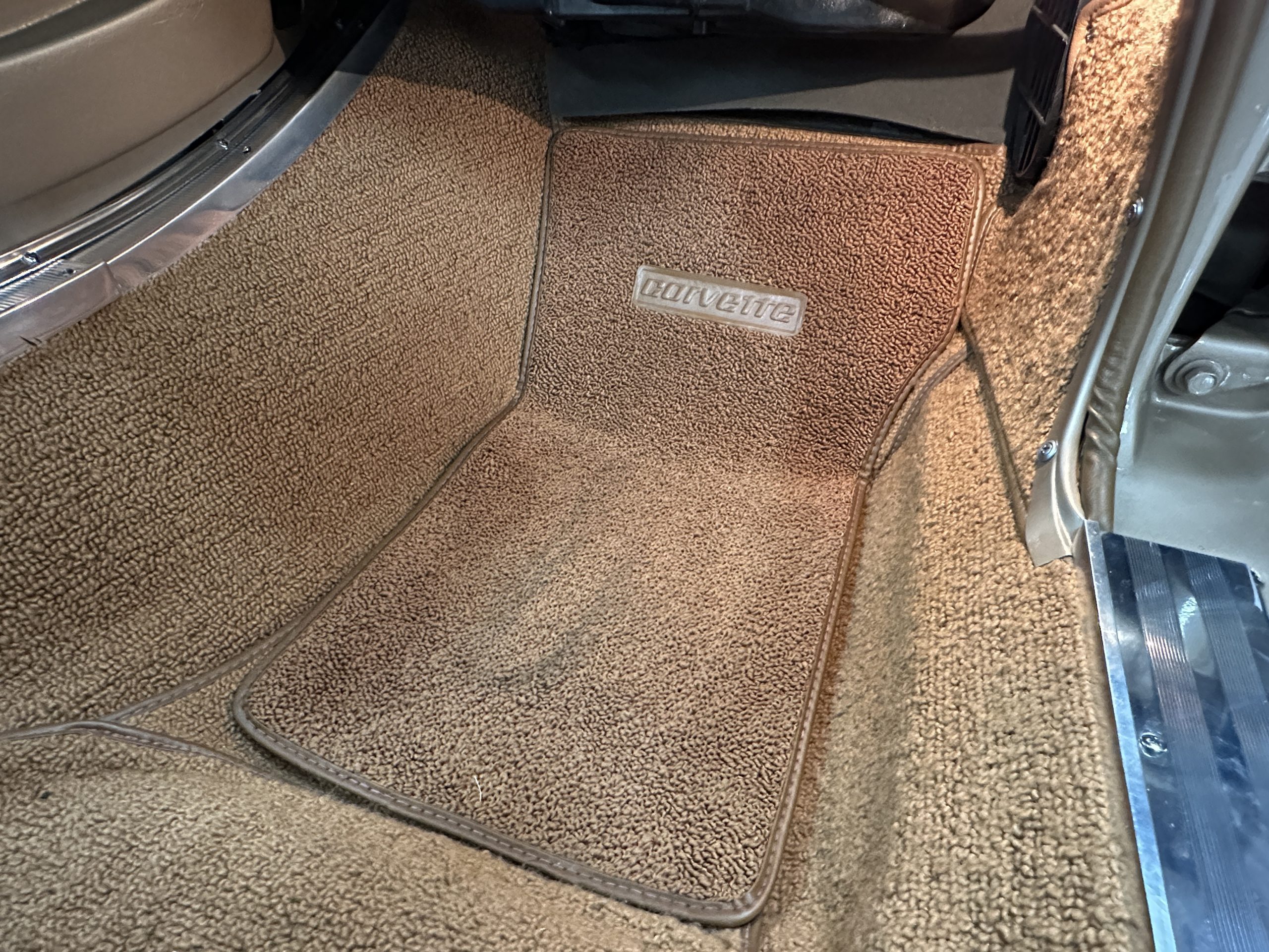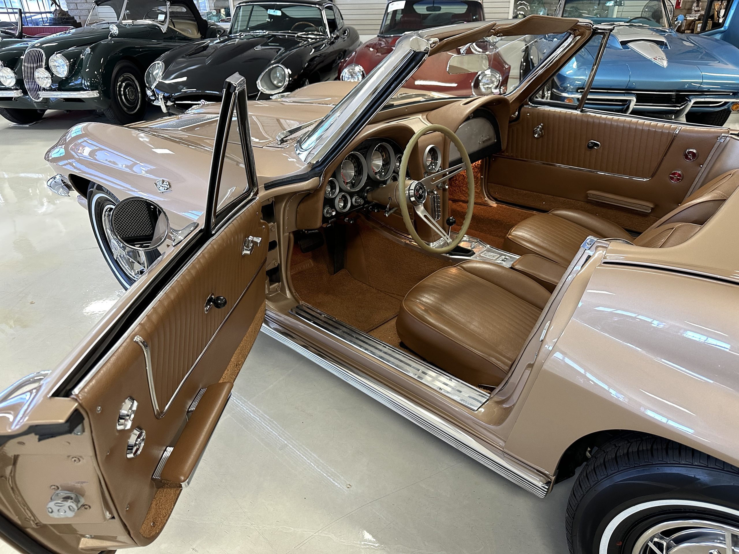 The Saddle Tan Metallic livery (Paint Code 932-A) is gorgeous and has a uniquely elegant presence. The paint has excellent shine and luster and is in beautiful condition today. The Saddle Tan paint is its original and correct factory color. The matching factory hard top is also in overall excellent condition. The correct beige vinyl soft top is new and in excellent condition. This Corvette looks excellent with the tops off as well as with its soft or hard top. All of the chrome and stainless-steel trim have been restored and show very well. The “knock-off style” hubcaps and Hankook radial tires are in excellent condition.