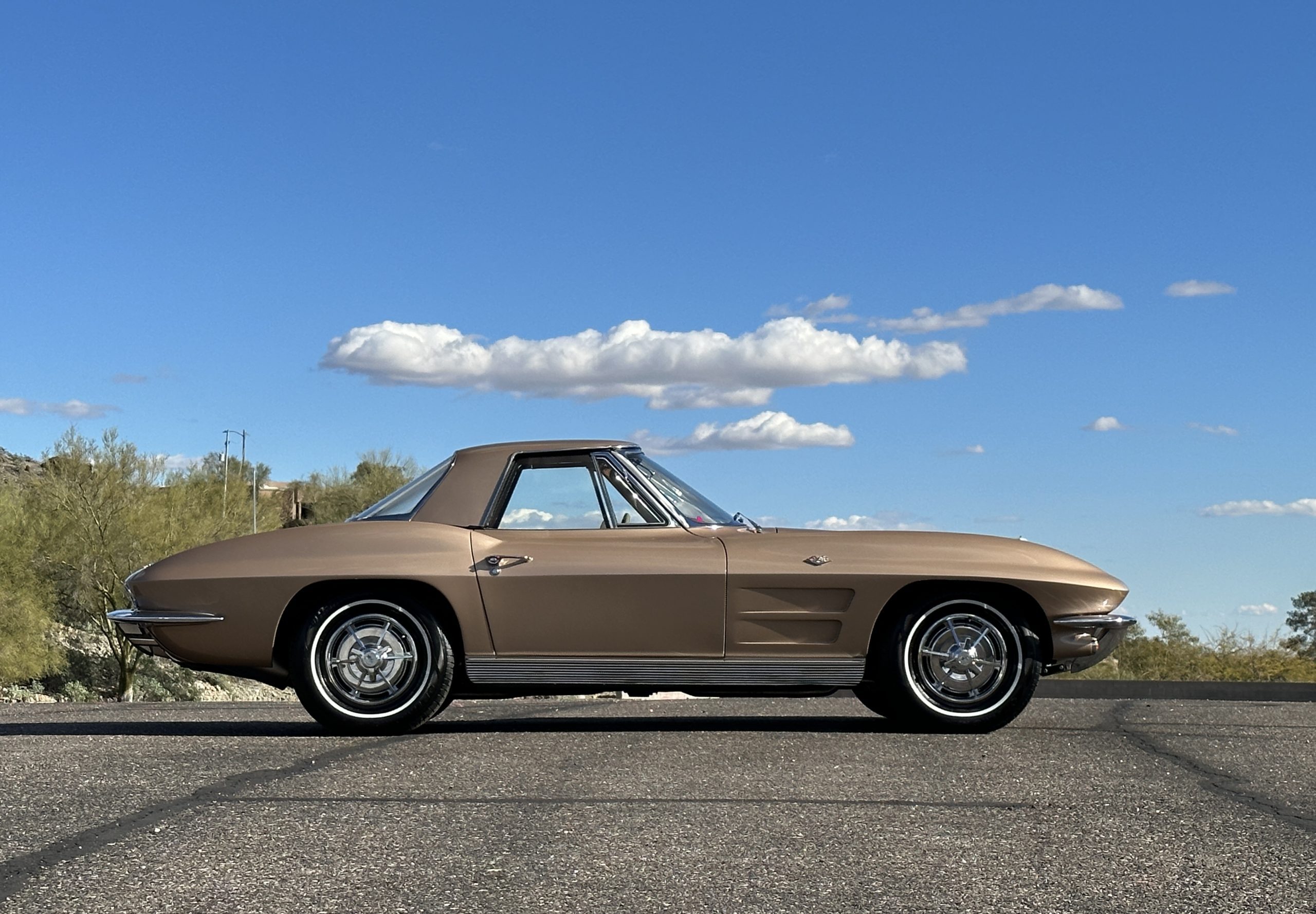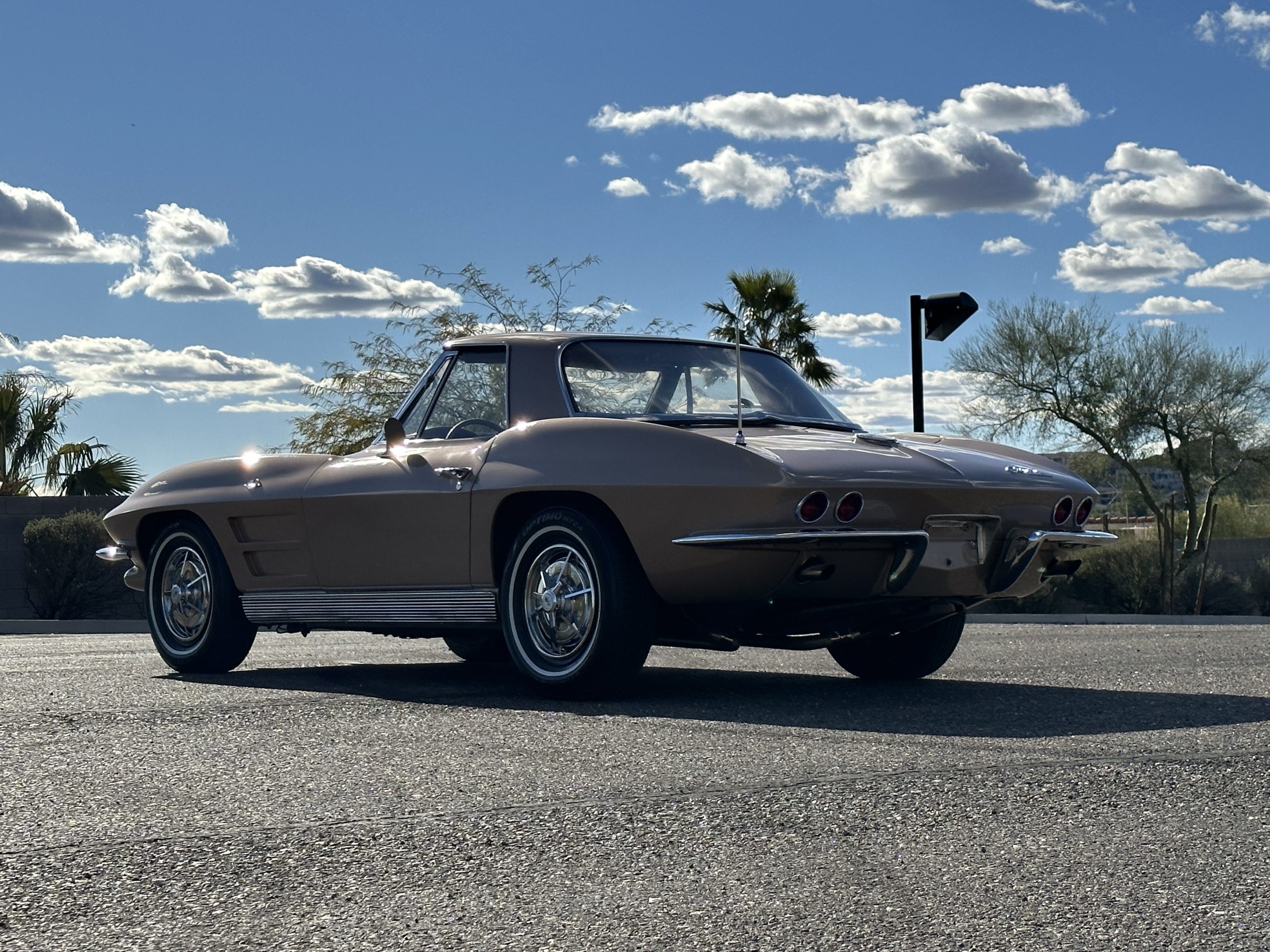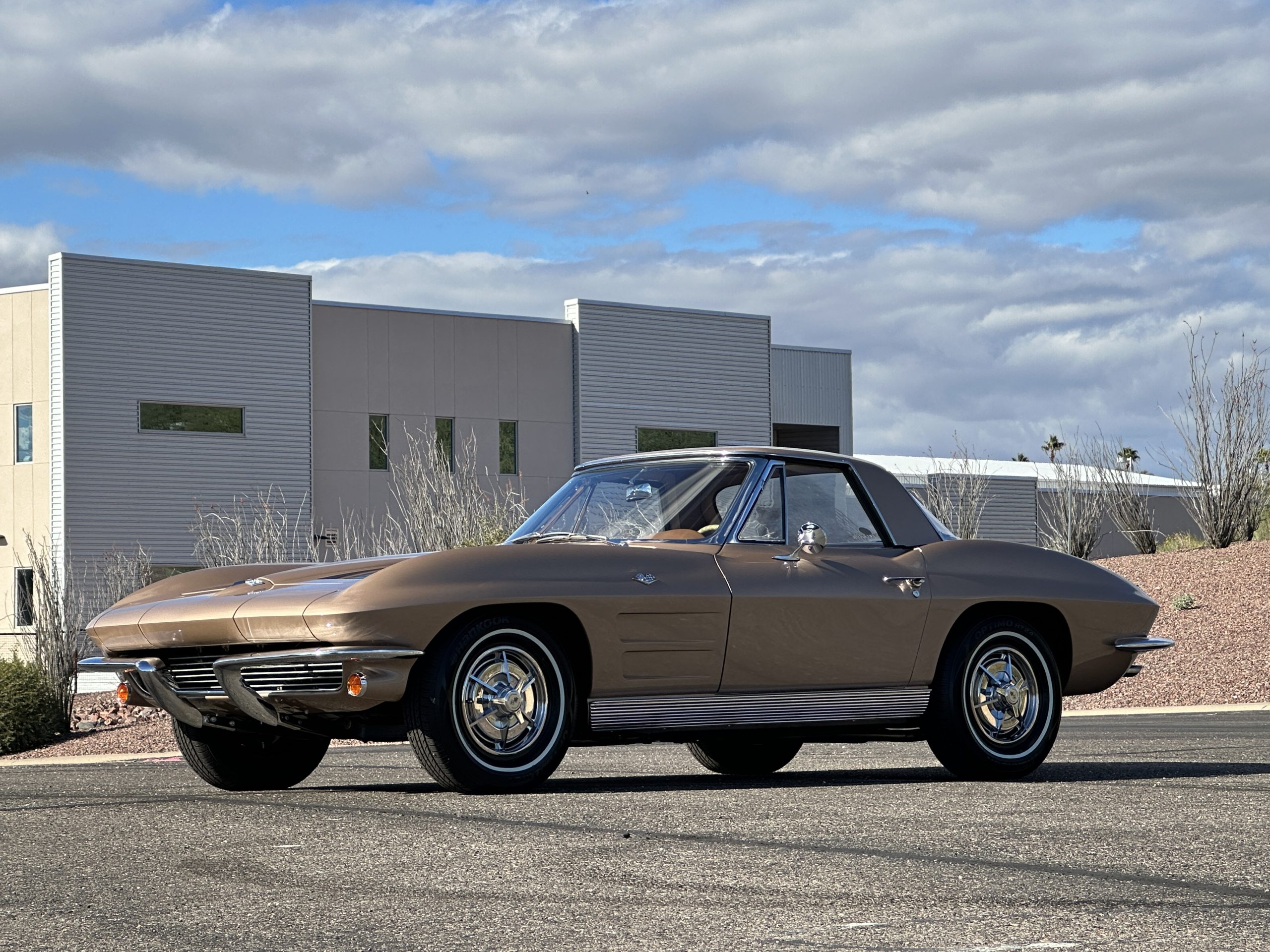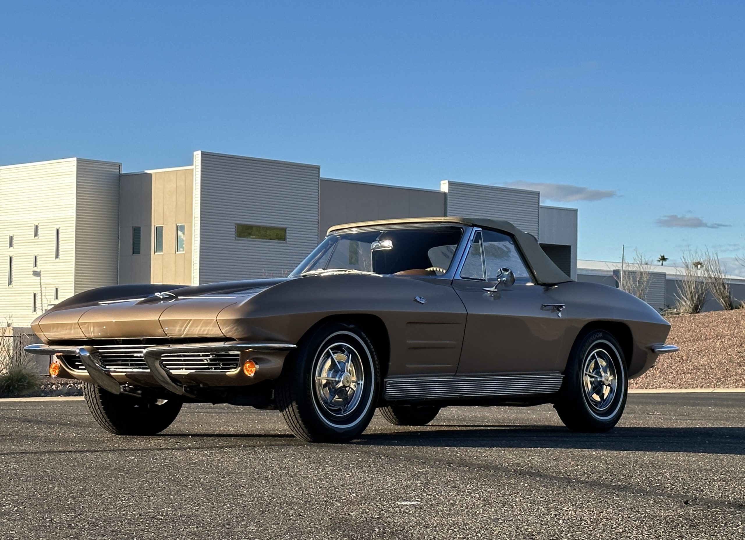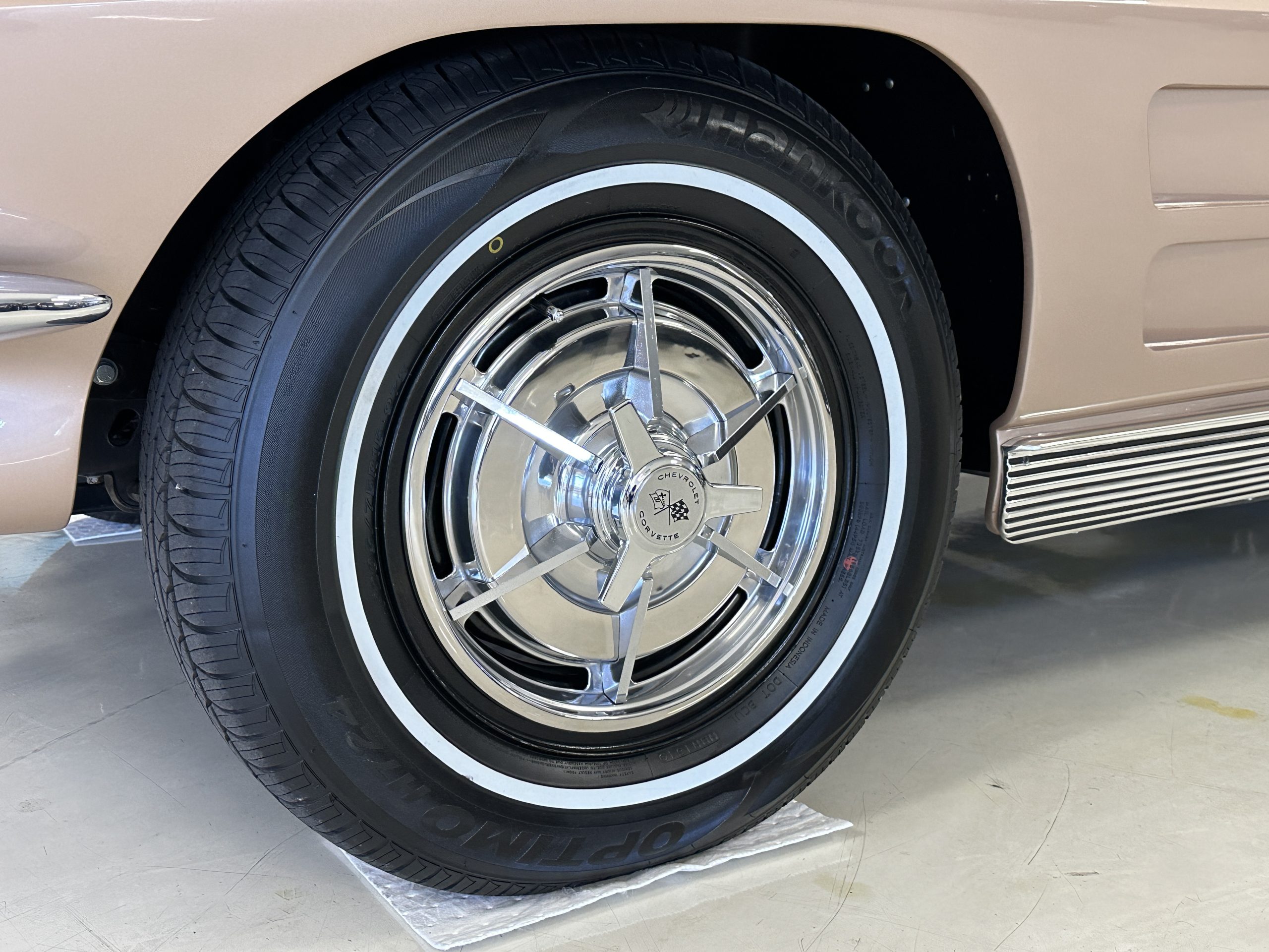 The Saddle Tan Metallic livery (Paint Code 932-A) is gorgeous and has a uniquely elegant presence. The paint has excellent shine and luster and is in beautiful condition today. The Saddle Tan paint is its original and correct factory color. The matching factory hard top is also in overall excellent condition. The correct beige vinyl soft top is new and in excellent condition. This Corvette looks excellent with the tops off as well as with its soft or hard top. All of the chrome and stainless-steel trim have been restored and show very well. The “knock-off style” hubcaps and Hankook radial tires are in excellent condition.