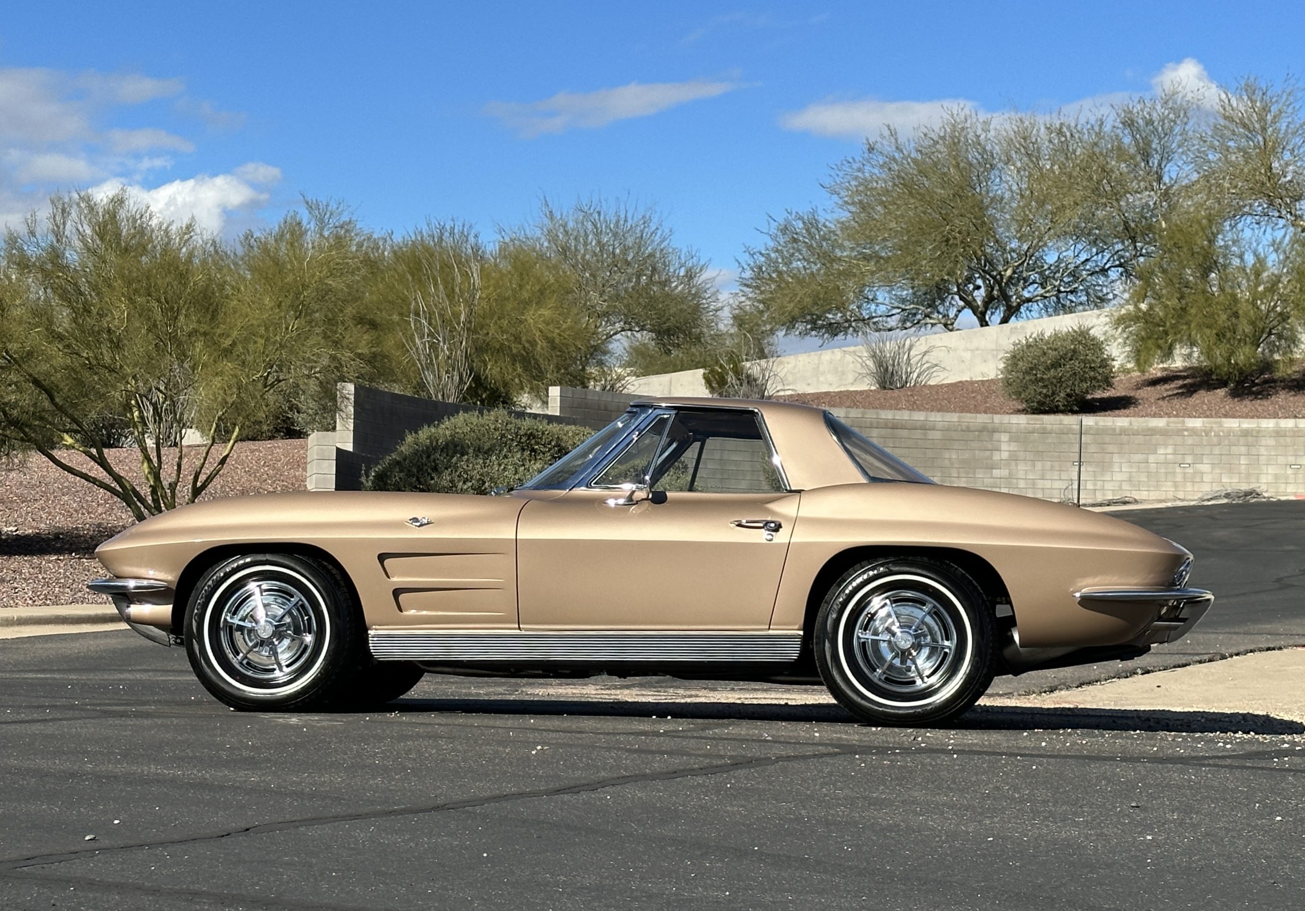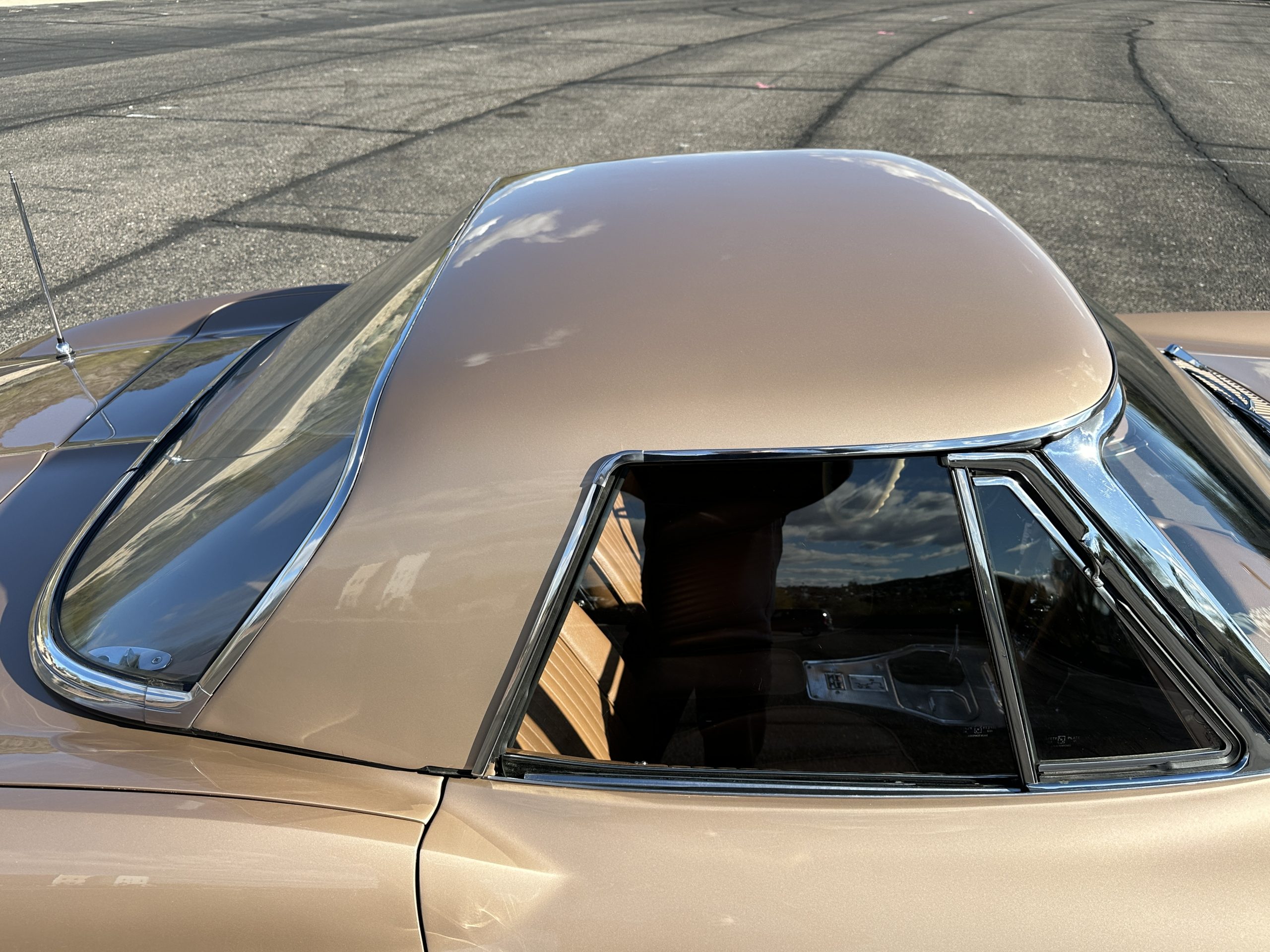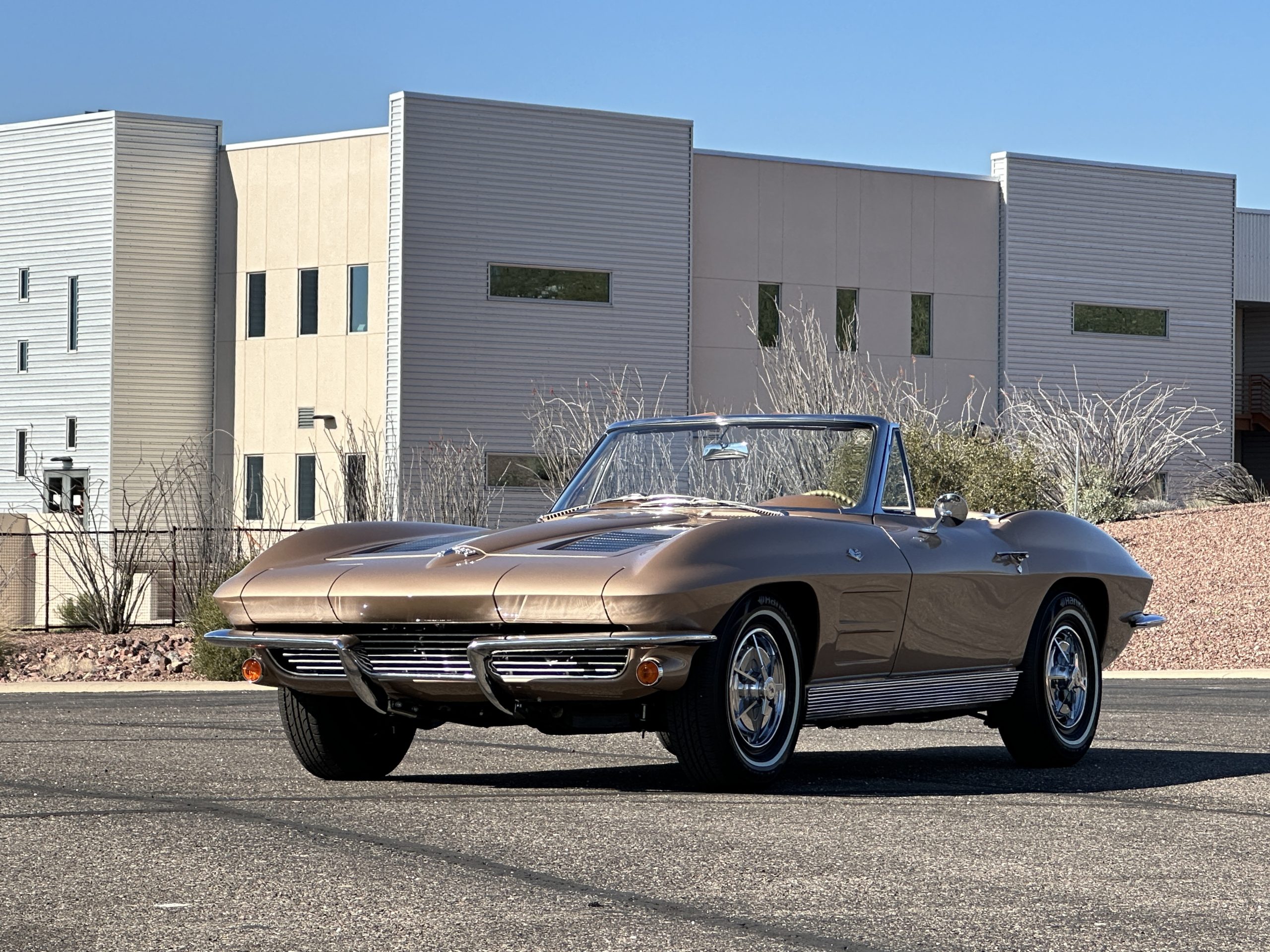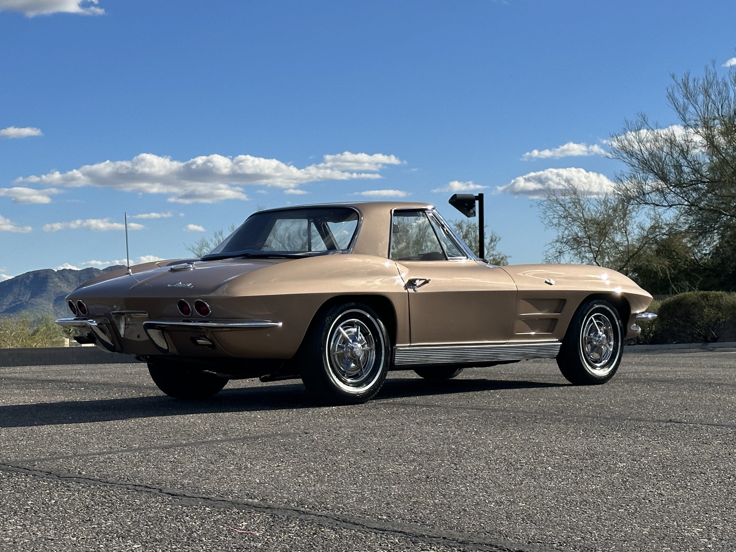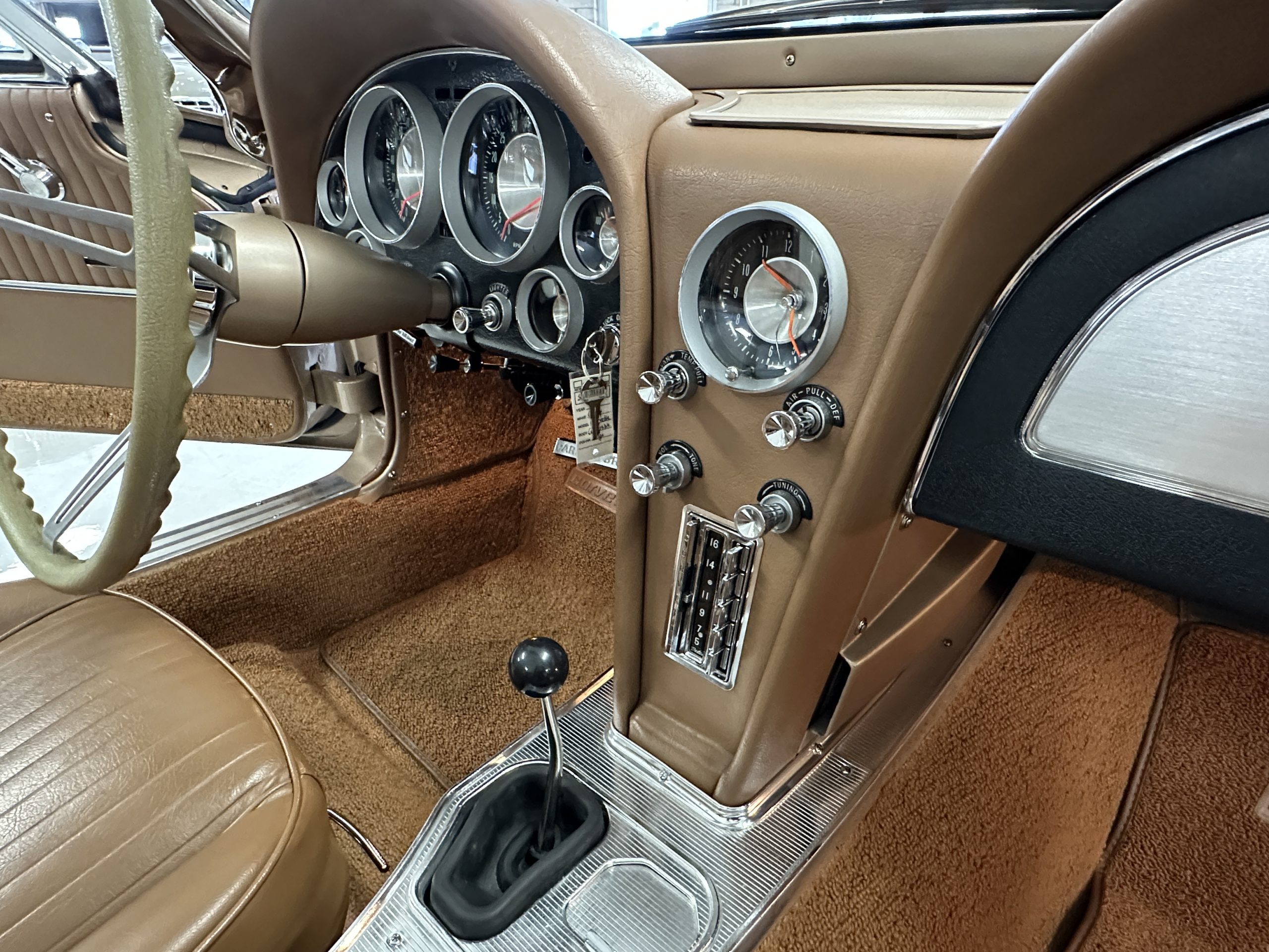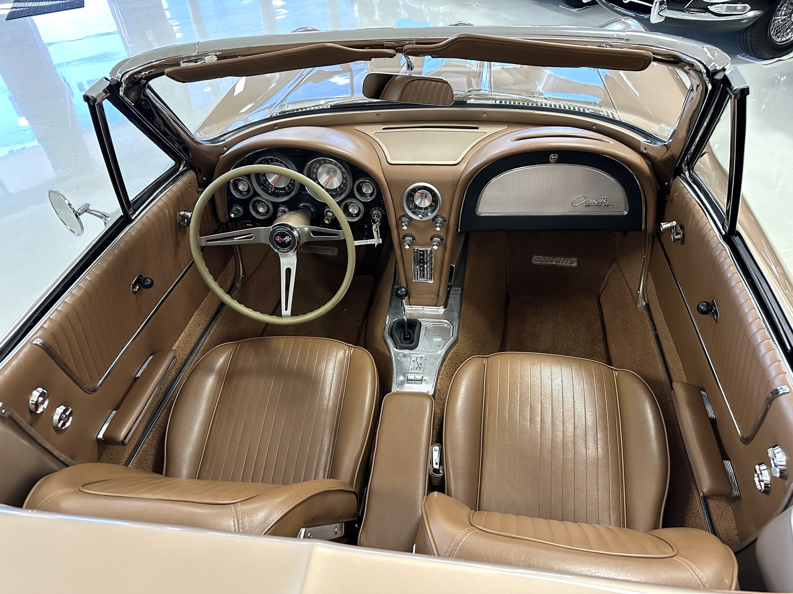 The Saddle Tan Metallic livery (Paint Code 932-A) is gorgeous and has a uniquely elegant presence. The paint has excellent shine and luster and is in beautiful condition today. The Saddle Tan paint is its original and correct factory color. The matching factory hard top is also in overall excellent condition. The correct beige vinyl soft top is new and in excellent condition. This Corvette looks excellent with the tops off as well as with its soft or hard top. All of the chrome and stainless-steel trim have been restored and show very well. The “knock-off style” hubcaps and Hankook radial tires are in excellent condition.