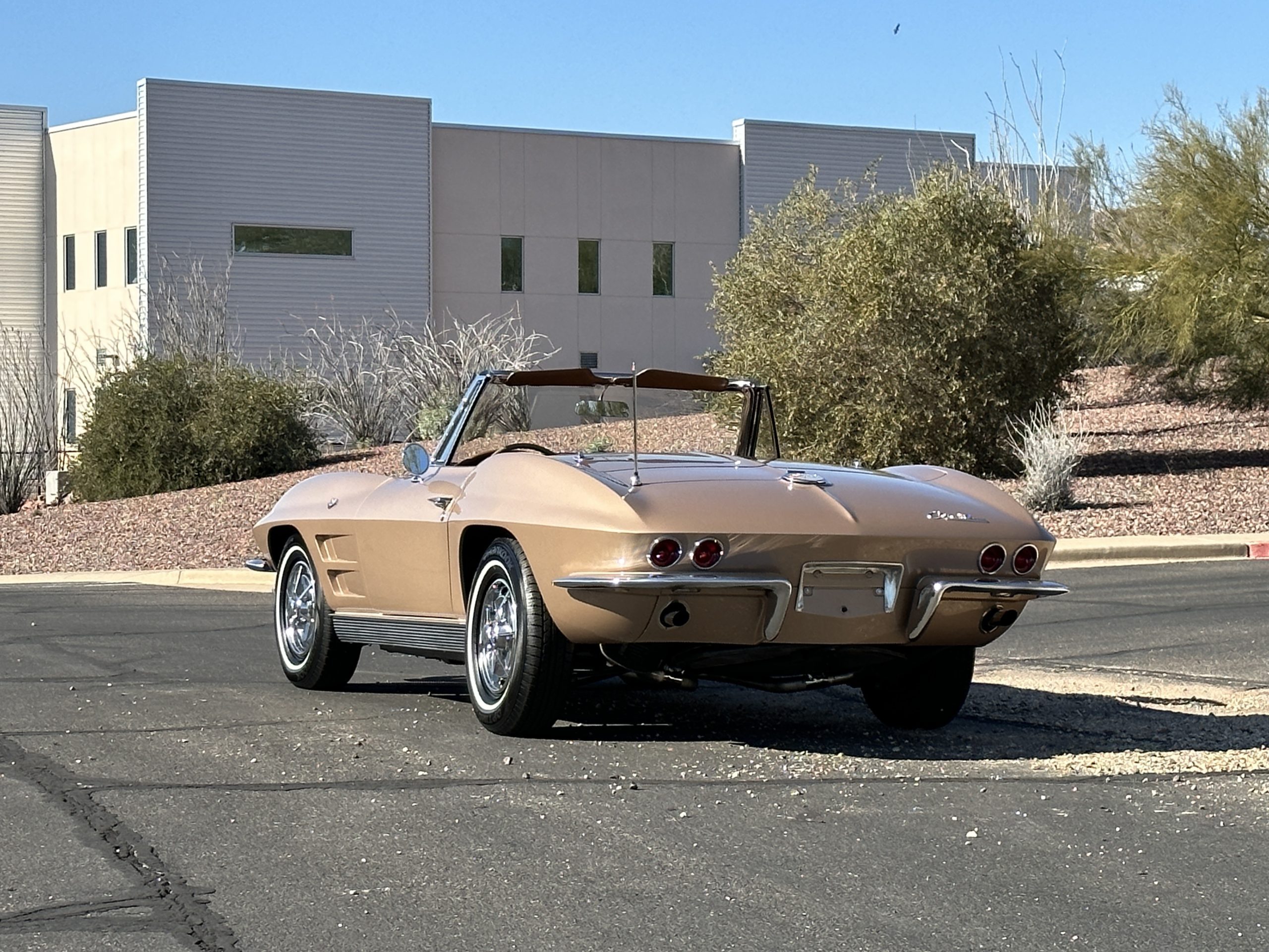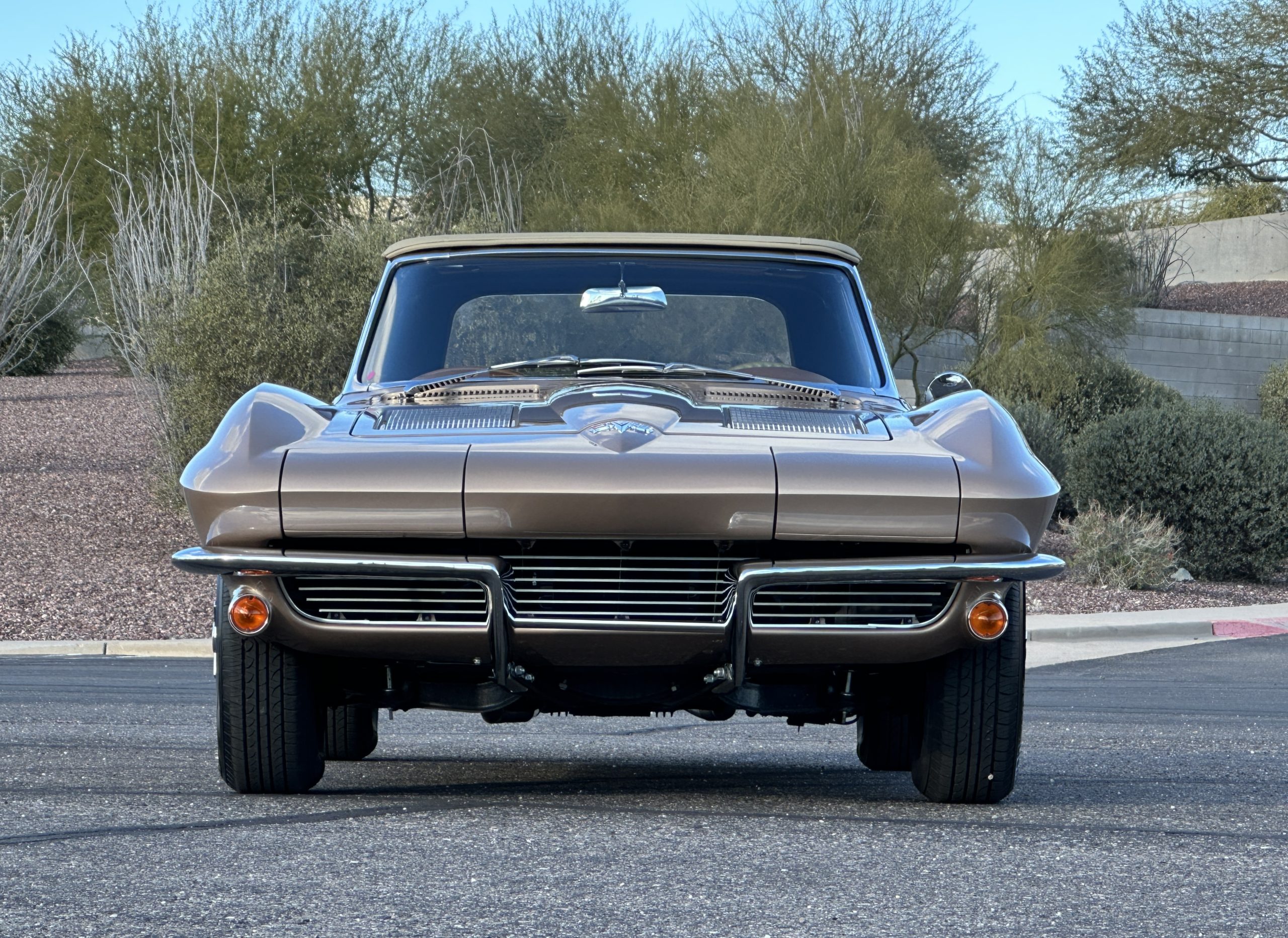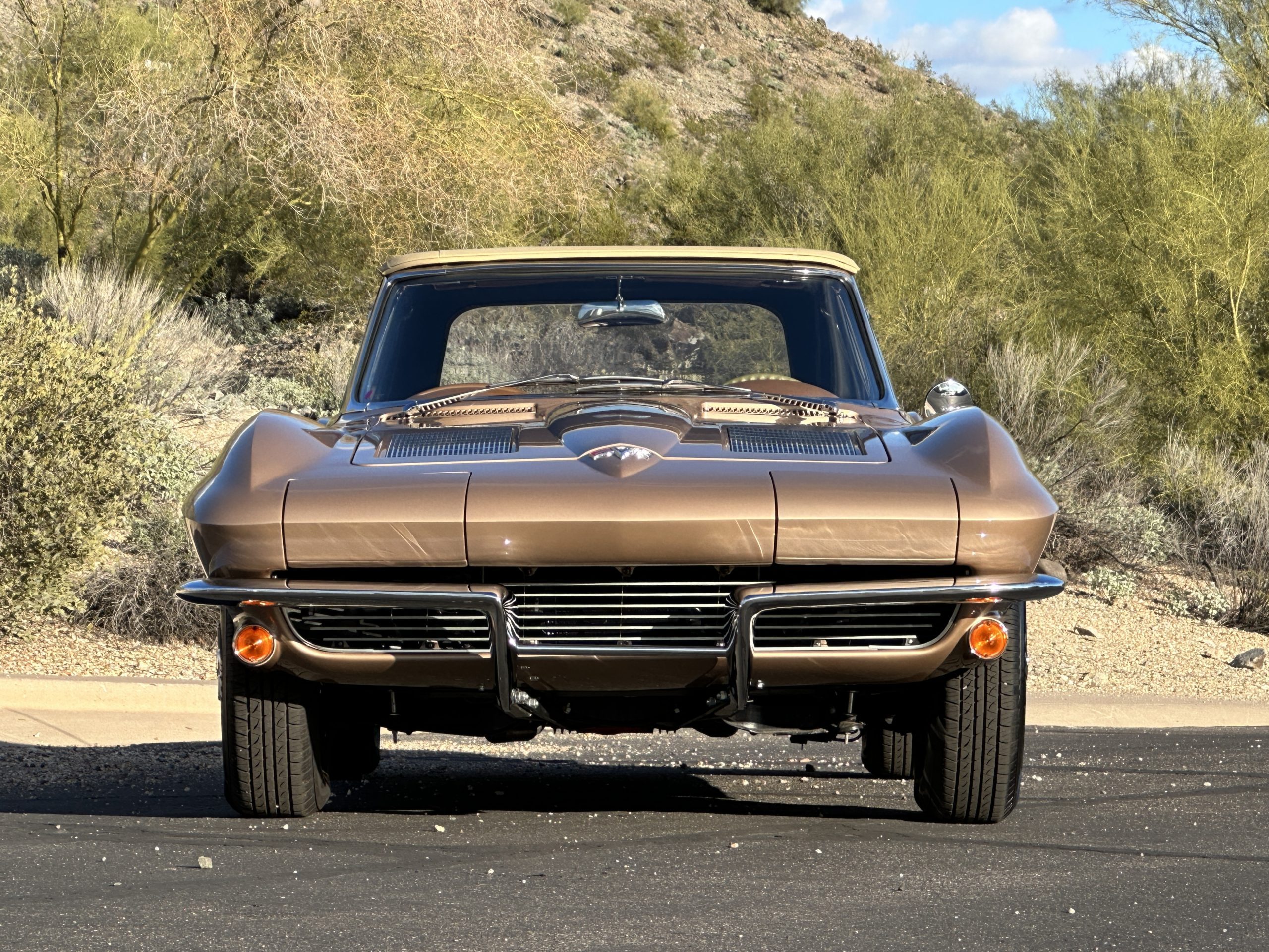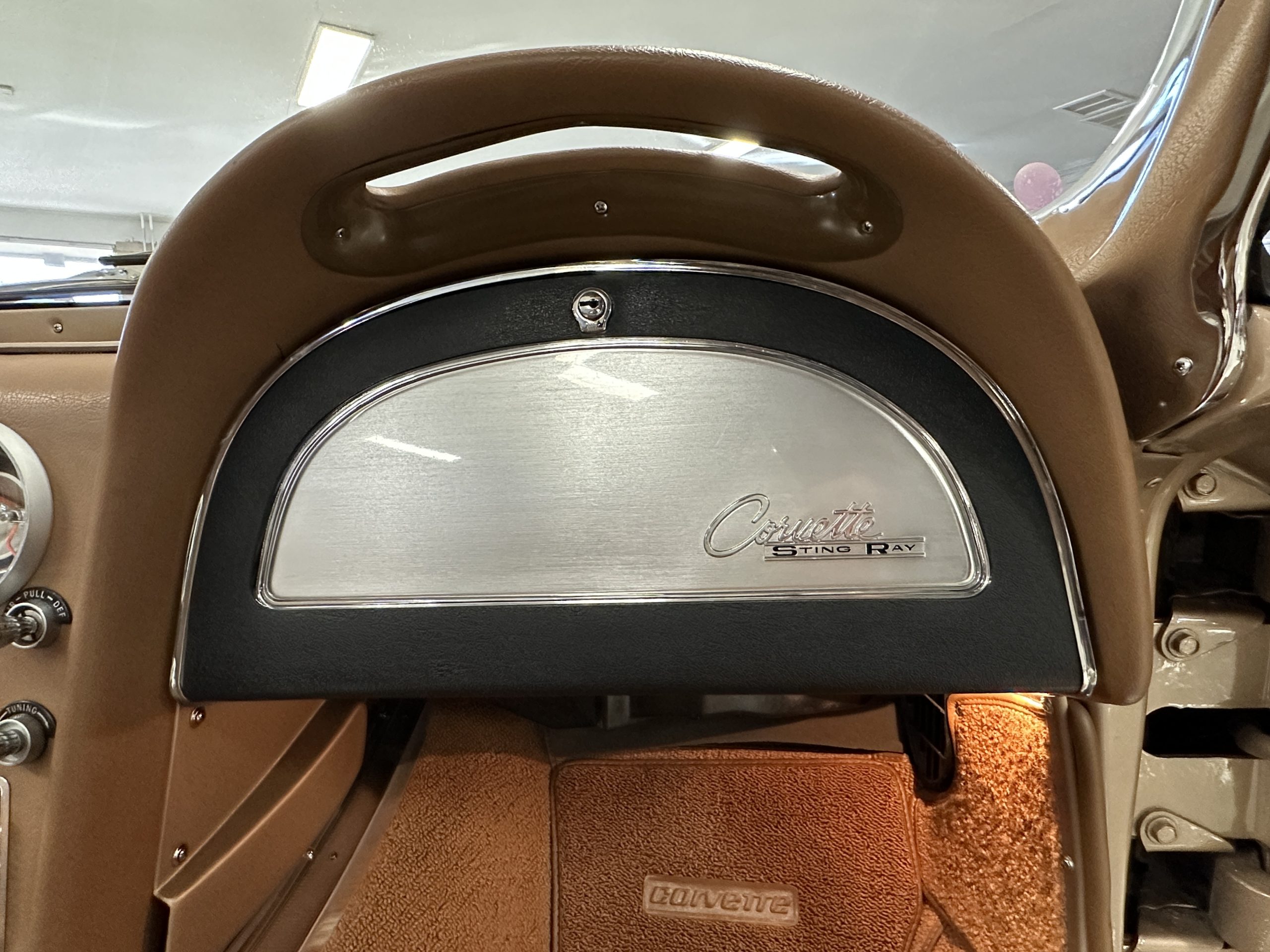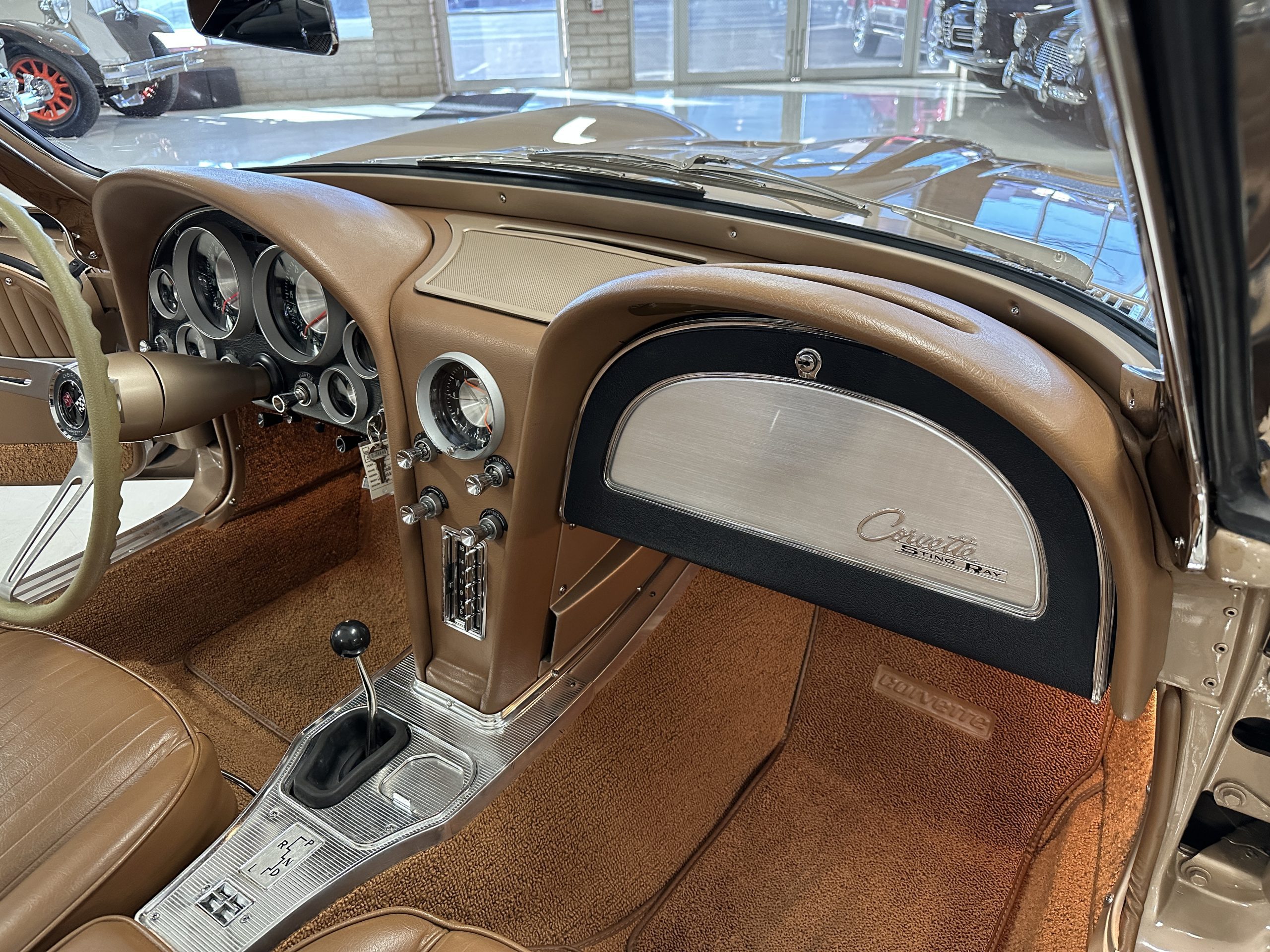 The Saddle Tan Metallic livery (Paint Code 932-A) is gorgeous and has a uniquely elegant presence. The paint has excellent shine and luster and is in beautiful condition today. The Saddle Tan paint is its original and correct factory color. The matching factory hard top is also in overall excellent condition. The correct beige vinyl soft top is new and in excellent condition. This Corvette looks excellent with the tops off as well as with its soft or hard top. All of the chrome and stainless-steel trim have been restored and show very well. The “knock-off style” hubcaps and Hankook radial tires are in excellent condition.