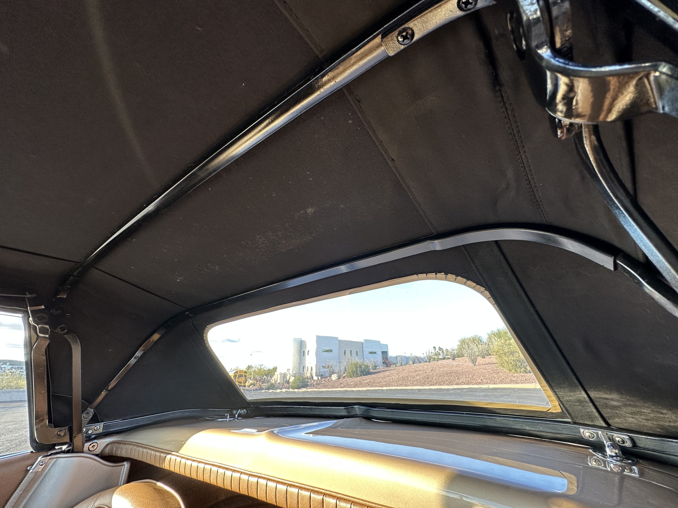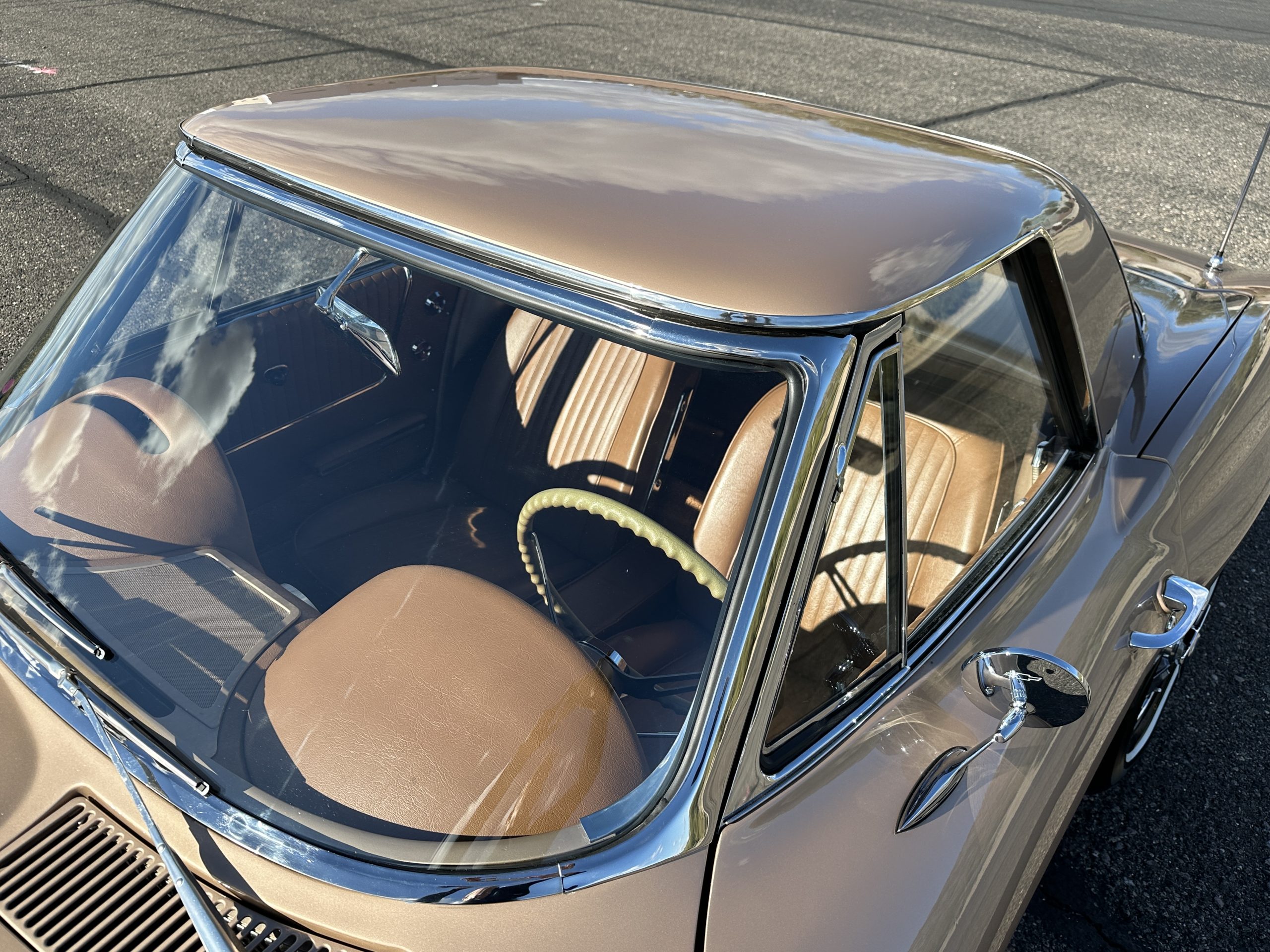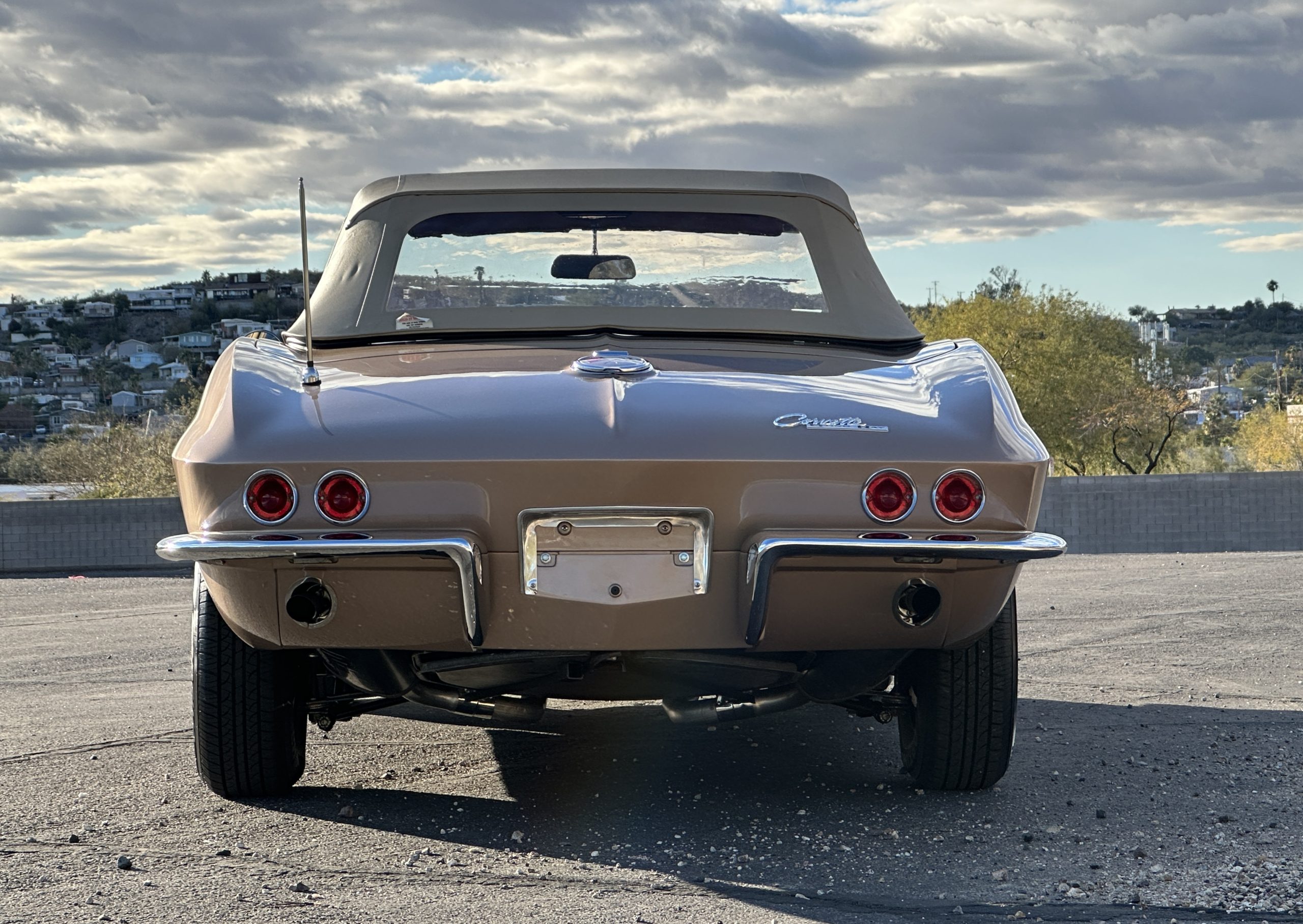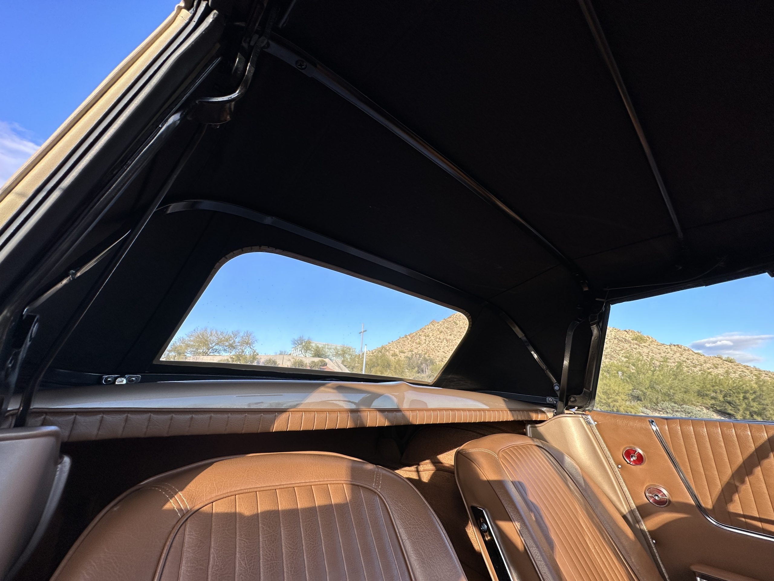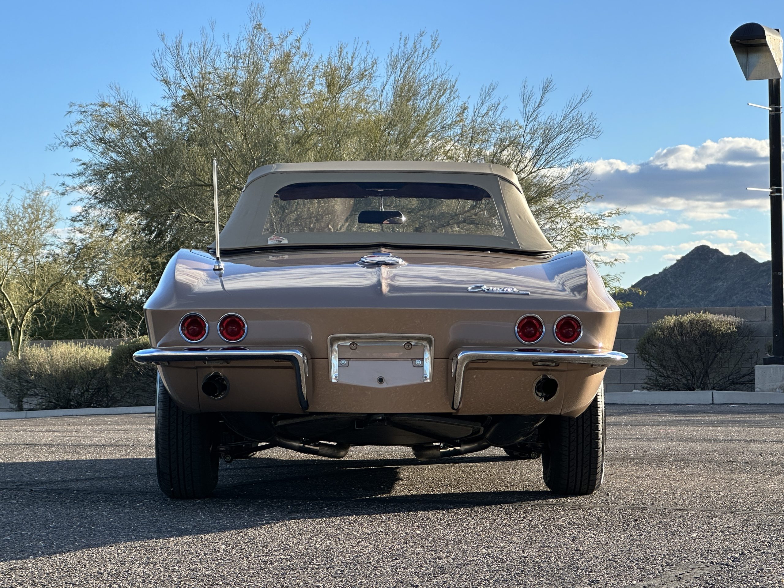 The Saddle Tan Metallic livery (Paint Code 932-A) is gorgeous and has a uniquely elegant presence. The paint has excellent shine and luster and is in beautiful condition today. The Saddle Tan paint is its original and correct factory color. The matching factory hard top is also in overall excellent condition. The correct beige vinyl soft top is new and in excellent condition. This Corvette looks excellent with the tops off as well as with its soft or hard top. All of the chrome and stainless-steel trim have been restored and show very well. The “knock-off style” hubcaps and Hankook radial tires are in excellent condition.