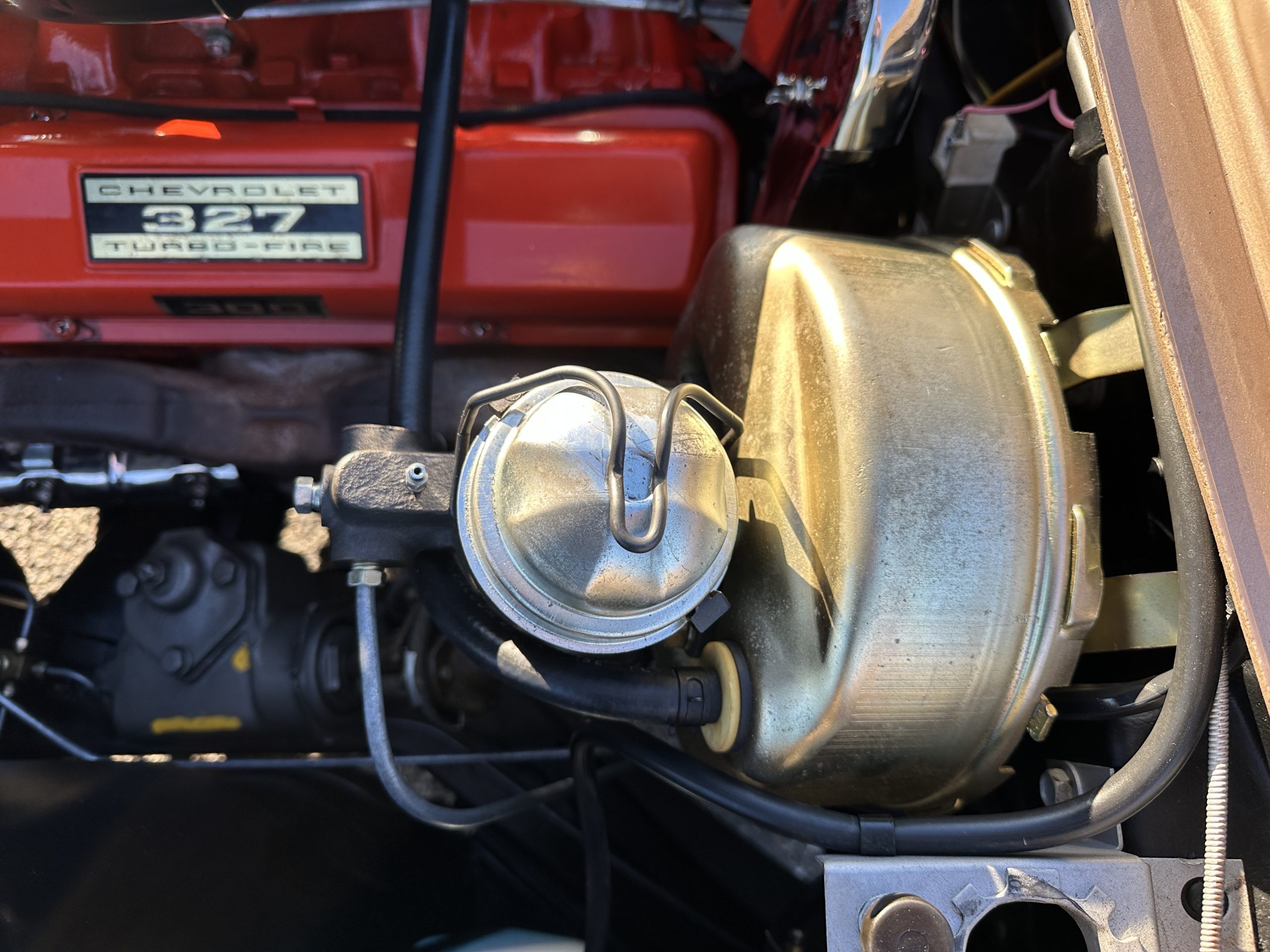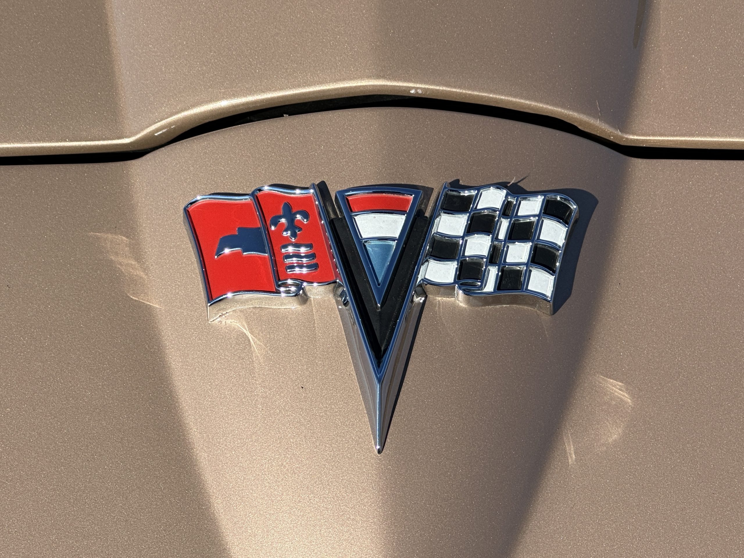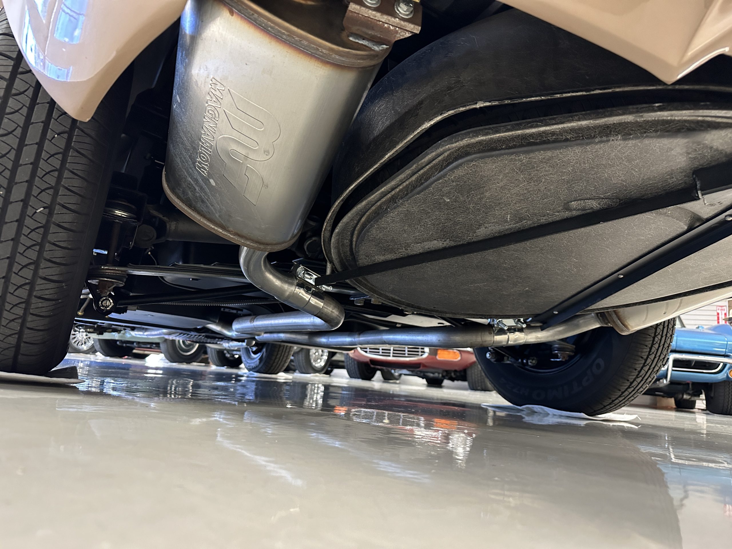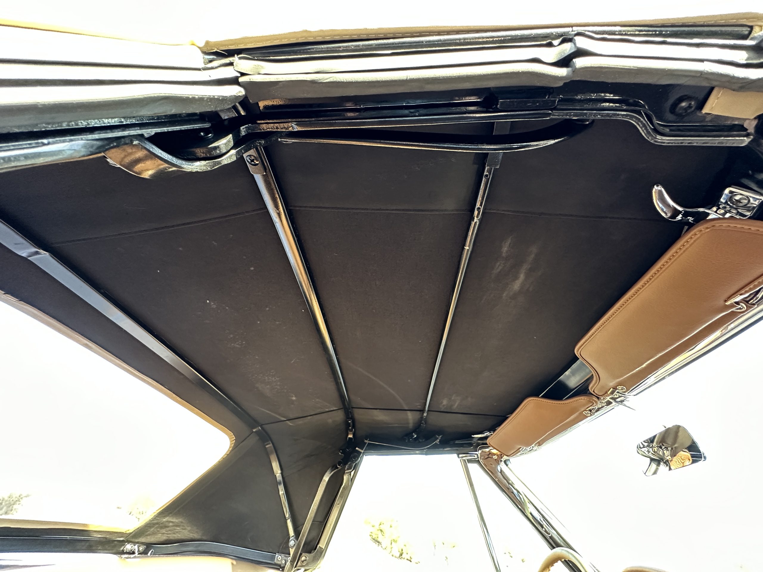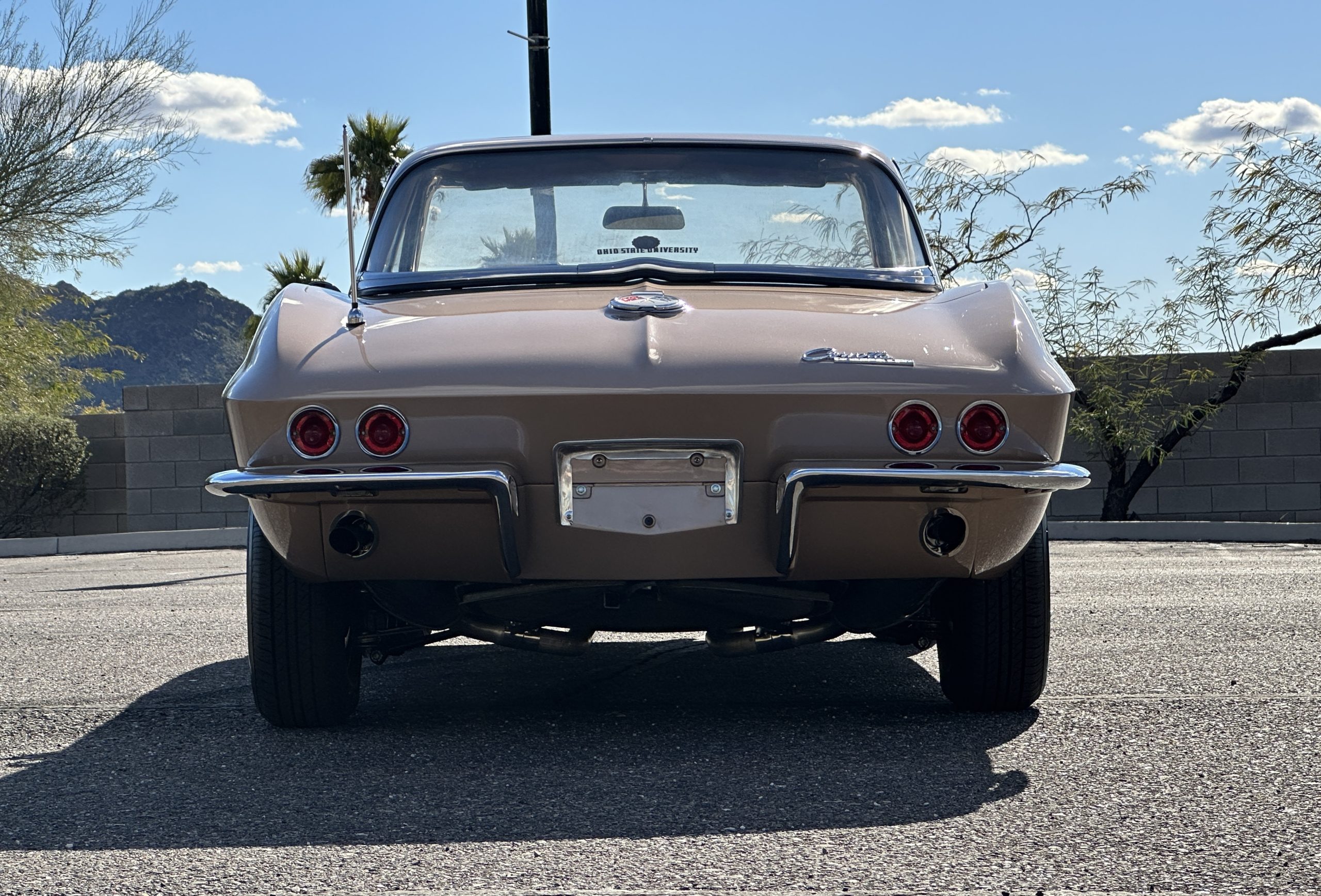 The Saddle Tan Metallic livery (Paint Code 932-A) is gorgeous and has a uniquely elegant presence. The paint has excellent shine and luster and is in beautiful condition today. The Saddle Tan paint is its original and correct factory color. The matching factory hard top is also in overall excellent condition. The correct beige vinyl soft top is new and in excellent condition. This Corvette looks excellent with the tops off as well as with its soft or hard top. All of the chrome and stainless-steel trim have been restored and show very well. The “knock-off style” hubcaps and Hankook radial tires are in excellent condition.