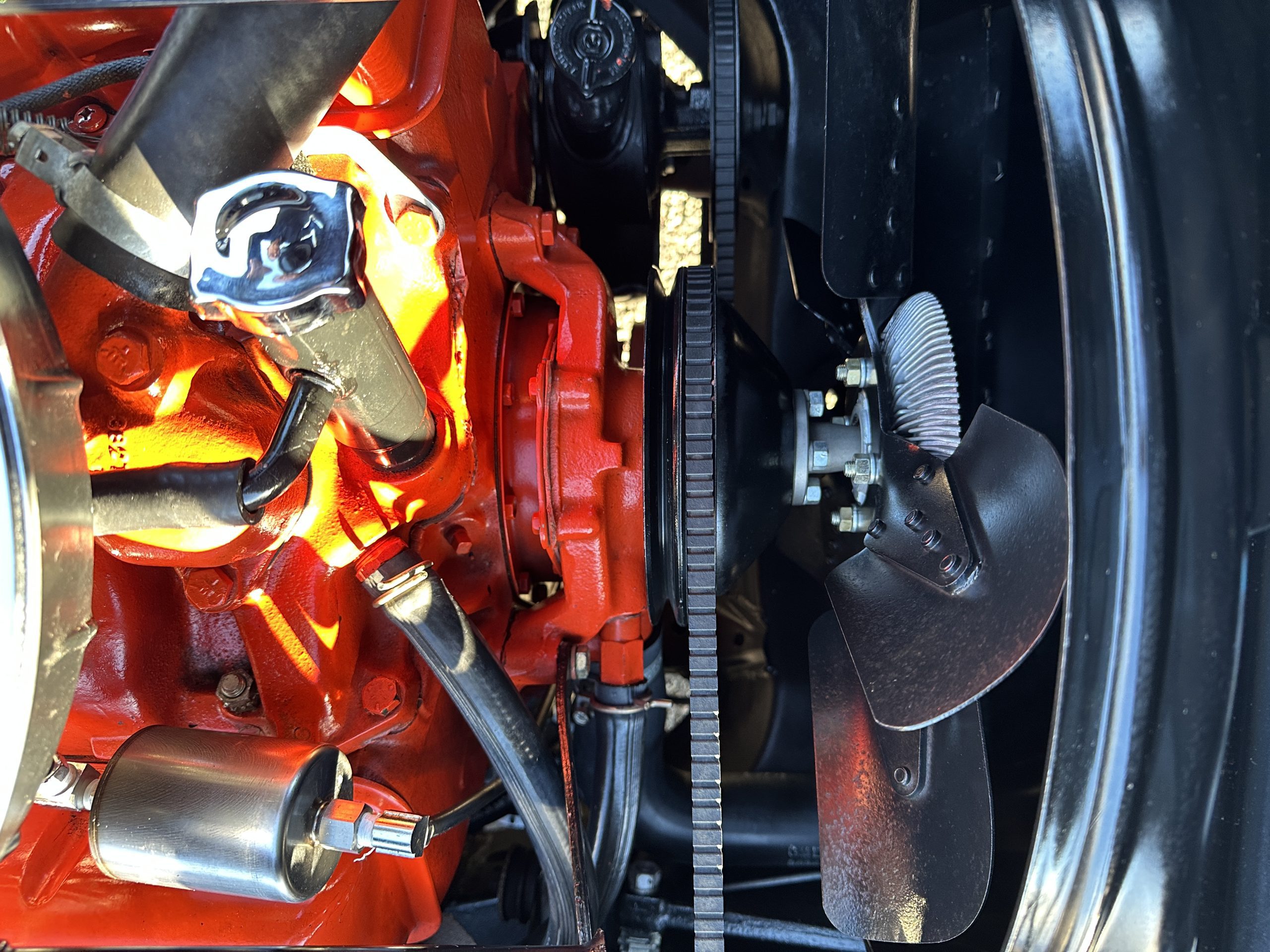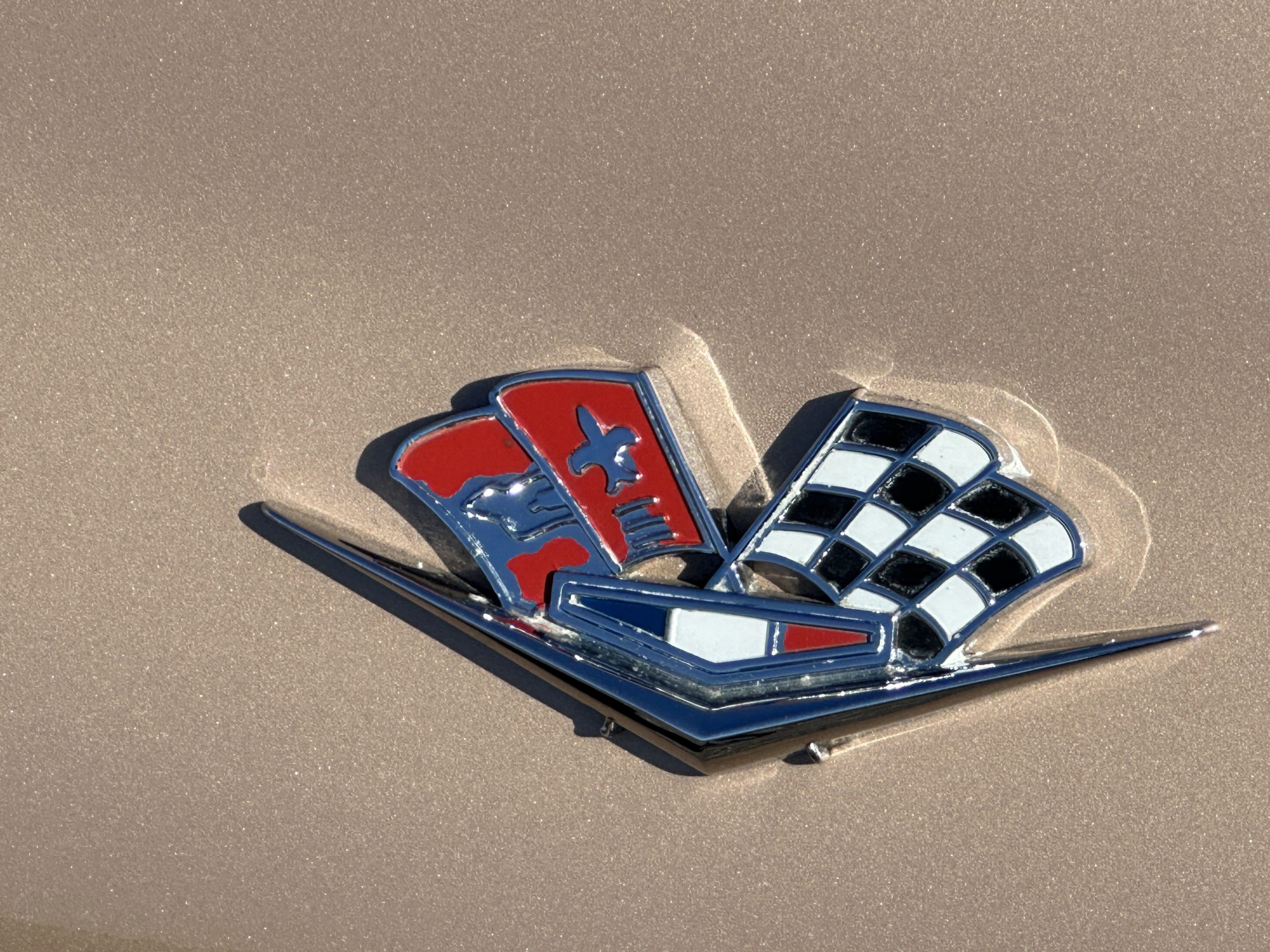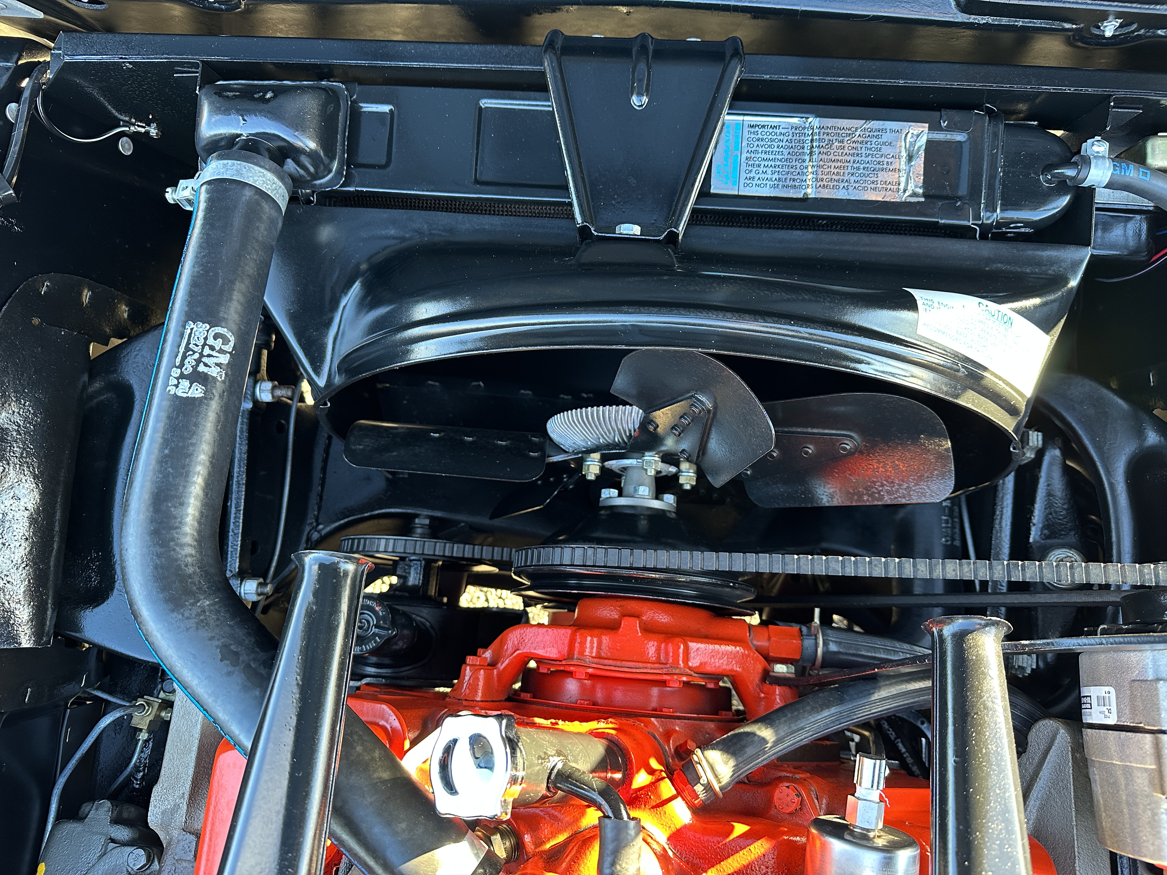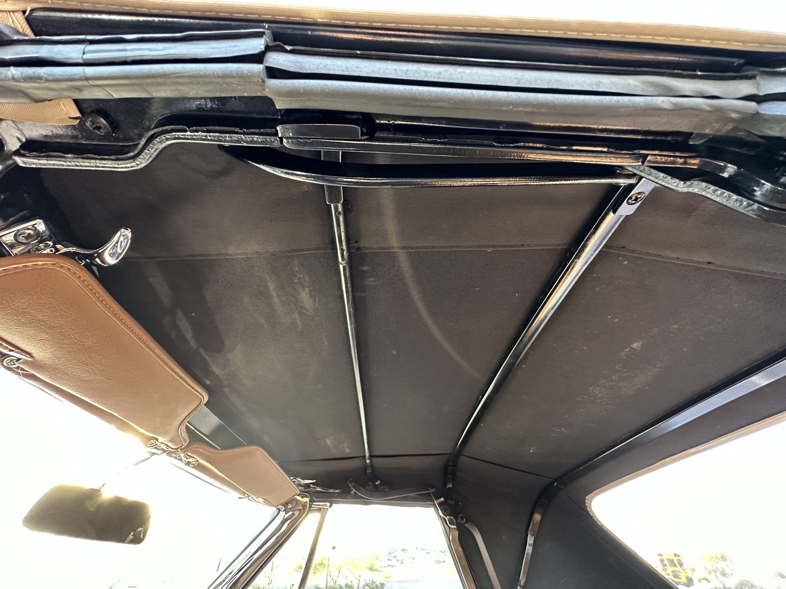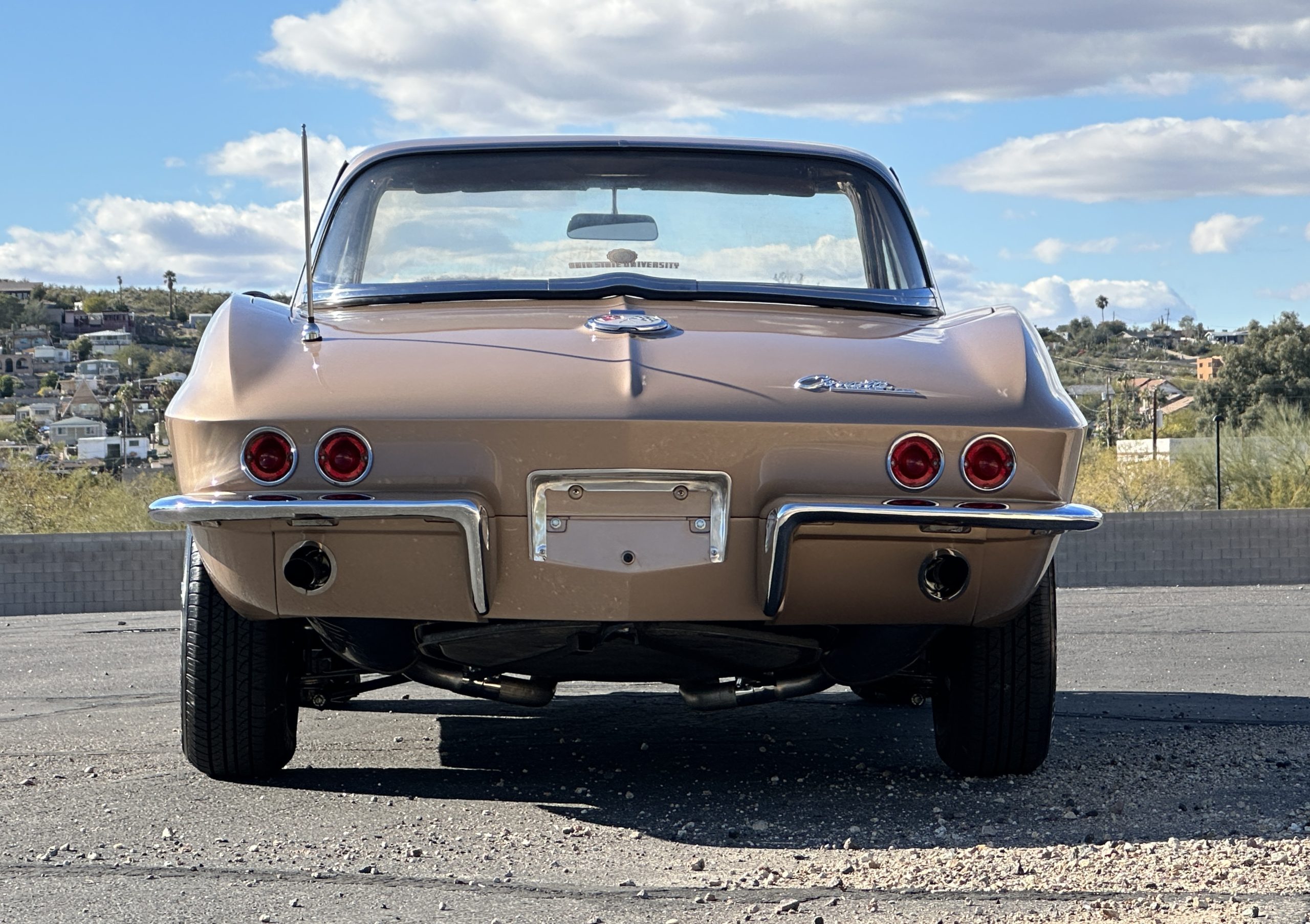 The Saddle Tan Metallic livery (Paint Code 932-A) is gorgeous and has a uniquely elegant presence. The paint has excellent shine and luster and is in beautiful condition today. The Saddle Tan paint is its original and correct factory color. The matching factory hard top is also in overall excellent condition. The correct beige vinyl soft top is new and in excellent condition. This Corvette looks excellent with the tops off as well as with its soft or hard top. All of the chrome and stainless-steel trim have been restored and show very well. The “knock-off style” hubcaps and Hankook radial tires are in excellent condition.