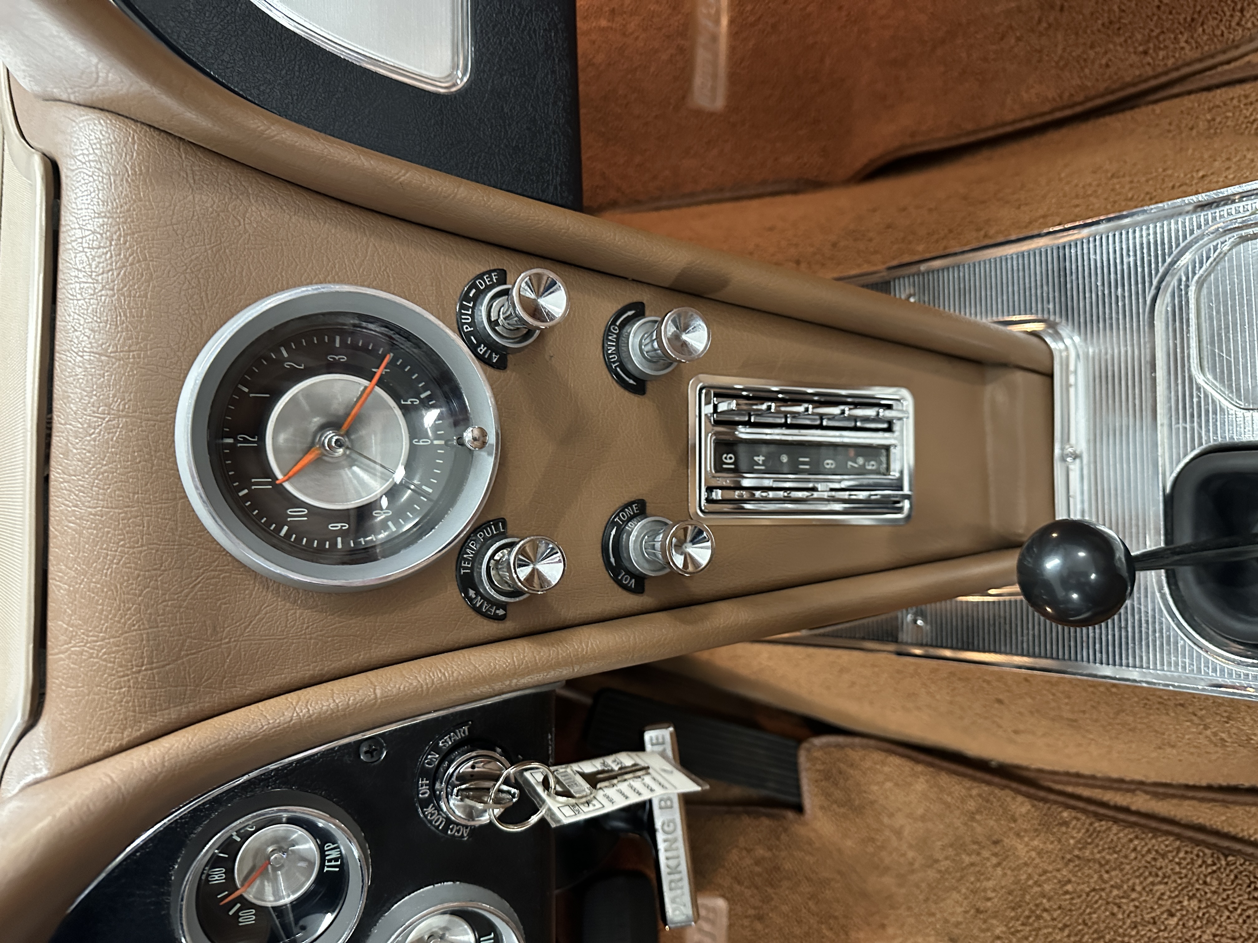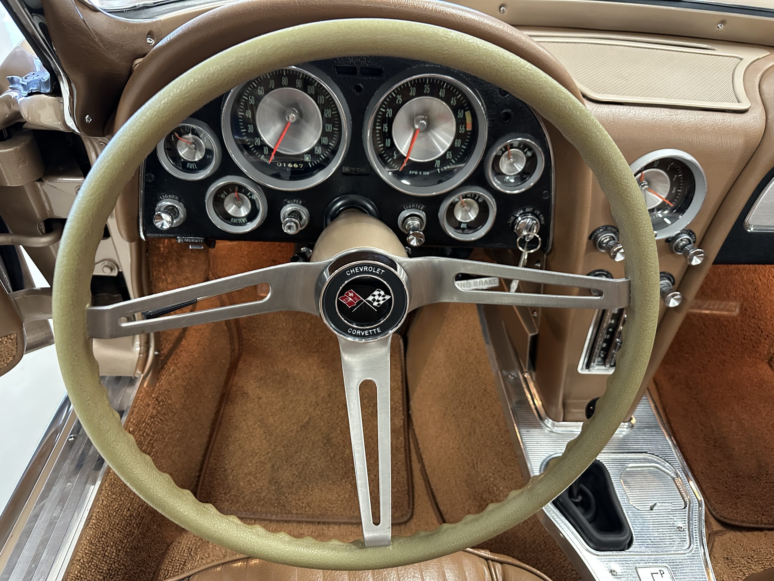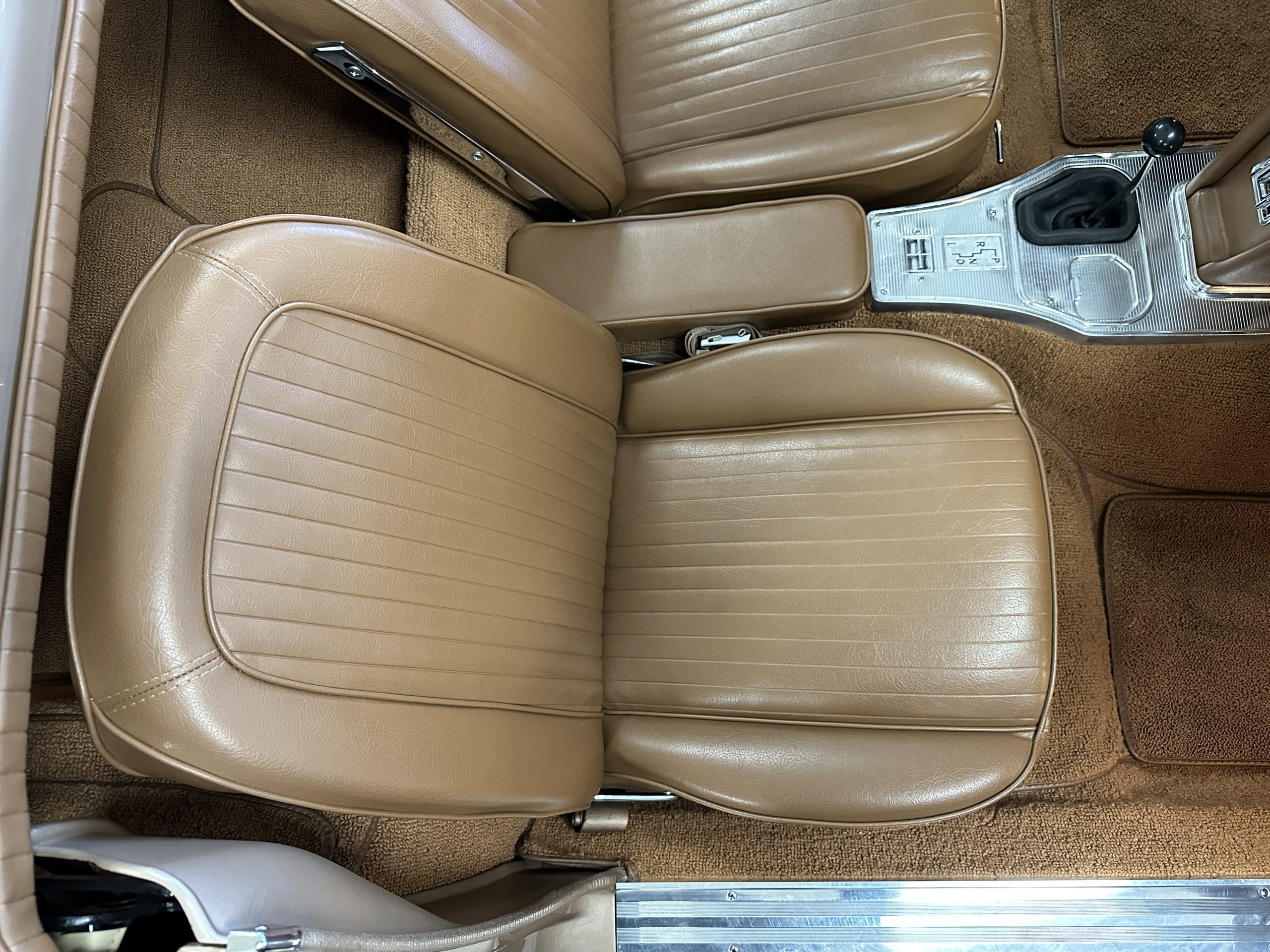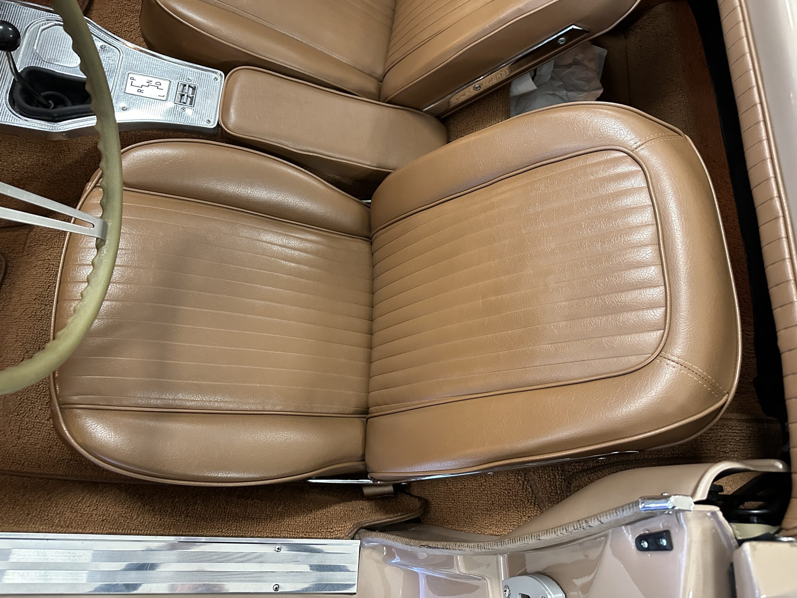The Saddle Vinyl (Trim Code 490P) interior was also restored and appears in very nice condition. The Beige carpet appears in near new condition. The dash and steering wheel are all restored. Only the center console shows scratches from age and use while the rest of the interior is freshly restored.