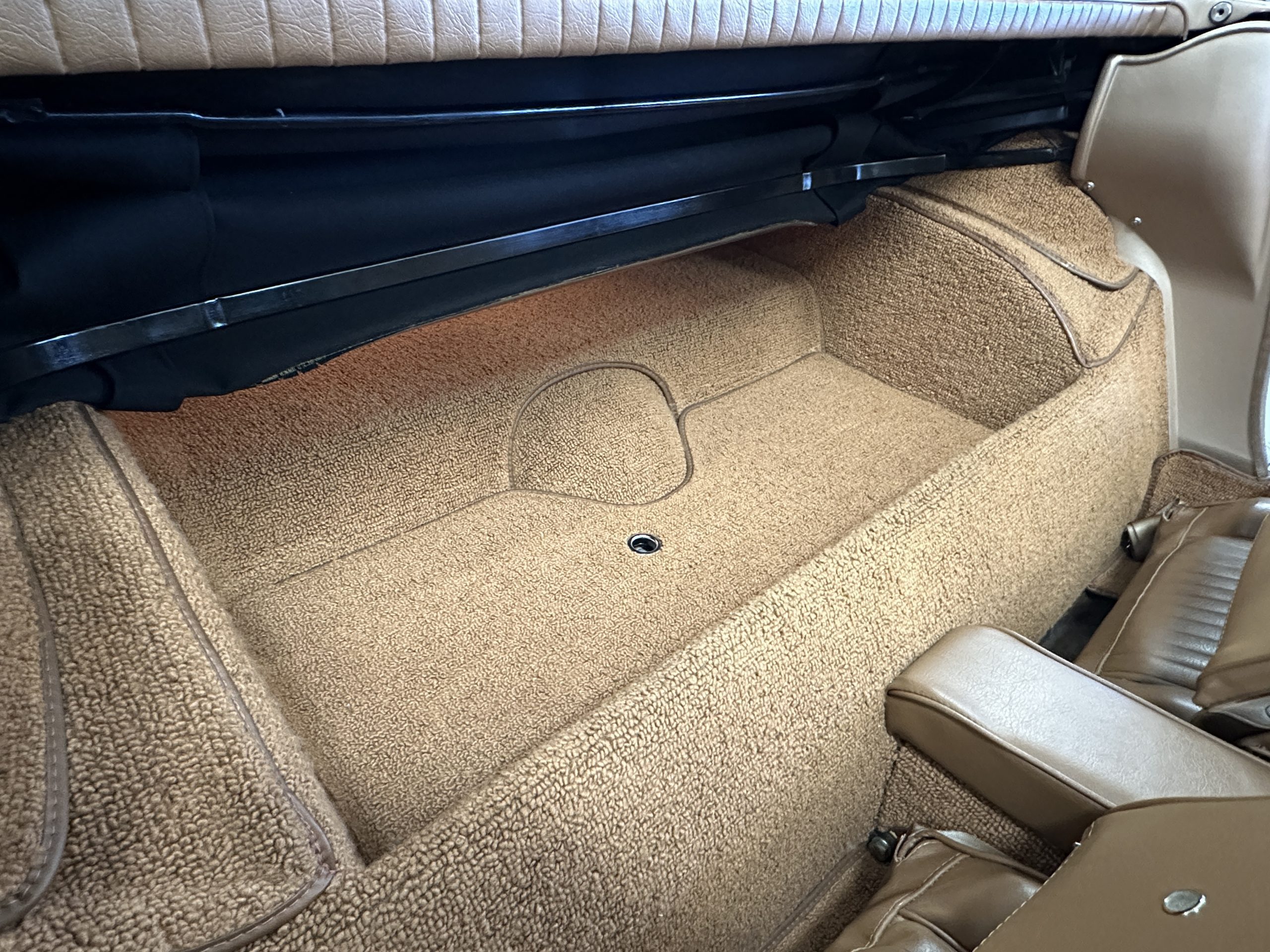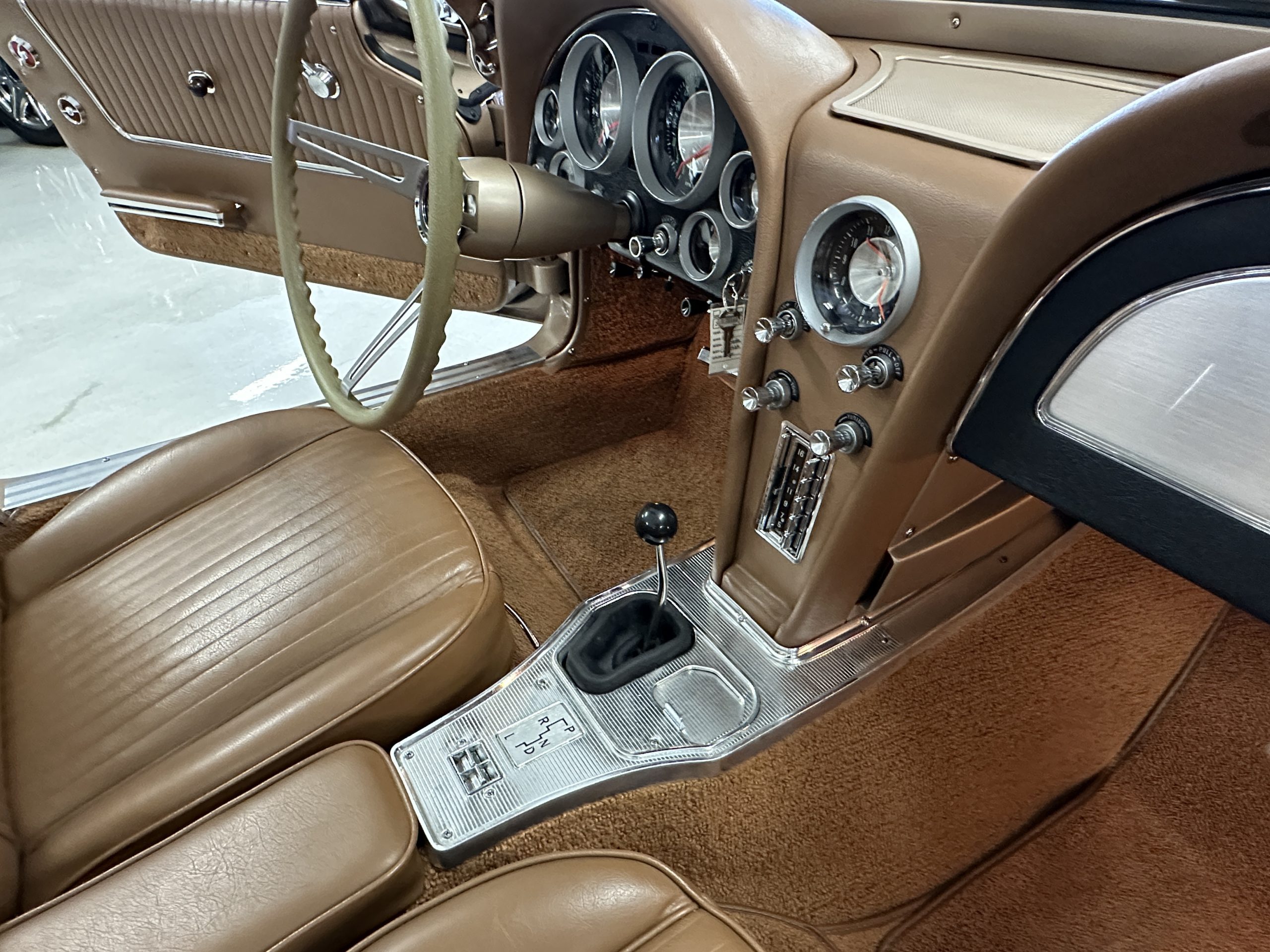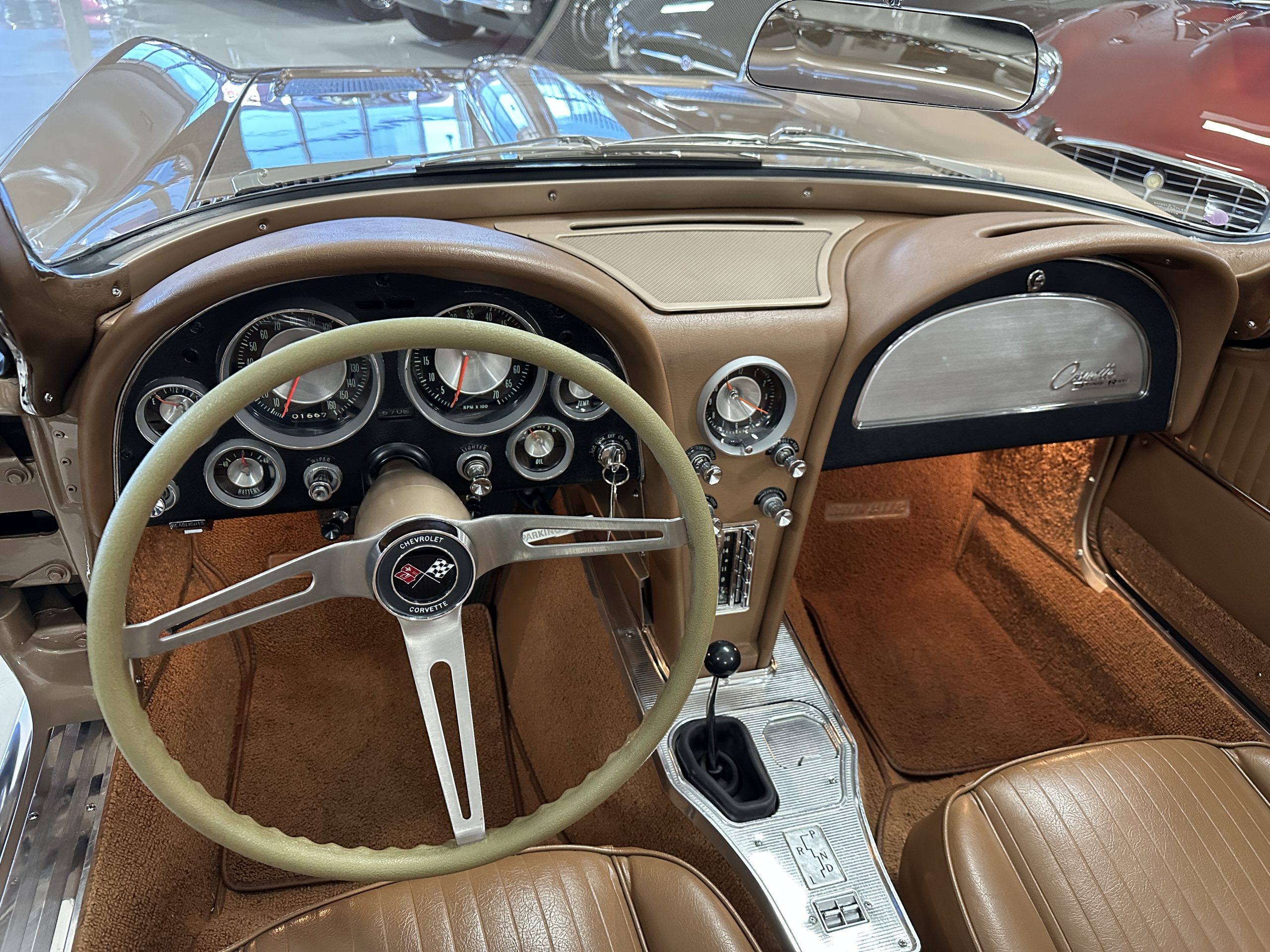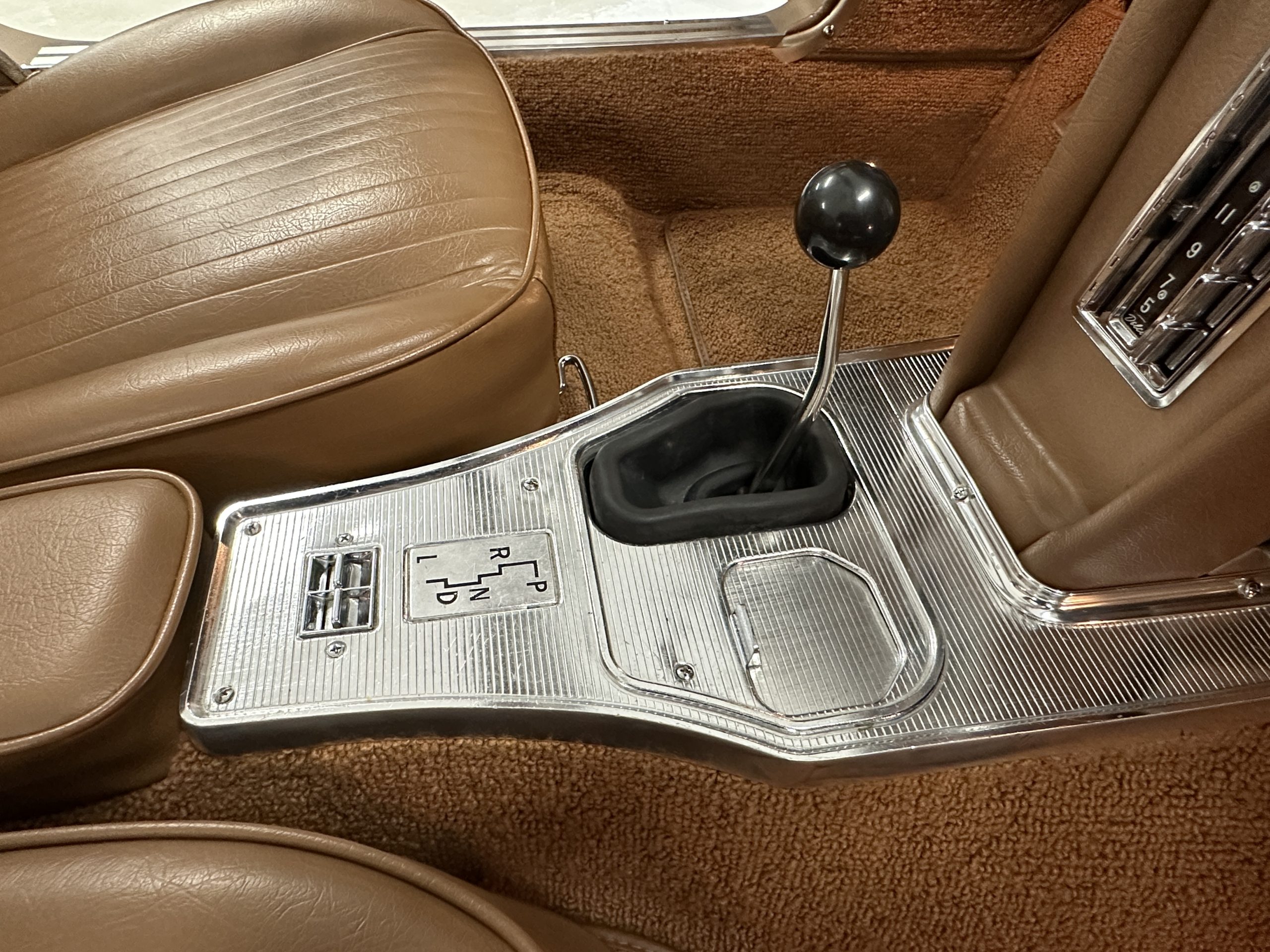The Saddle Vinyl (Trim Code 490P) interior was also restored and appears in very nice condition. The Beige carpet appears in near new condition. The dash and steering wheel are all restored. Only the center console shows scratches from age and use while the rest of the interior is freshly restored.