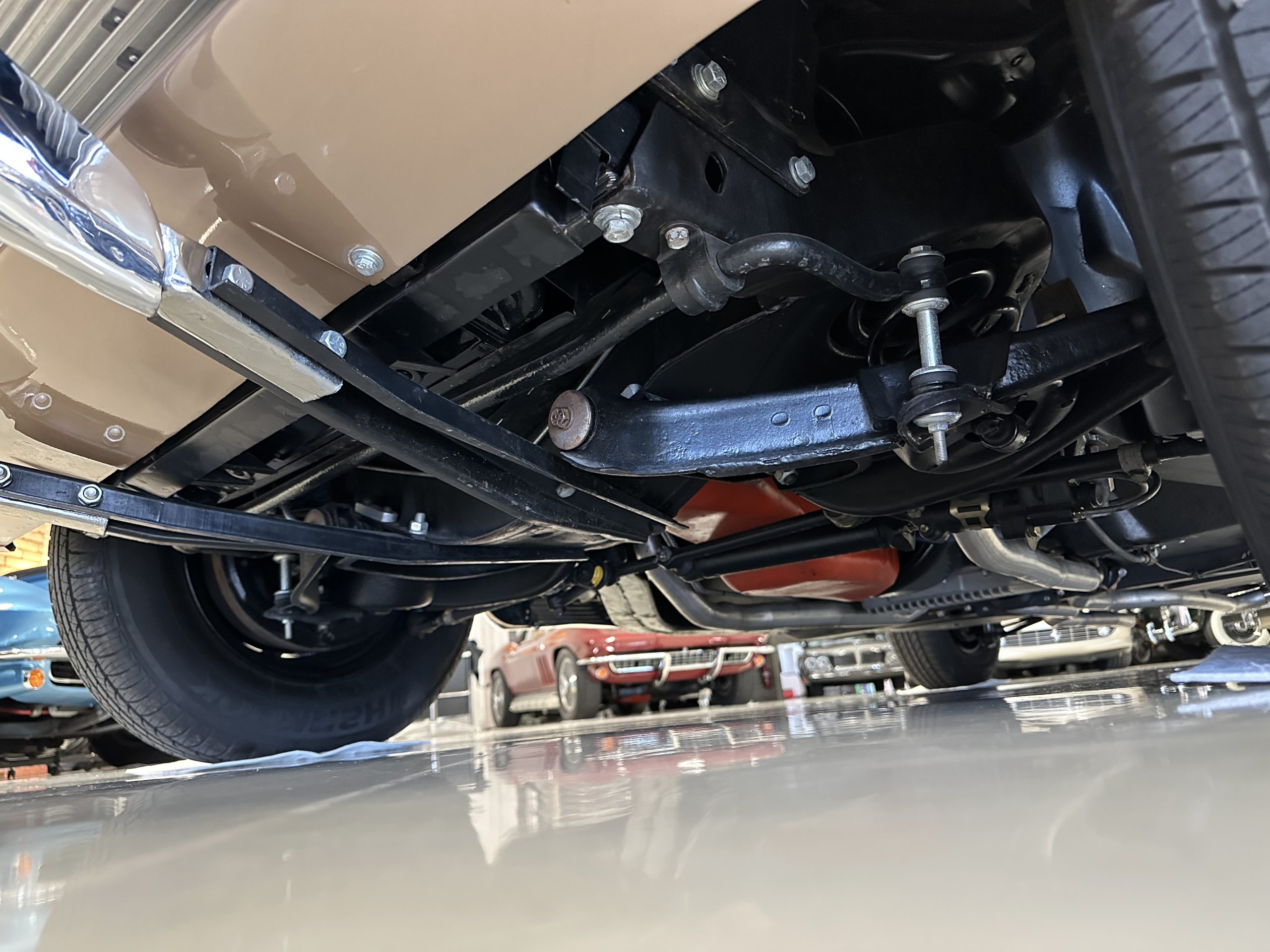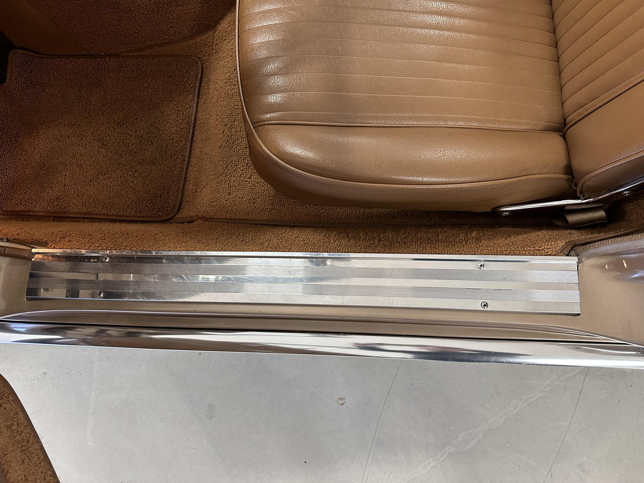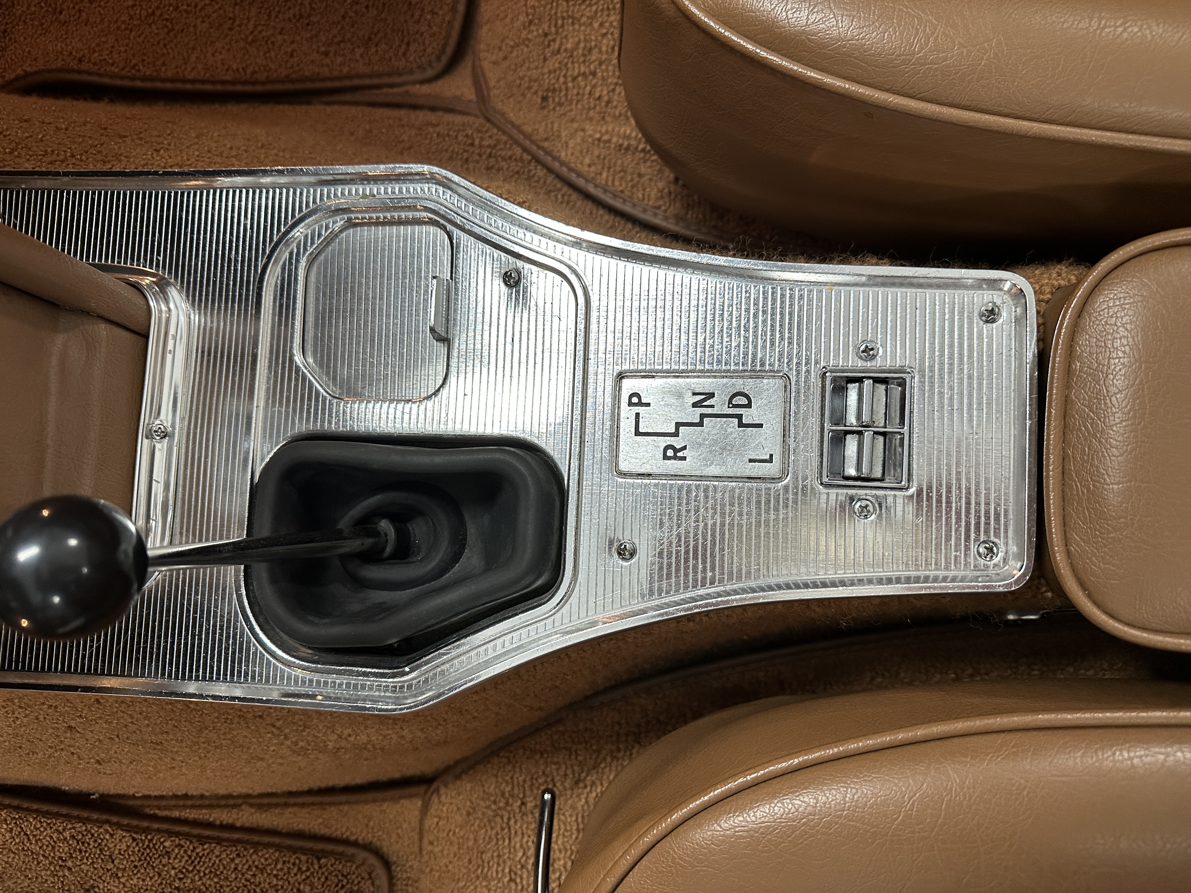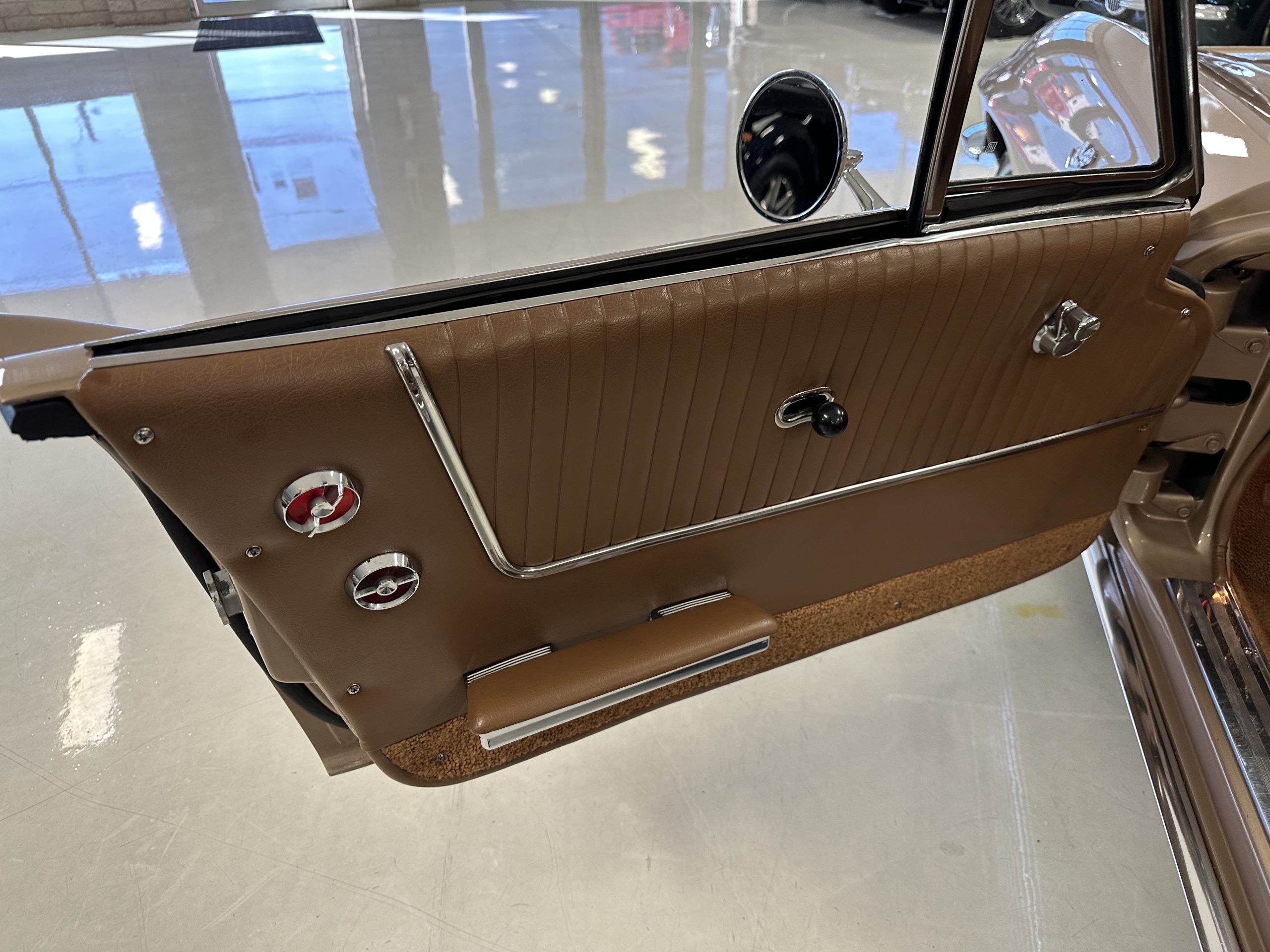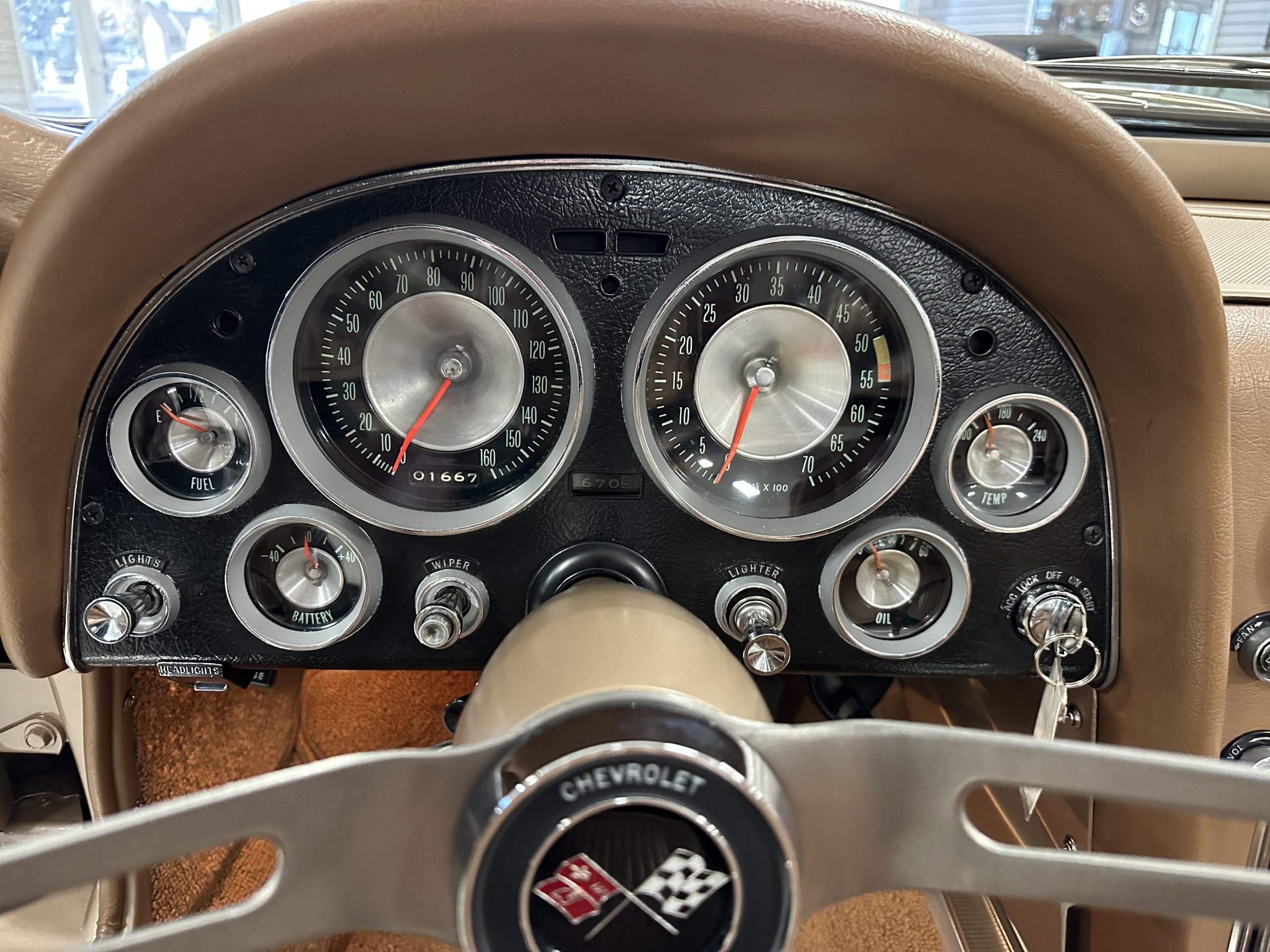 The Saddle Vinyl (Trim Code 490P) interior was also restored and appears in very nice condition. The Beige carpet appears in near new condition. The dash and steering wheel are all restored. Only the center console shows scratches from age and use while the rest of the interior is freshly restored.