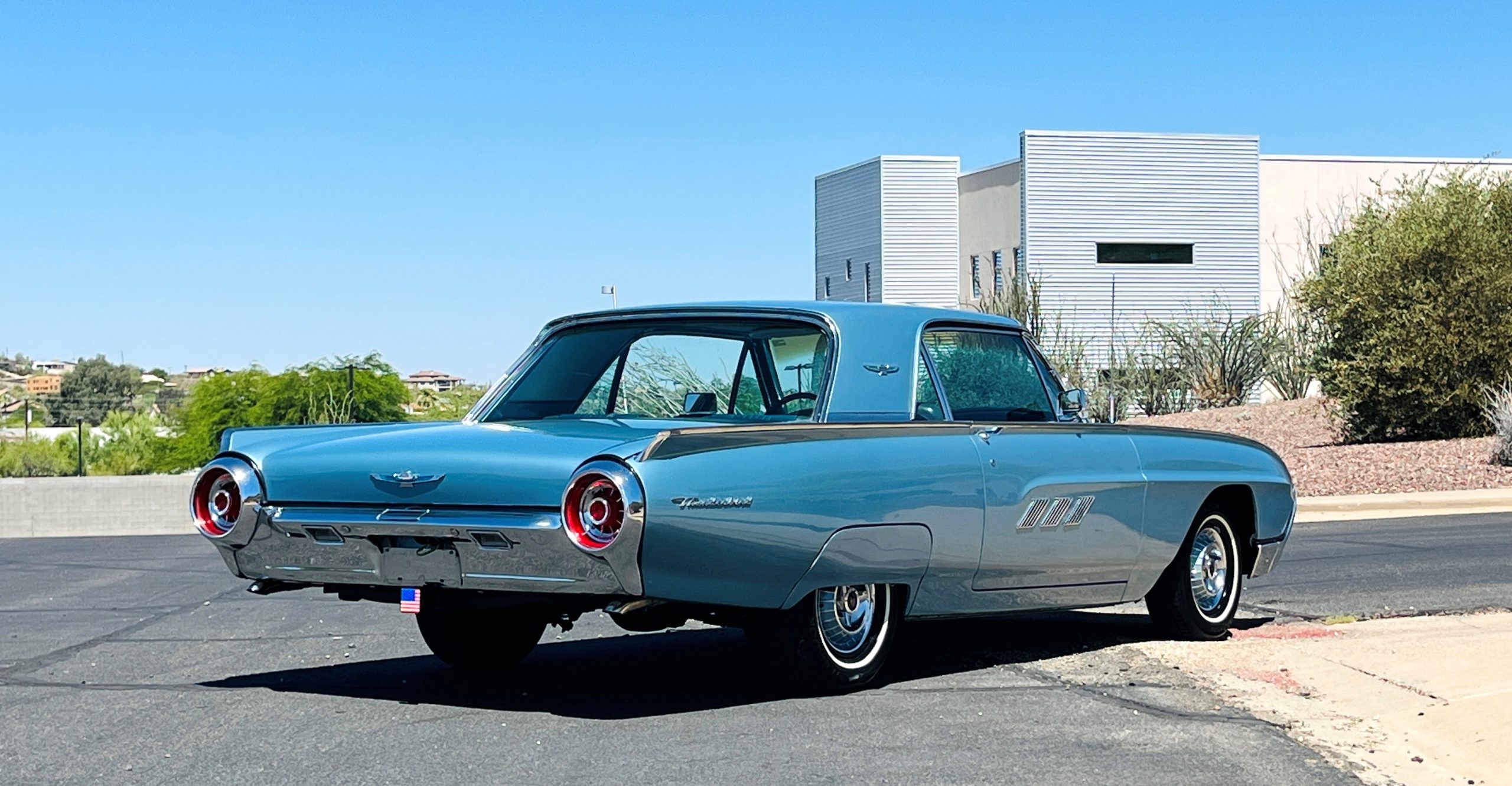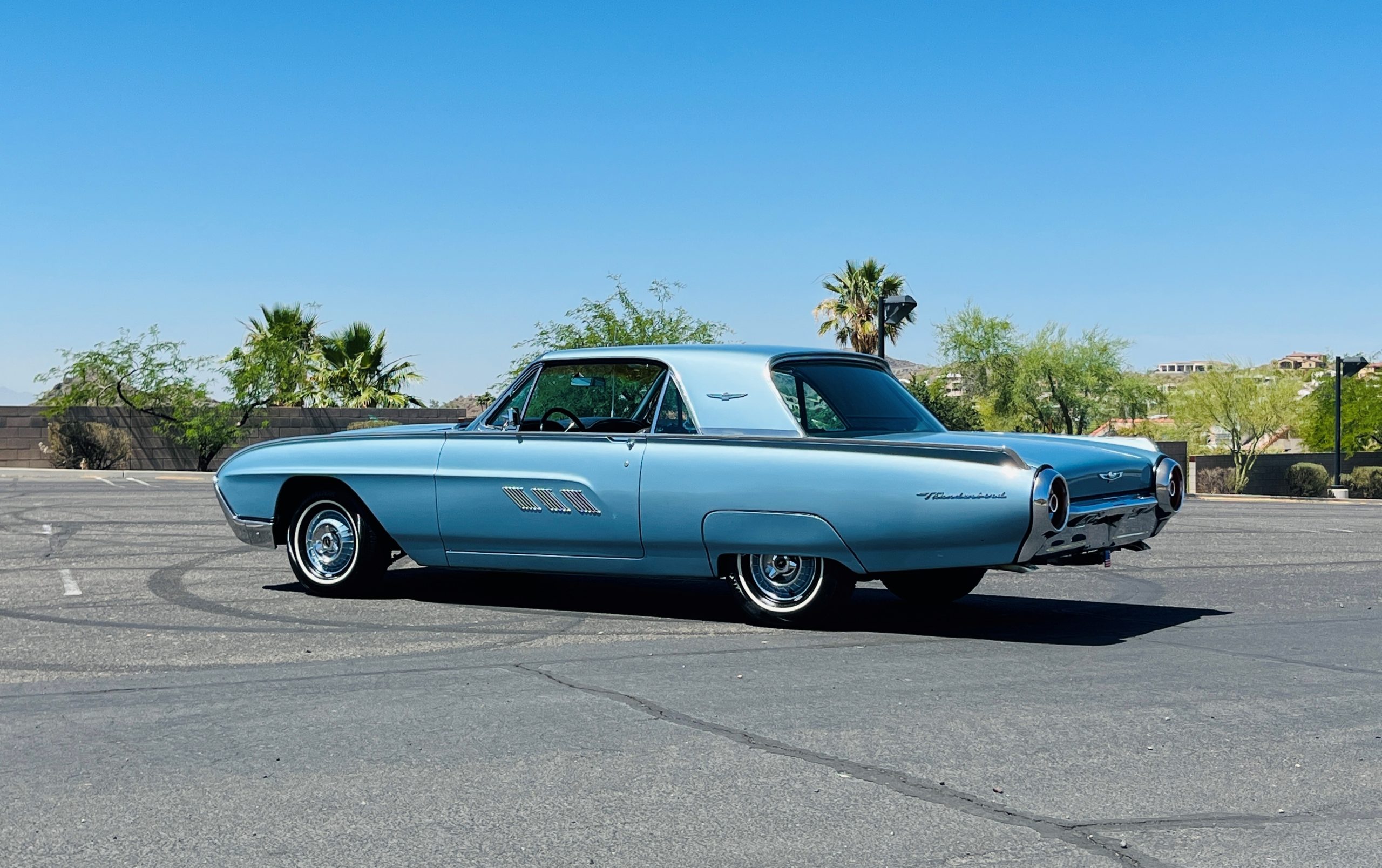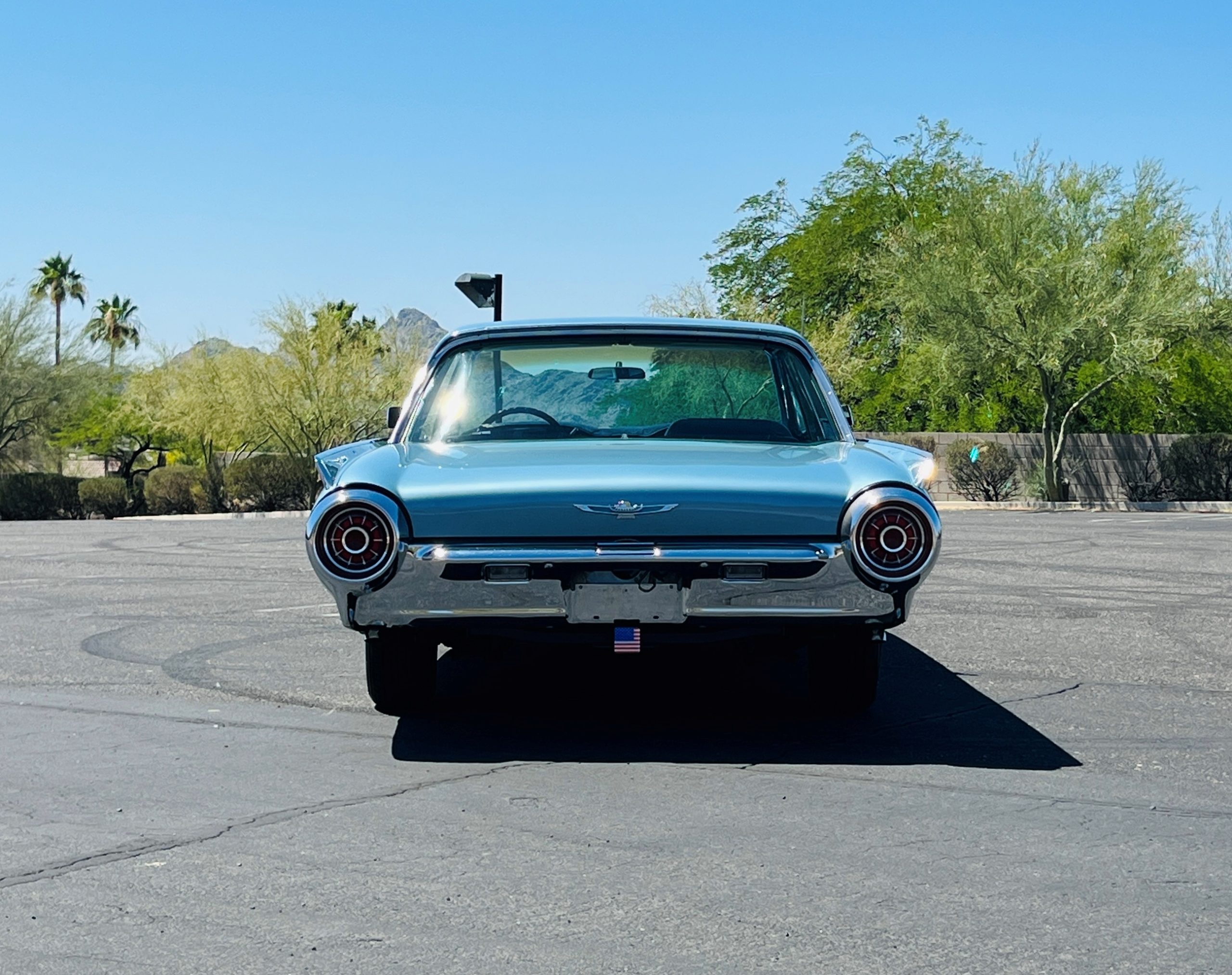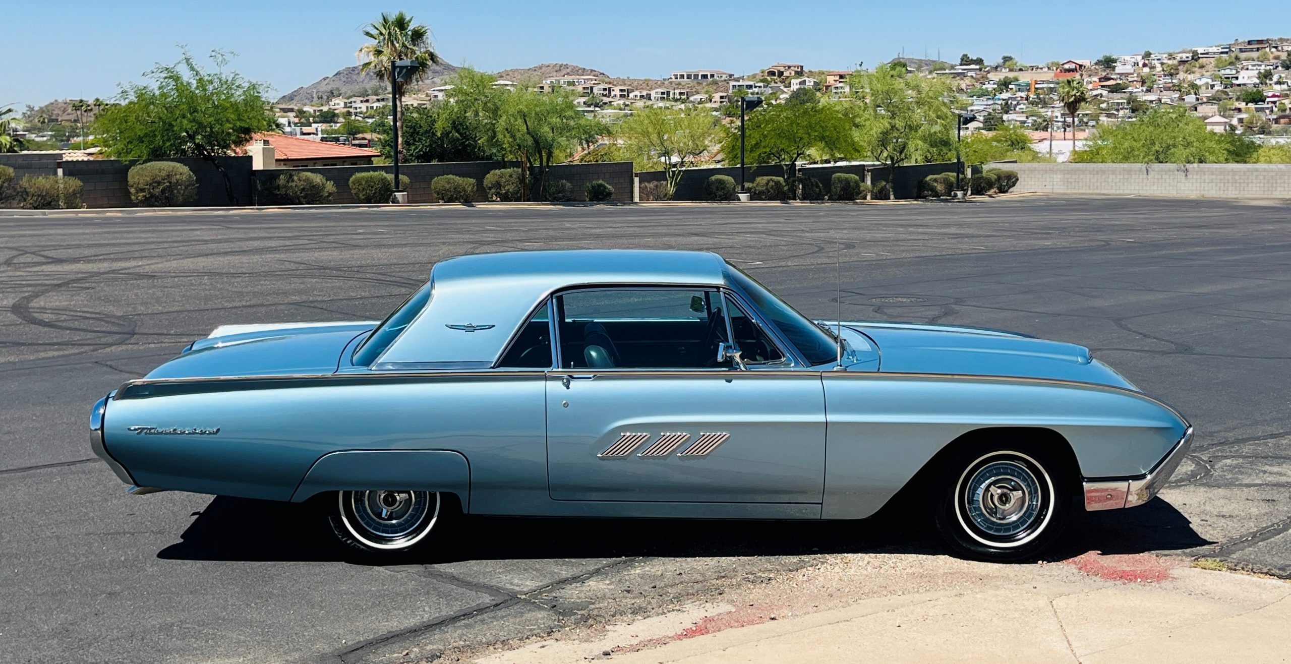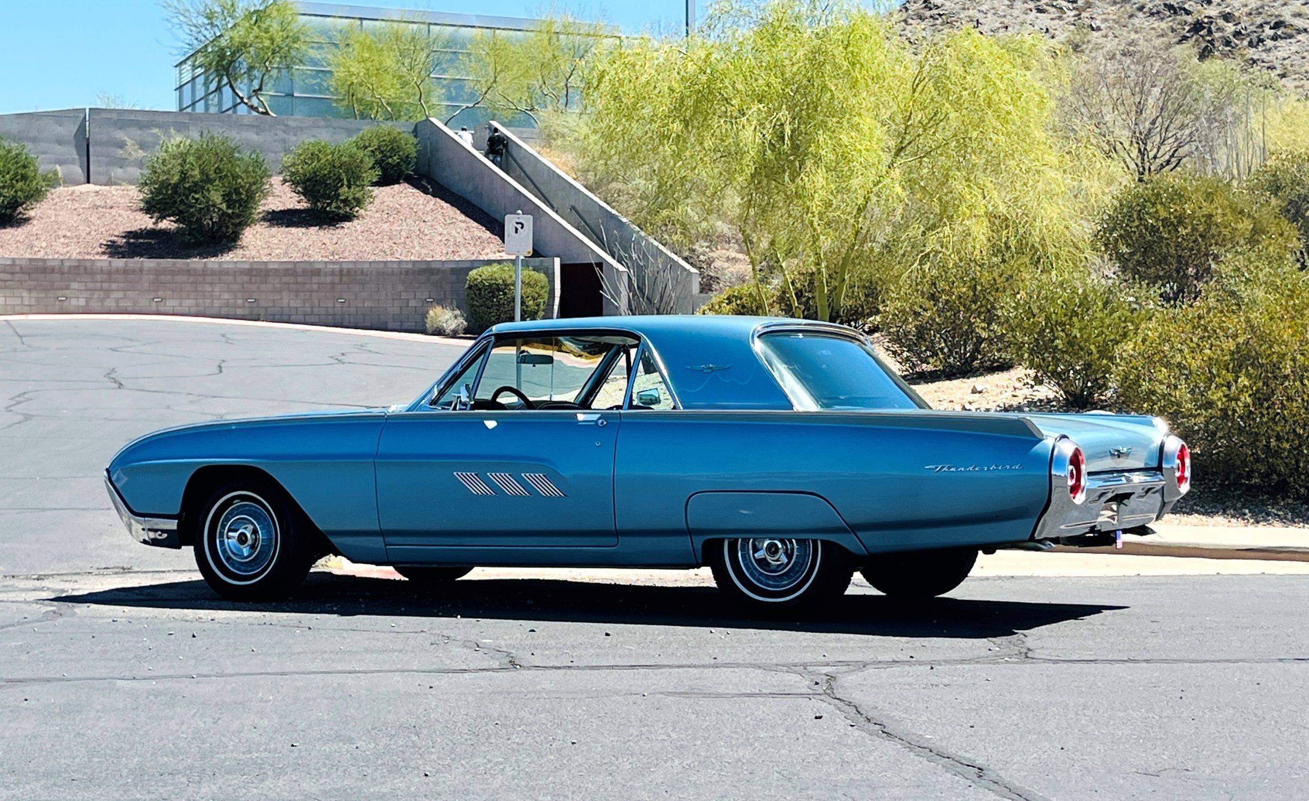 The livery originally was Acapulco Blue (Paint Code E) and now repainted with three coats of a beautiful vibrant blue that replicates Silver Mink Blue. The T-Bird’s paint is complimented with its restored painted wheel covers. Her chrome and stainless-steel trim are in overall excellent condition with only some wear showing on the rear tail lamp trim rings. All the rubber seals have been replaced and are in excellent condition. We love the Jetson’s mid-century styling of the 1963 T-Birds and this is our favorite color. It looks like a contemporary color today.