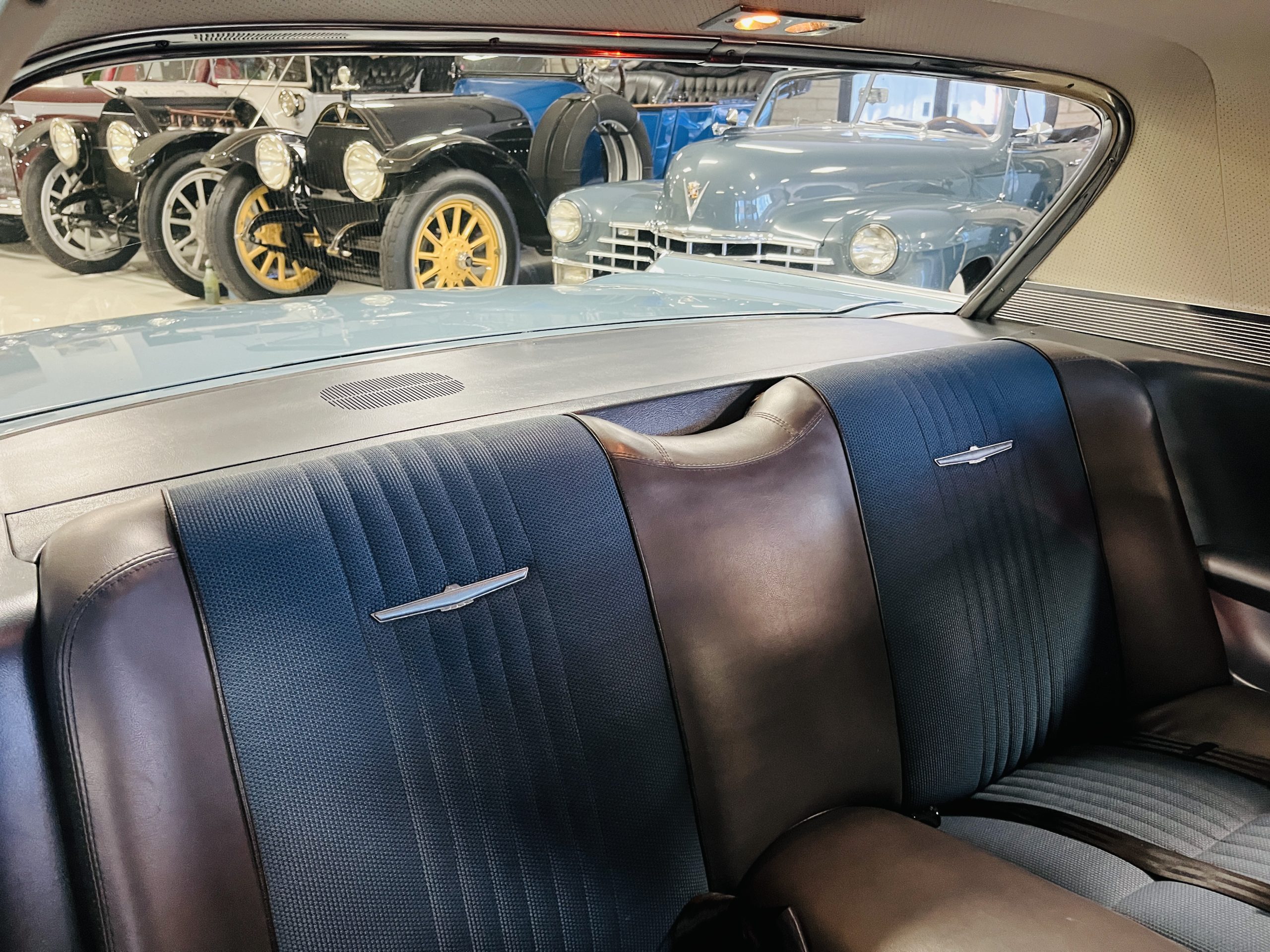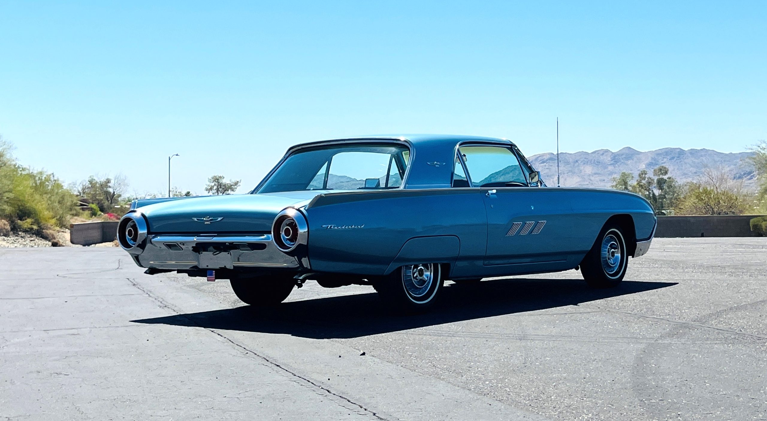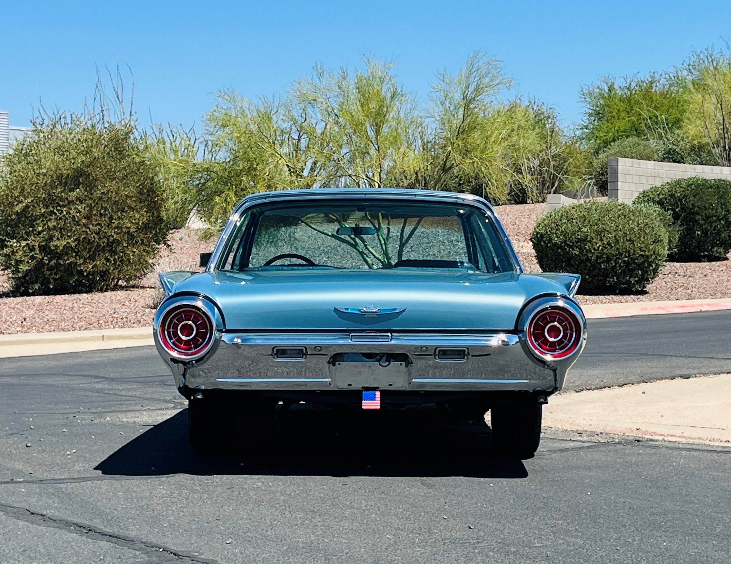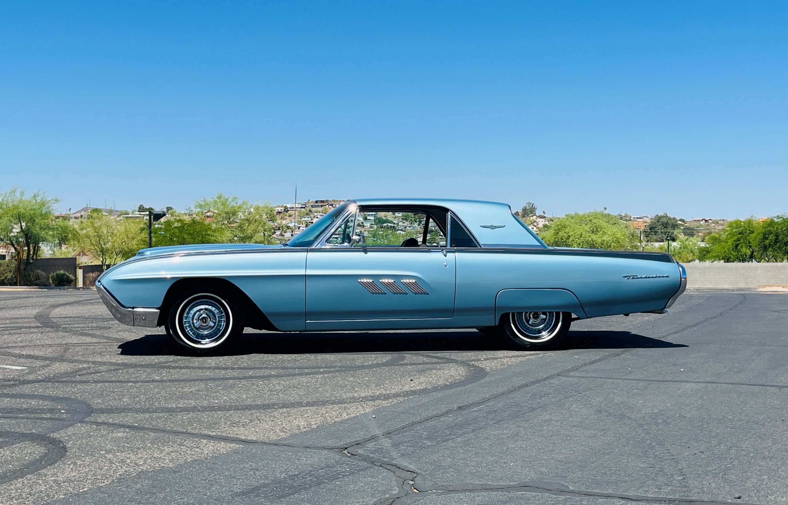 The livery originally was Acapulco Blue (Paint Code E) and now repainted with three coats of a beautiful vibrant blue that replicates Silver Mink Blue. The T-Bird’s paint is complimented with its restored painted wheel covers. Her chrome and stainless-steel trim are in overall excellent condition with only some wear showing on the rear tail lamp trim rings. All the rubber seals have been replaced and are in excellent condition. We love the Jetson’s mid-century styling of the 1963 T-Birds and this is our favorite color. It looks like a contemporary color today.