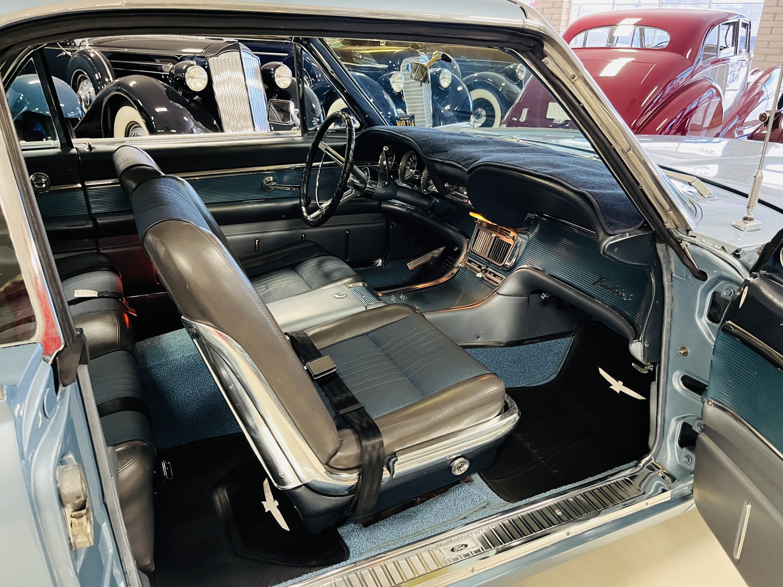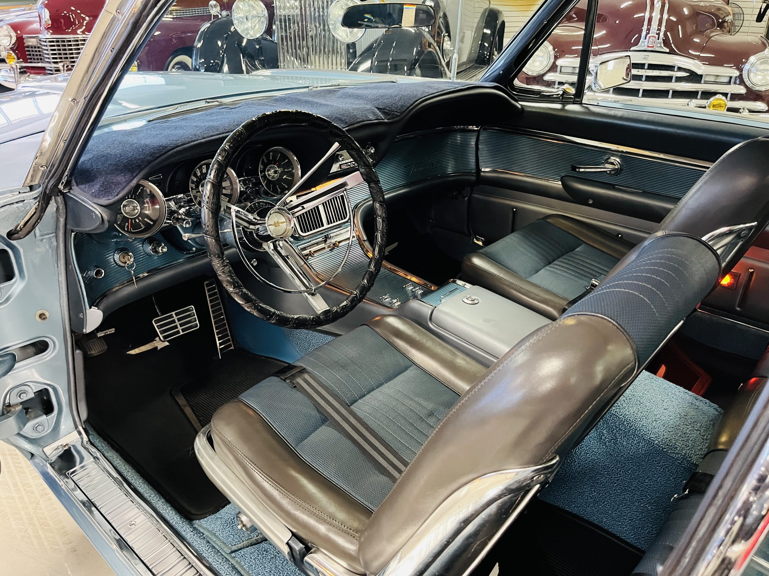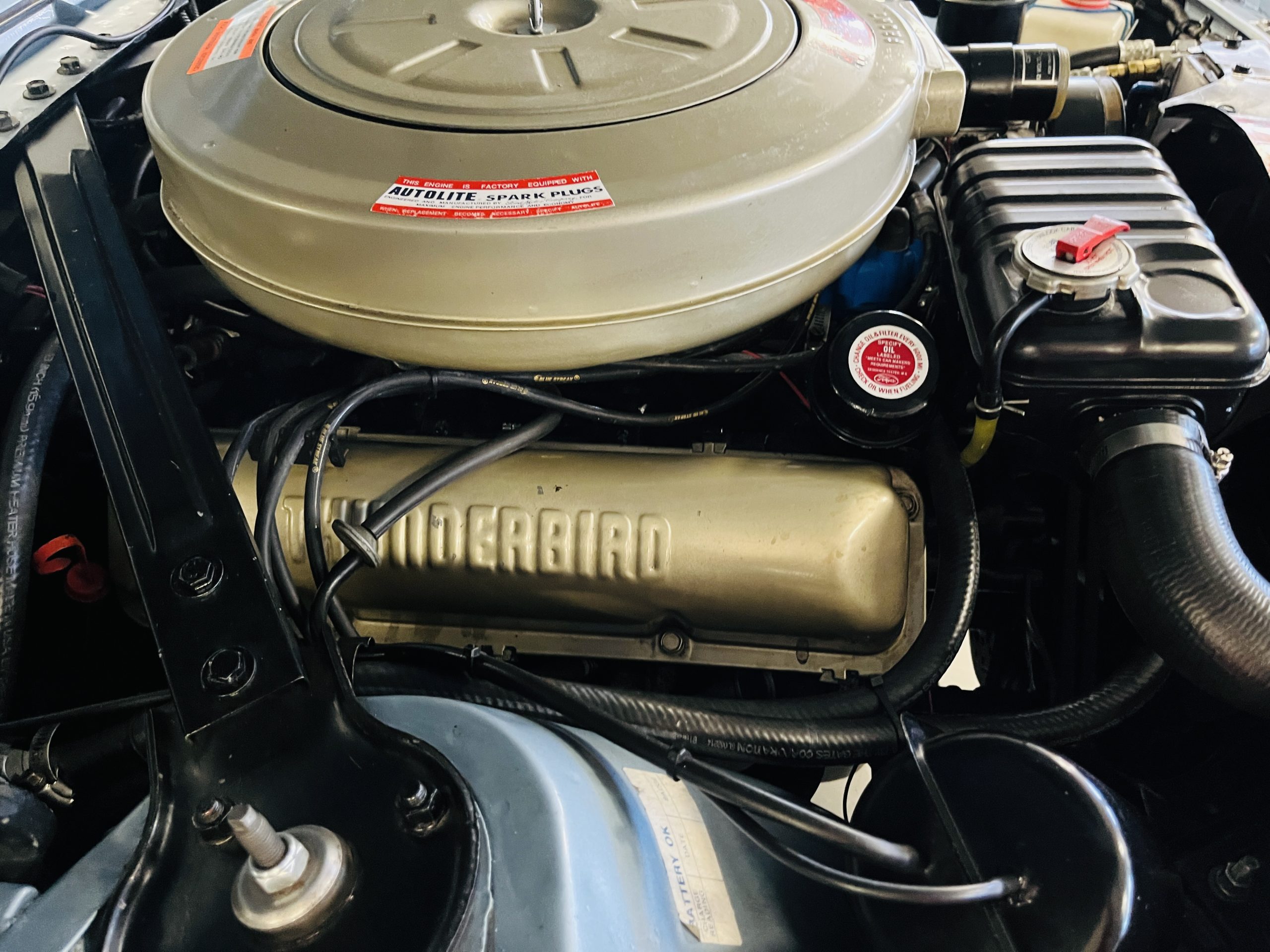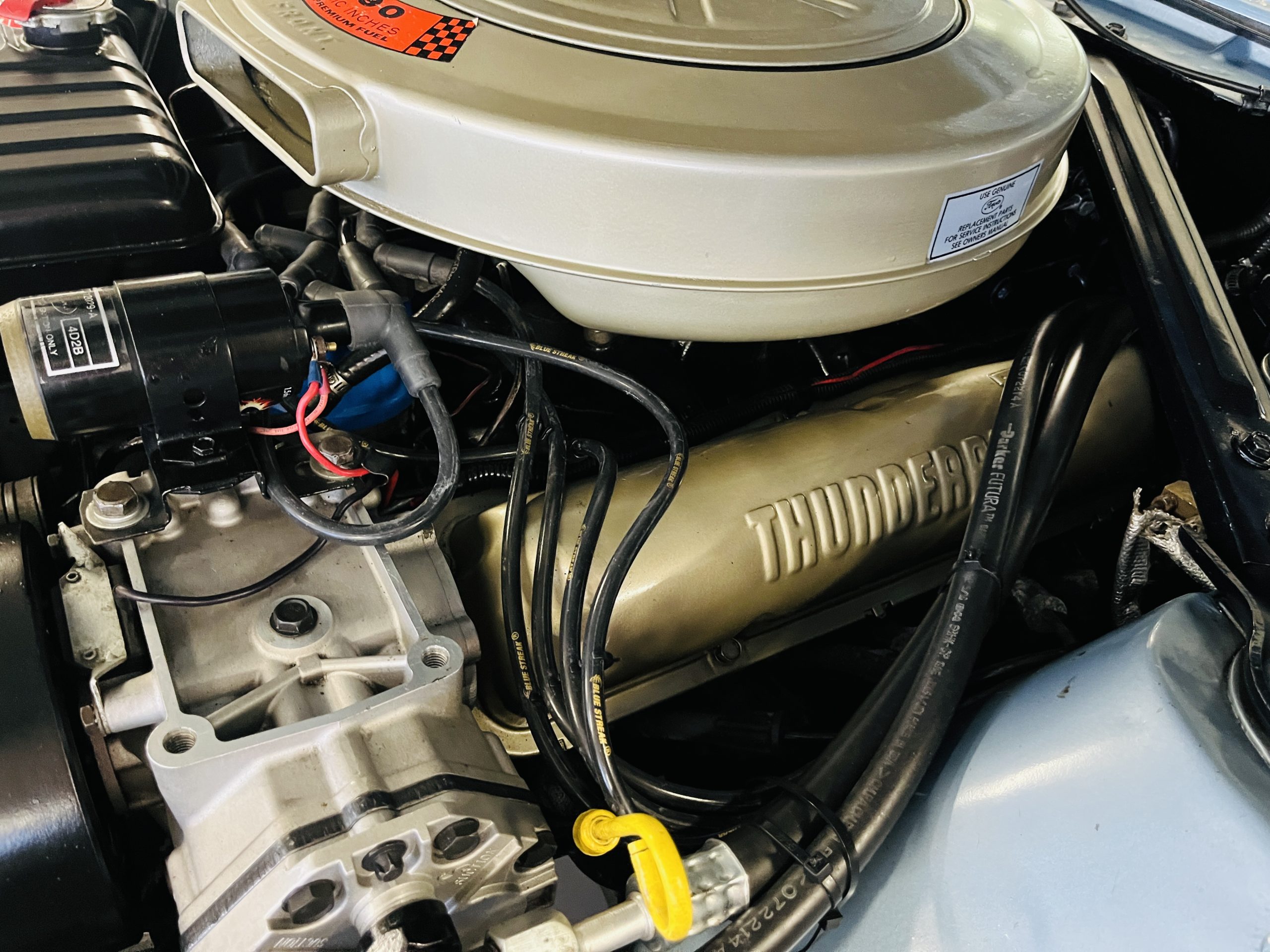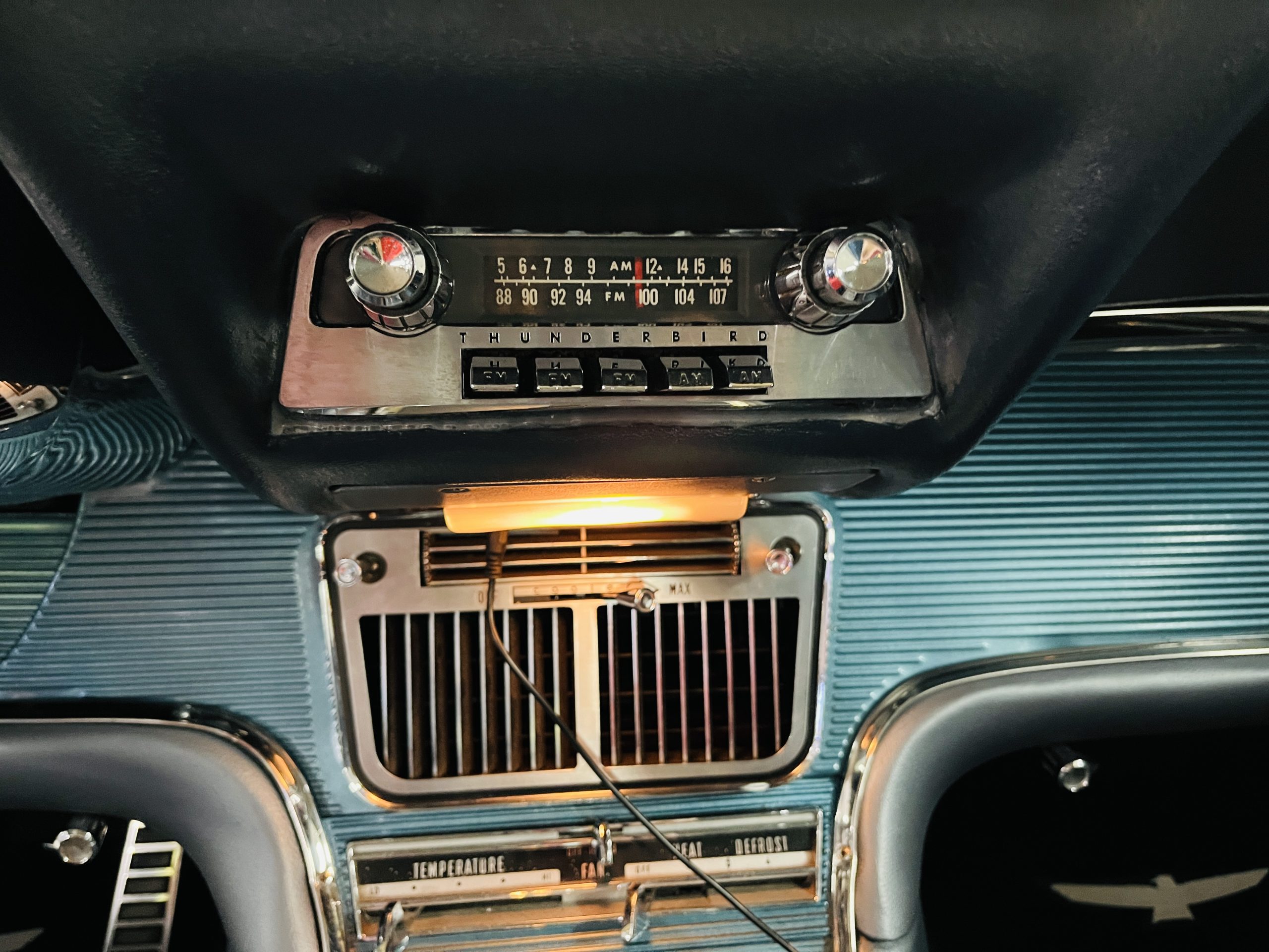 The interior has been beautifully restored from its original Medium blue crinkle vinyl and light blue Vachette vinyl (Trim Code 52) to a stunning two-tone blue and gray. There is only one small mark on the center arm rest. Otherwise, the interior is ready for show. This T-Bird is well optioned, including power windows, power steering, power brakes, power front seats and air conditioning. During the restoration, Quiet Ride anti-noise suppression was added to minimize road noise and making her truly enjoyable to drive long distances. The original radio has been restored and includes a plug-in connection for your phone or iPod. The blue carpet is in excellent condition and the black Thunderbird rubber mats are new. The dash and center console look fantastic, and all the gauges and components are working.