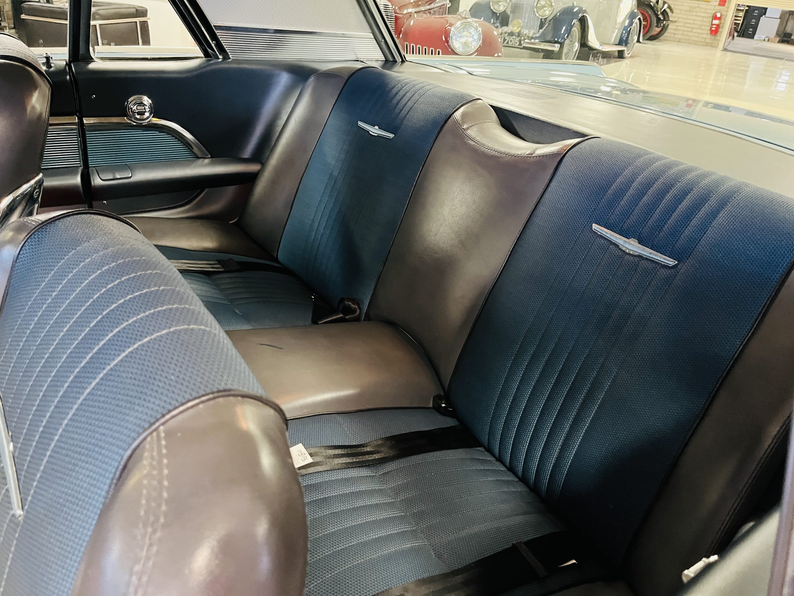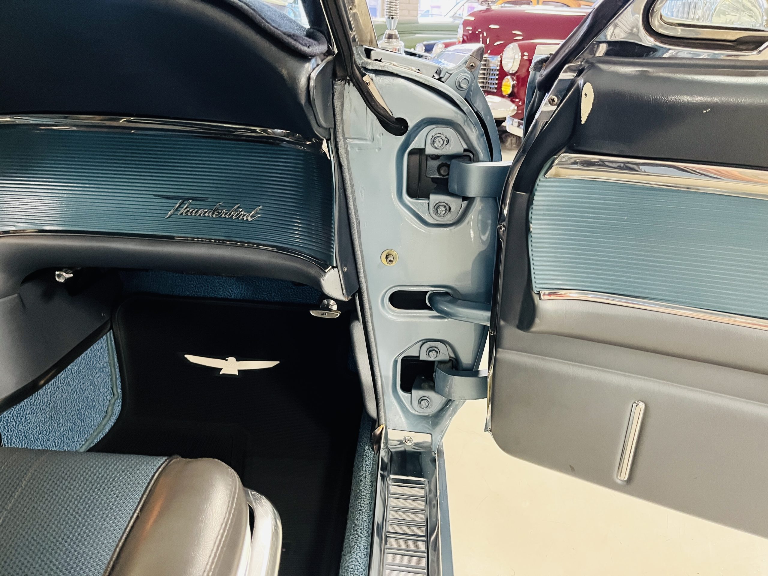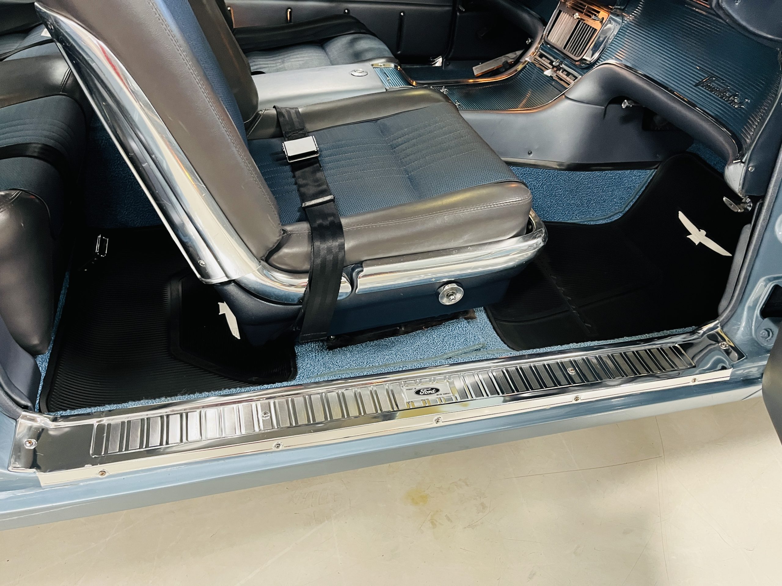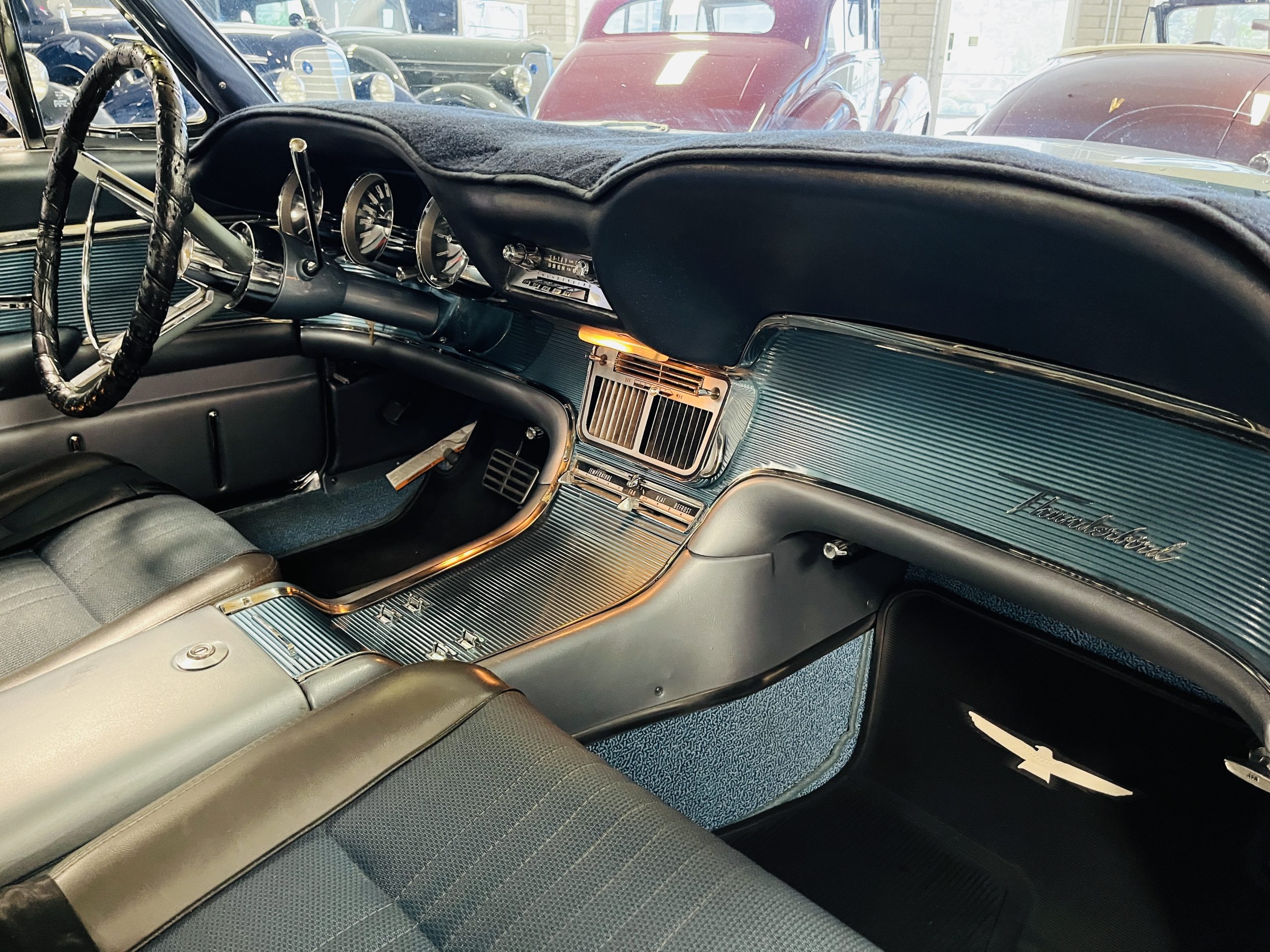 The interior has been beautifully restored from its original Medium blue crinkle vinyl and light blue Vachette vinyl (Trim Code 52) to a stunning two-tone blue and gray. There is only one small mark on the center arm rest. Otherwise, the interior is ready for show. This T-Bird is well optioned, including power windows, power steering, power brakes, power front seats and air conditioning. During the restoration, Quiet Ride anti-noise suppression was added to minimize road noise and making her truly enjoyable to drive long distances. The original radio has been restored and includes a plug-in connection for your phone or iPod. The blue carpet is in excellent condition and the black Thunderbird rubber mats are new. The dash and center console look fantastic, and all the gauges and components are working.