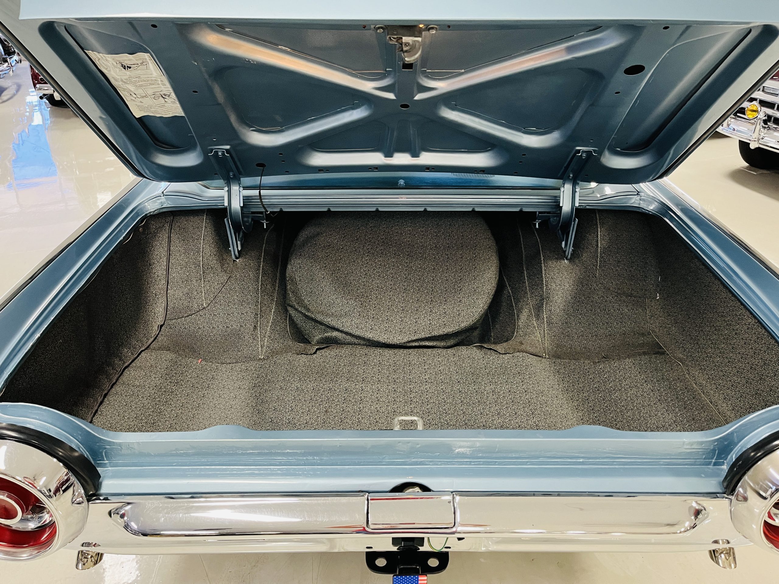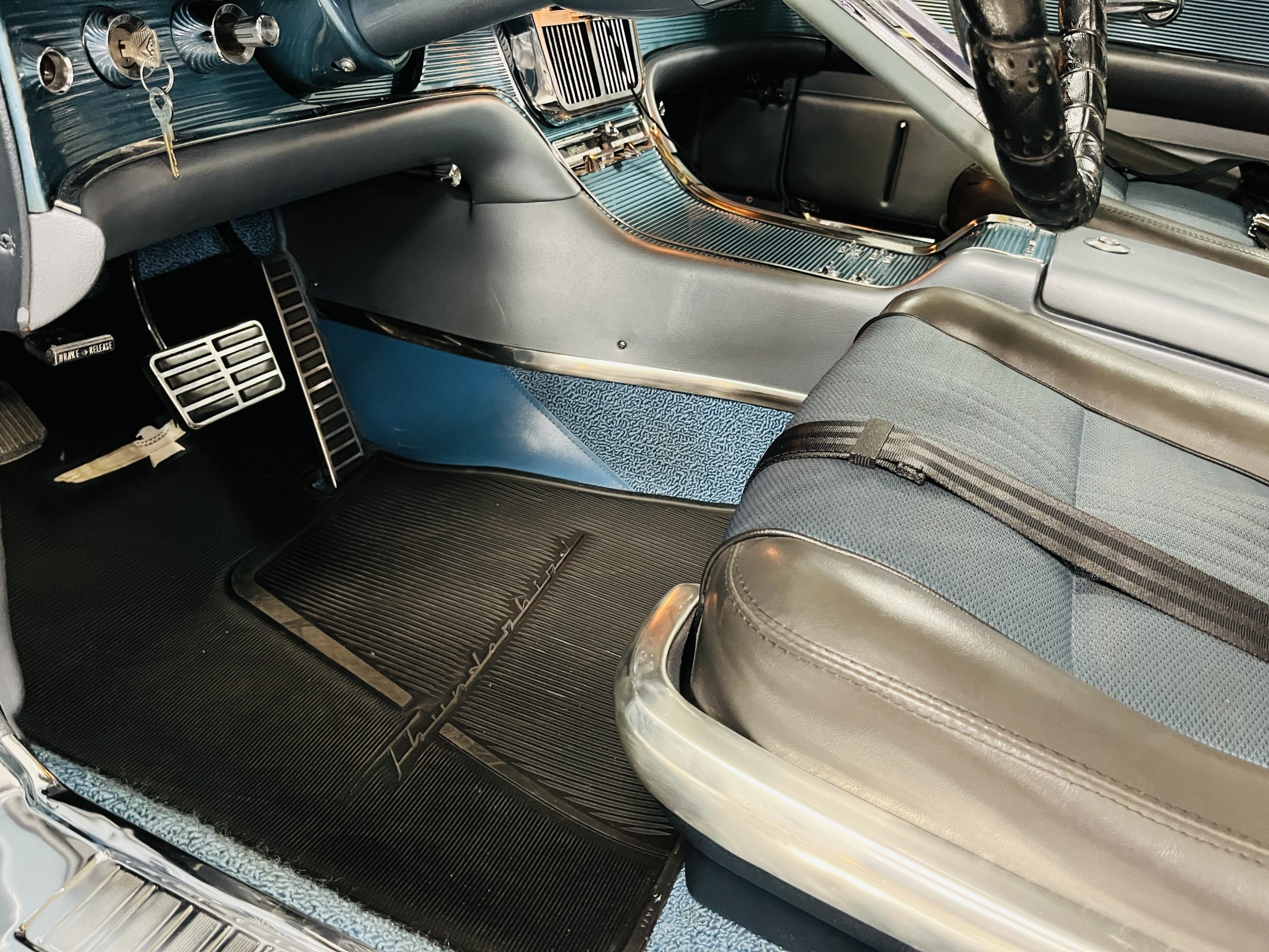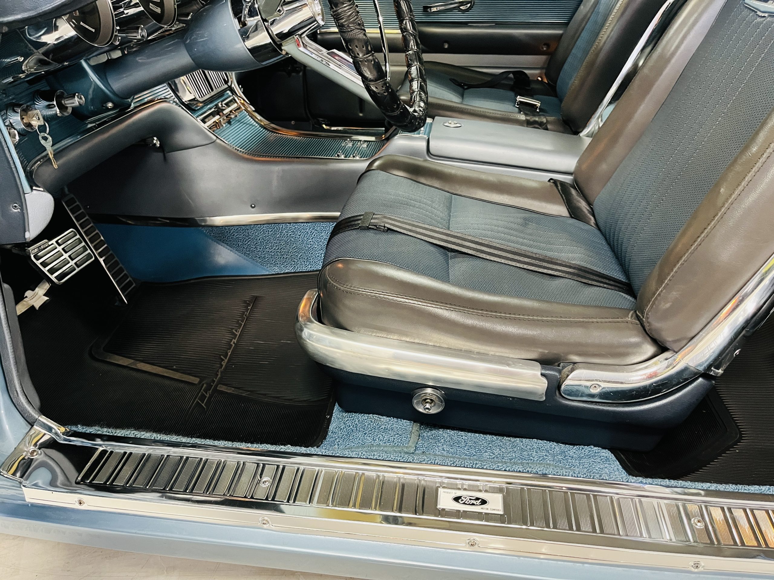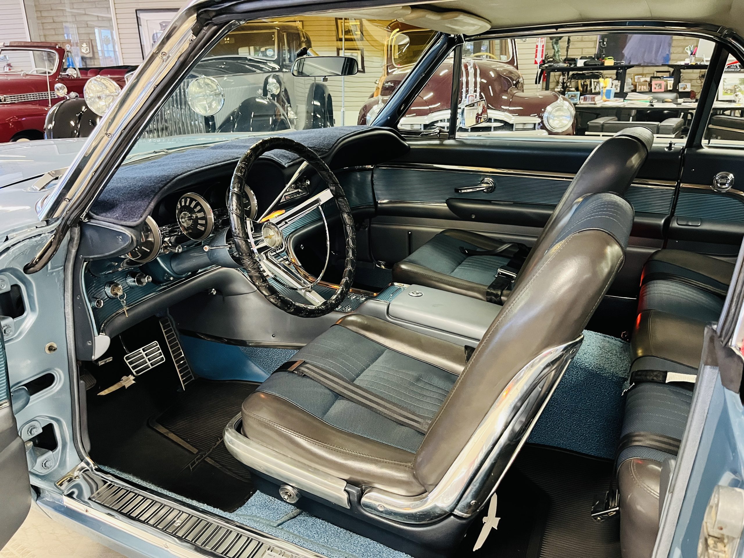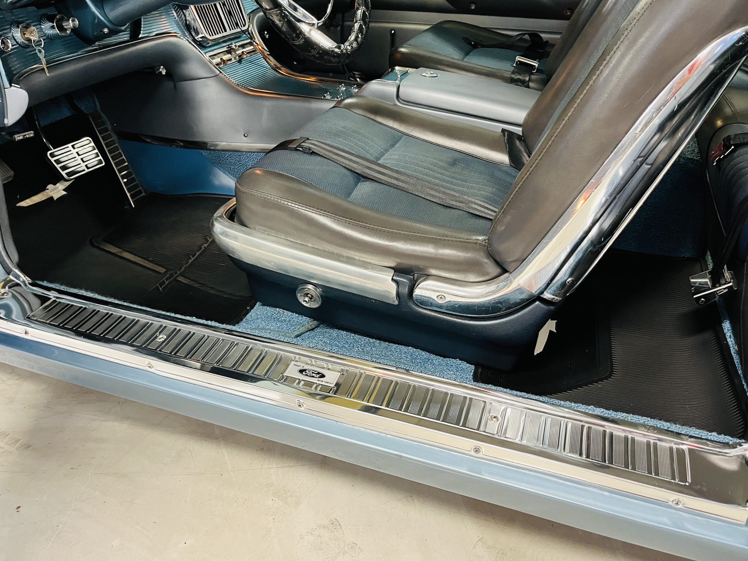 The interior has been beautifully restored from its original Medium blue crinkle vinyl and light blue Vachette vinyl (Trim Code 52) to a stunning two-tone blue and gray. There is only one small mark on the center arm rest. Otherwise, the interior is ready for show. This T-Bird is well optioned, including power windows, power steering, power brakes, power front seats and air conditioning. During the restoration, Quiet Ride anti-noise suppression was added to minimize road noise and making her truly enjoyable to drive long distances. The original radio has been restored and includes a plug-in connection for your phone or iPod. The blue carpet is in excellent condition and the black Thunderbird rubber mats are new. The dash and center console look fantastic, and all the gauges and components are working.