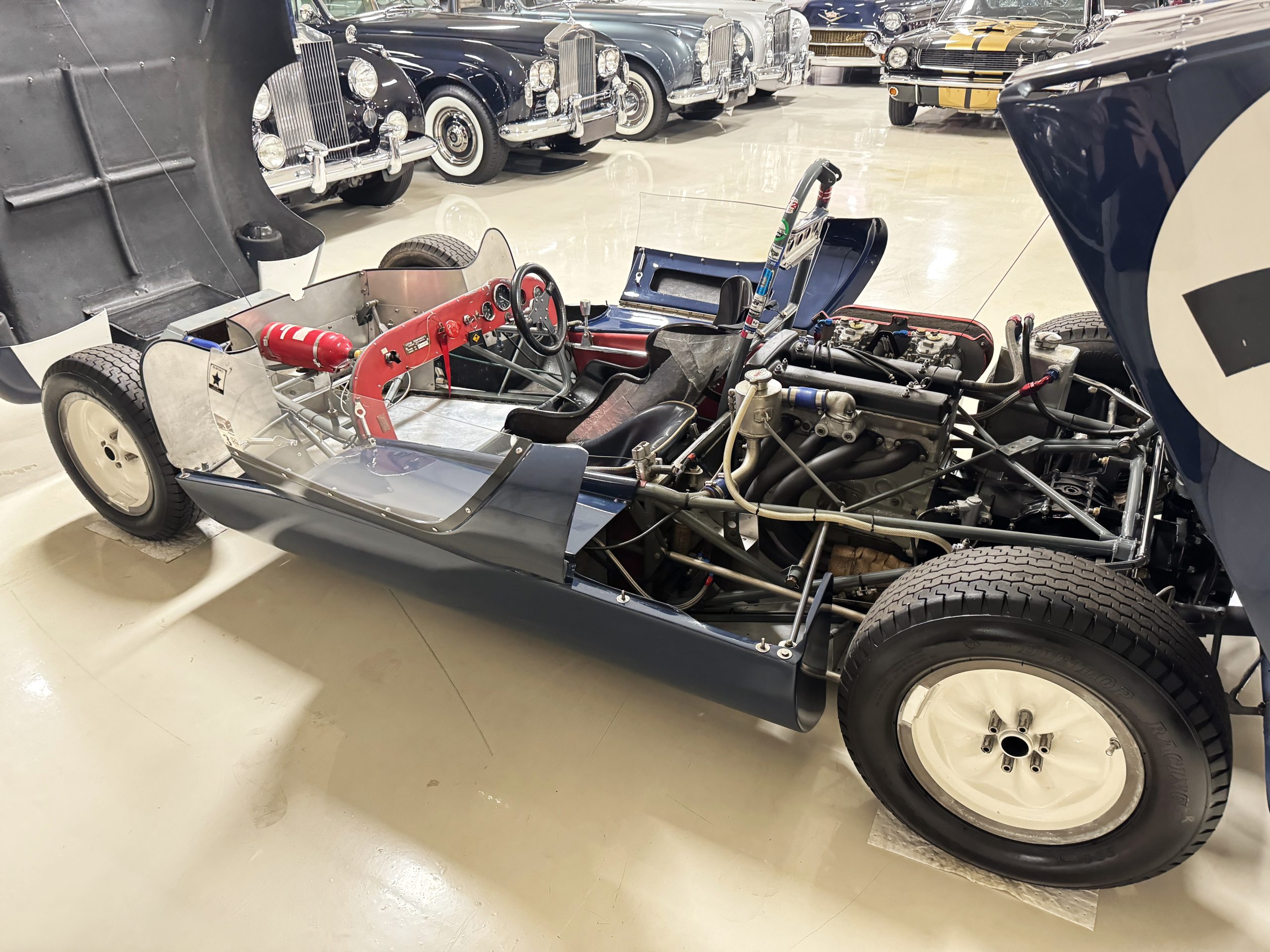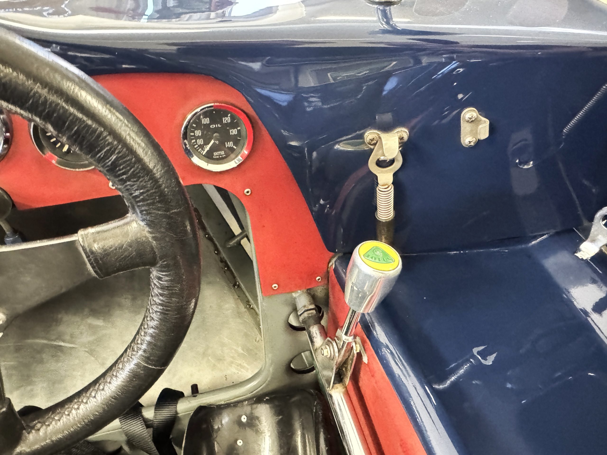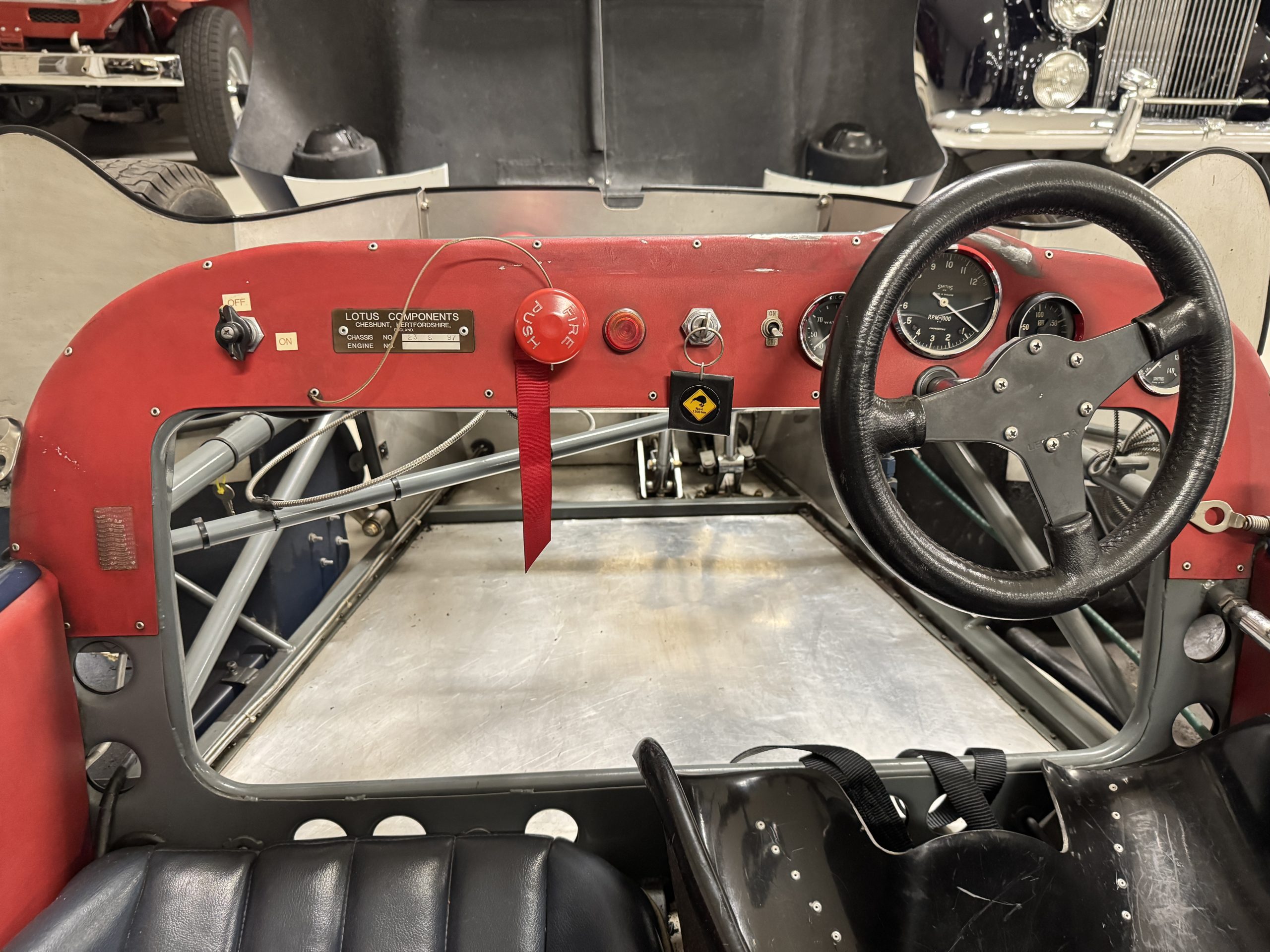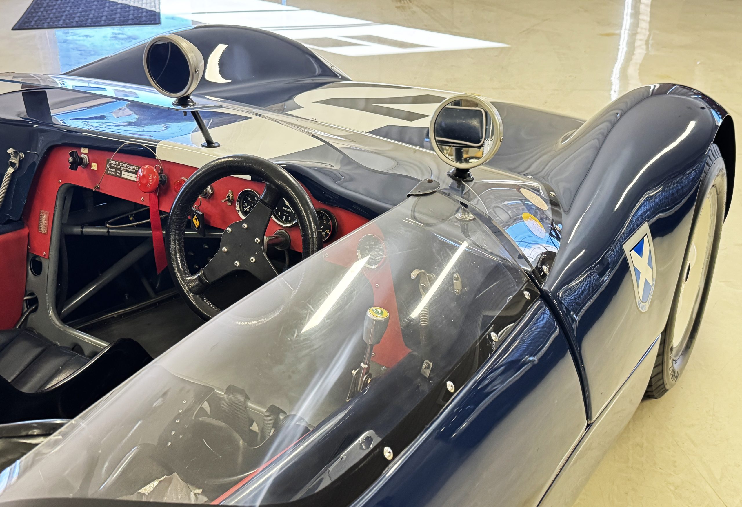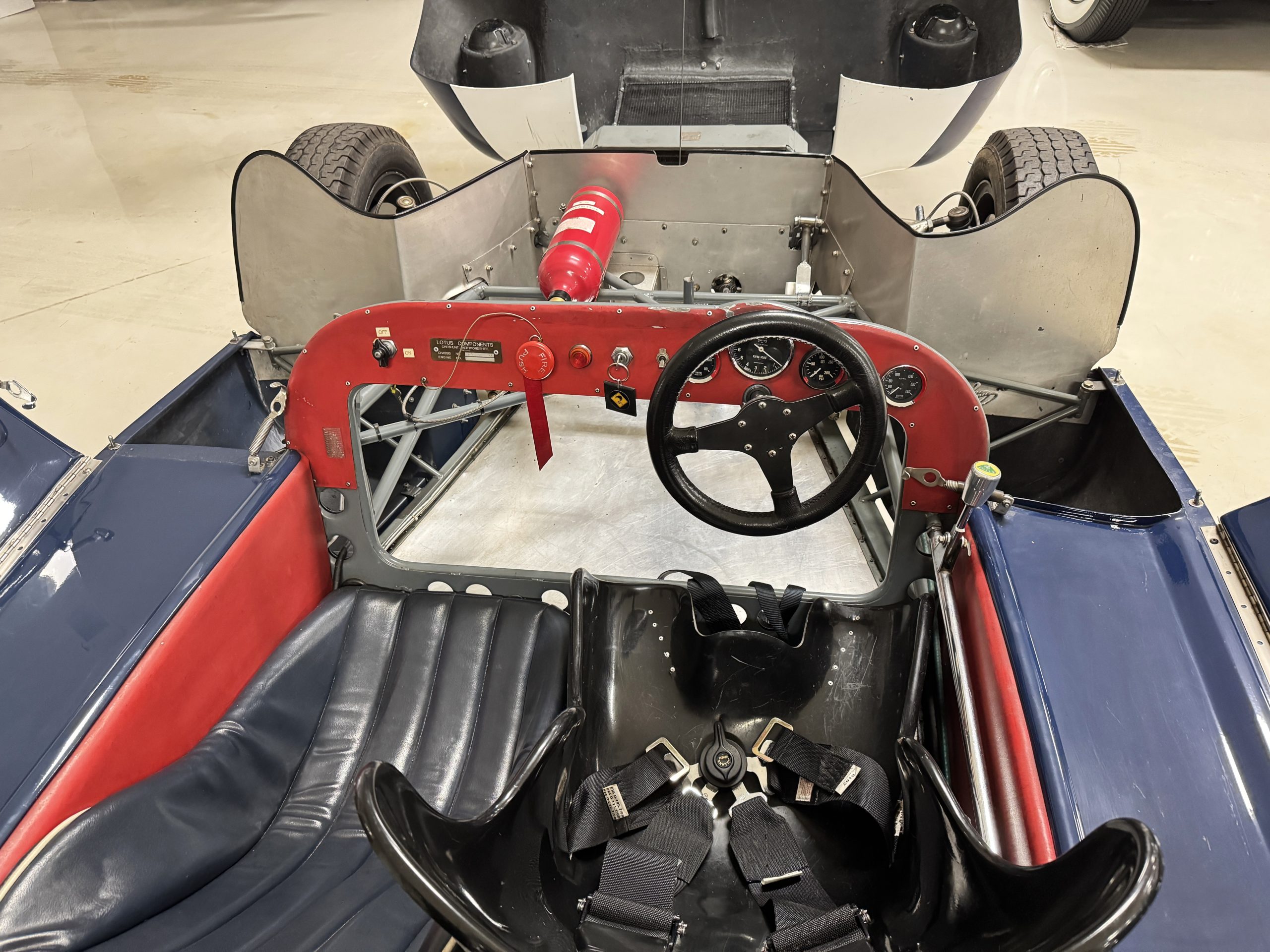 Inside, the Lotus retains its original minimalist focus on function. The right-hand-drive cockpit features a single black carbon fiber racing bucket seat with a five-point harness alongside a dark blue upholstered passenger seat in period correct presentation, functional Smiths instrumentation, a Hobbs engine hour meter, and a right-mounted gear lever, all configured for balance and immediate feedback. The simplicity of the cockpit underscores the Lotus’ singular purpose: connecting driver to machine with no excess. Dual side mirrors and a three-point chrome roll bar with an integrated dark blue headrest provide both practicality and safety without detracting from the period-correct presentation.