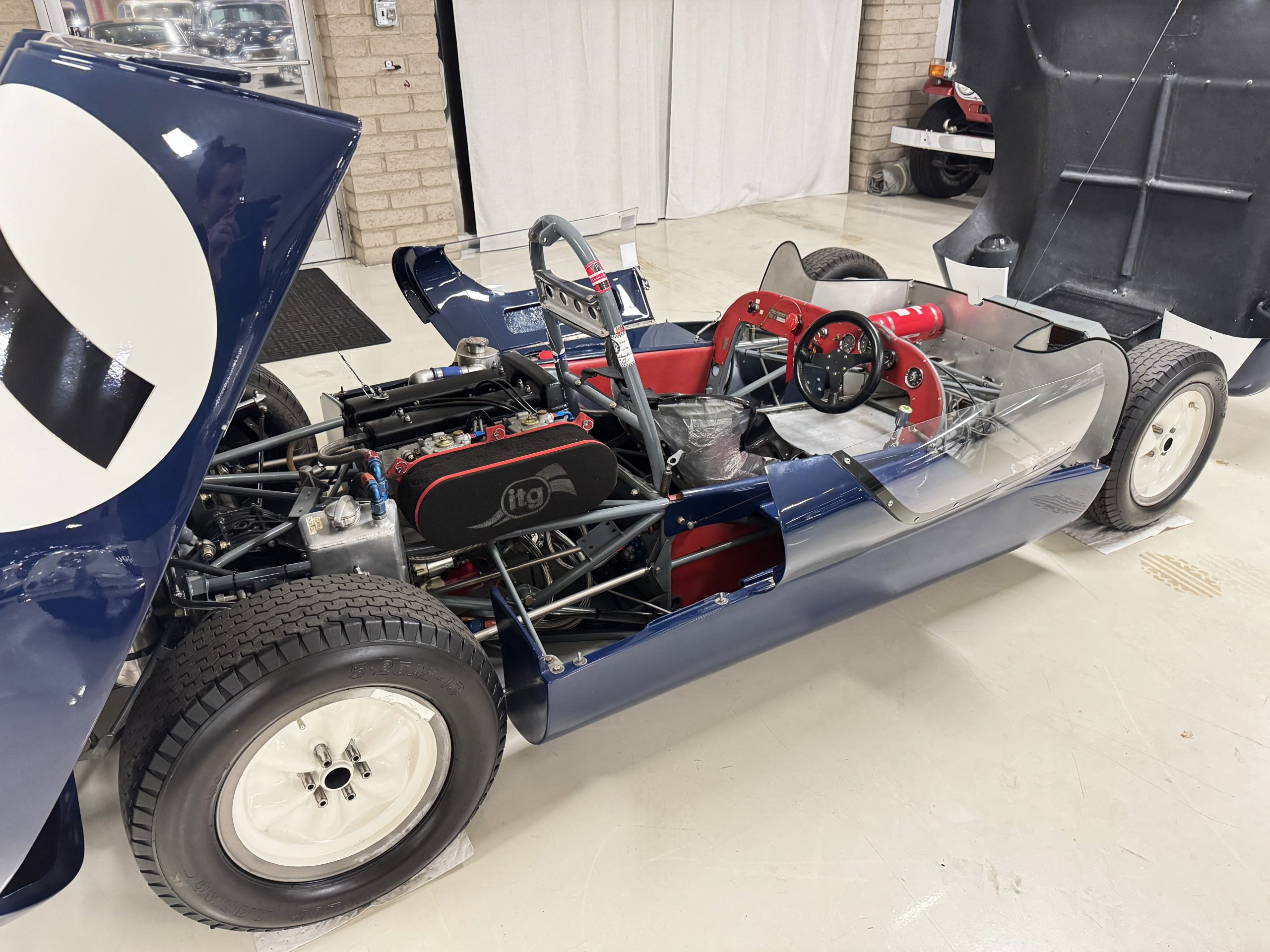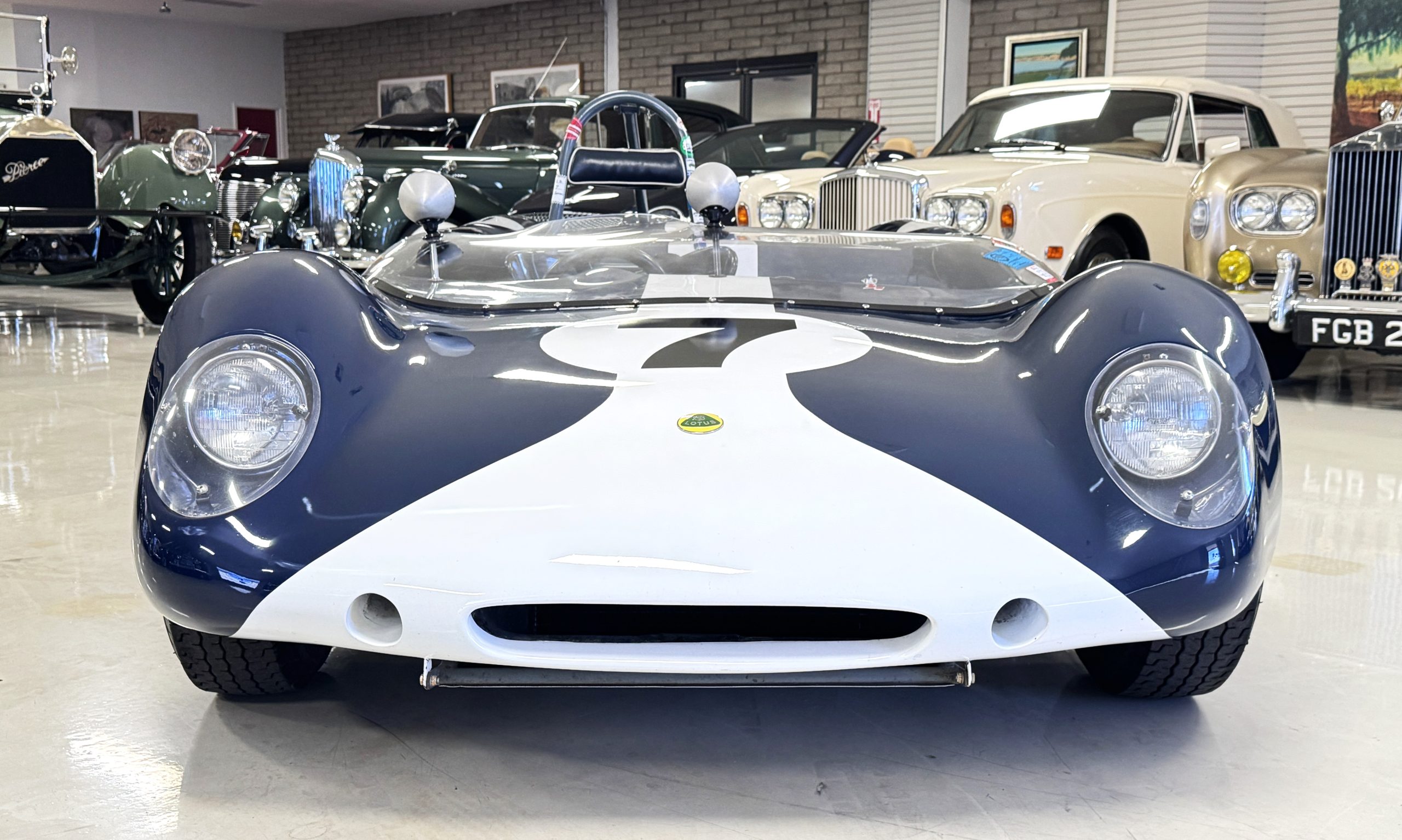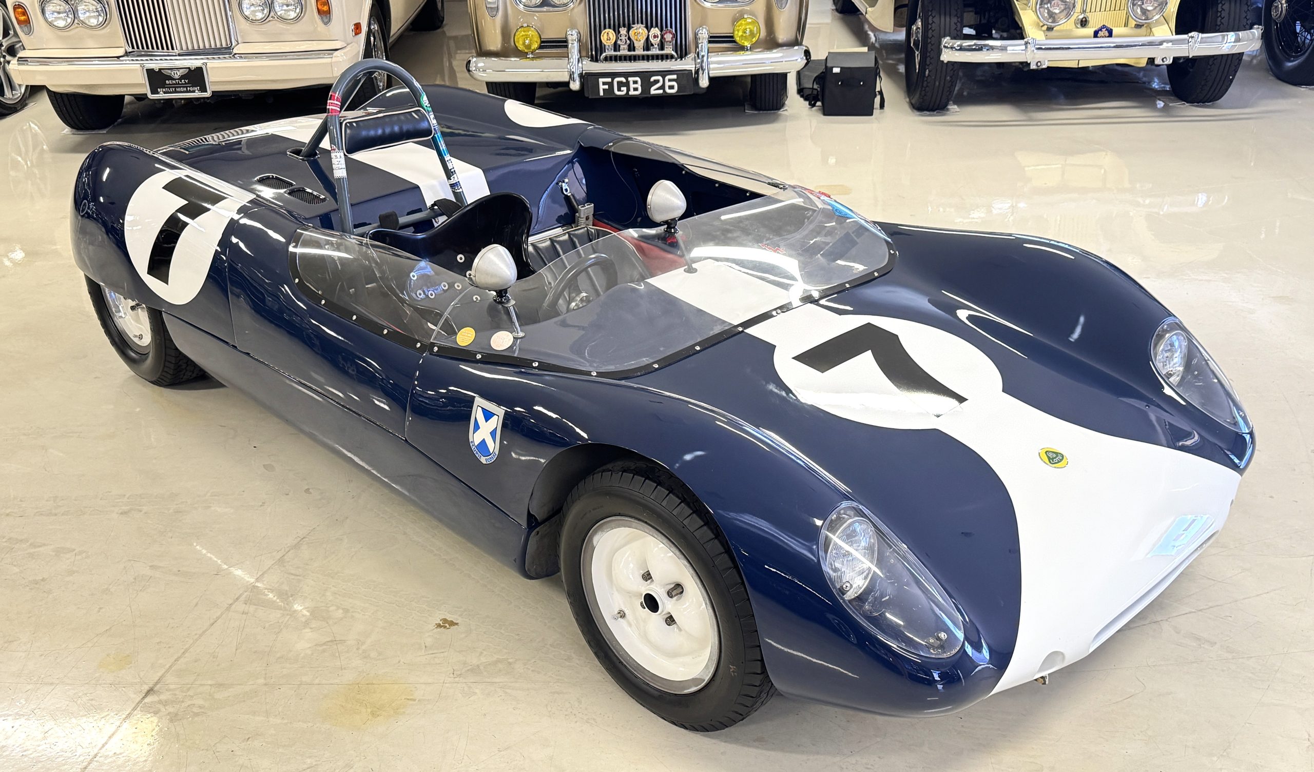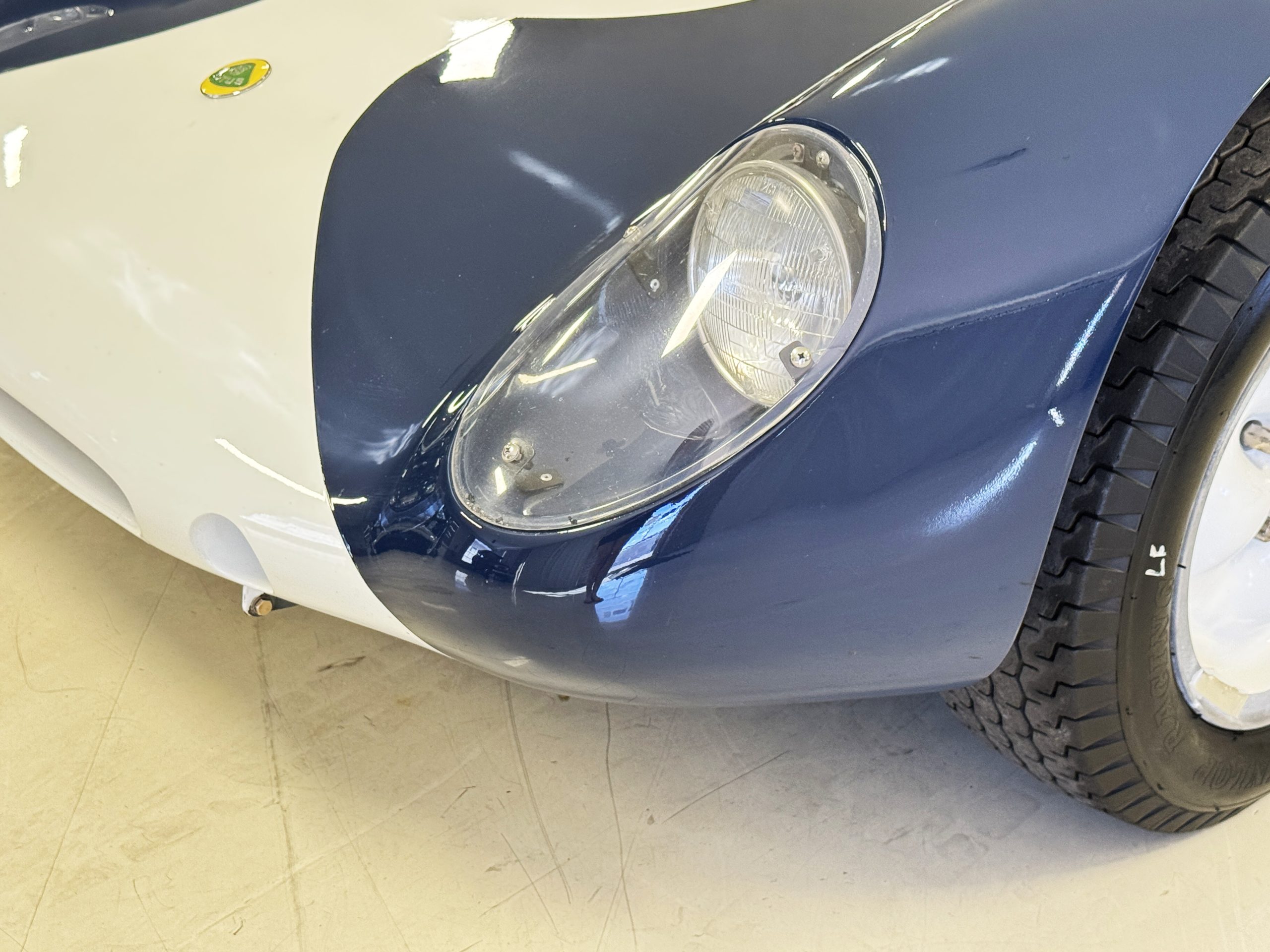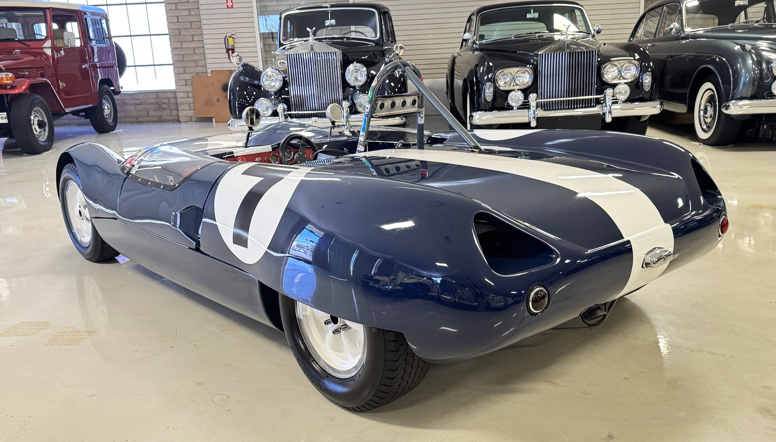 Inside, the Lotus retains its original minimalist focus on function. The right-hand-drive cockpit features a single black carbon fiber racing bucket seat with a five-point harness alongside a dark blue upholstered passenger seat in period correct presentation, functional Smiths instrumentation, a Hobbs engine hour meter, and a right-mounted gear lever, all configured for balance and immediate feedback. The simplicity of the cockpit underscores the Lotus’ singular purpose: connecting driver to machine with no excess. Dual side mirrors and a three-point chrome roll bar with an integrated dark blue headrest provide both practicality and safety without detracting from the period-correct presentation.