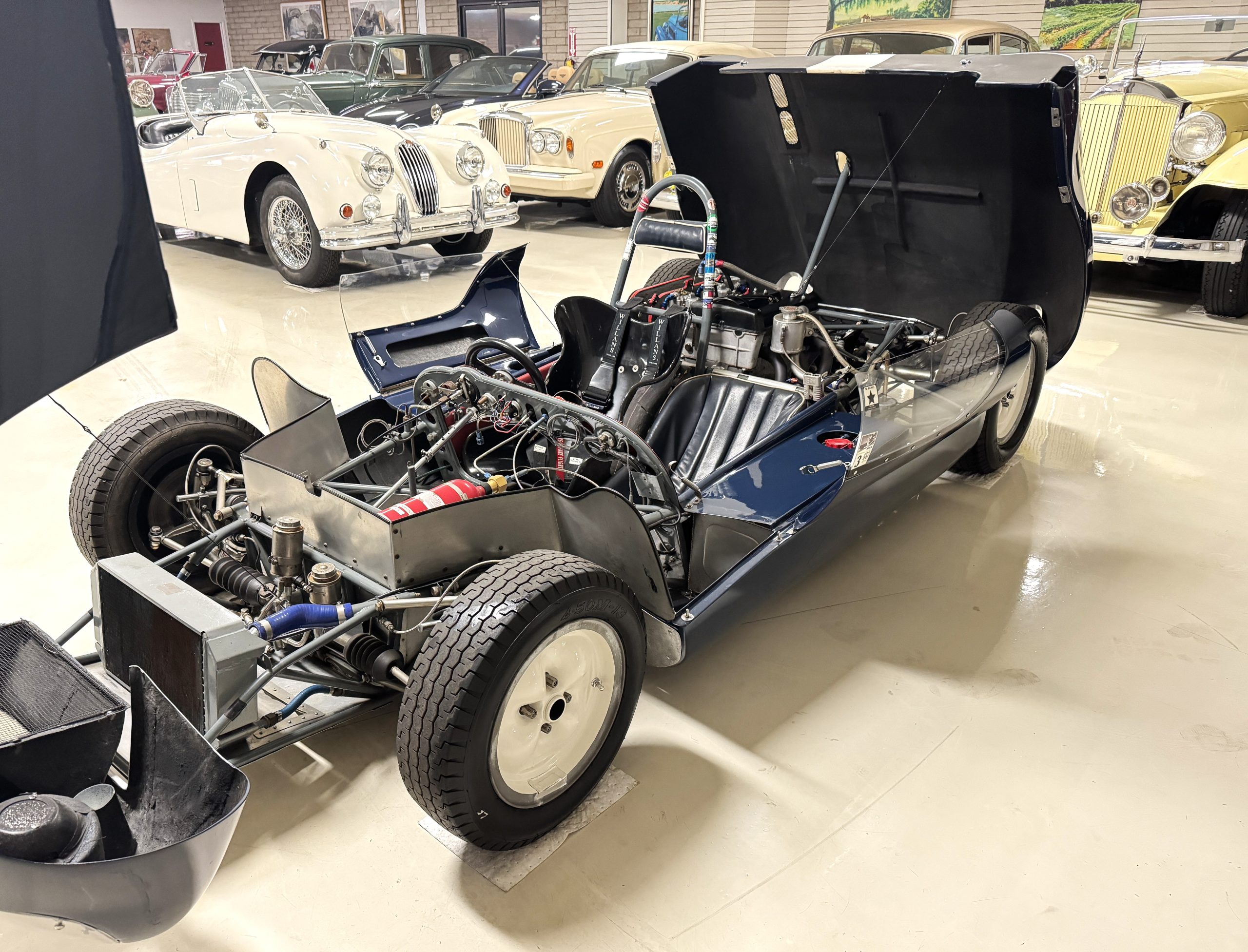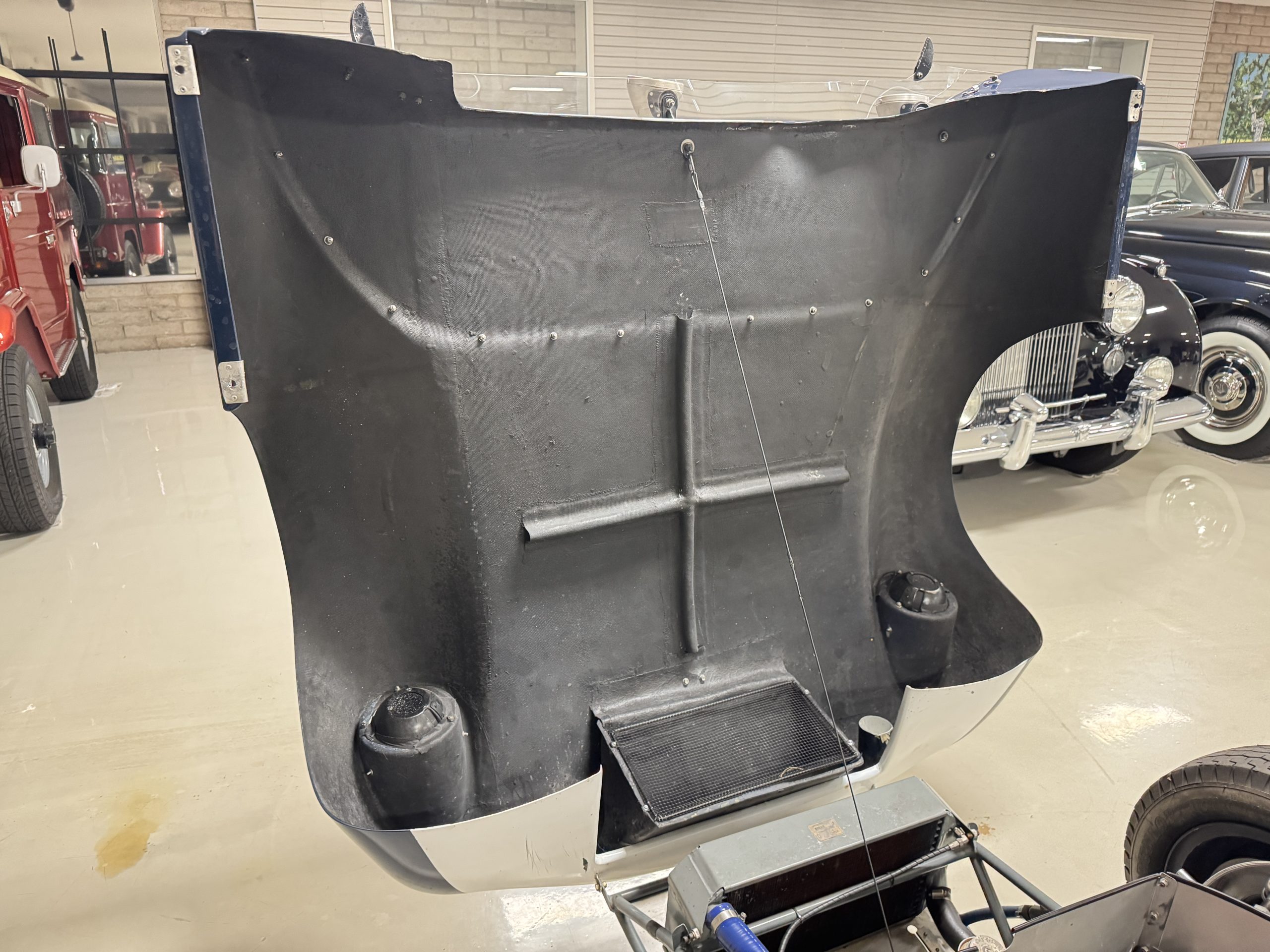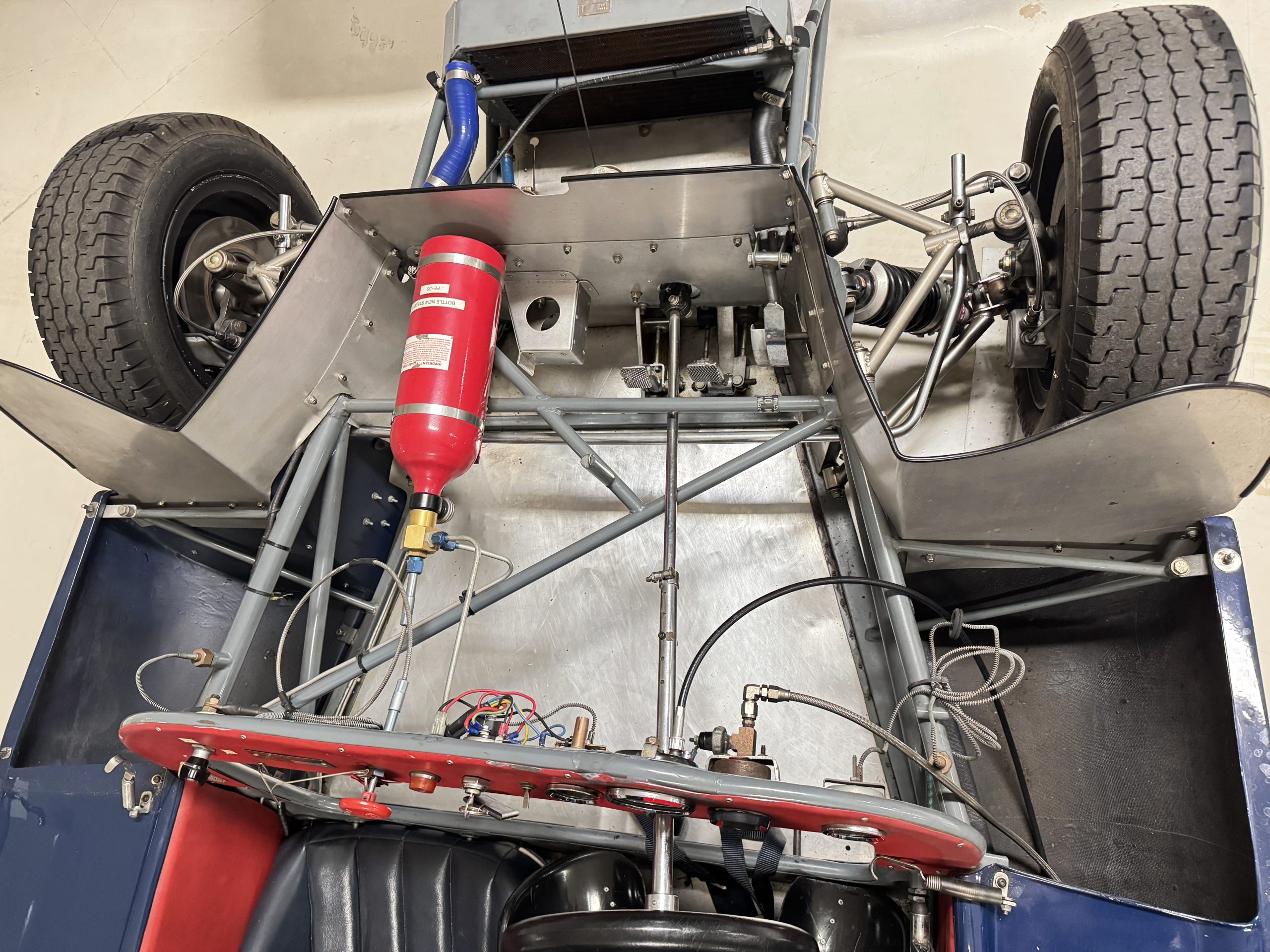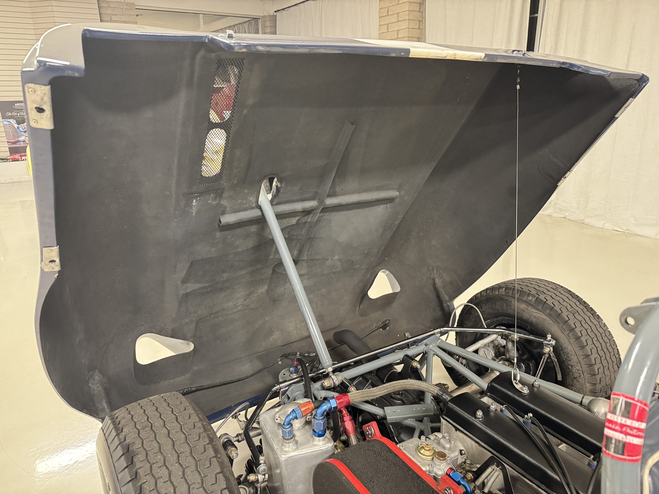 Inside, the Lotus retains its original minimalist focus on function. The right-hand-drive cockpit features a single black carbon fiber racing bucket seat with a five-point harness alongside a dark blue upholstered passenger seat in period correct presentation, functional Smiths instrumentation, a Hobbs engine hour meter, and a right-mounted gear lever, all configured for balance and immediate feedback. The simplicity of the cockpit underscores the Lotus’ singular purpose: connecting driver to machine with no excess. Dual side mirrors and a three-point chrome roll bar with an integrated dark blue headrest provide both practicality and safety without detracting from the period-correct presentation.