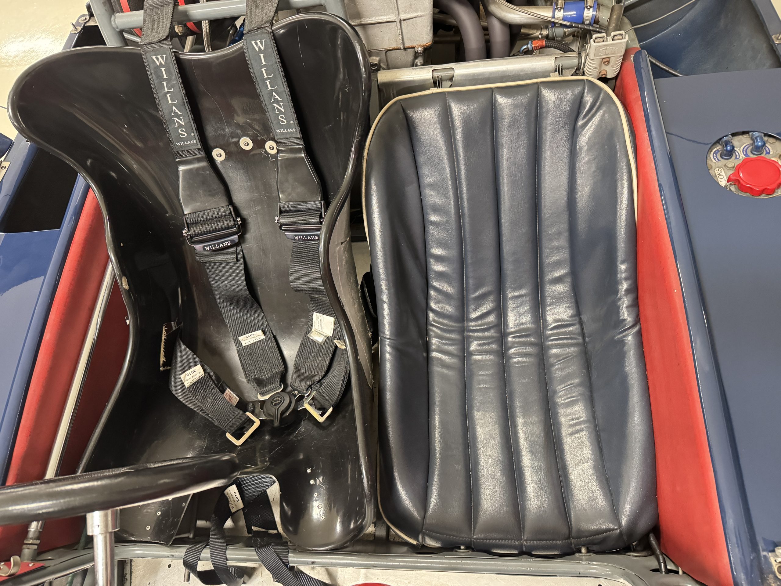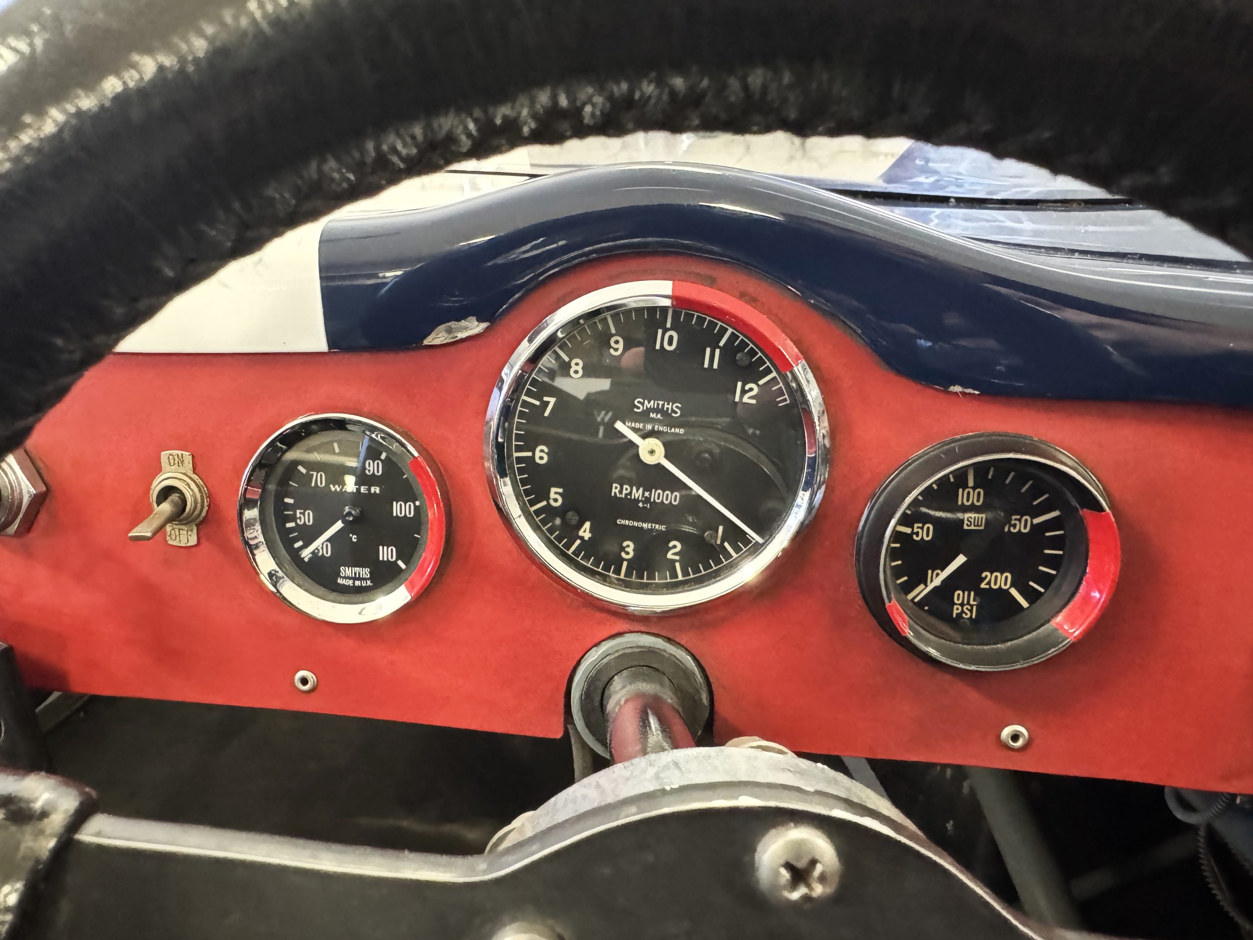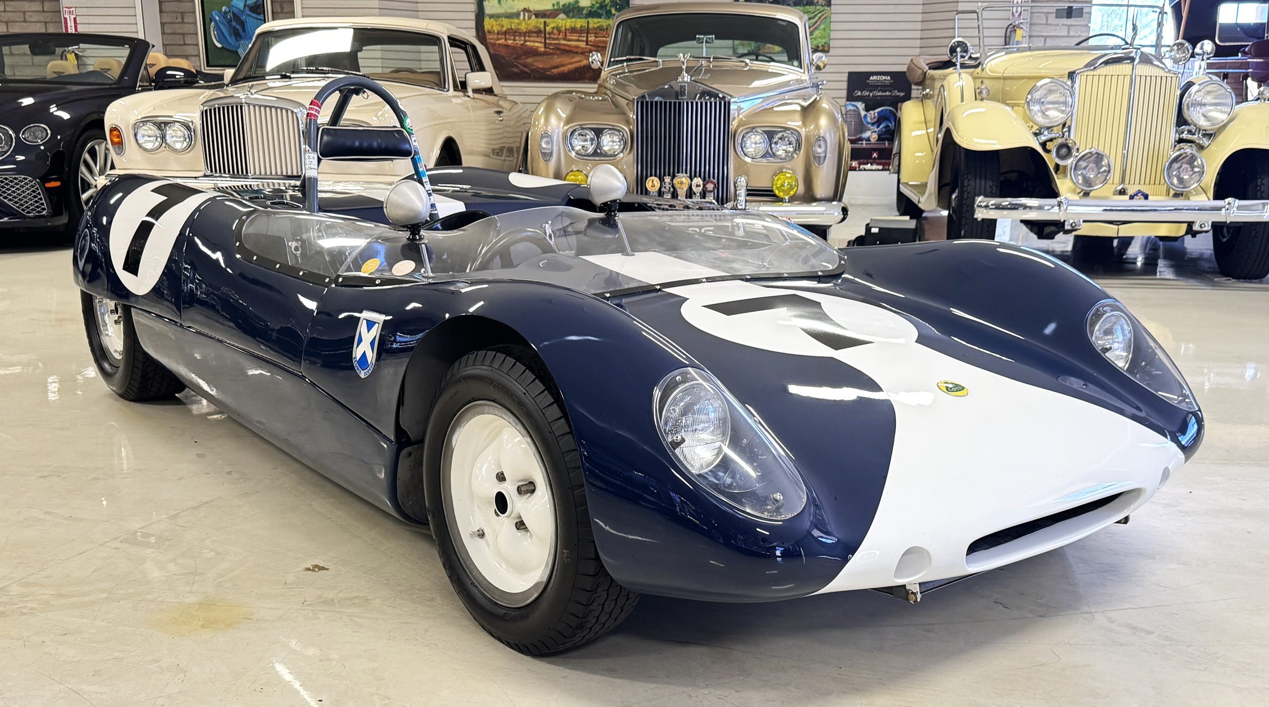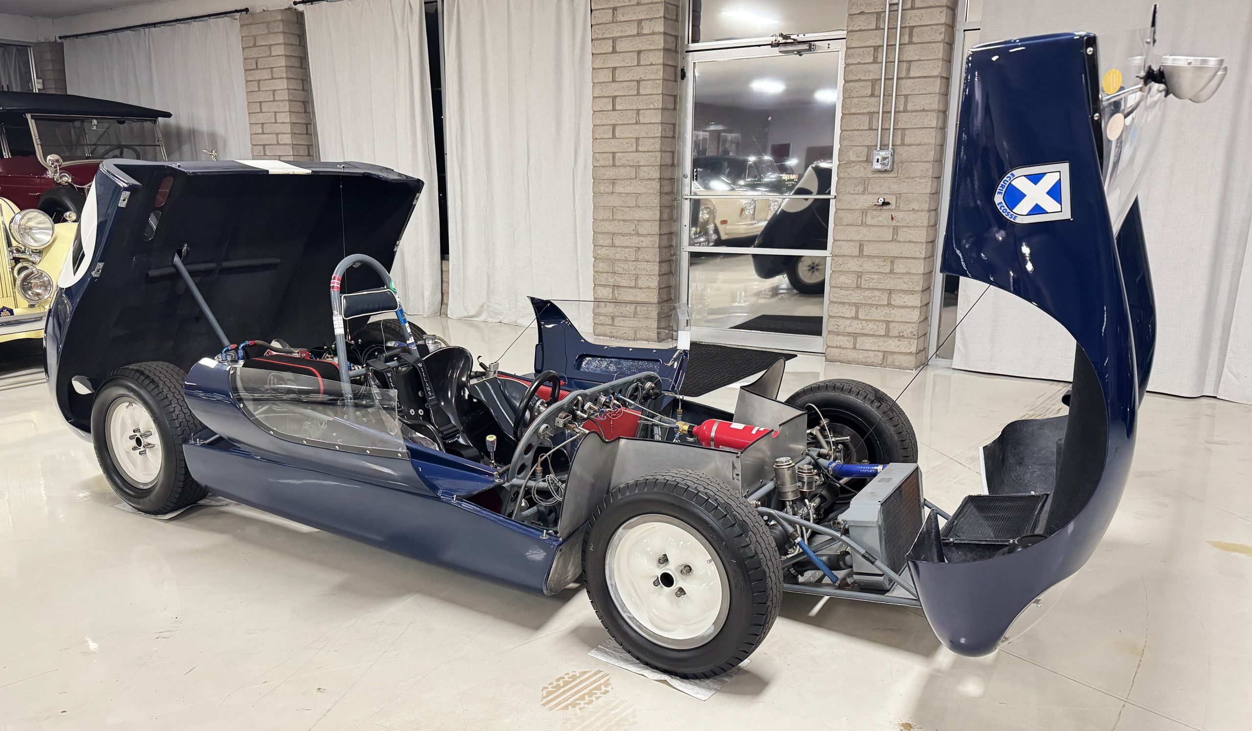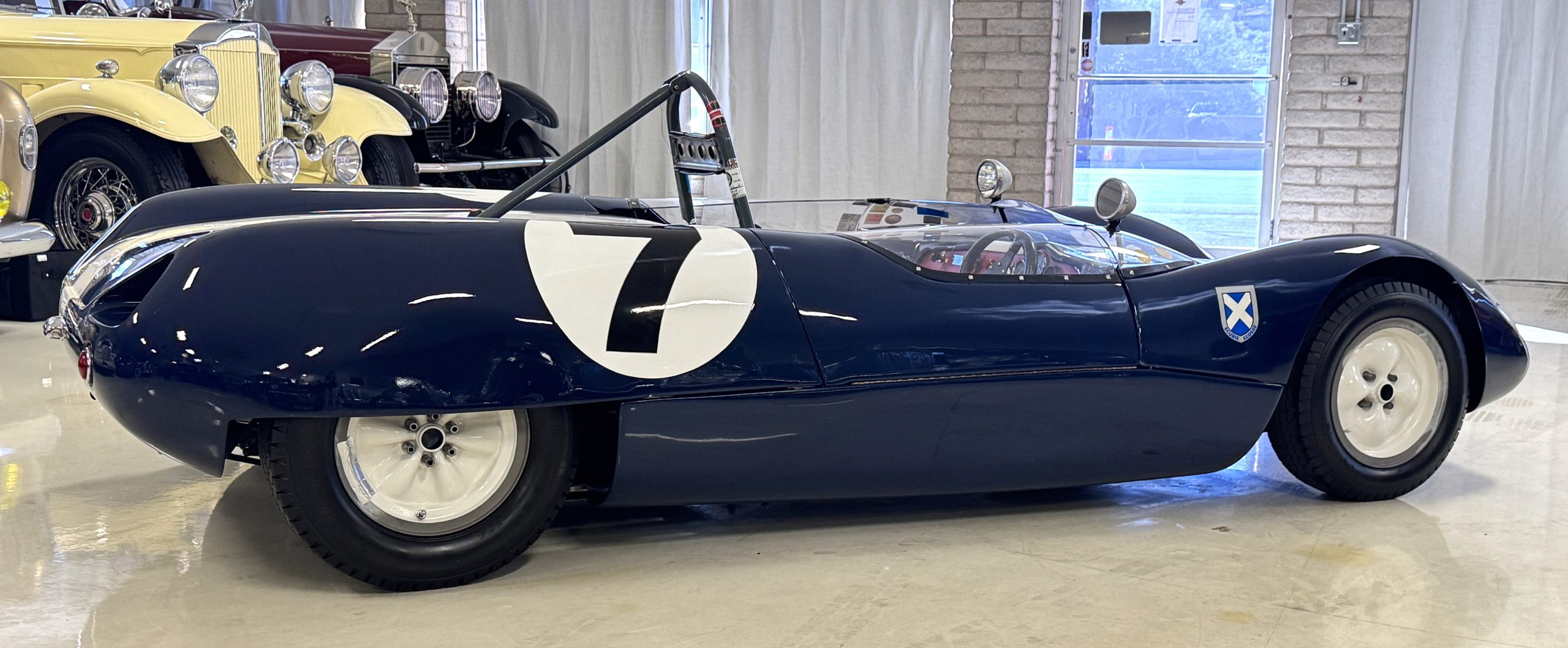 Inside, the Lotus retains its original minimalist focus on function. The right-hand-drive cockpit features a single black carbon fiber racing bucket seat with a five-point harness alongside a dark blue upholstered passenger seat in period correct presentation, functional Smiths instrumentation, a Hobbs engine hour meter, and a right-mounted gear lever, all configured for balance and immediate feedback. The simplicity of the cockpit underscores the Lotus’ singular purpose: connecting driver to machine with no excess. Dual side mirrors and a three-point chrome roll bar with an integrated dark blue headrest provide both practicality and safety without detracting from the period-correct presentation.
