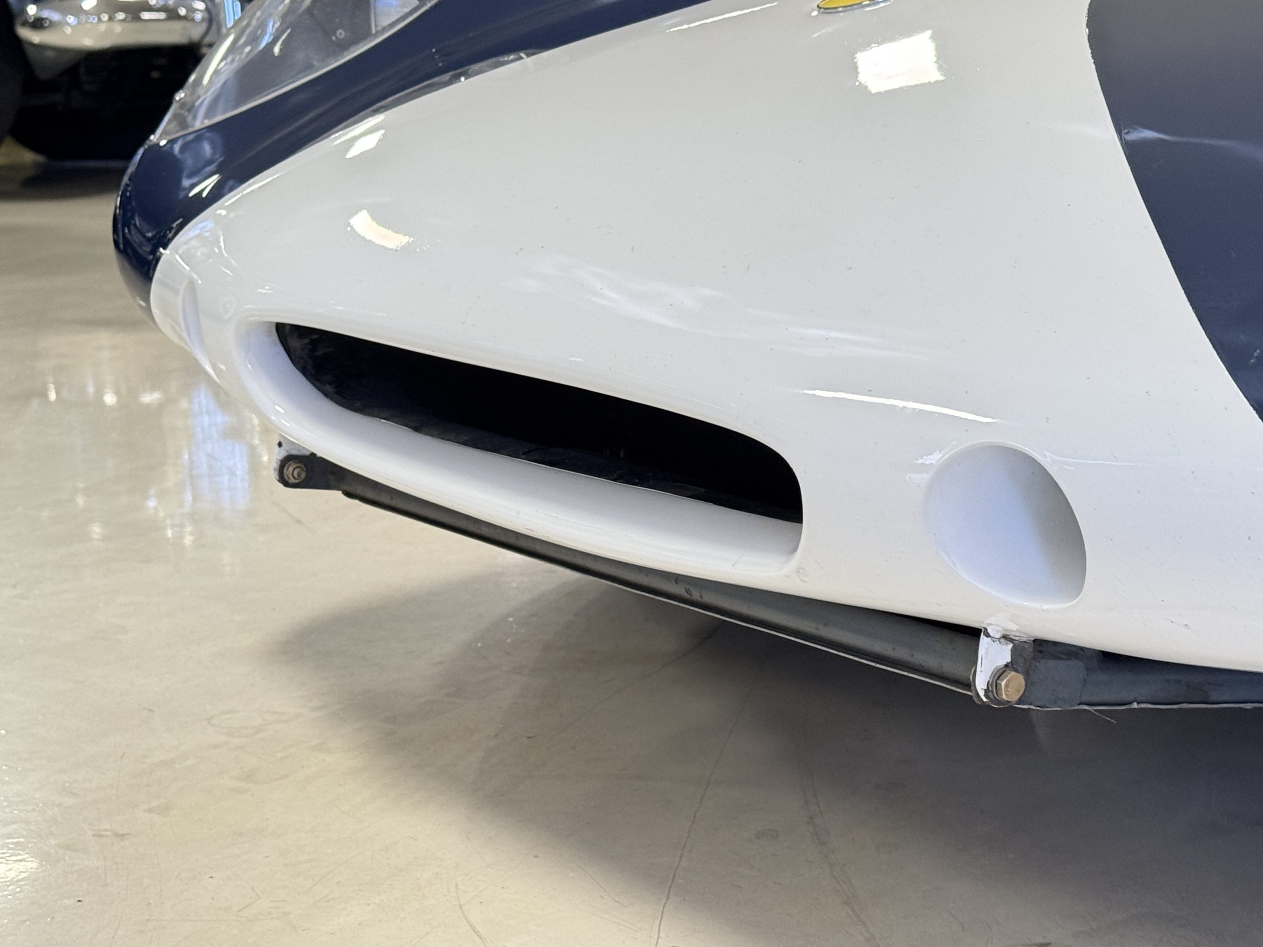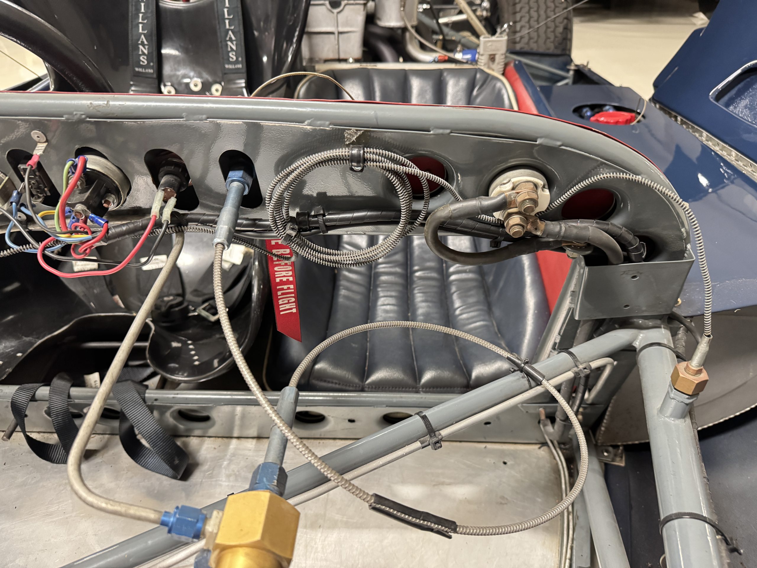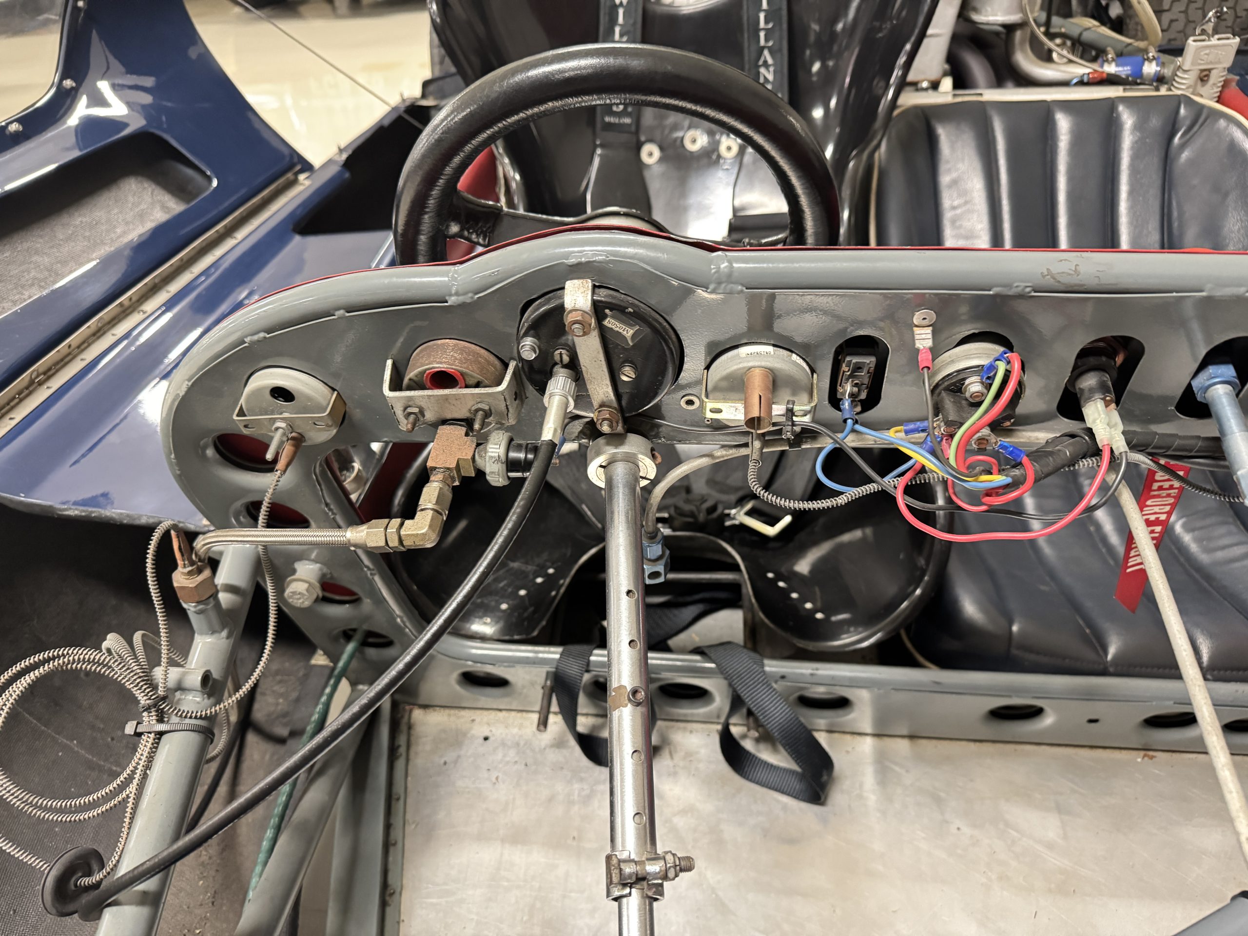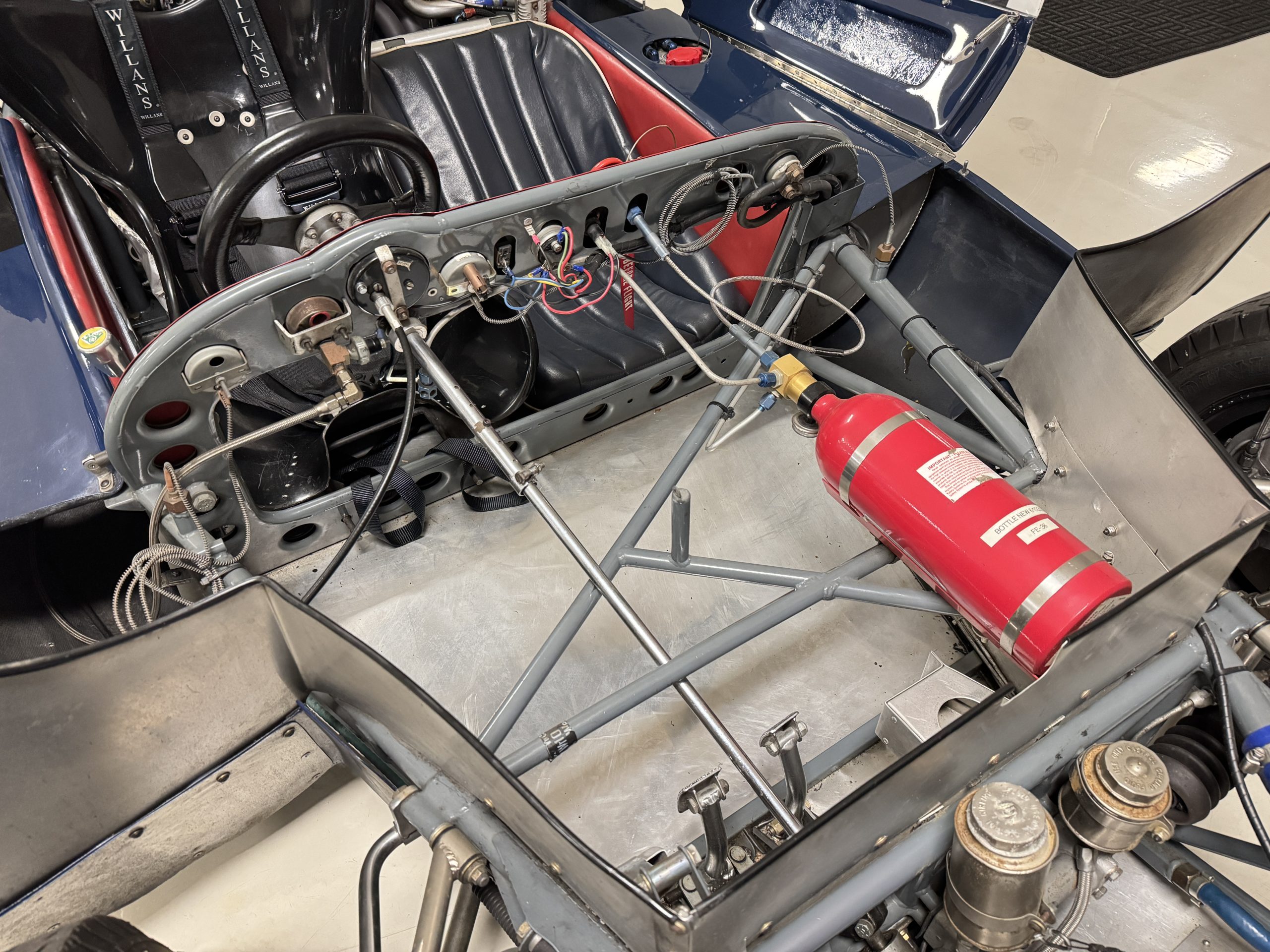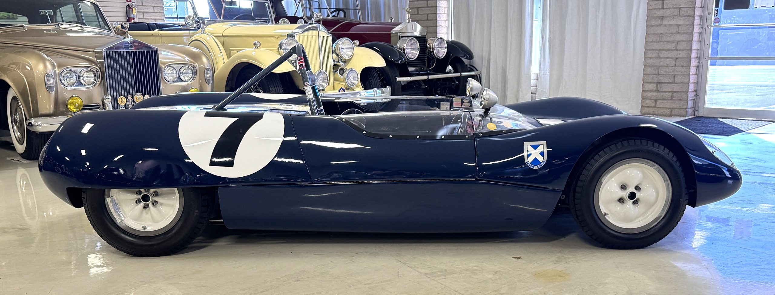 Inside, the Lotus retains its original minimalist focus on function. The right-hand-drive cockpit features a single black carbon fiber racing bucket seat with a five-point harness alongside a dark blue upholstered passenger seat in period correct presentation, functional Smiths instrumentation, a Hobbs engine hour meter, and a right-mounted gear lever, all configured for balance and immediate feedback. The simplicity of the cockpit underscores the Lotus’ singular purpose: connecting driver to machine with no excess. Dual side mirrors and a three-point chrome roll bar with an integrated dark blue headrest provide both practicality and safety without detracting from the period-correct presentation.